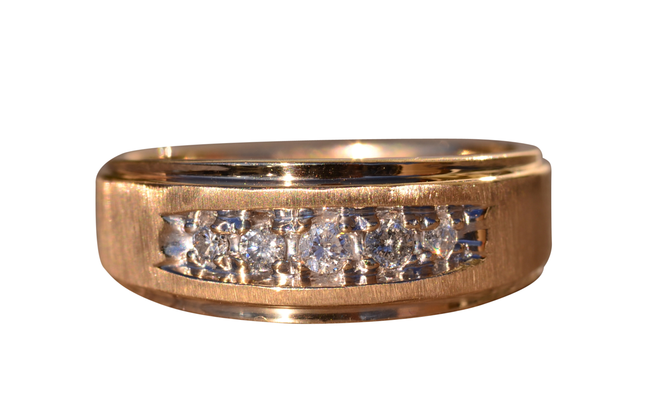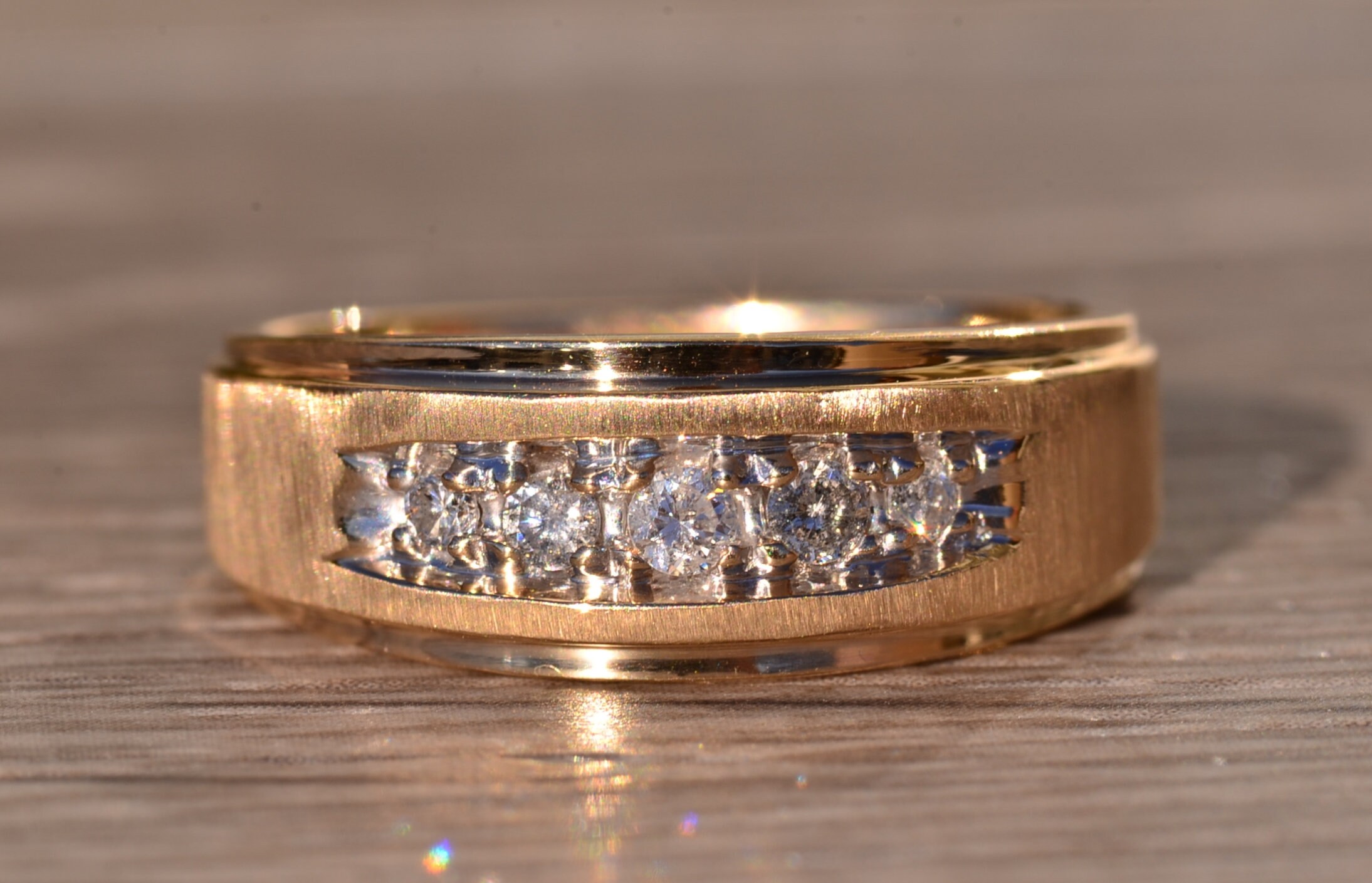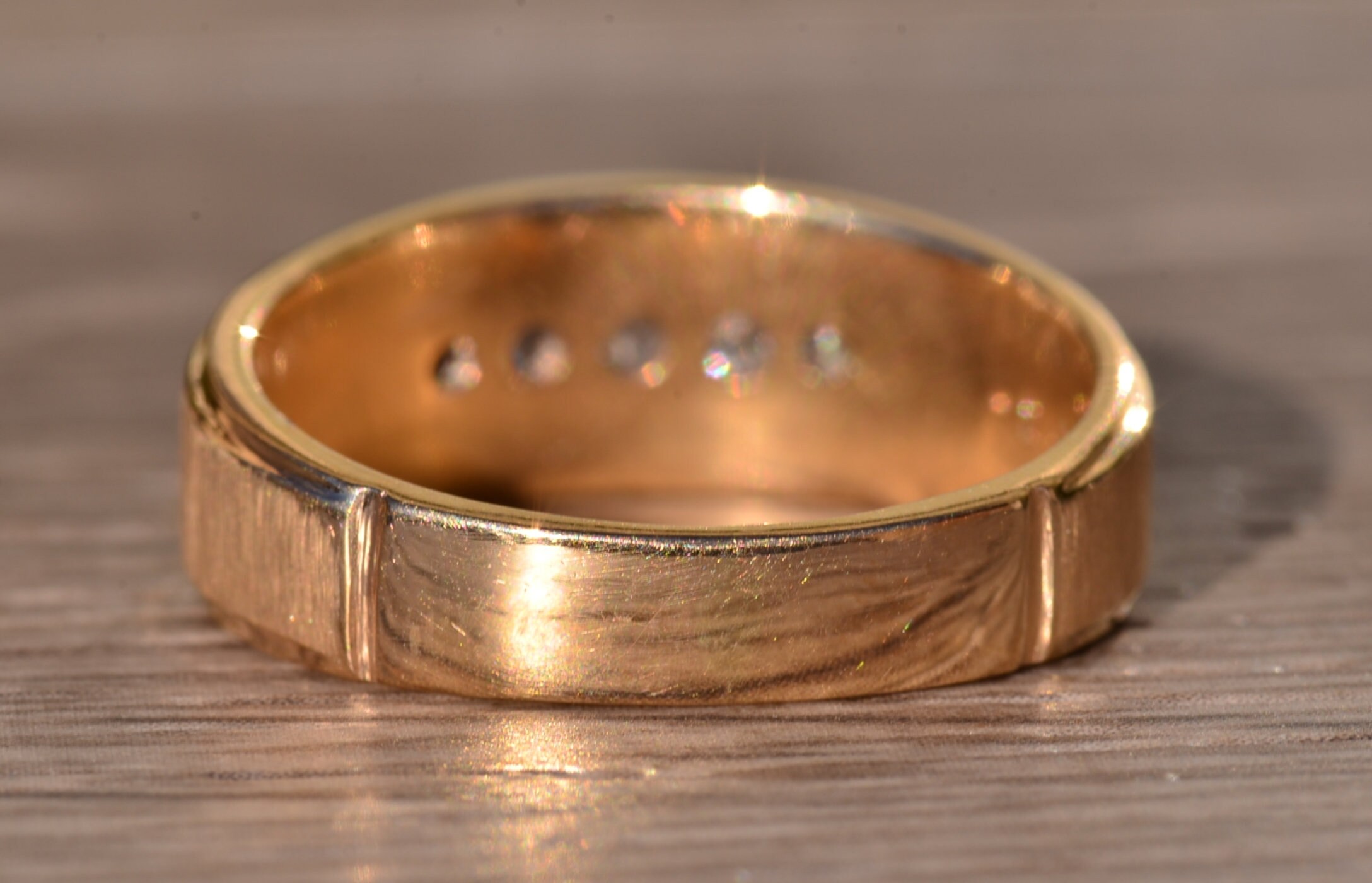The Potts Point: Yellow Gold Gentleman’s Band with Diamonds. The Band features five round brilliant cut natural diamonds which taper slightly in size bead set in a recessed channel. The diamonds have a total carat weight of 0.26 carats. A mid-century Florentine finish compliments the center of the ring which is completed by polished sides. The ring is low set, comfortable and solid making it perfect for everyday wear. The ring is signed S & S by its craftsman and crafted in 14 karat yellow gold. The ring is currently a finger size 10 yet can be adjusted to any finger size for an additional charge.