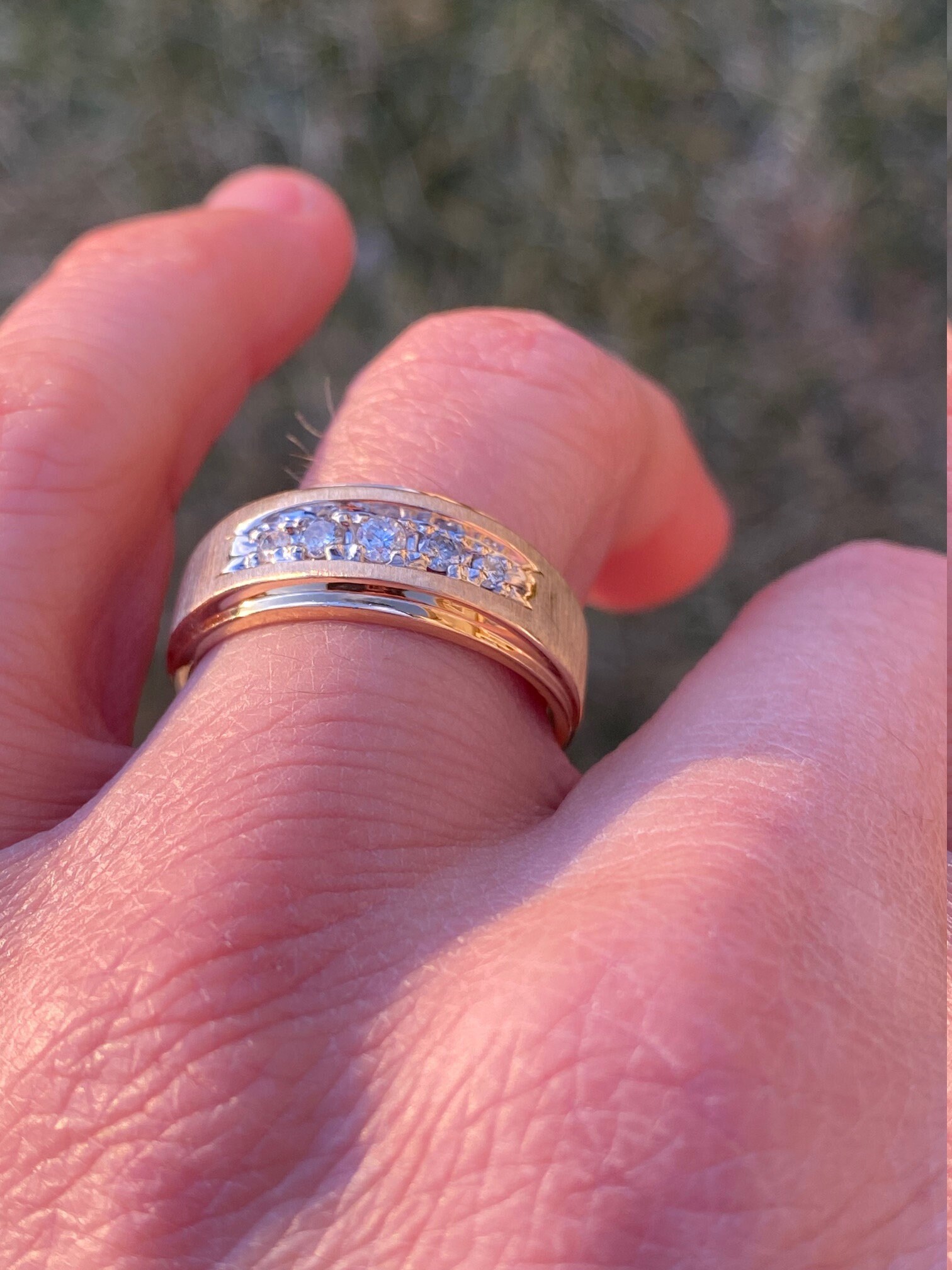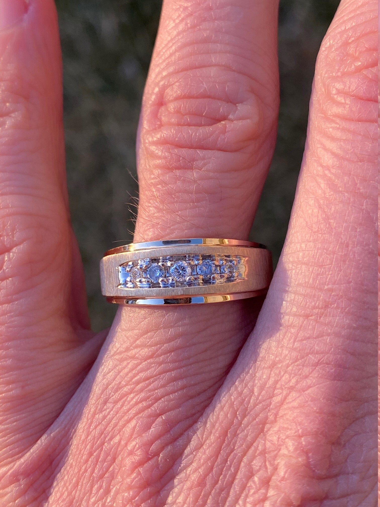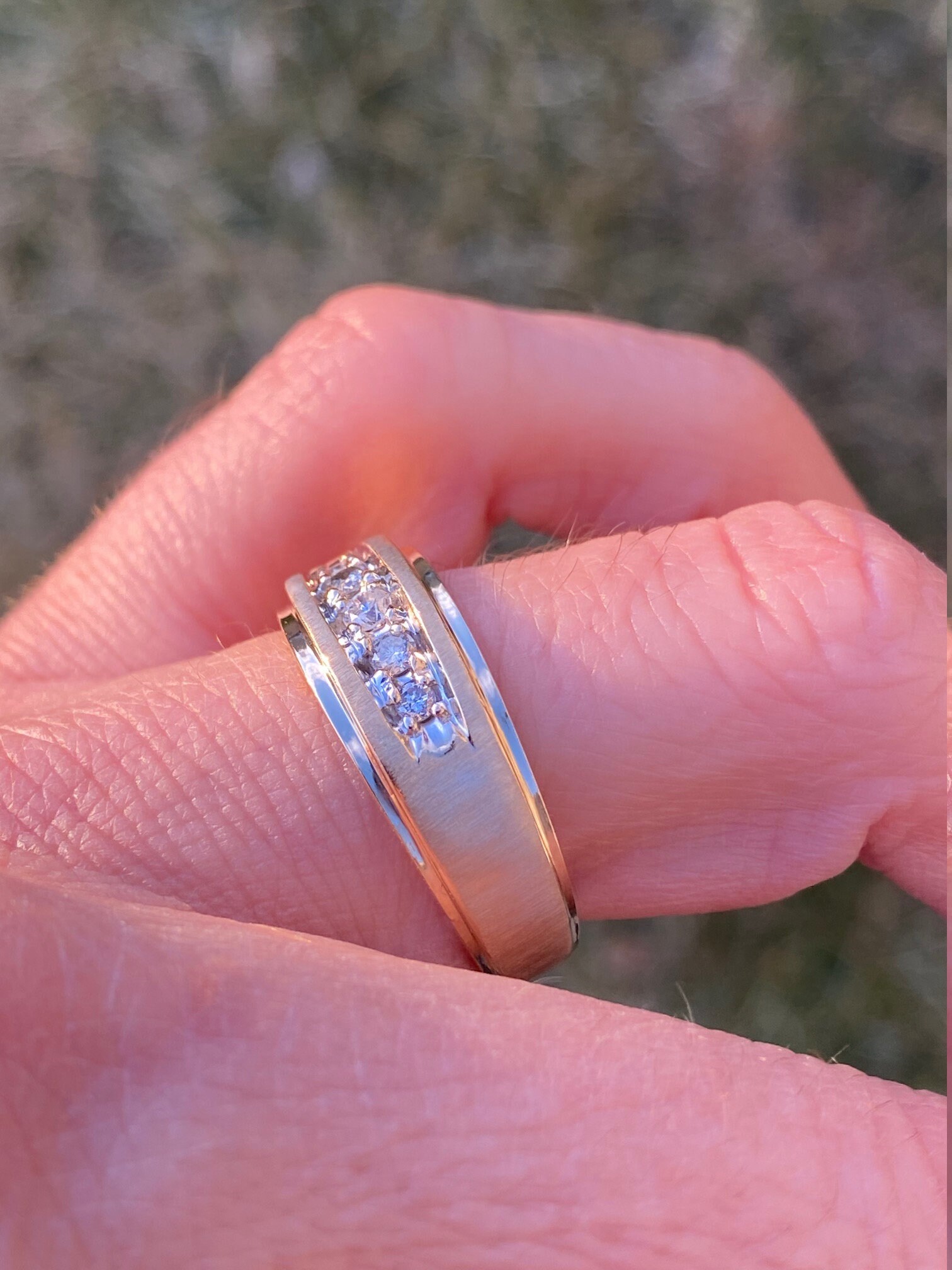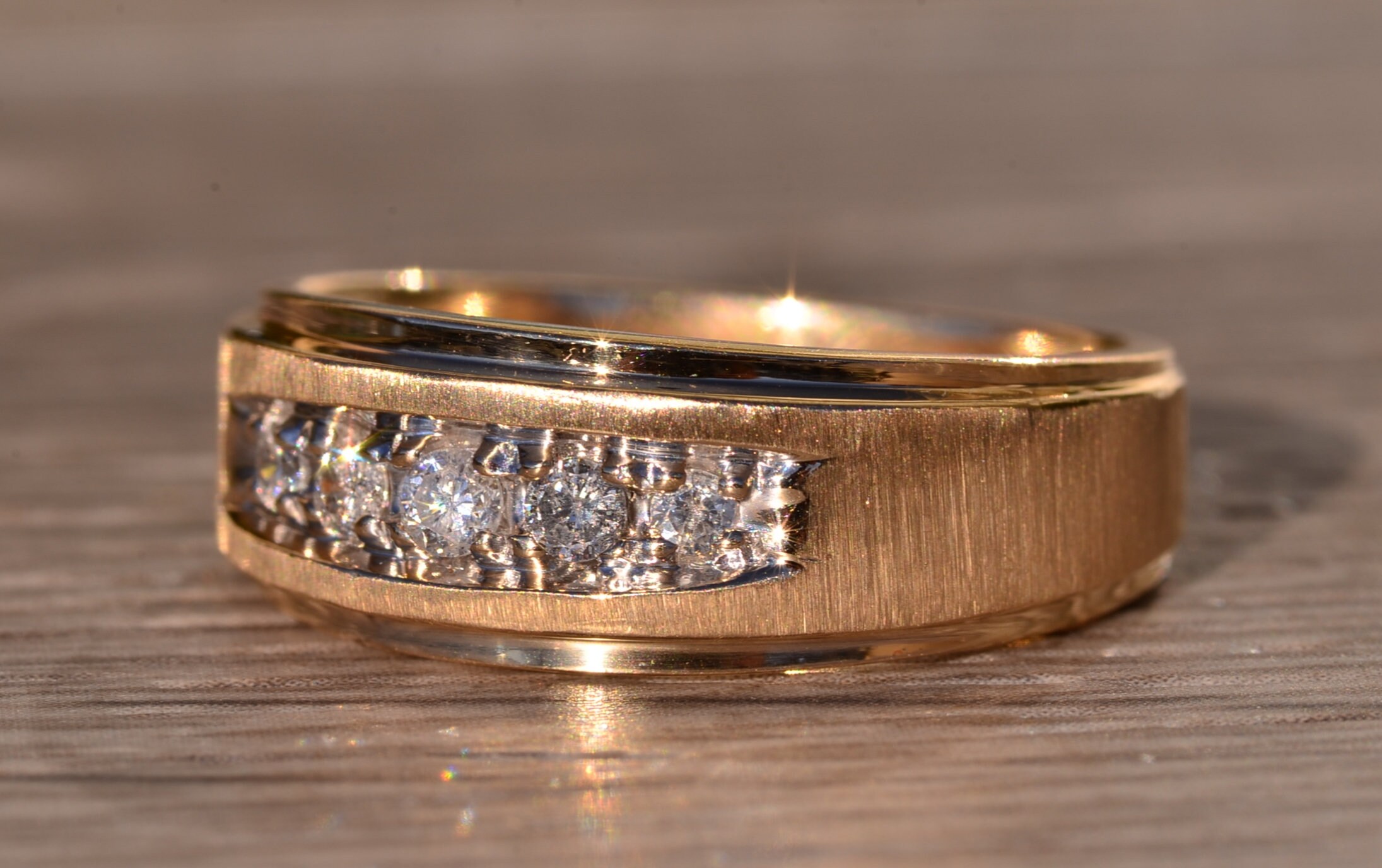 The Potts Point: Yellow Gold Gentleman’s Band with Diamonds. The Band features five round brilliant cut natural diamonds which taper slightly in size bead set in a recessed channel. The diamonds have a total carat weight of 0.26 carats. A mid-century Florentine finish compliments the center of the ring which is completed by polished sides. The ring is low set, comfortable and solid making it perfect for everyday wear. The ring is signed S & S by its craftsman and crafted in 14 karat yellow gold. The ring is currently a finger size 10 yet can be adjusted to any finger size for an additional charge.