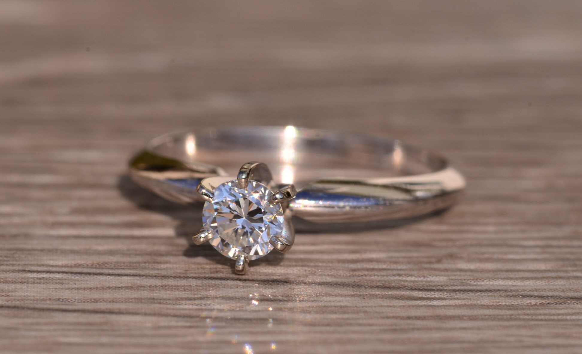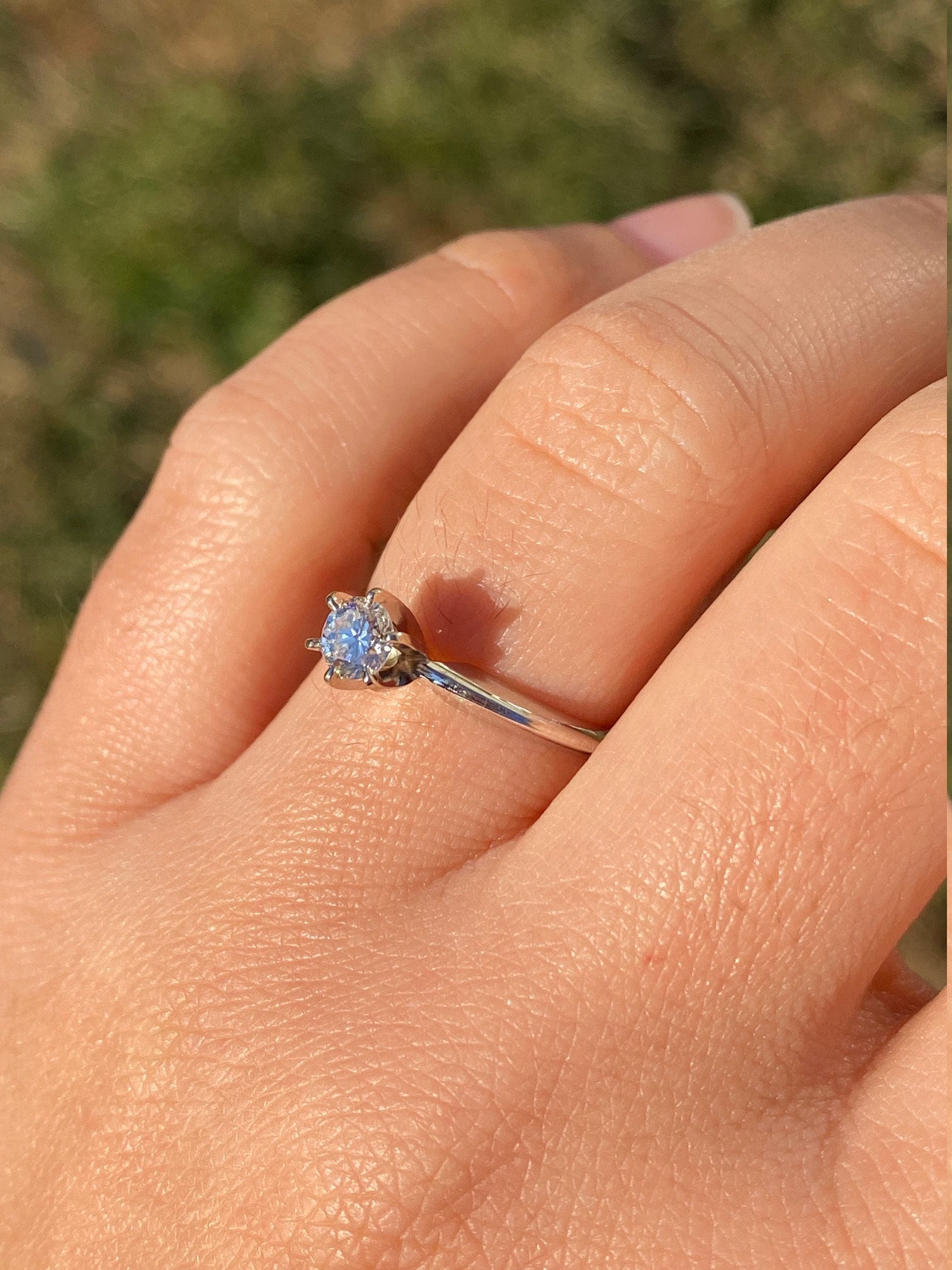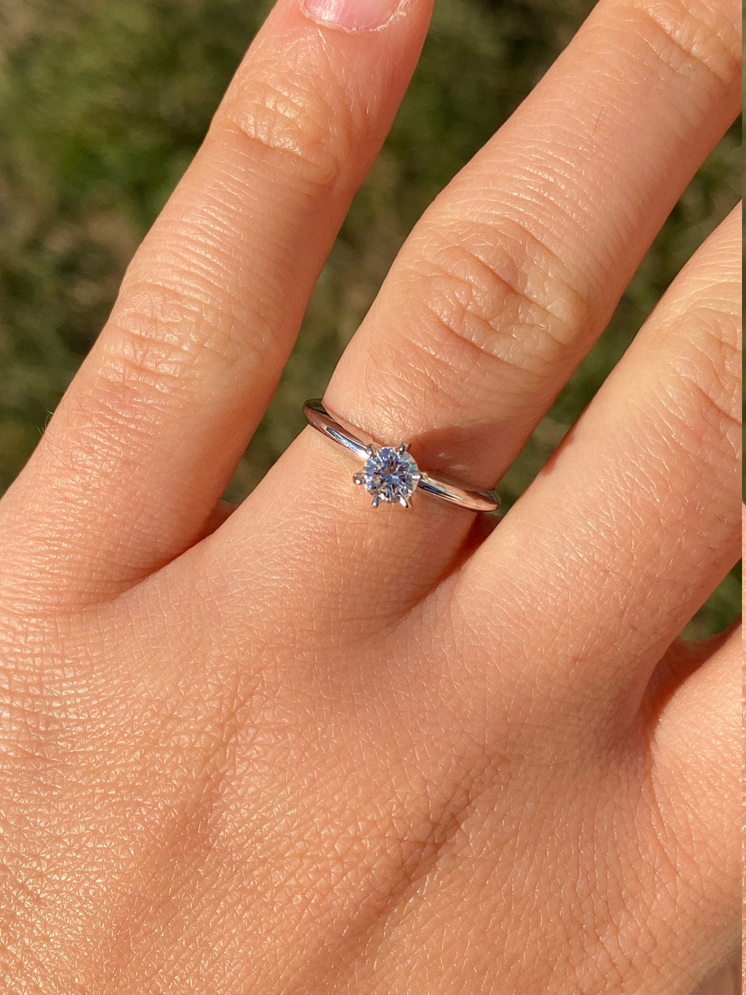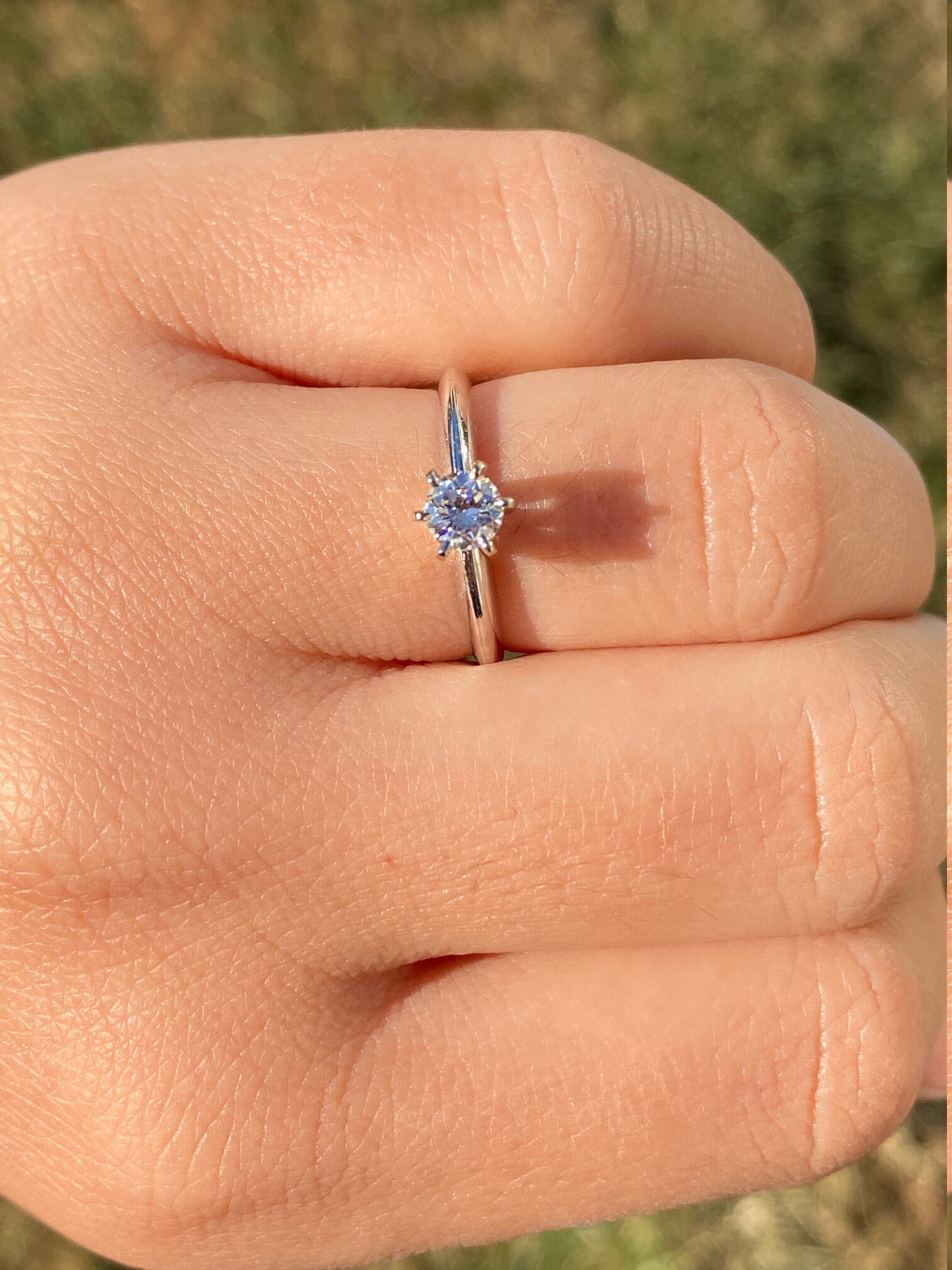 The Putney: White Gold Solitaire Engagement Ring with 0.33 Carat Natural Diamond. The center is safely six prong set with a 0.33 carat round brilliant cut natural diamond. The diamond has an approximate gemological Institute of America clarity grade of Vs1 and a color grade of H. The shank pinches at the top and has a knife edge style shank design to help feature the center stone. The ring is crafted in 14 karat white gold and is currently a finger size 6 1/4 yet can be adjusted in finger size for an additional charge.