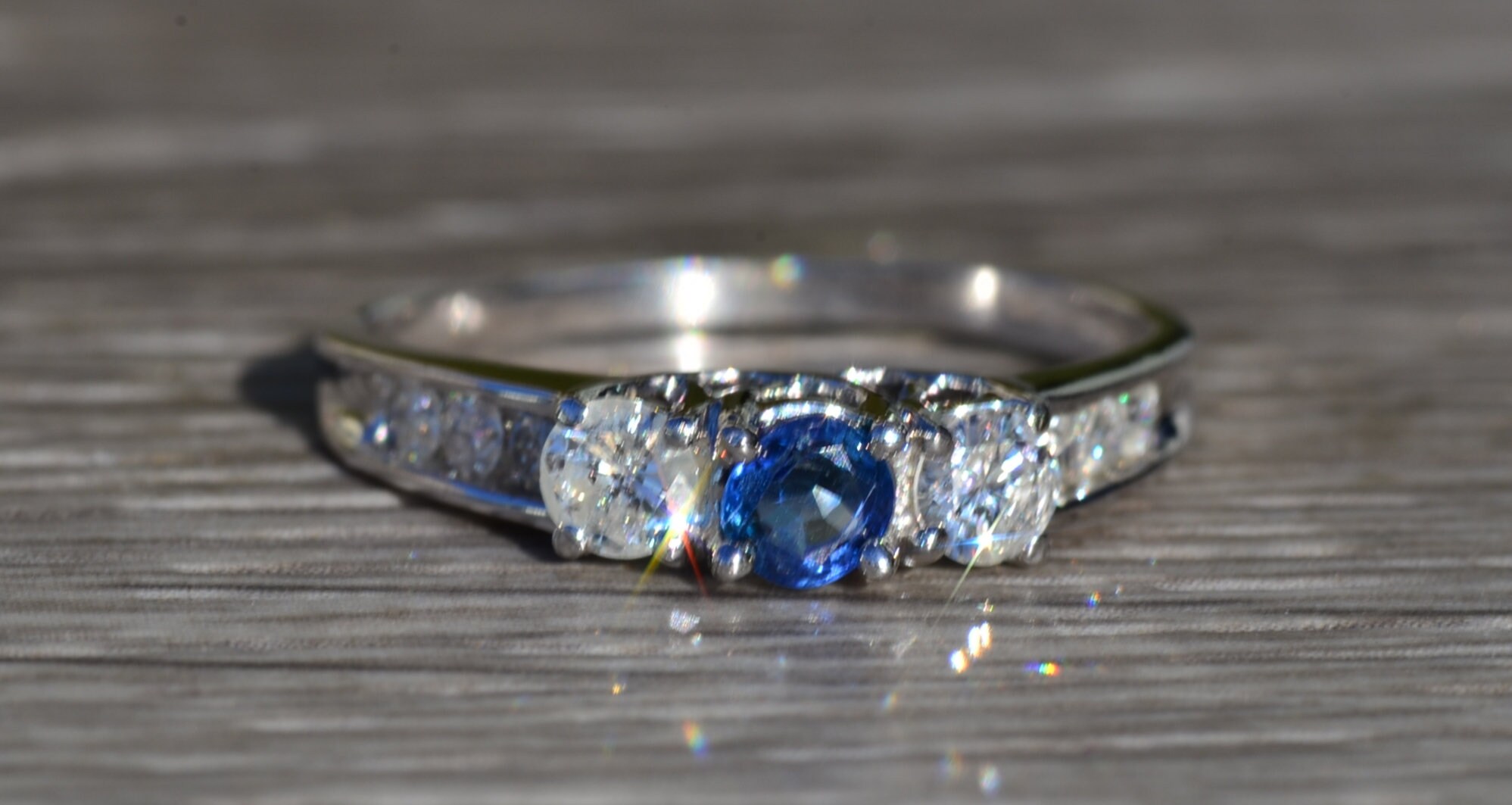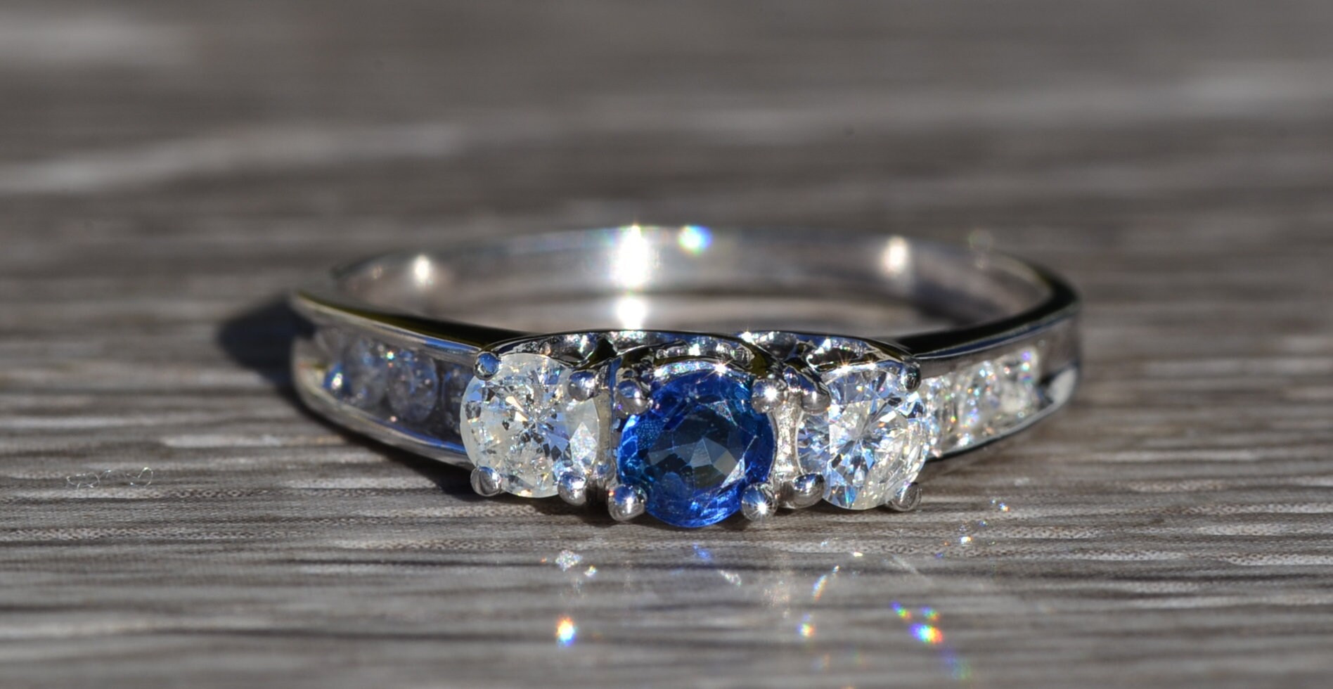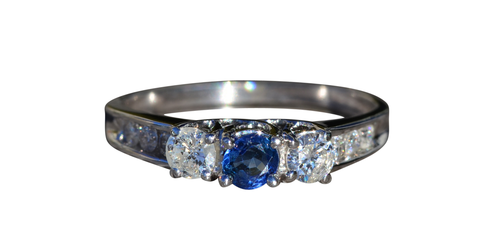 The Rainsville: Ladies 14K Sapphire and Diamond Trilogy Engagement Ring. Expertly crafted in 14 karat white gold, this contemporary engagement ring centers on a 0.25 carat blue sapphire followed by a 0.20 carat round diamond on either side. Three round diamonds continue down either side of the band in a channel setting for a total weight of 0.14 carats. Currently a finger size 9.75, this ring can be resized for an additional charge.