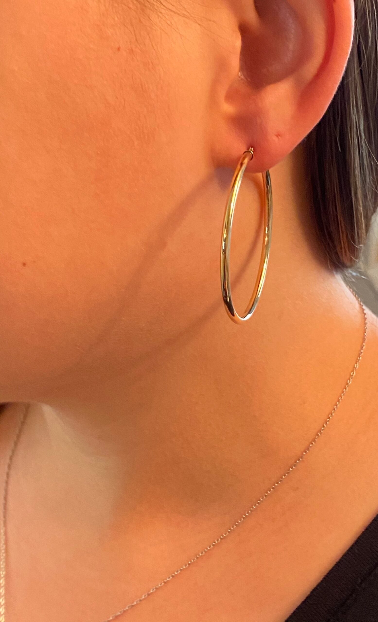 14 karat yellow gold hoop earrings. These earrings are lightweight, extremely comfortable to wear and measure approximately 1 3/4 inches. Looking for the perfect everyday gold hoops? Look no further!