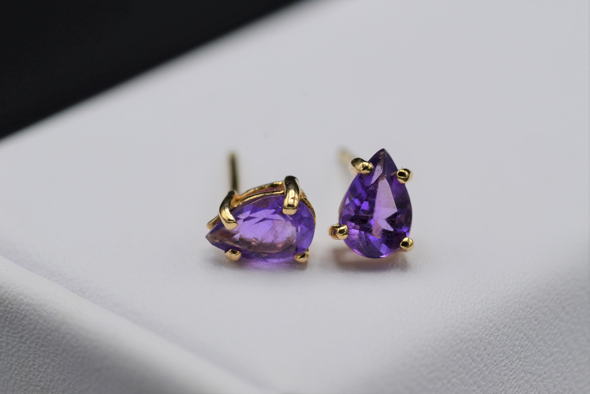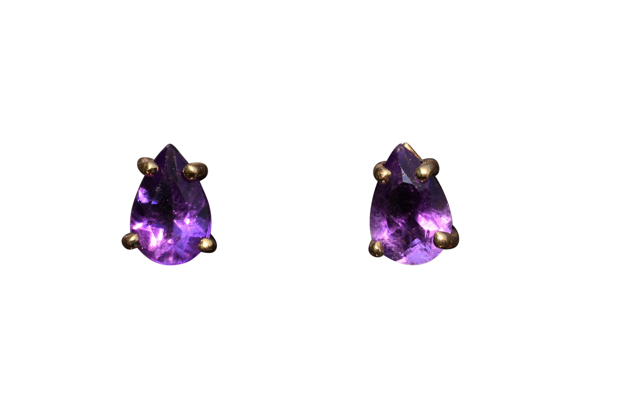 Vintage Pear Shaped Amethyst Studs. These pear shaped amethyst studs are crafted in 14 karat yellow gold and feature push style backings. These earrings are a modest size and can be easily worn as a second piercing.