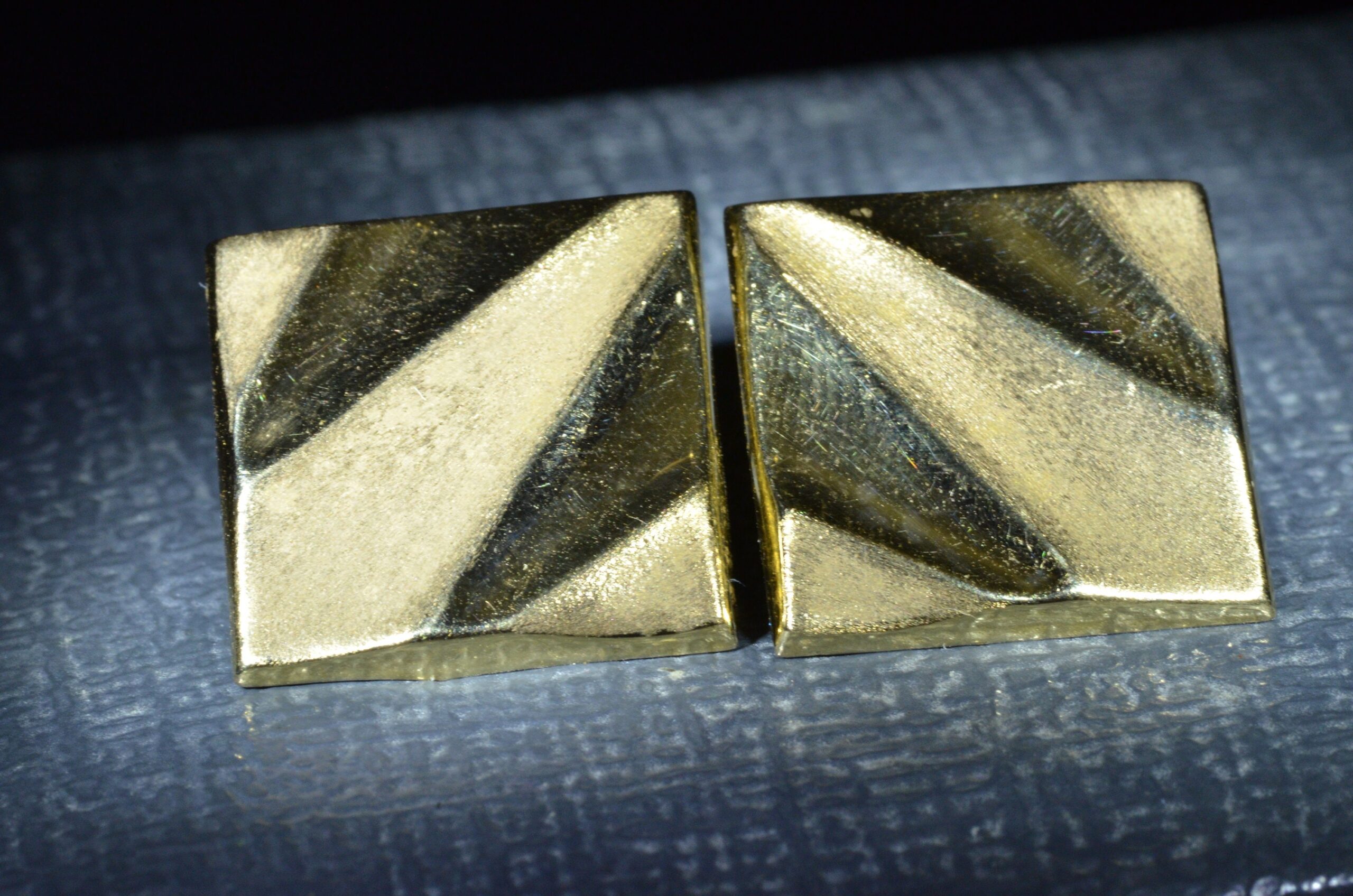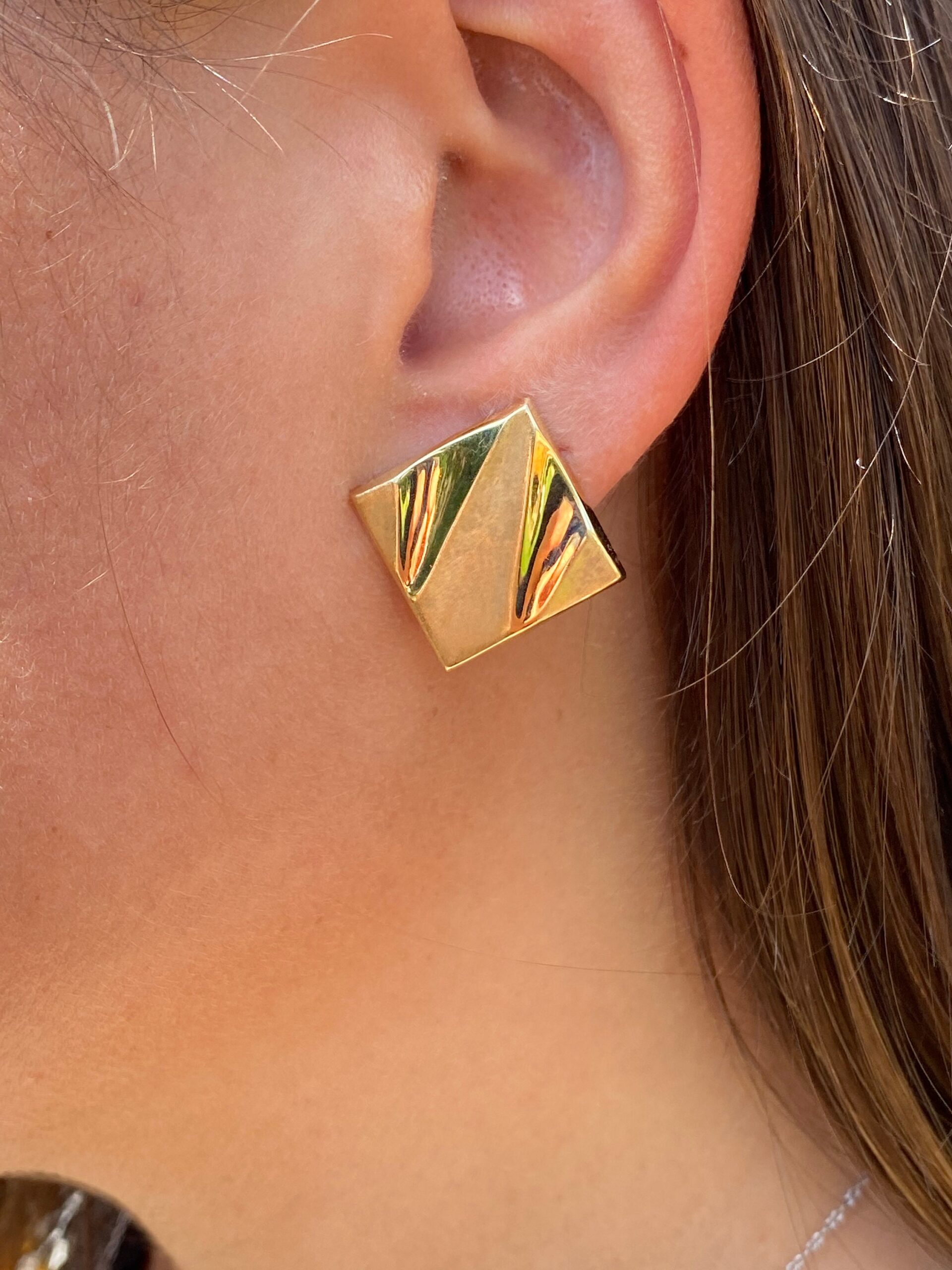 Vintage Earrings in Yellow Gold. The earrings are square in shape with patterned brushed and polished sections. The earrings feature a push style back and are perfect for everyday wear or that special occasion. Classic, modernist, and simplistic, these earrings have it all.