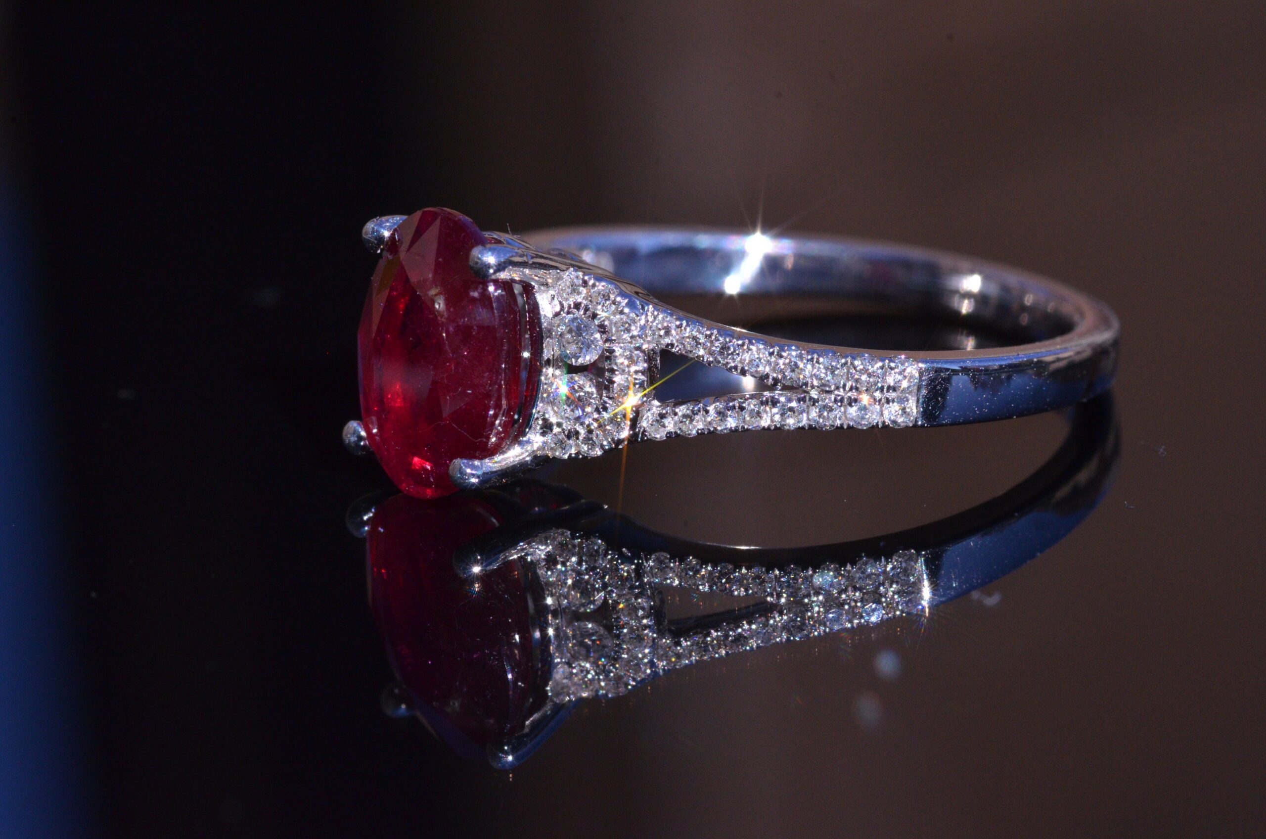 2.04 Carat Natural Vivid Red Ruby Ring. Custom crafted in an 18 karat white gold mounting, the center stone is surrounded by diamonds. On either side of the ruby are diamonds that split the shank and continue downward. The ring has a total of 0.27 carats of diamond total weight and is currently a finger size 6 1/2, however it can be adjusted to fit any size finger.