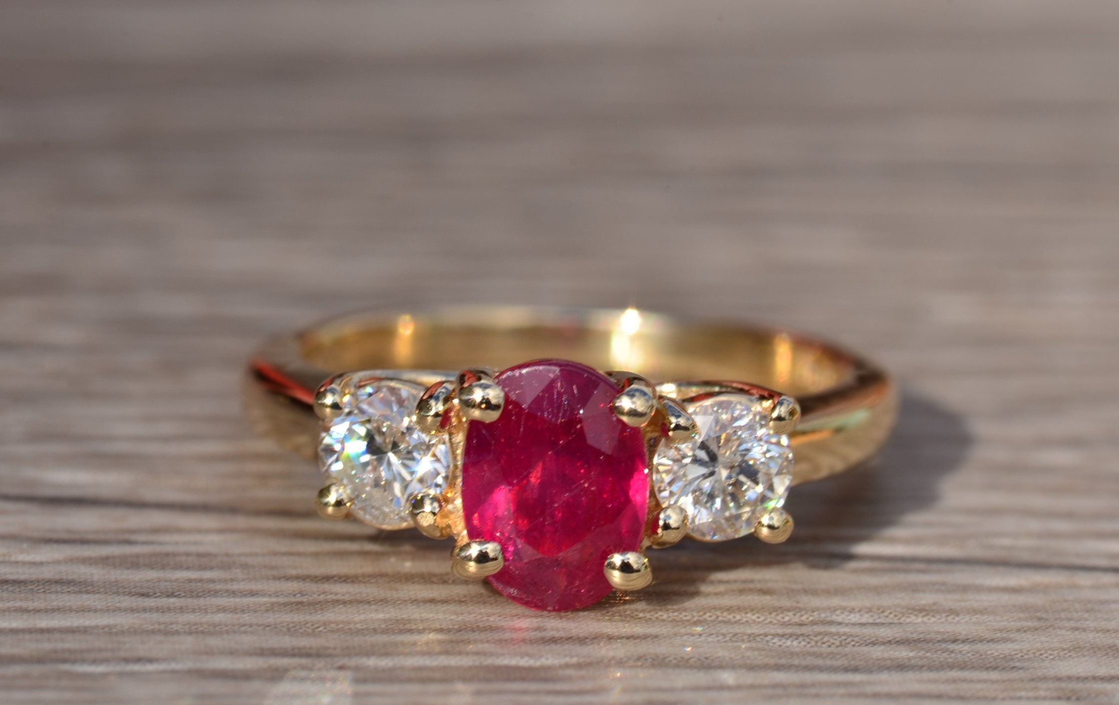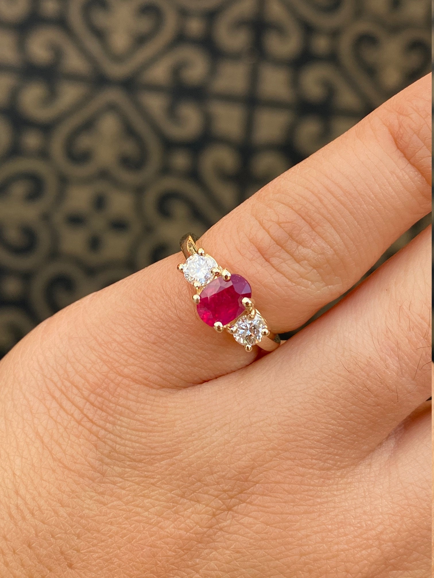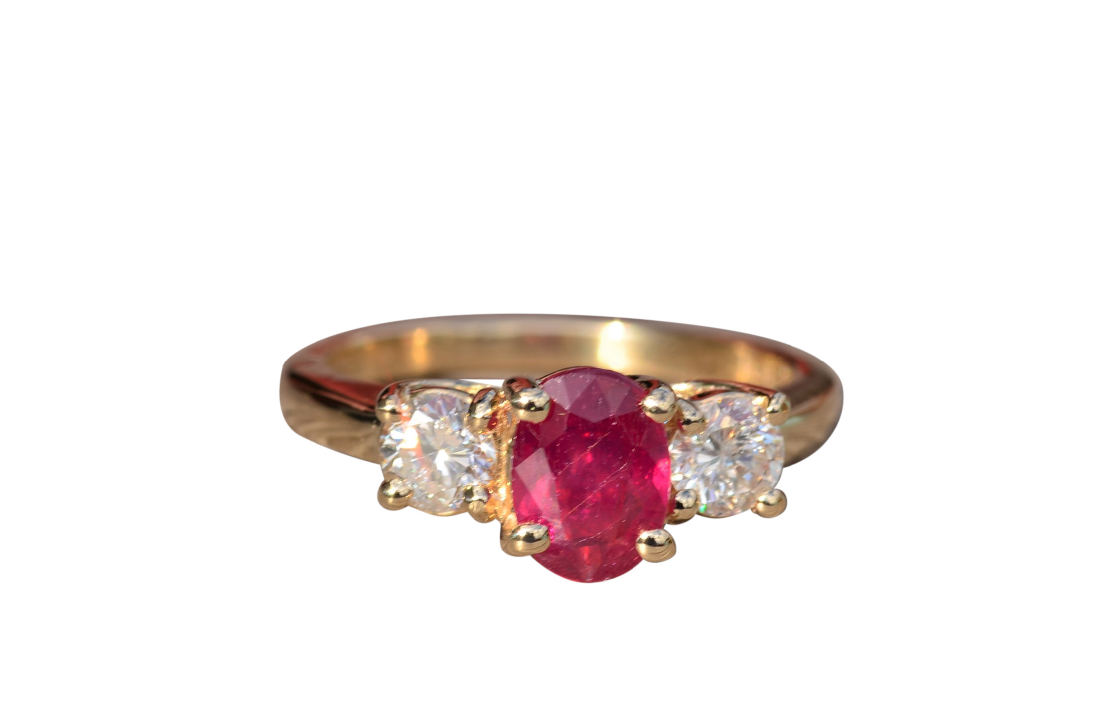 Effy Signed 14 Karat Yellow Gold Ruby and Diamond Trilogy Ring. This classic three stone ring is crafted in smooth 14 karat yellow gold and centers on a 0.75 carat oval brilliant cut ruby. On either side of the ruby is a 0.25 carat round diamond for a total weight in diamonds of 0.50 carats. This ring is a finger size 5, yet can be adjusted to any finger size.