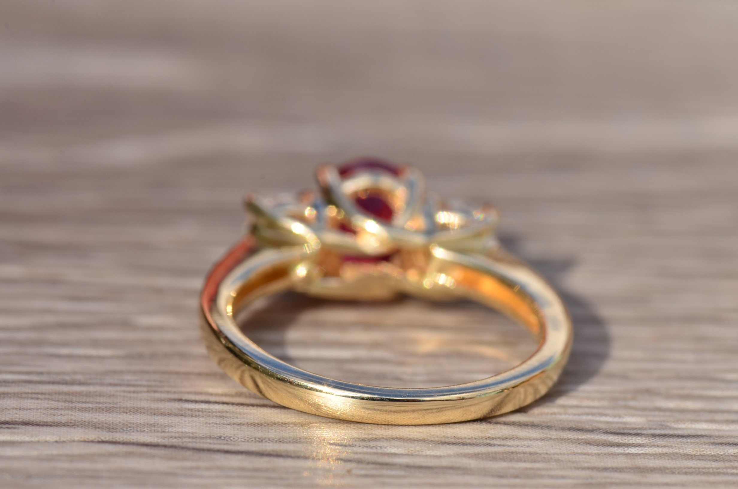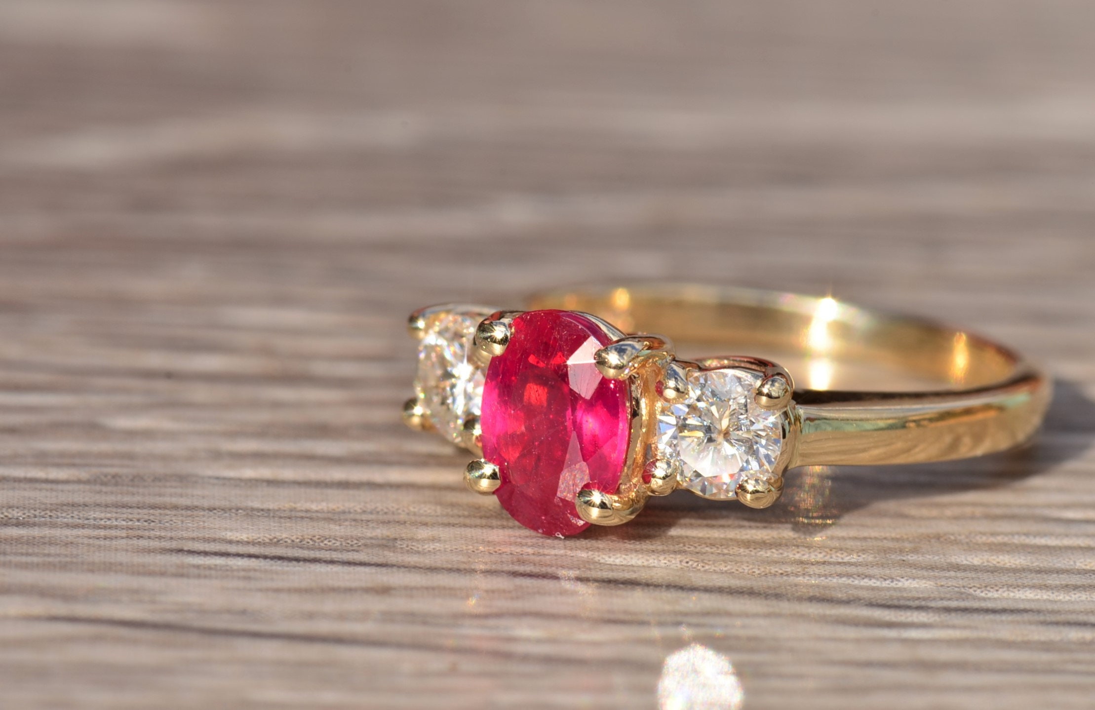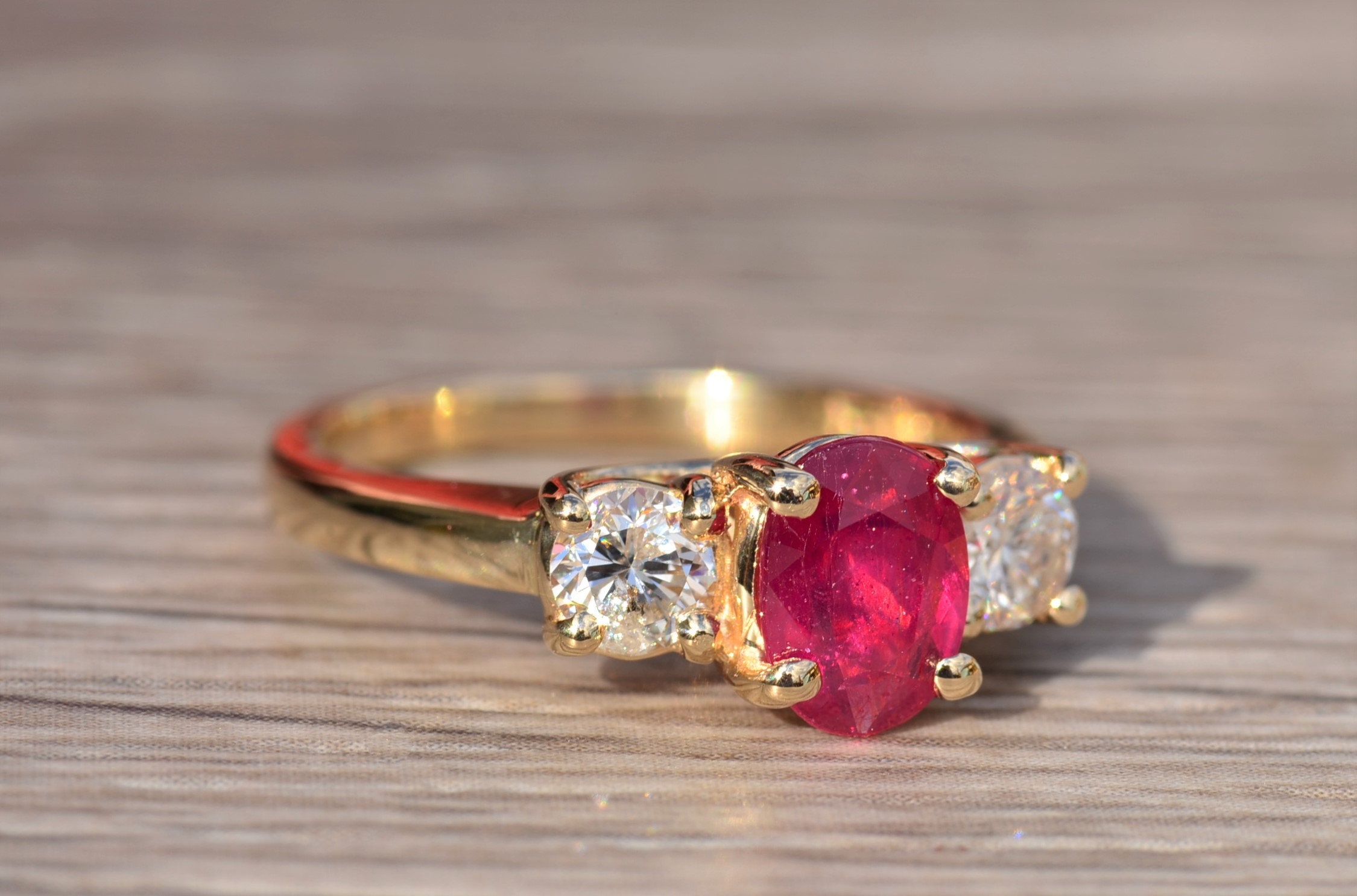 Effy Signed 14 Karat Yellow Gold Ruby and Diamond Trilogy Ring. This classic three stone ring is crafted in smooth 14 karat yellow gold and centers on a 0.75 carat oval brilliant cut ruby. On either side of the ruby is a 0.25 carat round diamond for a total weight in diamonds of 0.50 carats. This ring is a finger size 5, yet can be adjusted to any finger size.