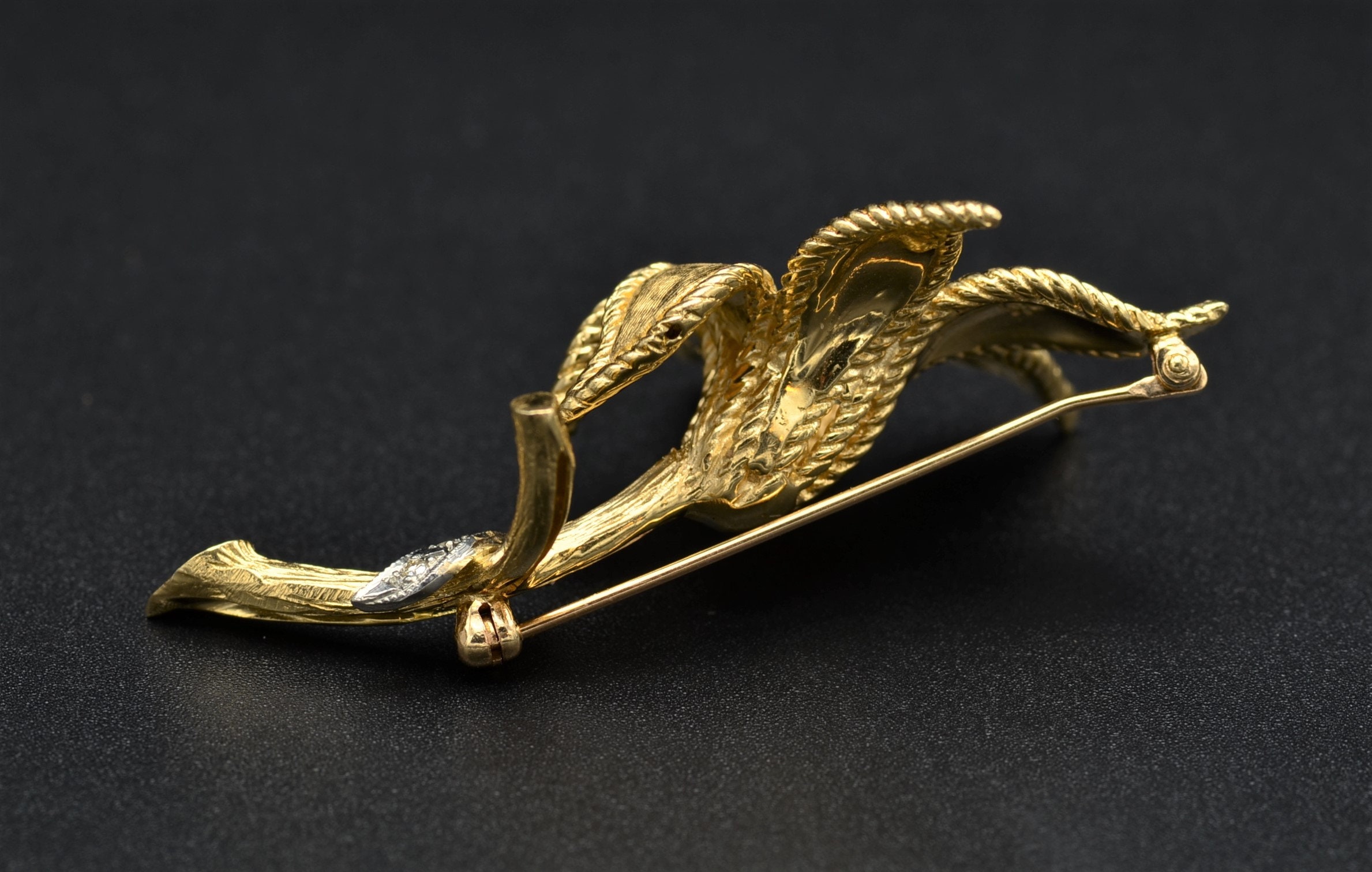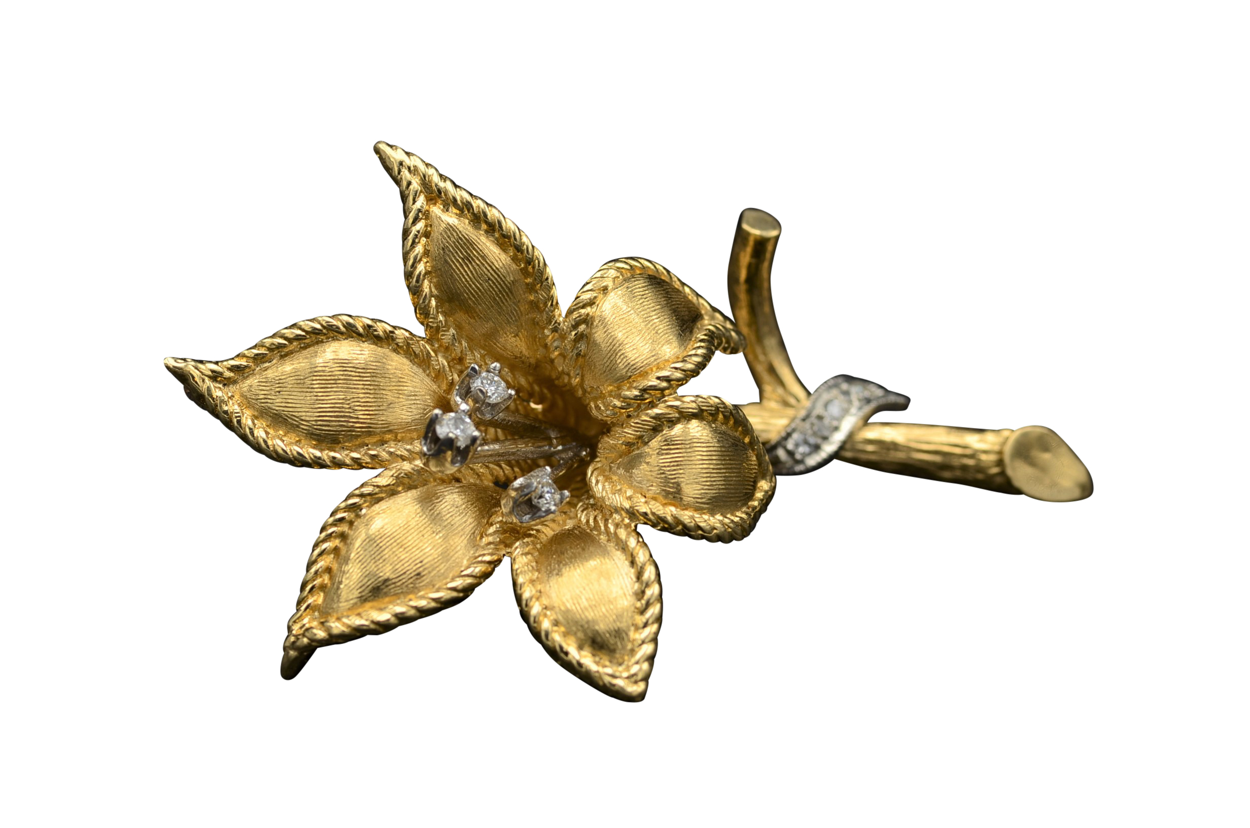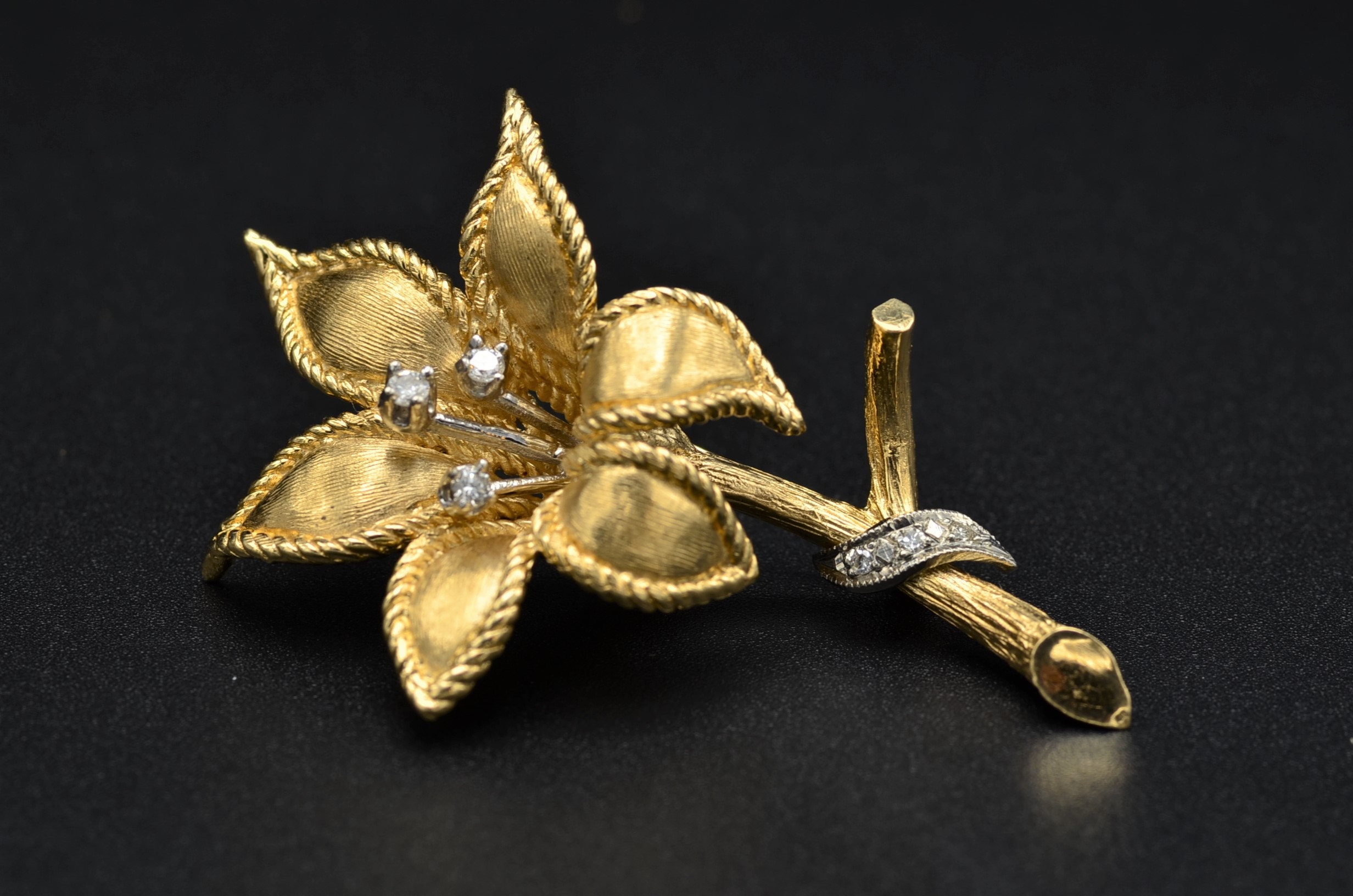 Antique Signed L.D. Percy Yellow Gold Floral and Diamond Brooch. This handmade and signed brooch is crafted in 14 karat yellow gold and features both polished and brushed sections of gold. The leaves of the flower are accented with a rope style milgrain around the petals that can be seen on the front and back of the brooch. There are three diamonds in the center of the flower, followed by an additional three accent stones on the branch. These stones are bead set in white gold and are complimented by excellent milgrain work. Don’t be afraid to zoom in and explore the fine craftsmanship that it took to create this brooch! The entire brooch measures over 2 inches in length.