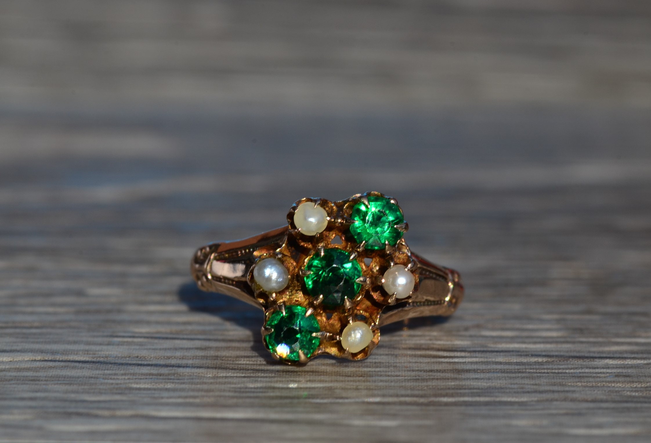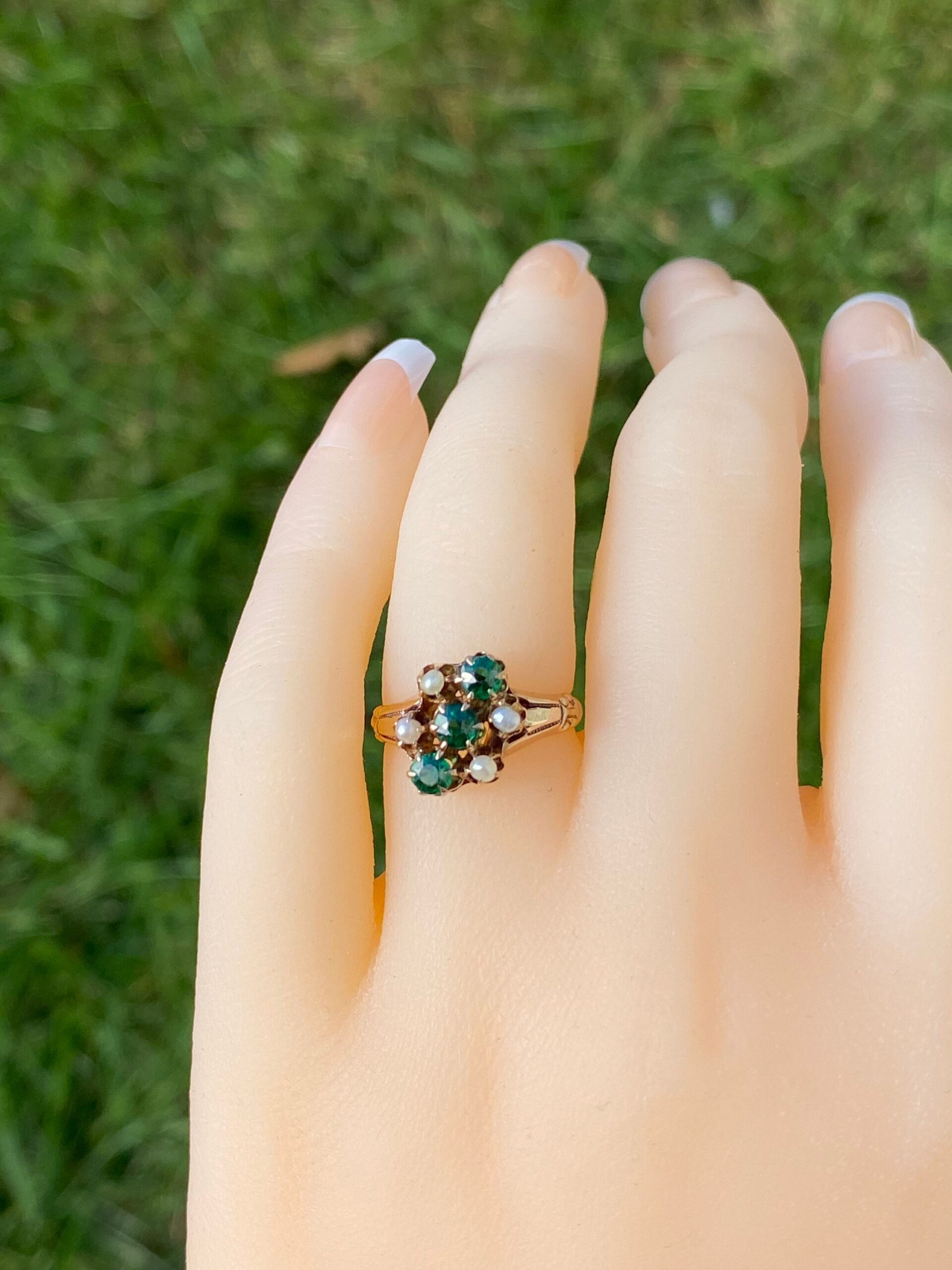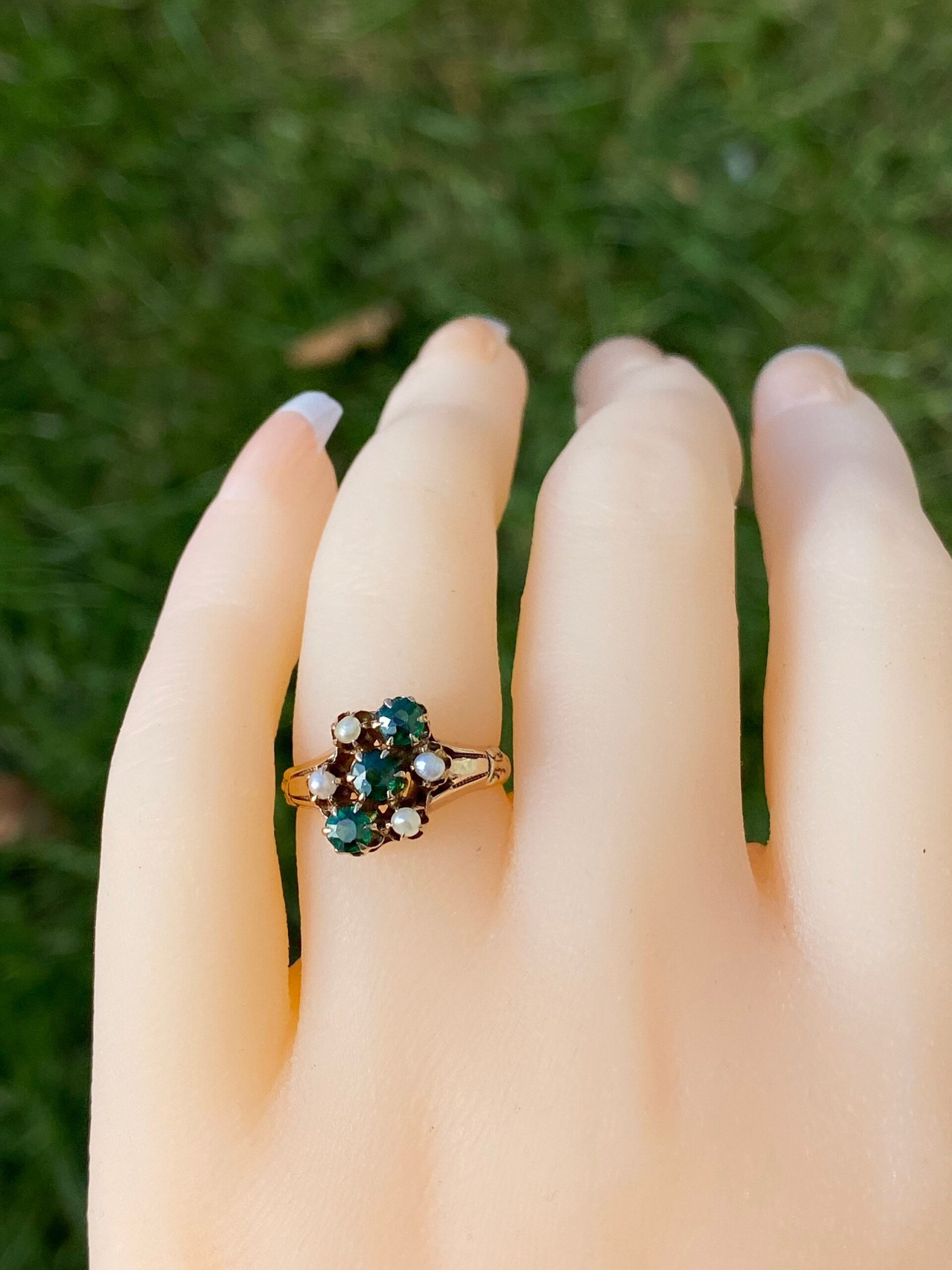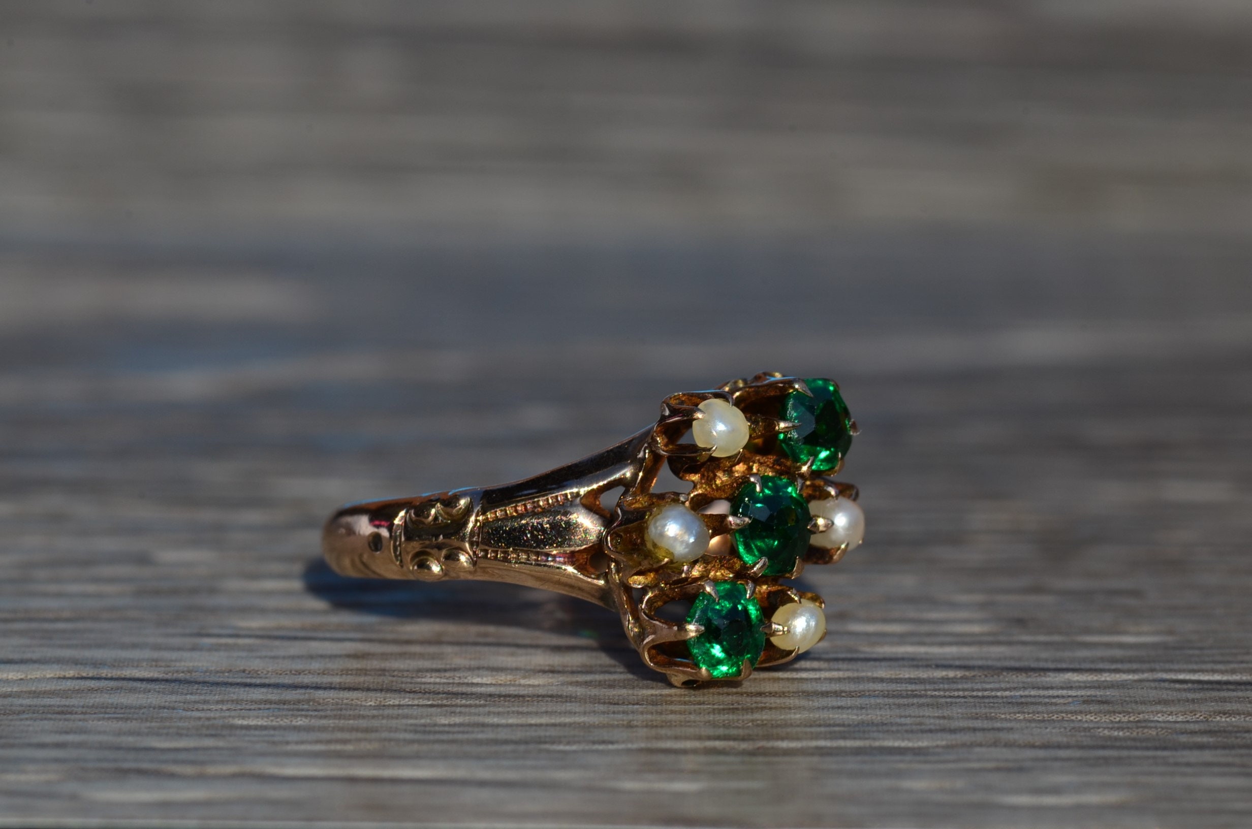 Antique Victorian Ring set with Doublets and Seed Pearls. Crafted in trendy rose gold, this ladies cocktail style ring features a diagonal line of round doublets framed by four seed pearls. Currently a finger size 4, this Victorian ring can be adjusted in size for an additional charge.