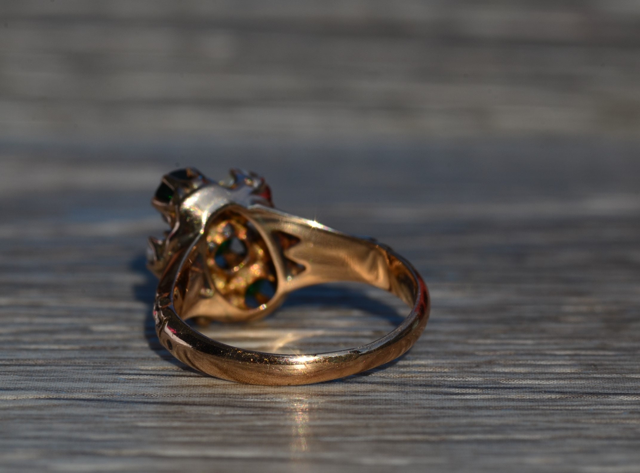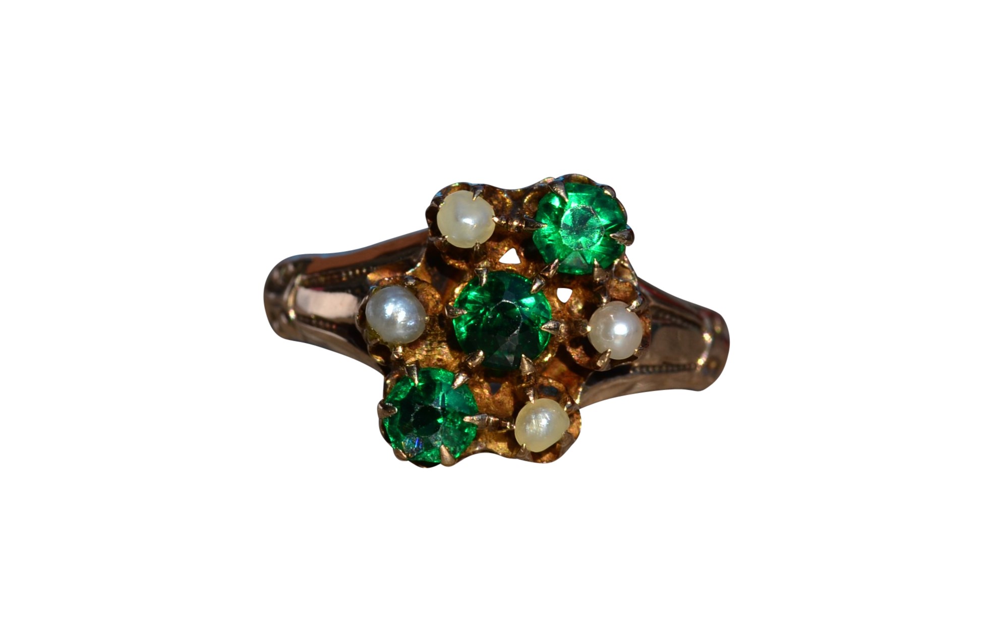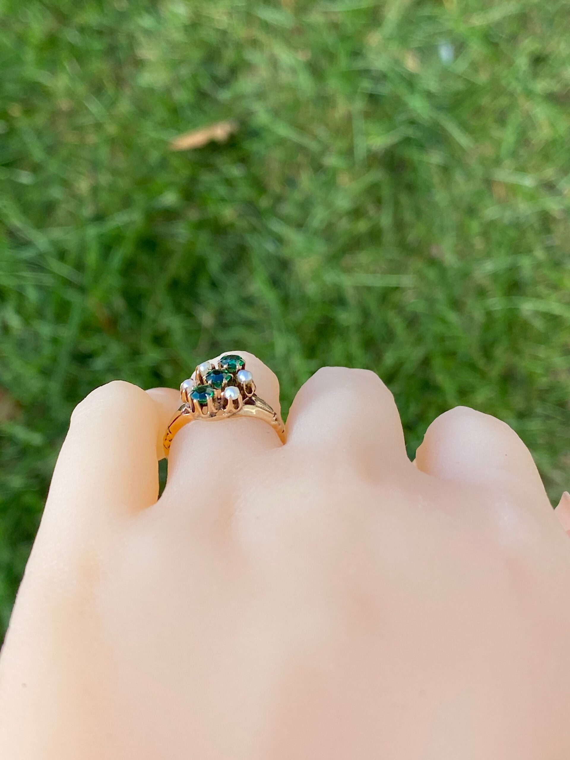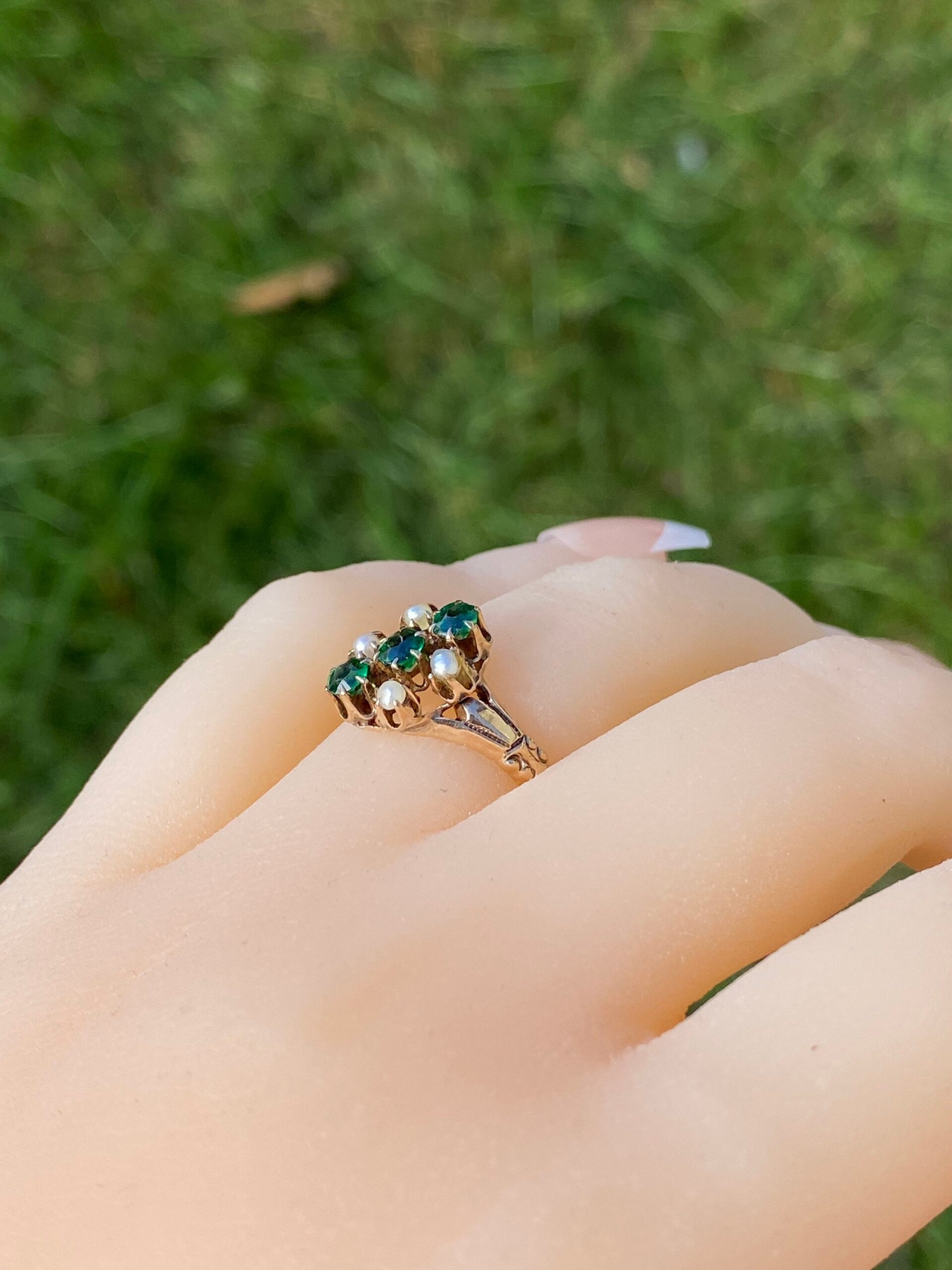 Antique Victorian Ring set with Doublets and Seed Pearls. Crafted in trendy rose gold, this ladies cocktail style ring features a diagonal line of round doublets framed by four seed pearls. Currently a finger size 4, this Victorian ring can be adjusted in size for an additional charge.