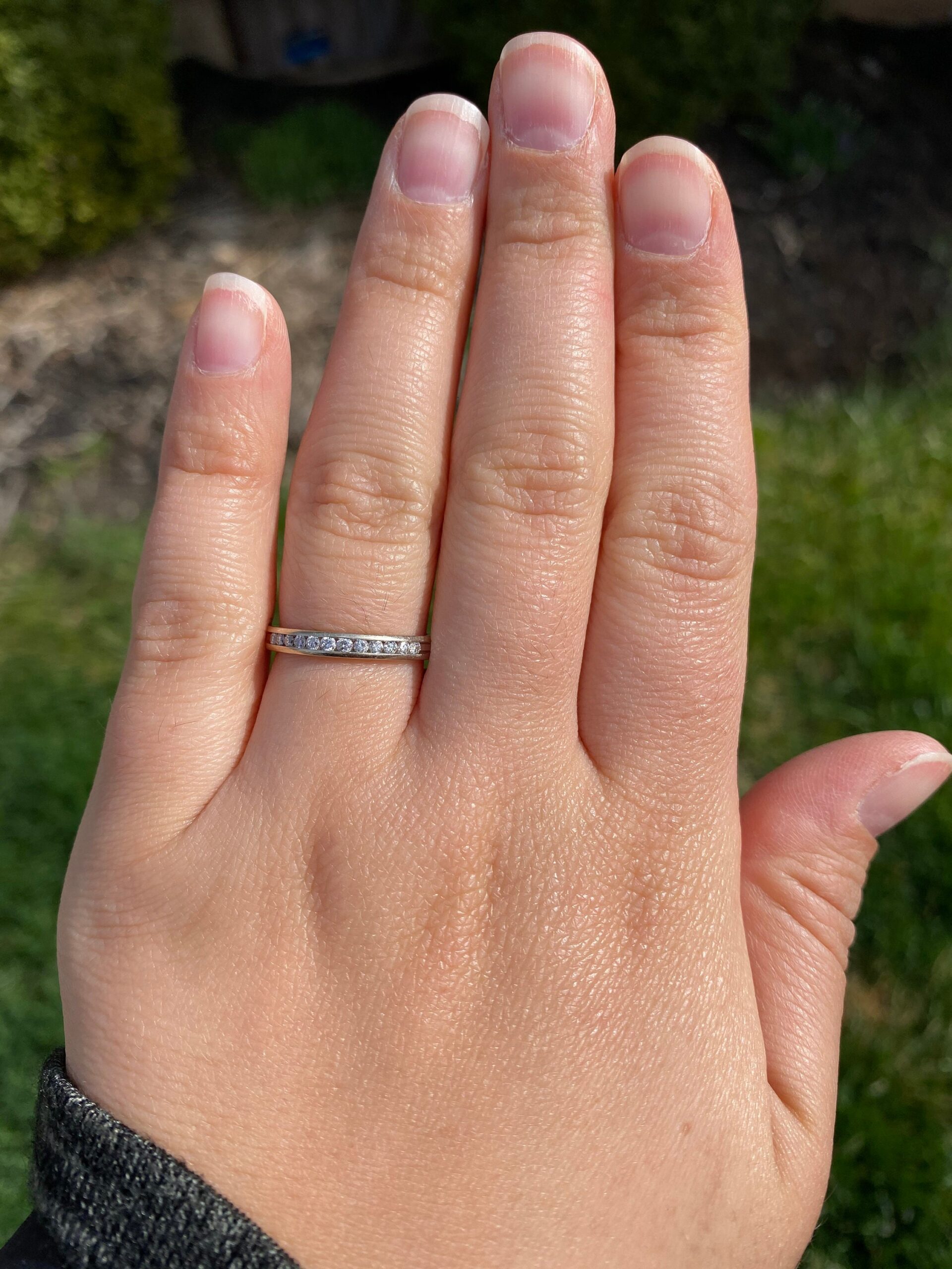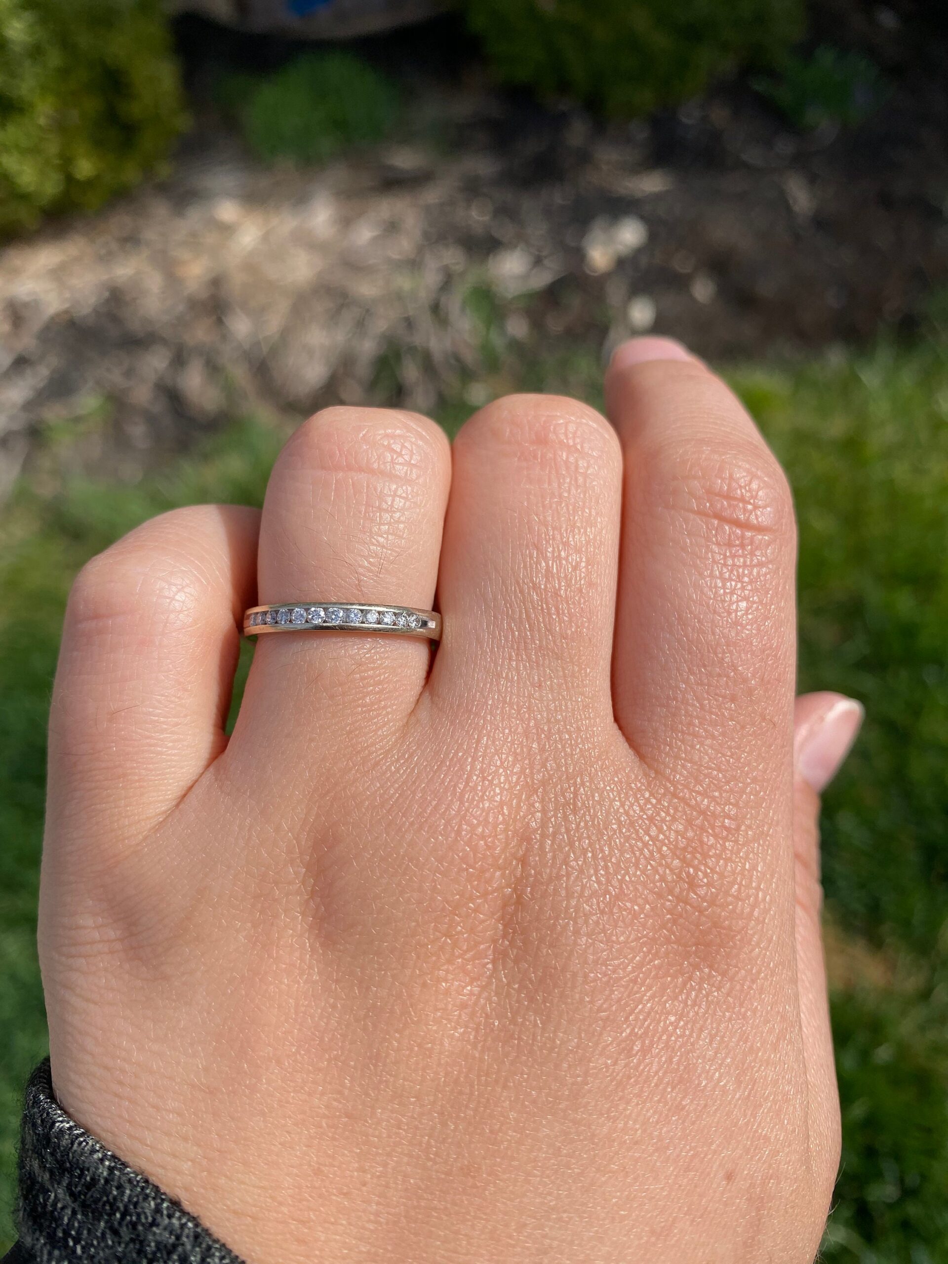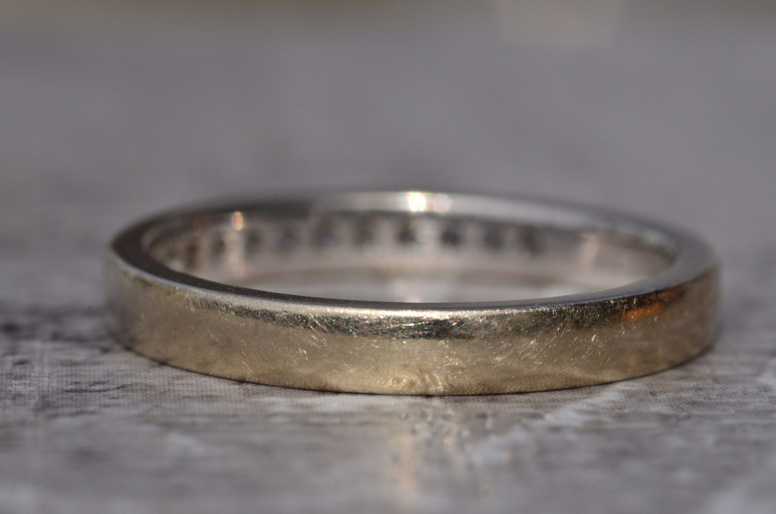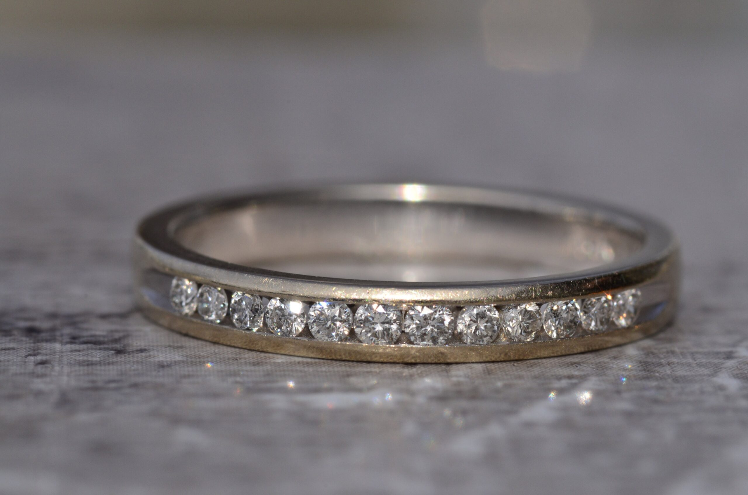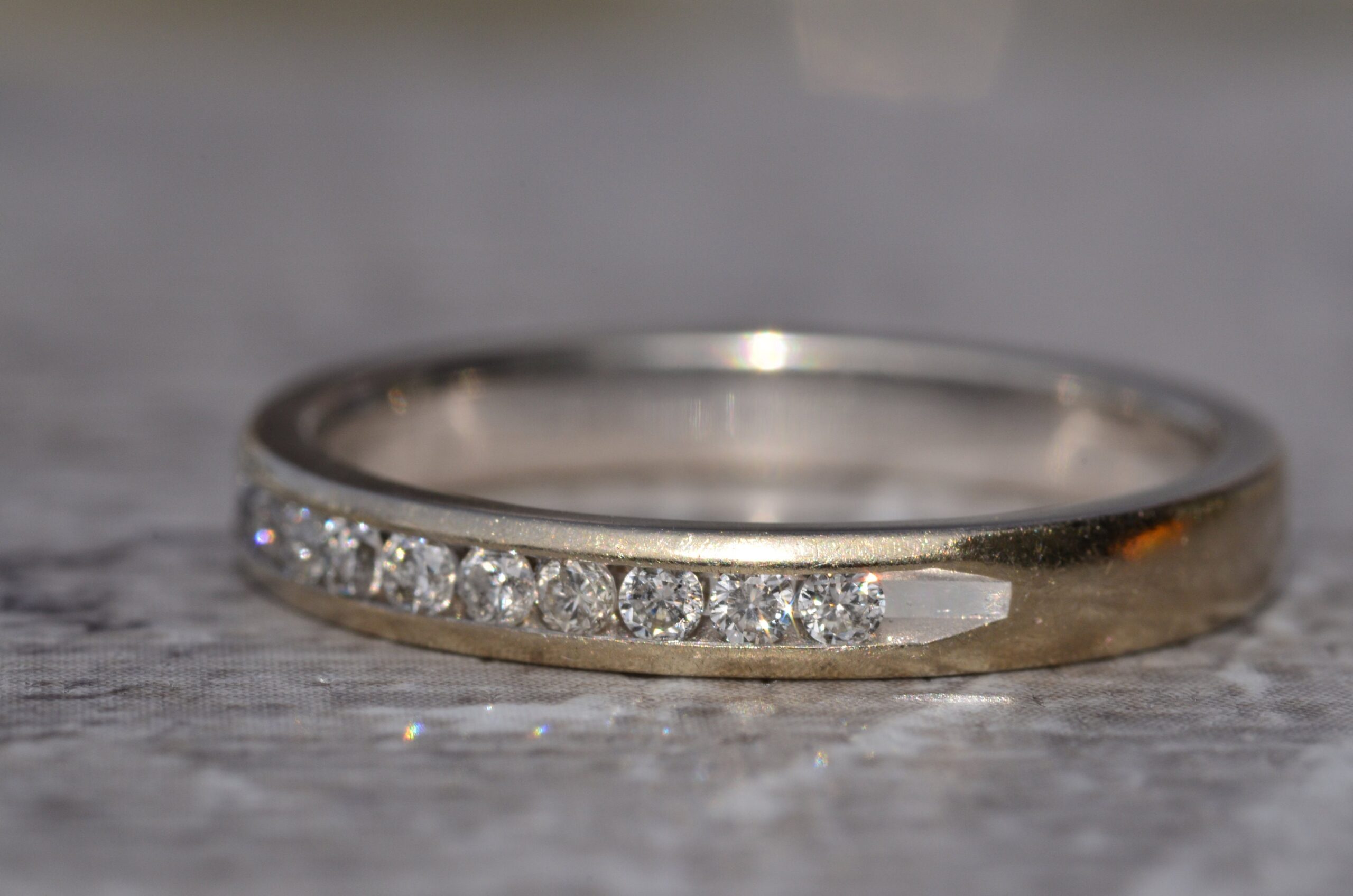 14 Karat White Gold Channel Set Diamond Band. Great for stacking or wearing alone as a wedding band, this ring features 0.12 carats of round brilliant cut diamonds. This ring is currently a finger size 7, but can be adjusted to fit any size. Pictured here the ring has not yet been rhodiumed however if you prefer the super bright white look we are happy to offer a rhodium coating complimentary prior to shipping!