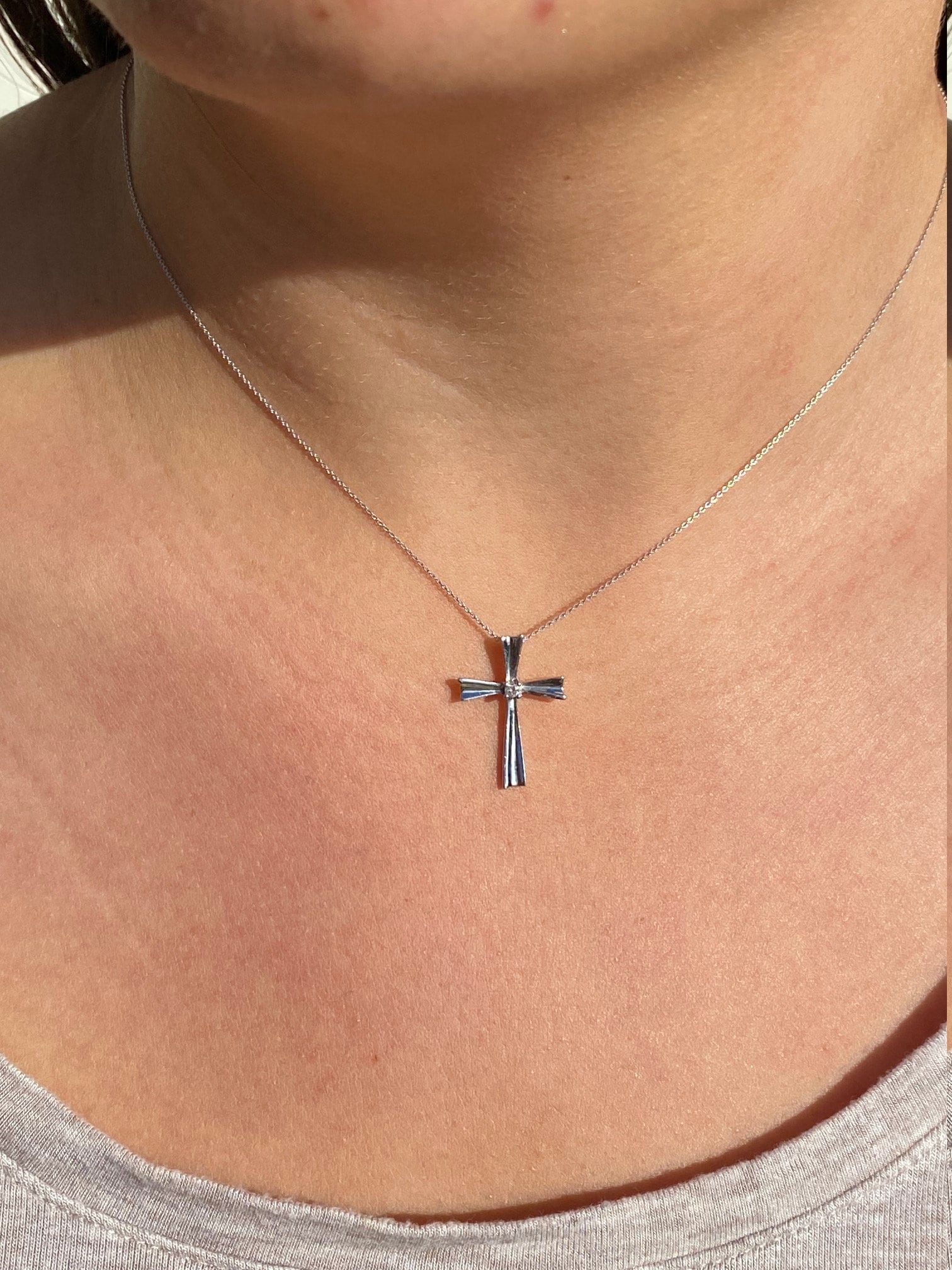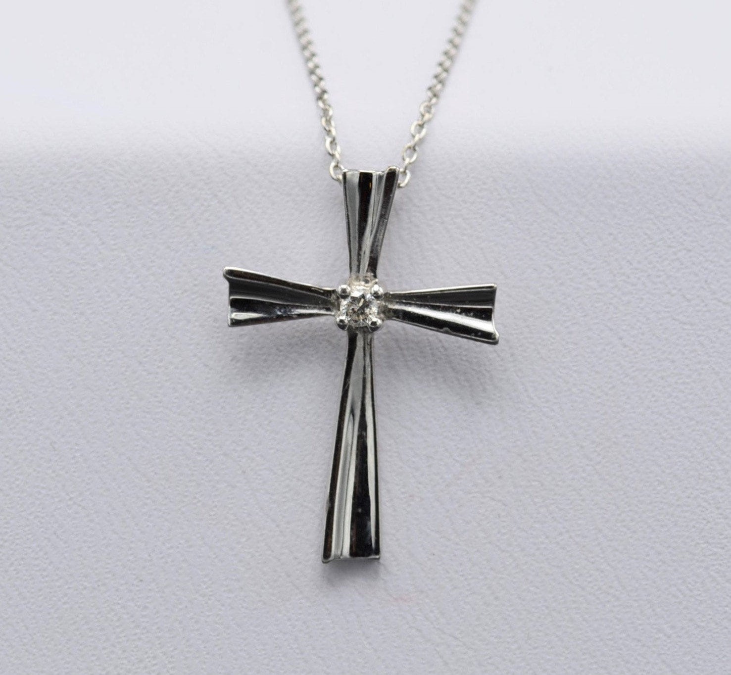 White Gold Cross Pendant set with Diamond. This pendant is crafted in 10 karat white gold and measures just under 1 inch in height. Purchase a white gold chain separately to make this pendant the perfect necklace.