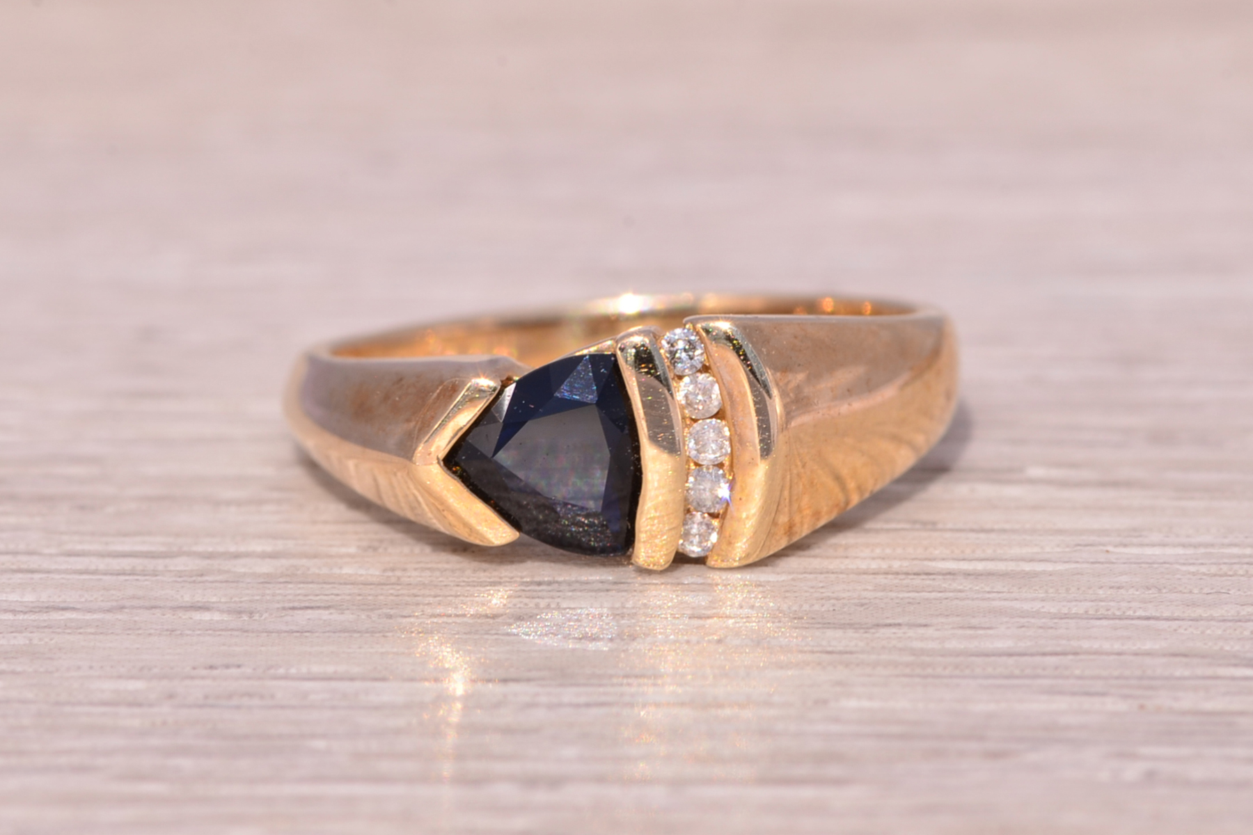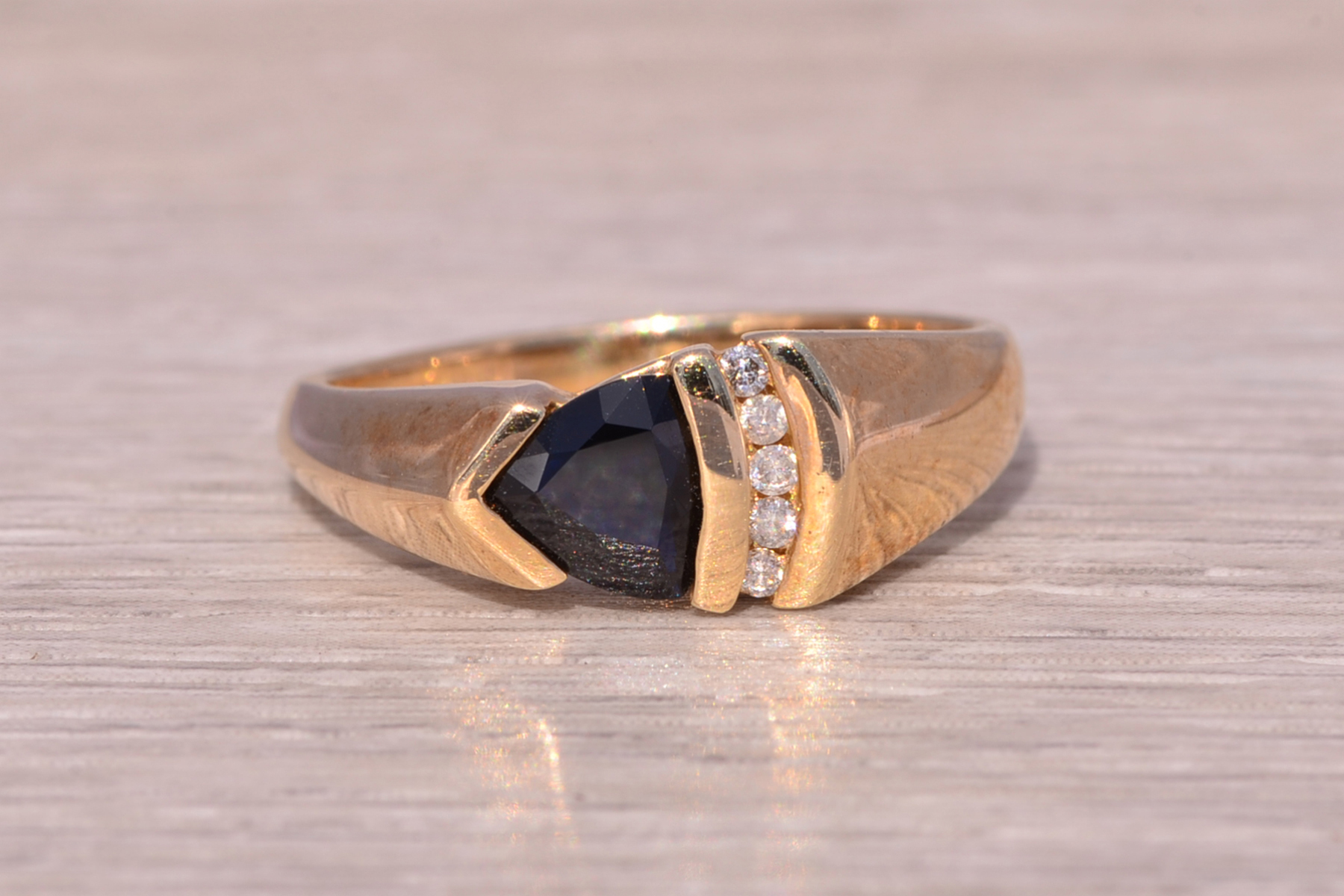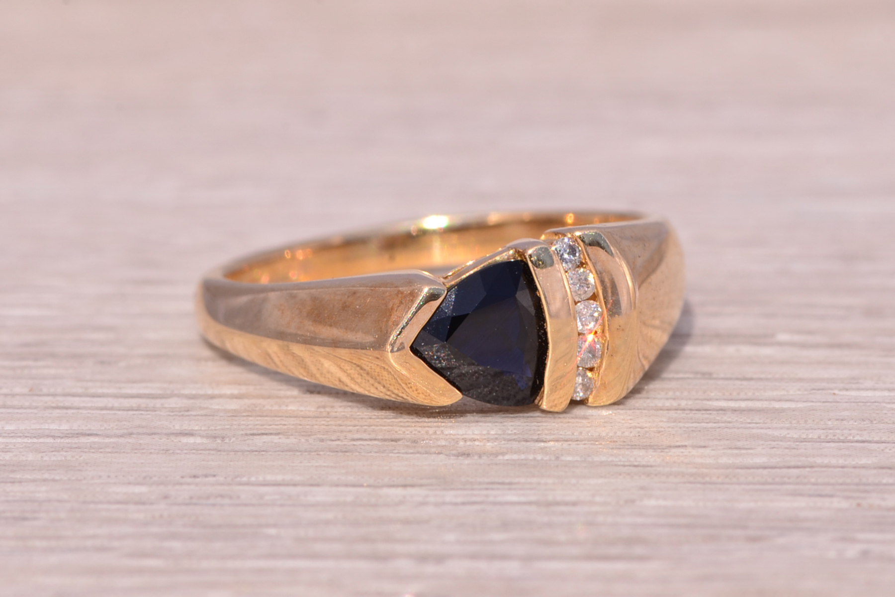 This stunning piece, known as The Sapphire Ascent, features a striking triangular cut natural sapphire at its center. The deep blue sapphire is complemented by three round natural diamonds channel set vertically, adding brilliance and contrast to the sleek, modern design. The sapphire is set in a unique angled design that adds depth and movement to the piece. The ring is crafted in yellow gold and is currently a finger size 6.75 but can be adjusted to any finger size for an additional charge upon request, ensuring a perfect fit.