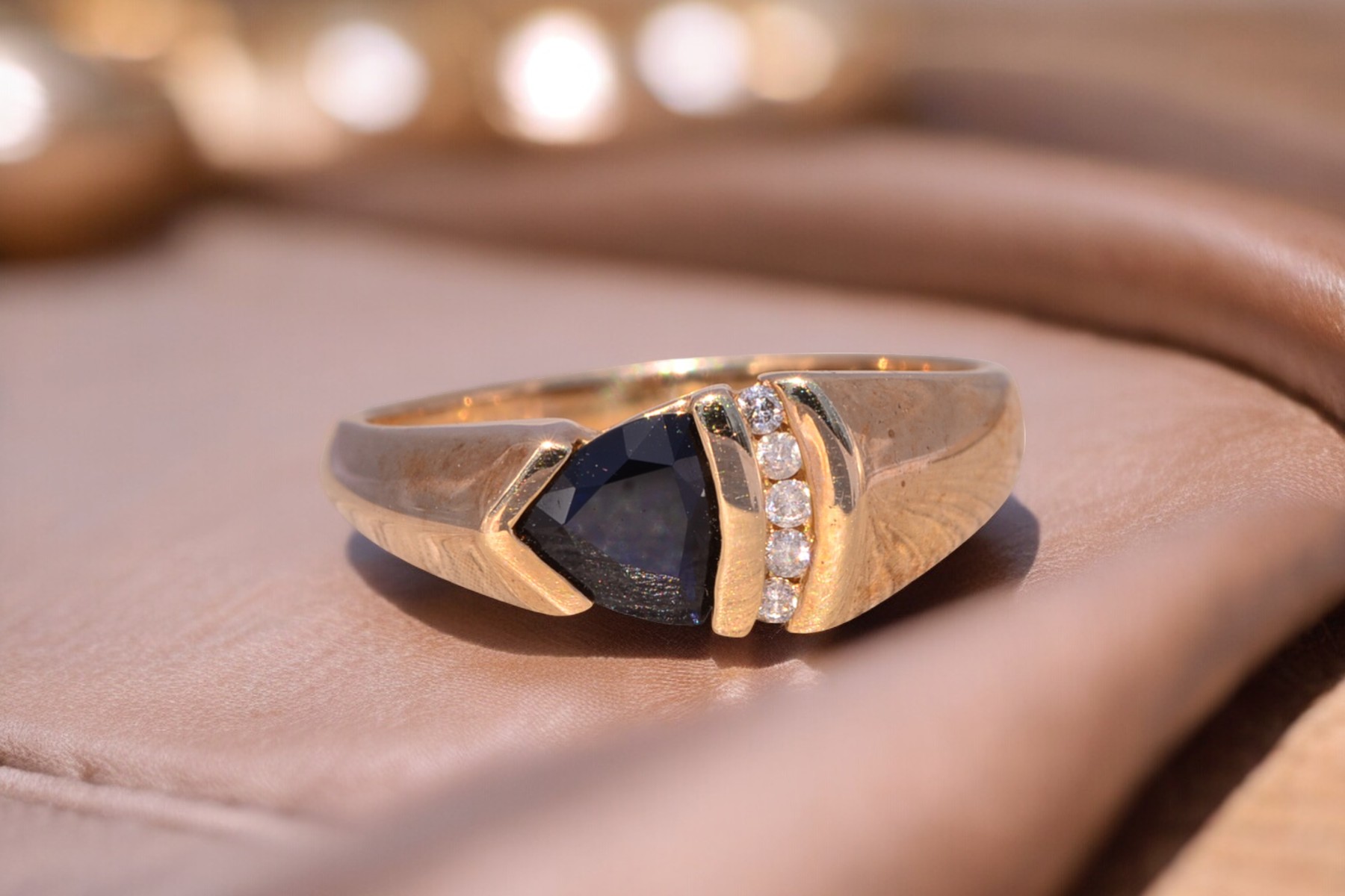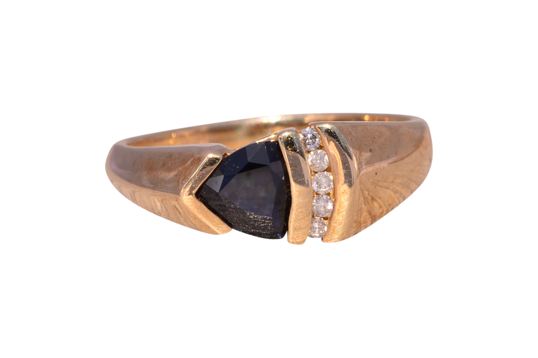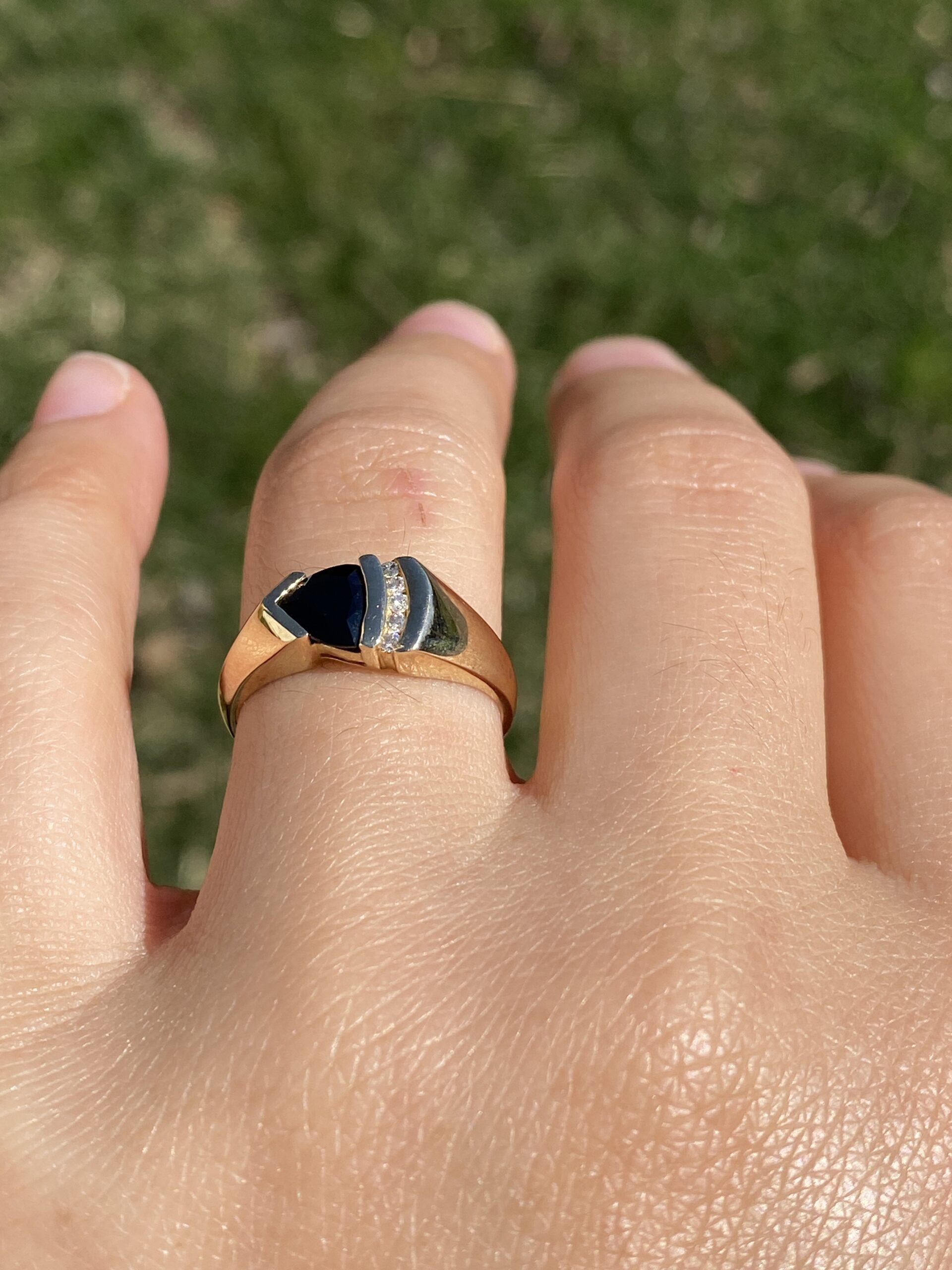 This stunning piece, known as The Sapphire Ascent, features a striking triangular cut natural sapphire at its center. The deep blue sapphire is complemented by three round natural diamonds channel set vertically, adding brilliance and contrast to the sleek, modern design. The sapphire is set in a unique angled design that adds depth and movement to the piece. The ring is crafted in yellow gold and is currently a finger size 6.75 but can be adjusted to any finger size for an additional charge upon request, ensuring a perfect fit.