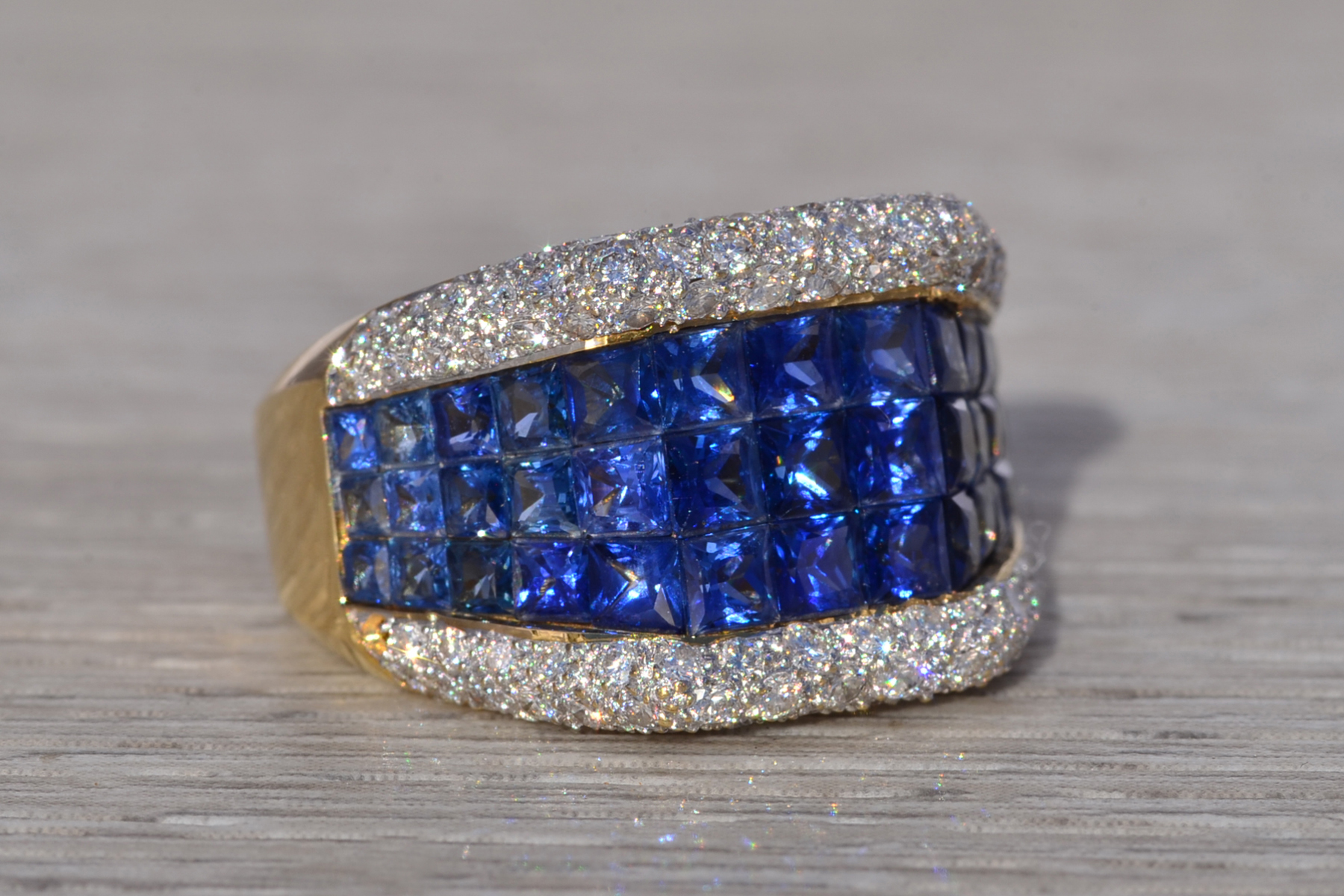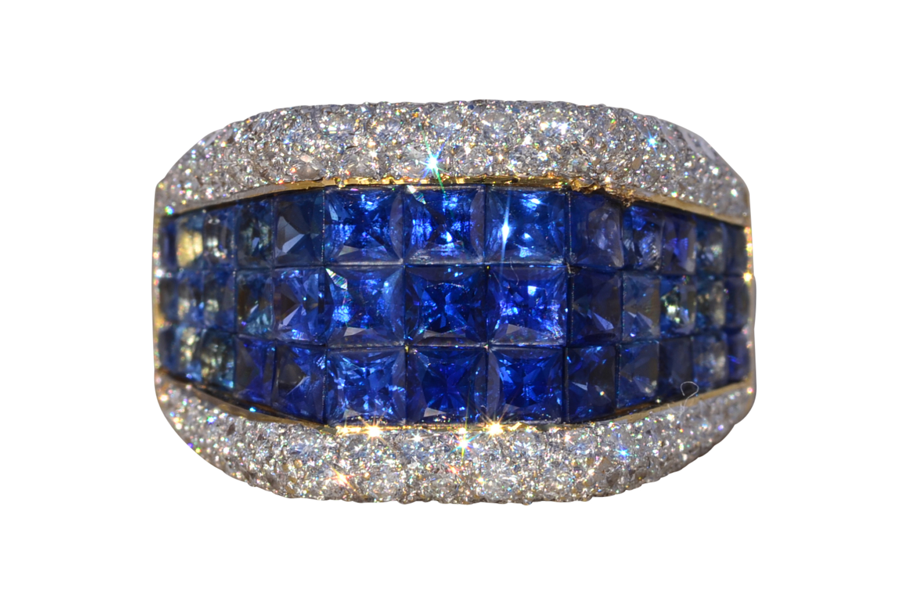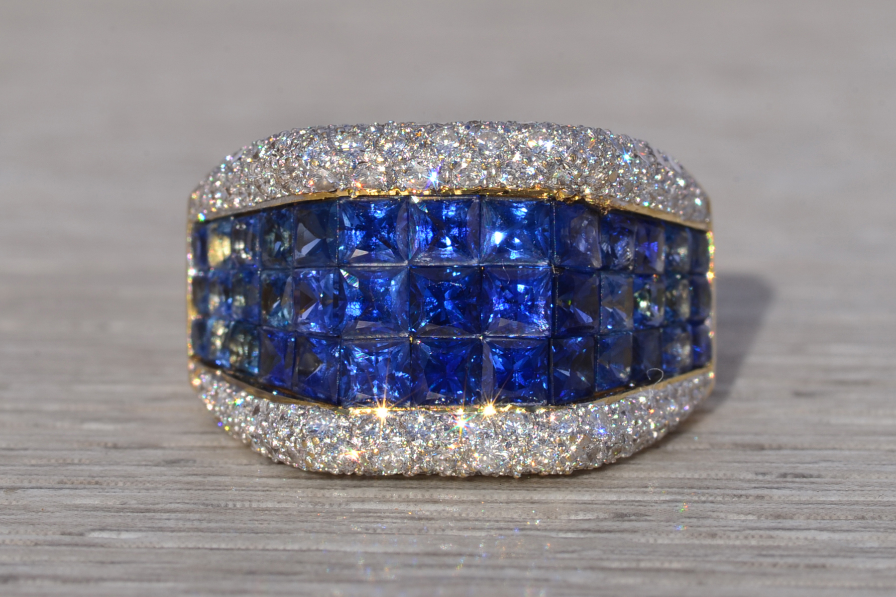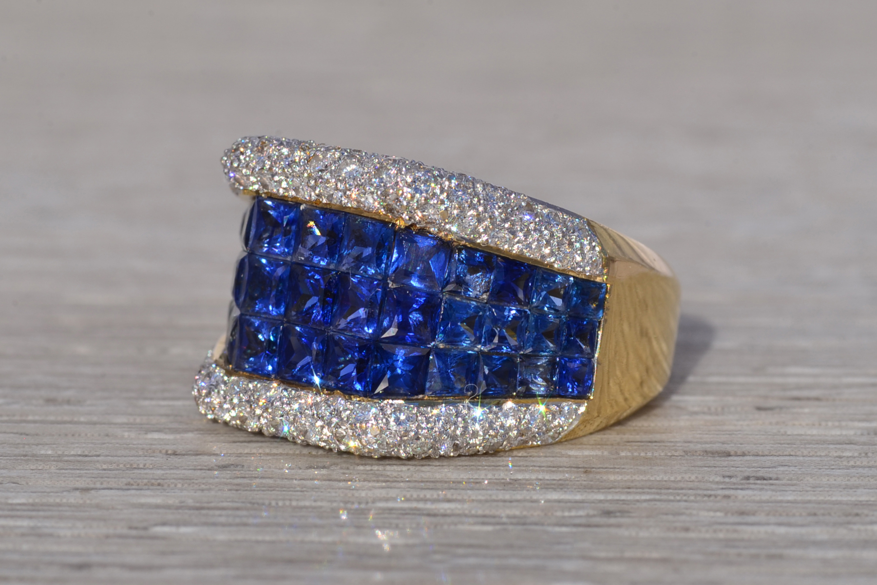 This stunning piece, known as The Sapphire Vanguard, features a bold, architectural composition centered with richly colored sapphires totaling approximately 1.80 carats. The sapphires are arranged in a structured, multi-row formation across the face of the ring, presenting a deep, saturated blue that anchors the design with strength and visual depth. Framing the sapphires above and below are rows of round brilliant cut natural diamonds totaling approximately 0.60 carats, adding contrast, brilliance, and refinement to the substantial silhouette. The ring is crafted in 18 karat yellow gold and is currently a finger size 6.5 yet can be adjusted to any finger size for an additional charge upon request, ensuring a perfect fit.