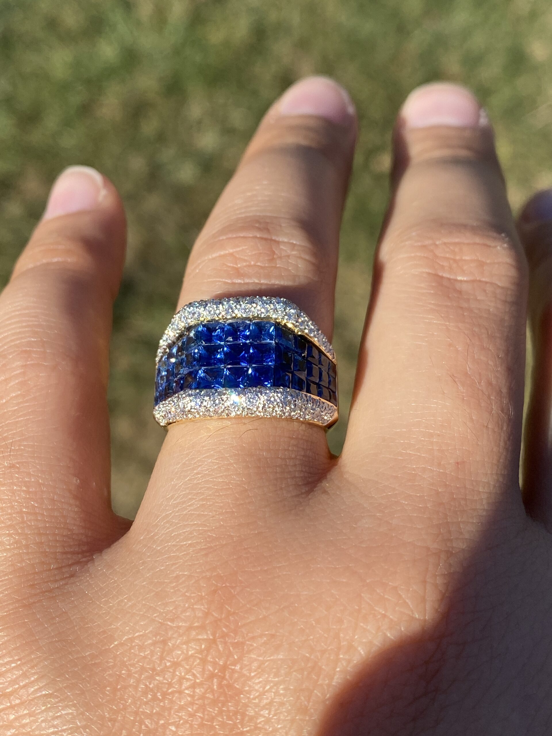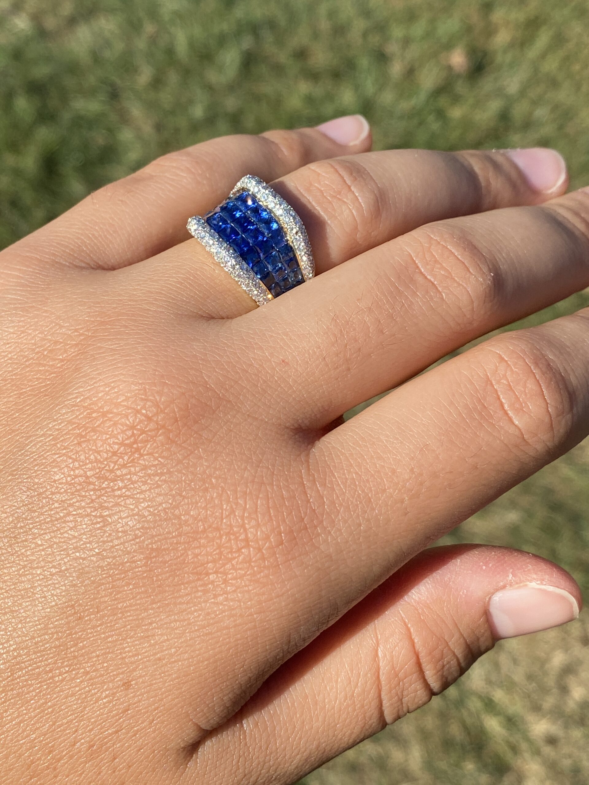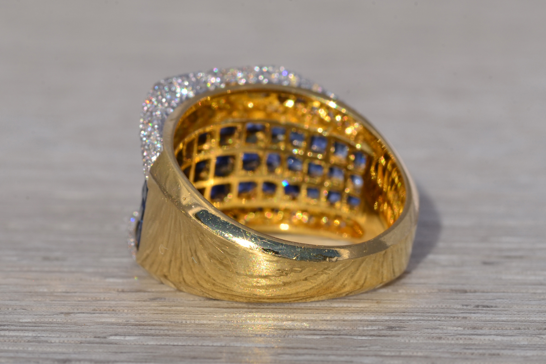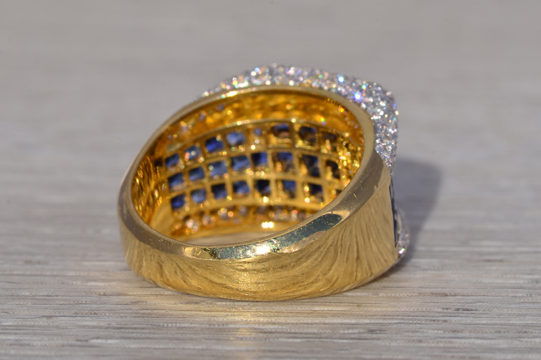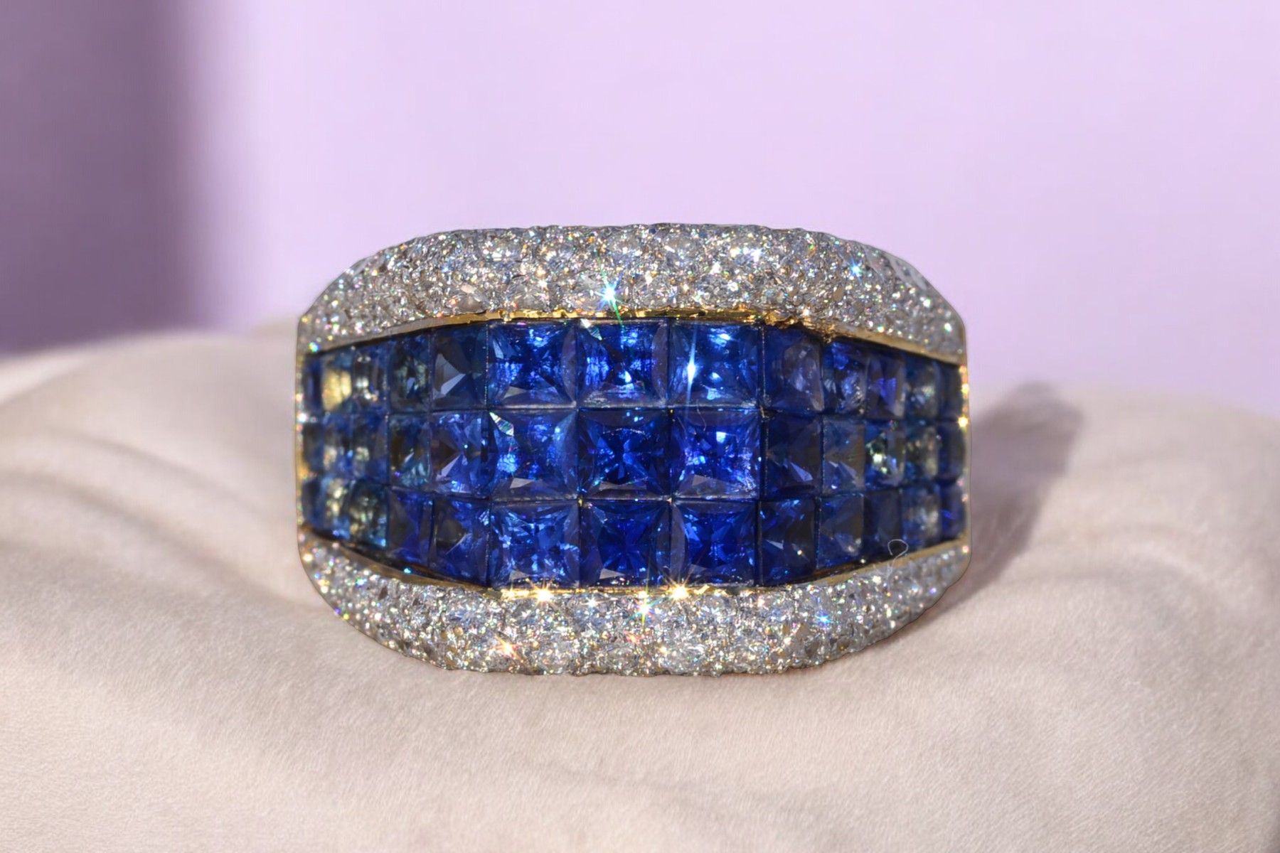 This stunning piece, known as The Sapphire Vanguard, features a bold, architectural composition centered with richly colored sapphires totaling approximately 1.80 carats. The sapphires are arranged in a structured, multi-row formation across the face of the ring, presenting a deep, saturated blue that anchors the design with strength and visual depth. Framing the sapphires above and below are rows of round brilliant cut natural diamonds totaling approximately 0.60 carats, adding contrast, brilliance, and refinement to the substantial silhouette. The ring is crafted in 18 karat yellow gold and is currently a finger size 6.5 yet can be adjusted to any finger size for an additional charge upon request, ensuring a perfect fit.