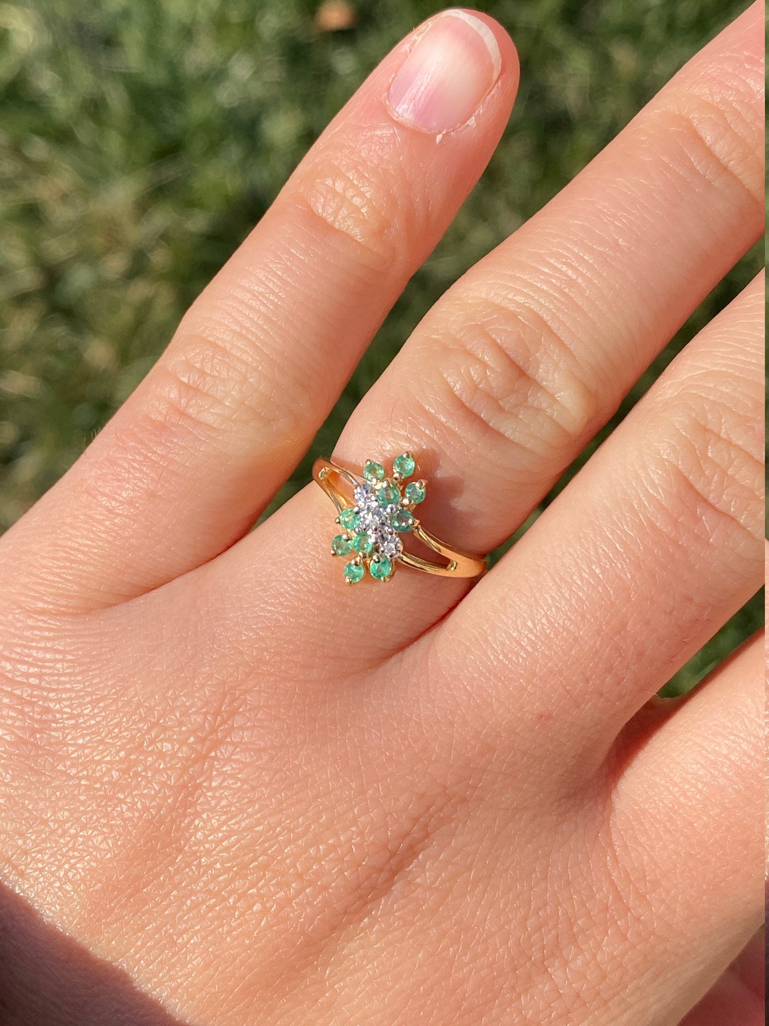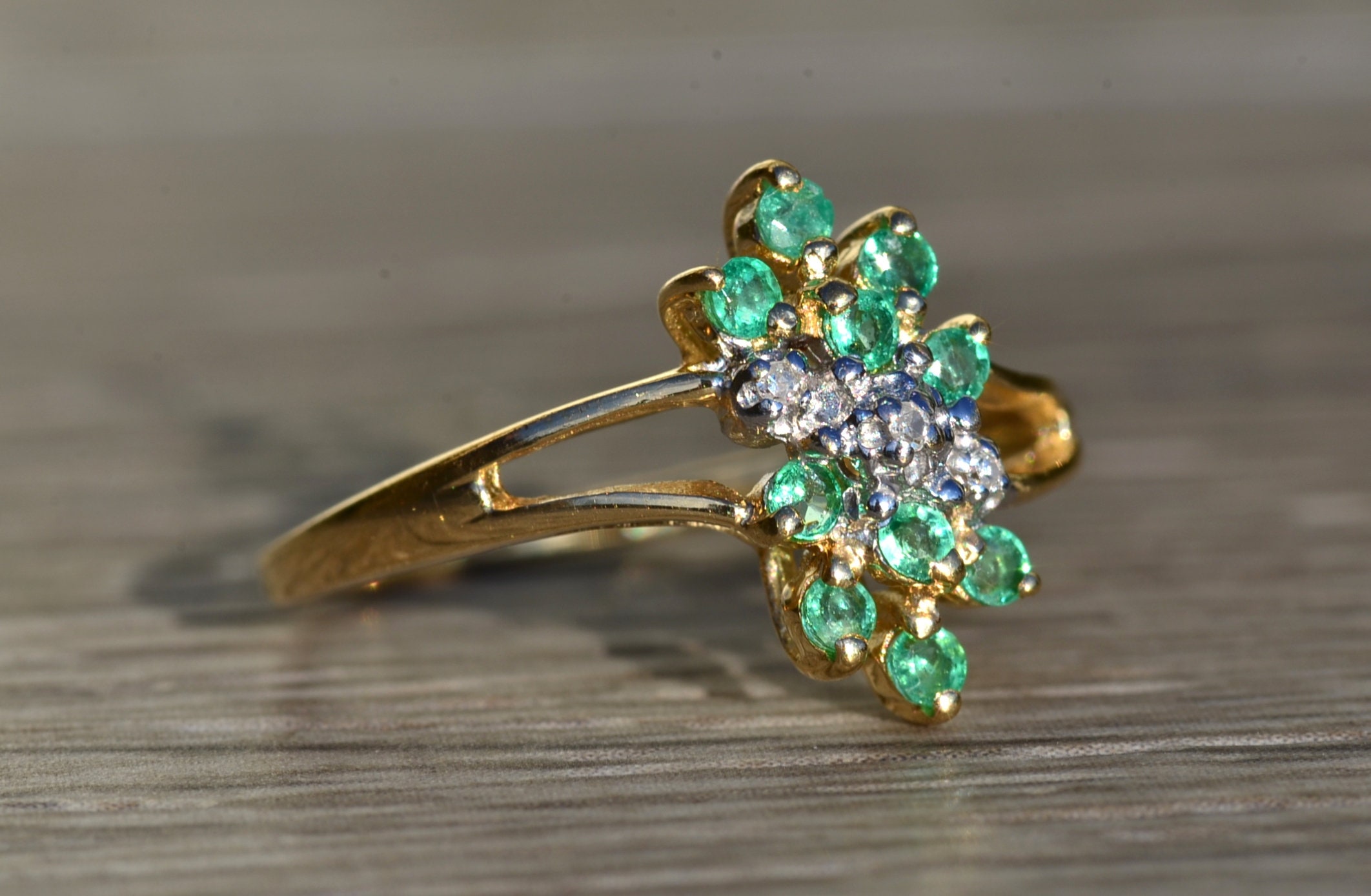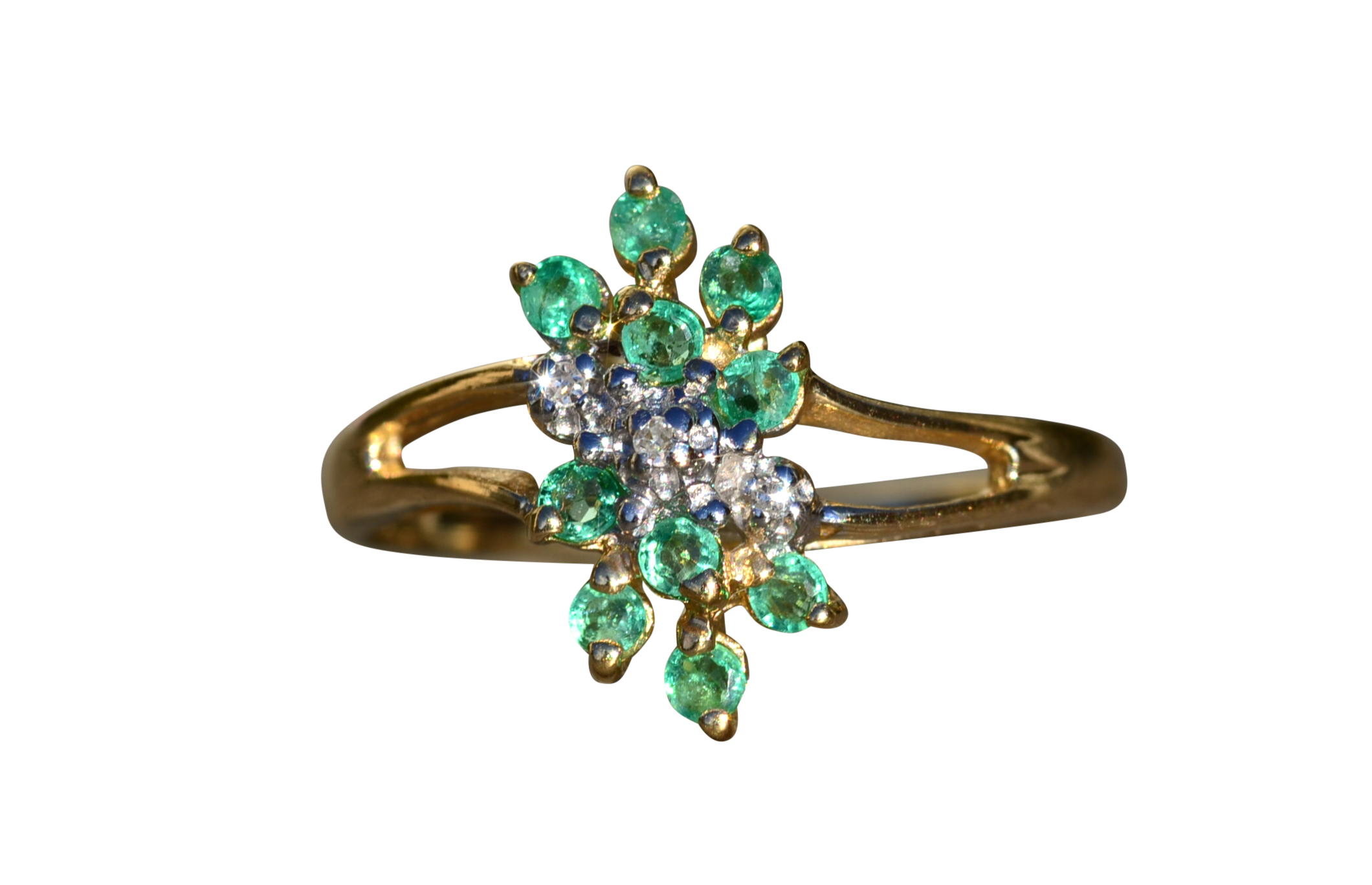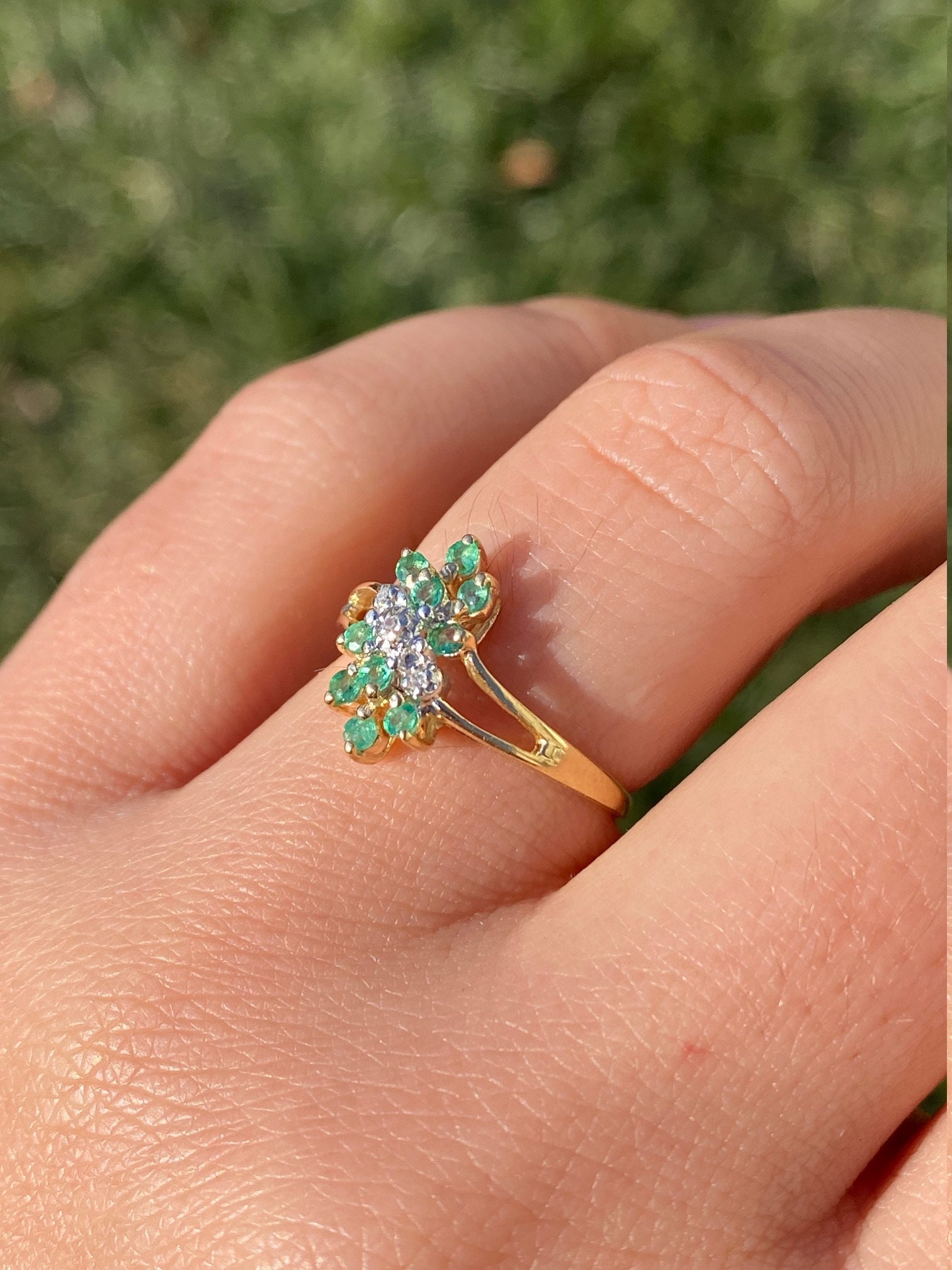 The Scott’s Hill: Ladies 14K Gold Emerald and Diamond Cluster Ring. Crafted in 14 karat yellow gold, this ring features three center diamonds amidst a cluster of green emeralds. The band’s split shank makes the center section pop in size. Currently a finger size. 6, this ring can be resized for an additional charge.