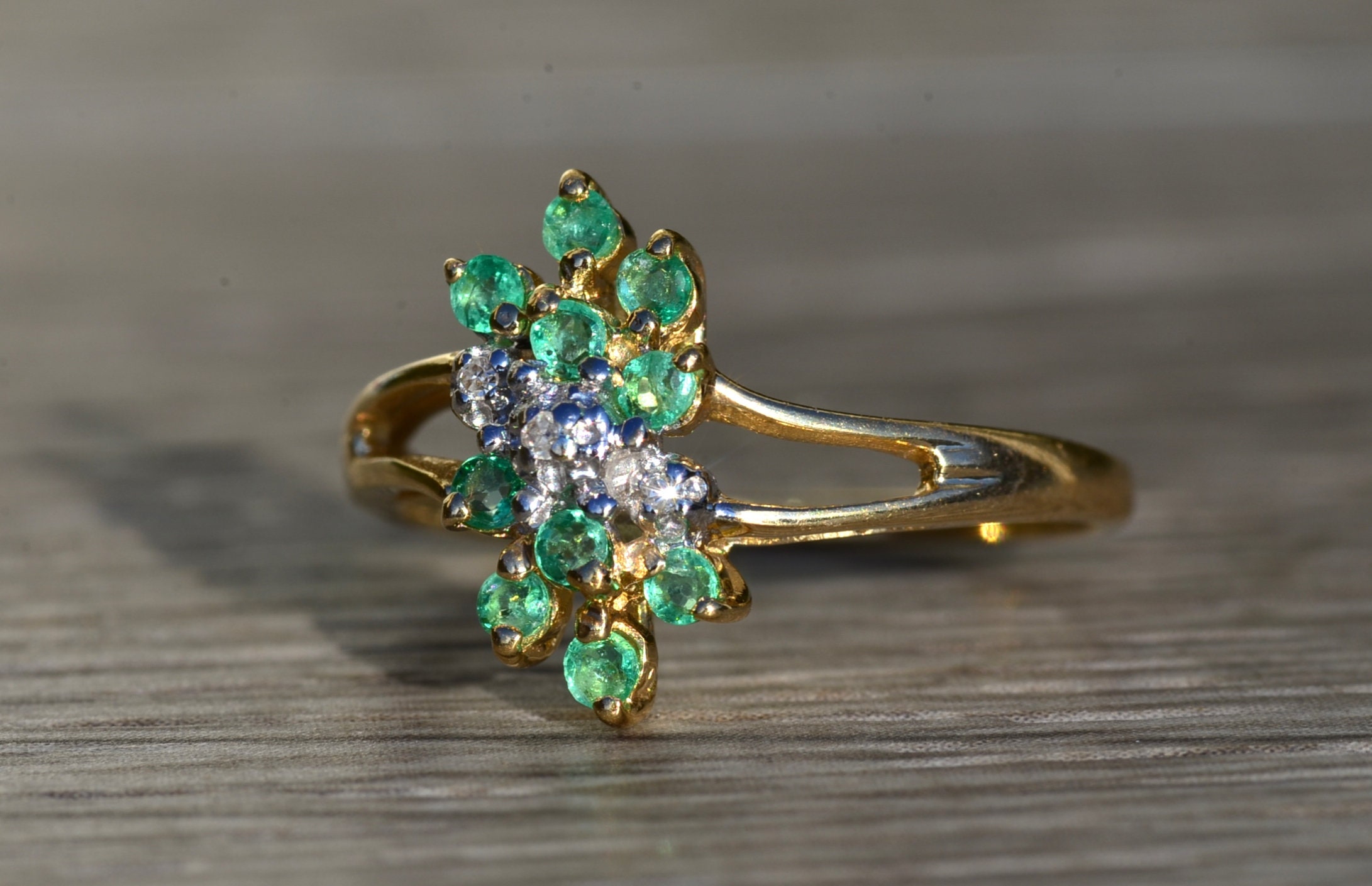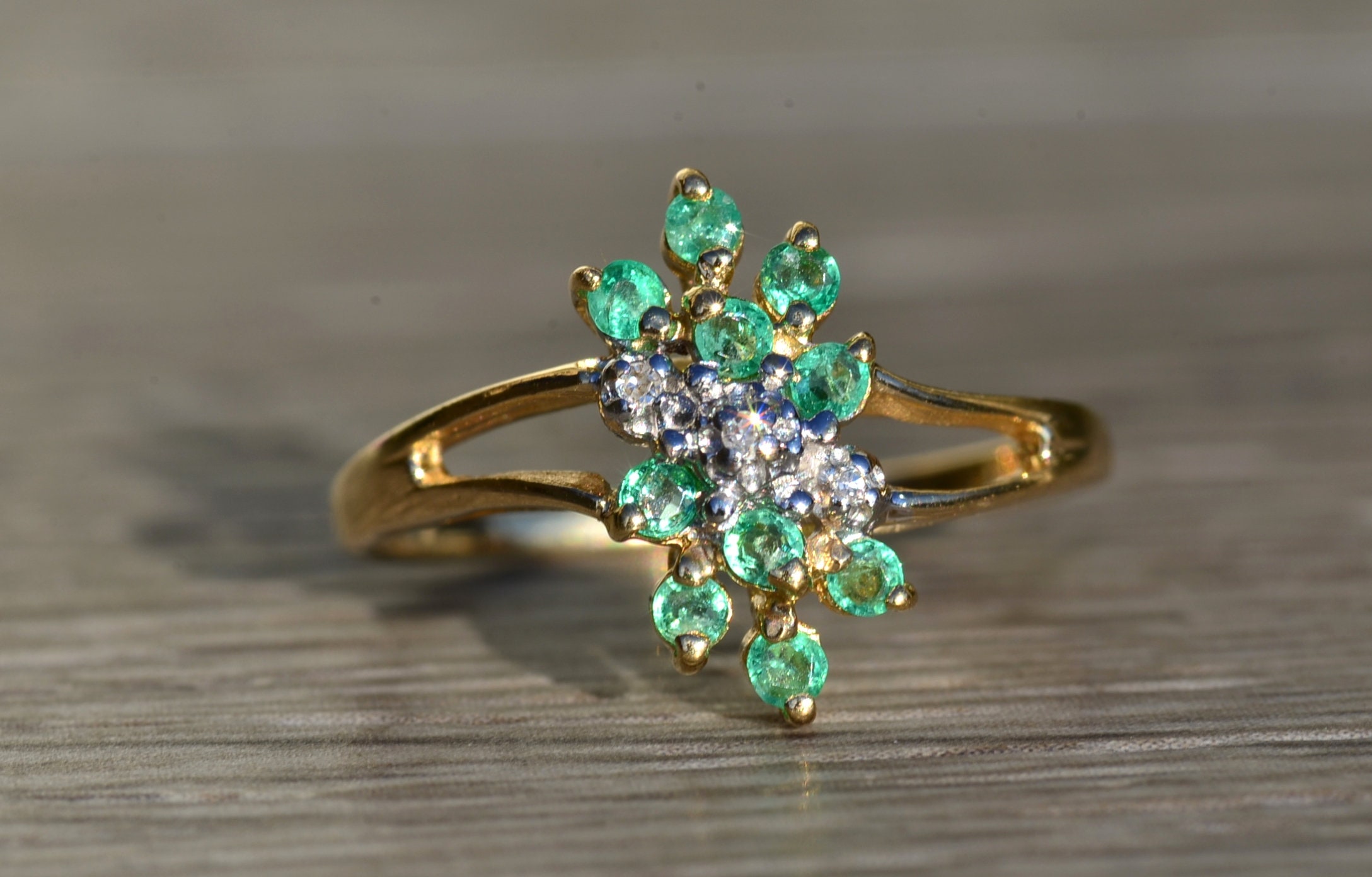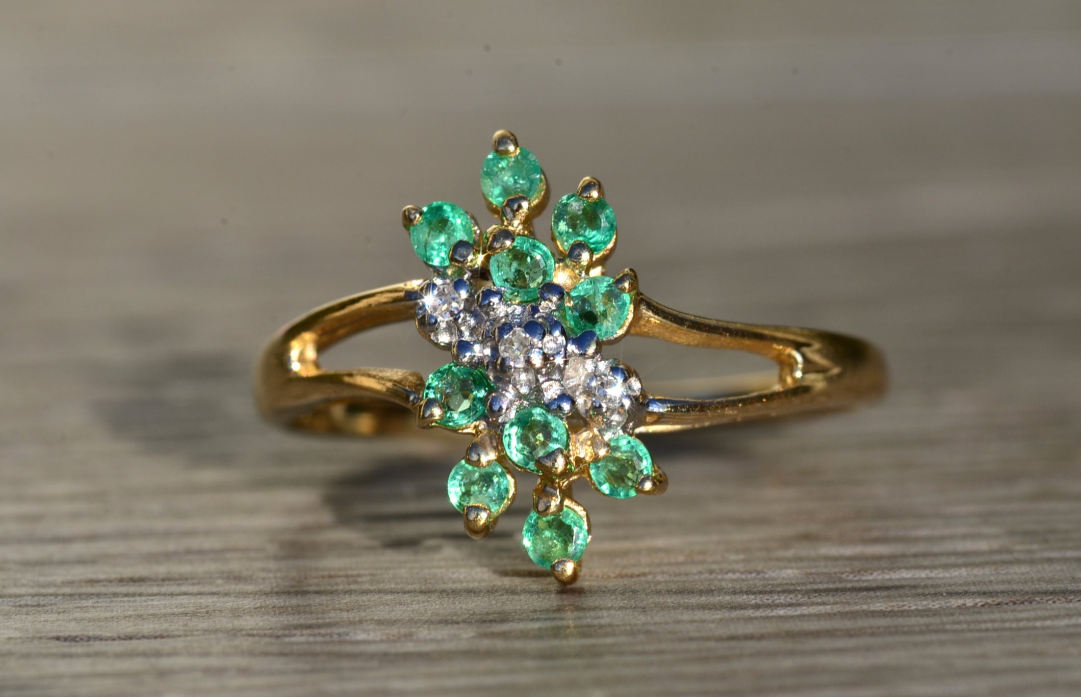 The Scott’s Hill: Ladies 14K Gold Emerald and Diamond Cluster Ring. Crafted in 14 karat yellow gold, this ring features three center diamonds amidst a cluster of green emeralds. The band’s split shank makes the center section pop in size. Currently a finger size. 6, this ring can be resized for an additional charge.