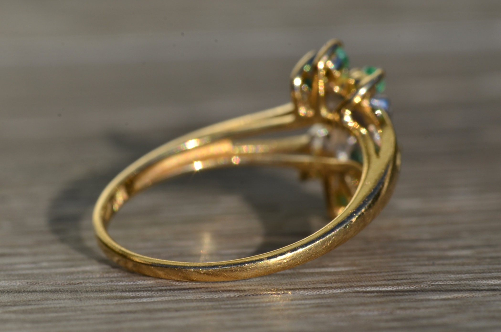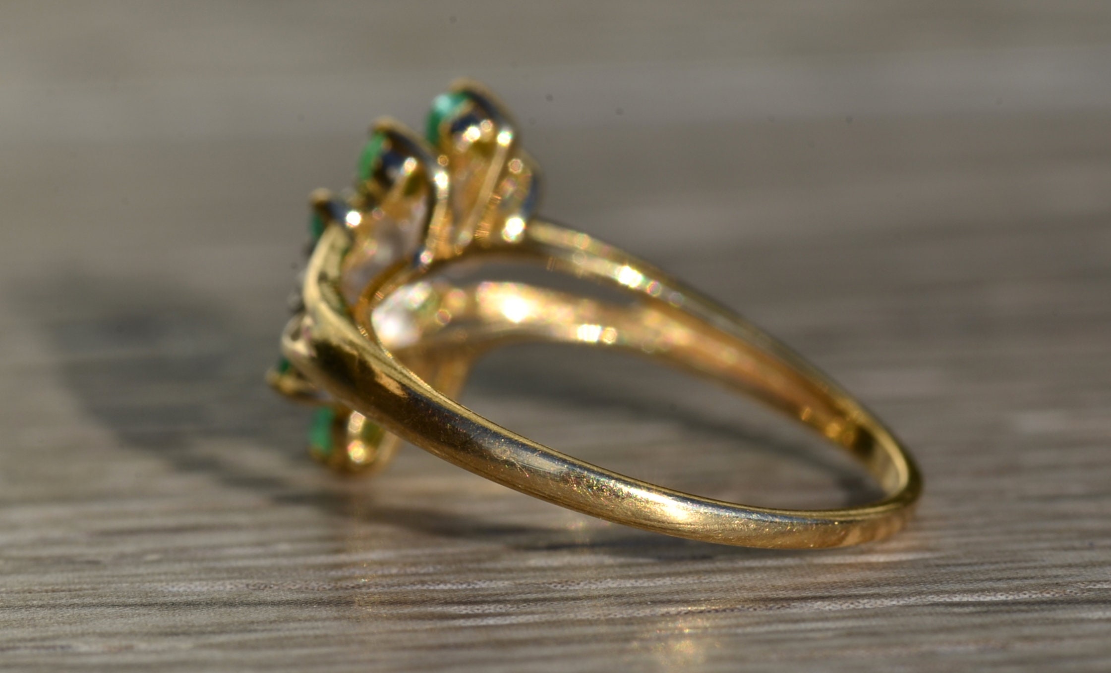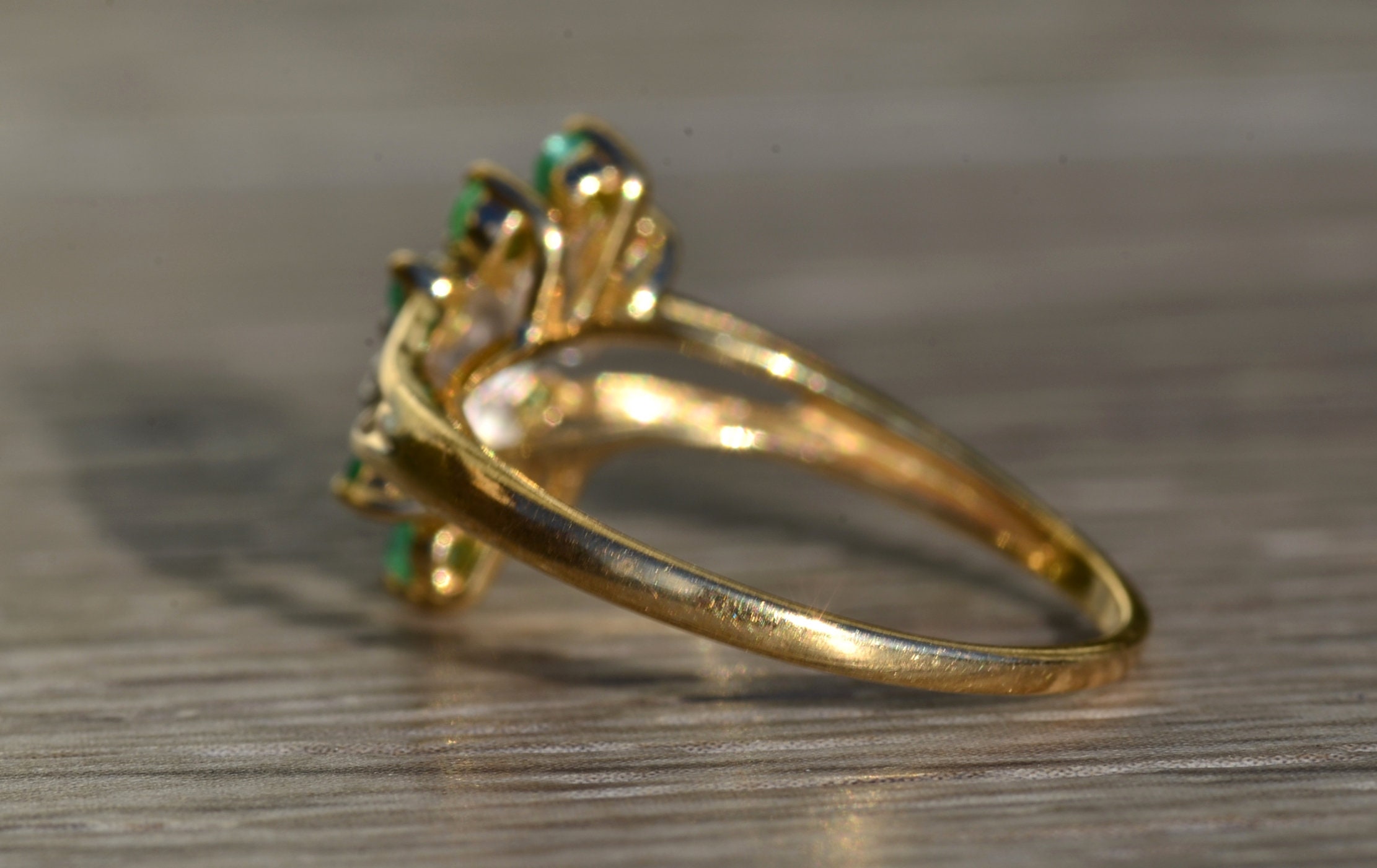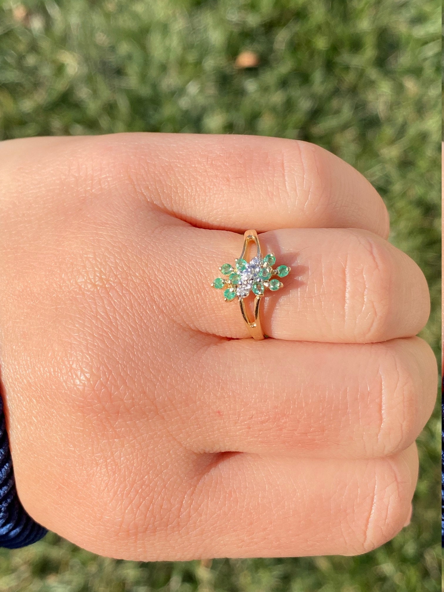 The Scott’s Hill: Ladies 14K Gold Emerald and Diamond Cluster Ring. Crafted in 14 karat yellow gold, this ring features three center diamonds amidst a cluster of green emeralds. The band’s split shank makes the center section pop in size. Currently a finger size. 6, this ring can be resized for an additional charge.