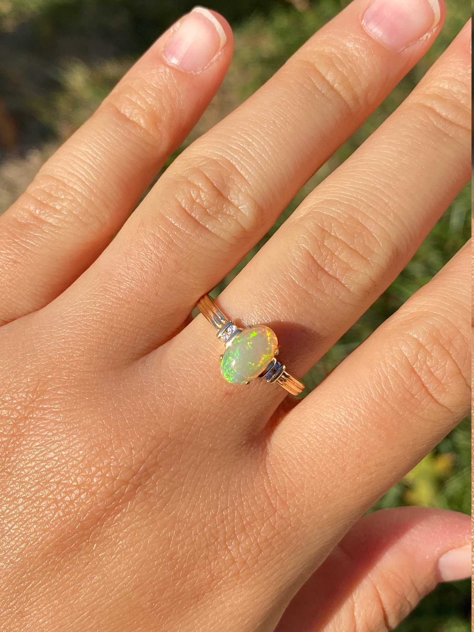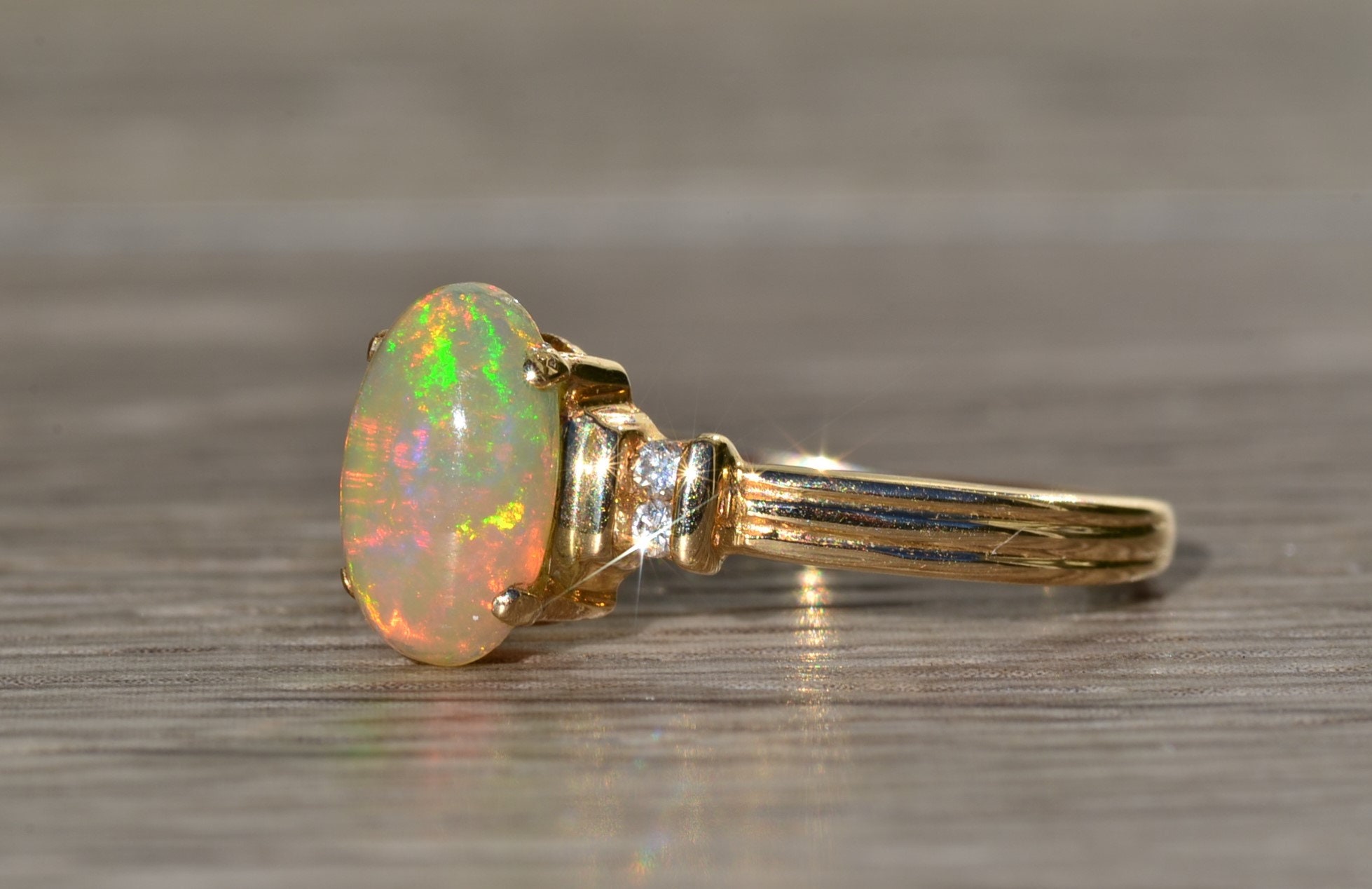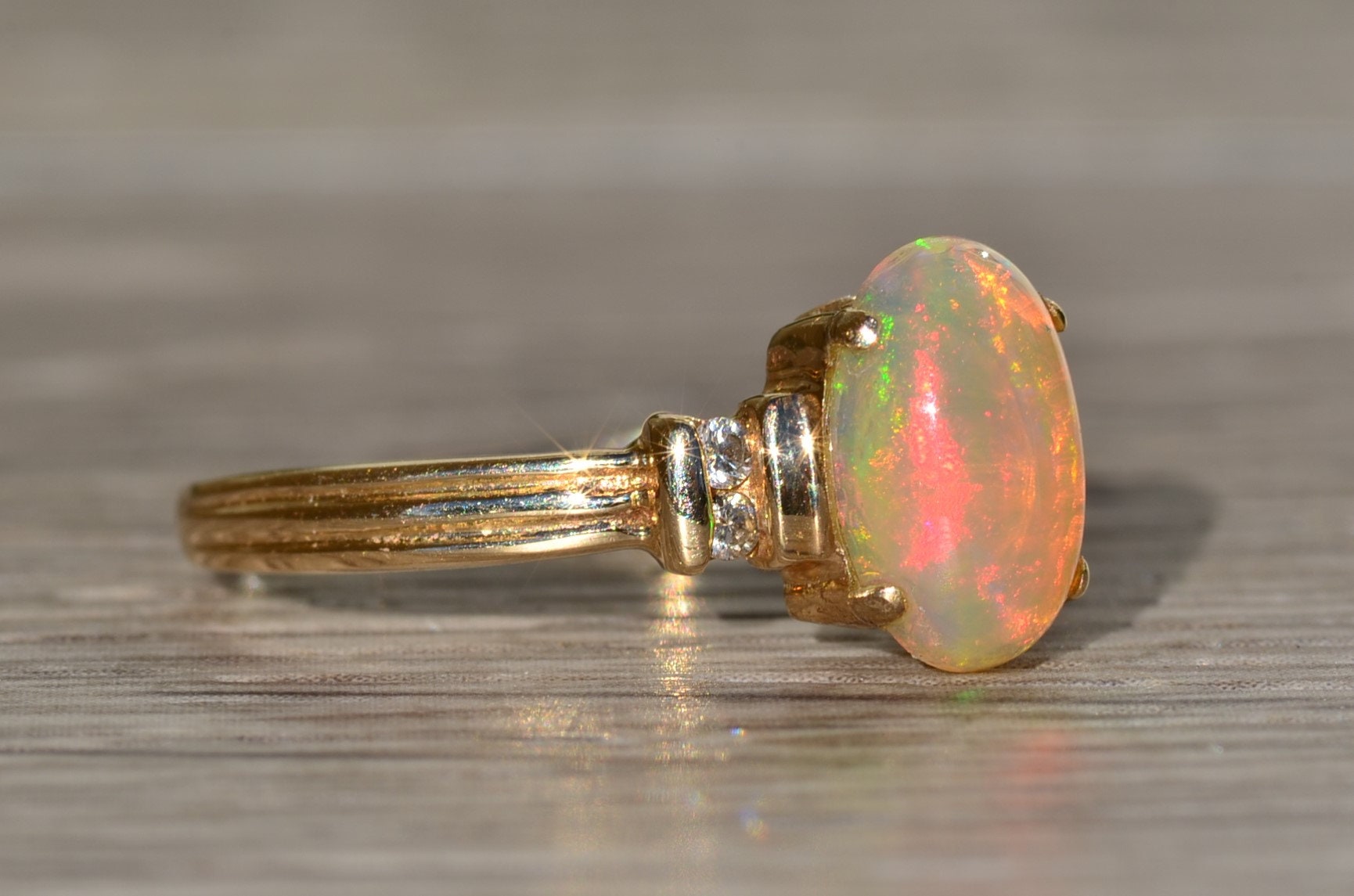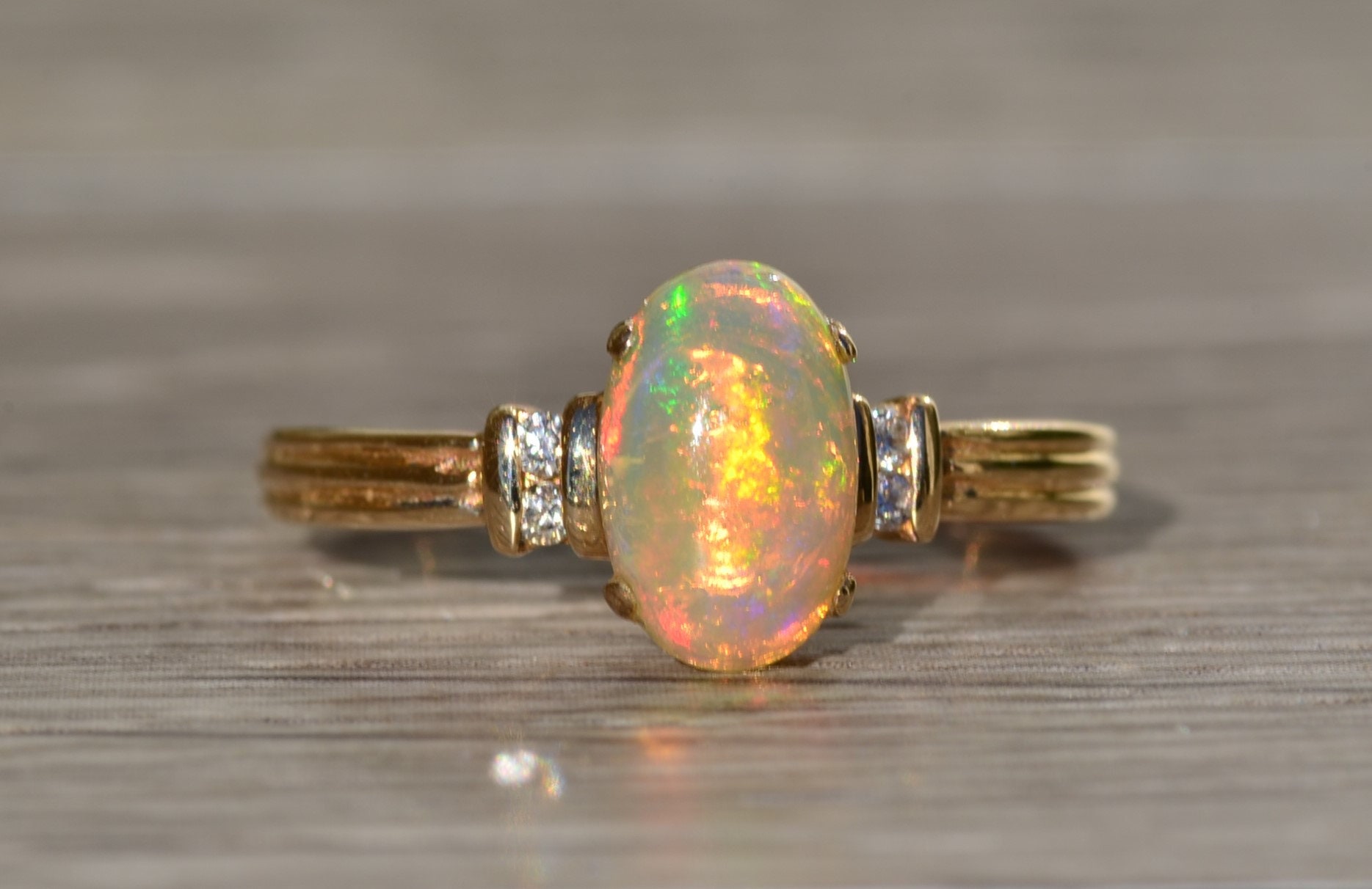 Ladies Vintage 14K Gold Ring set with 1.25 CT Opal and Diamonds. Crafted in 14 karat yellow gold, this ladies cocktail ring centers on a four prong set oval cut opal. The opal has a total carat weight of 1.25 carats. Lovely accent diamonds accompany either side of the center. This ring is currently a finger size 9 and is able to be resized for an additional charge.