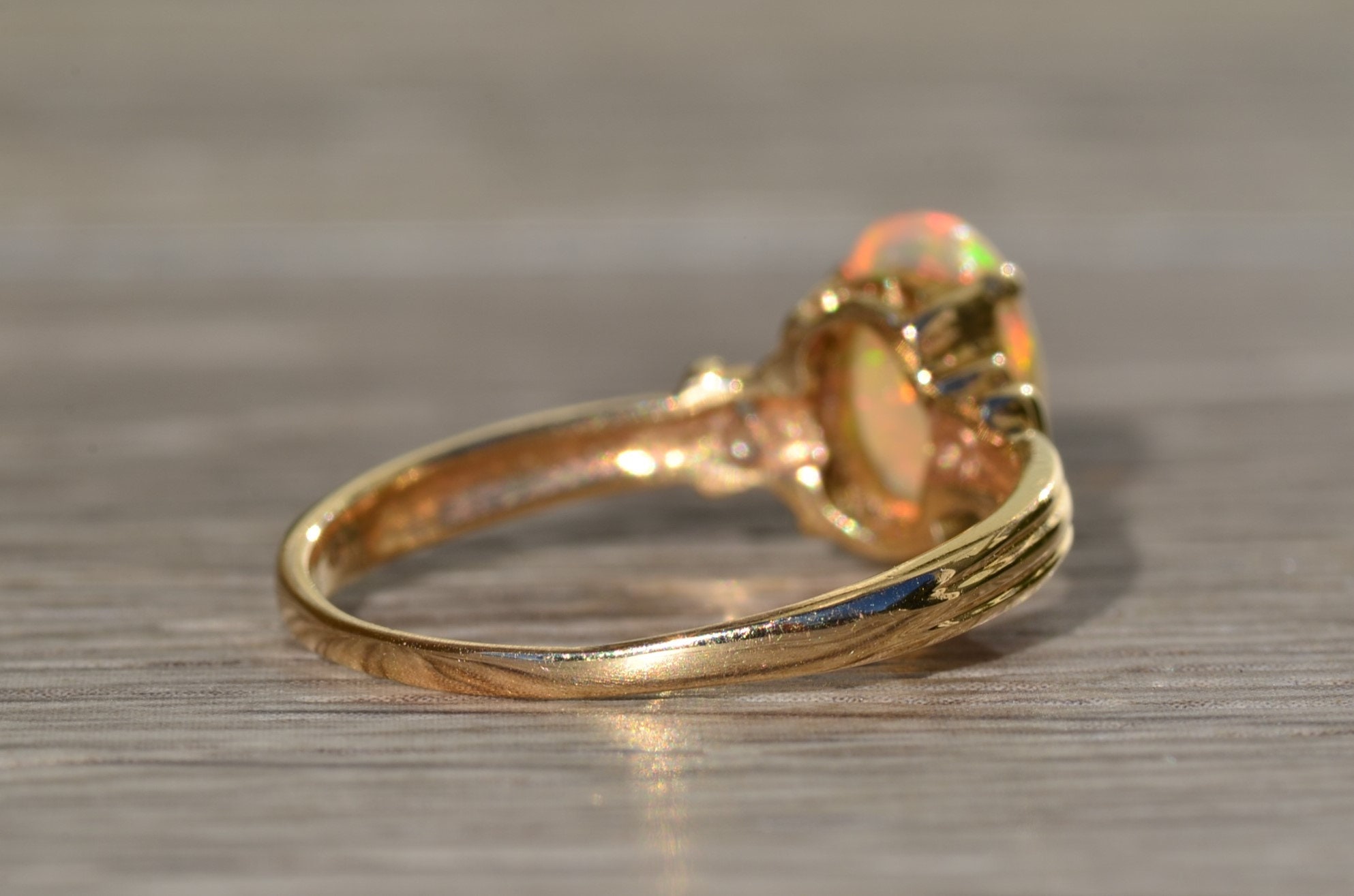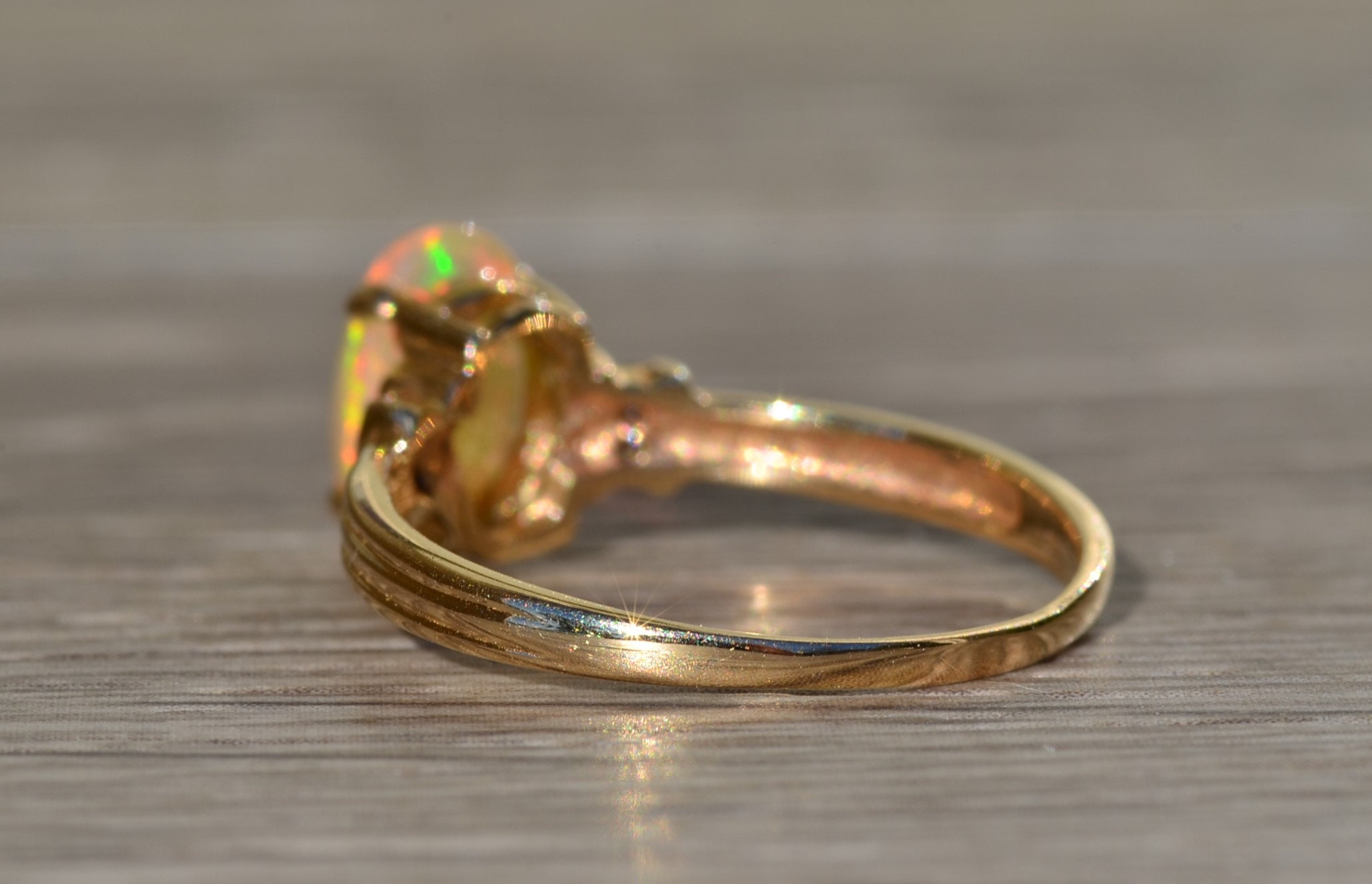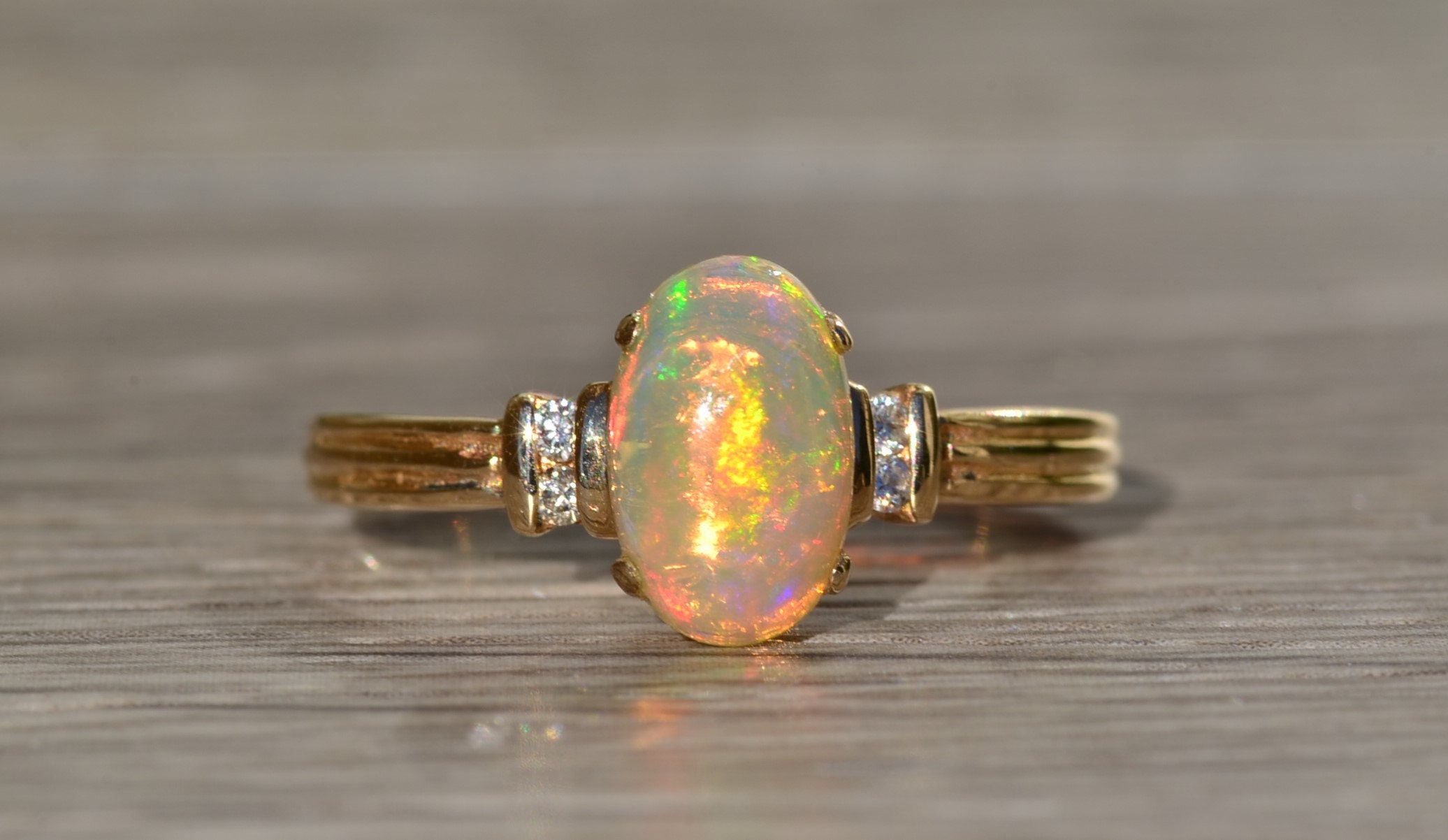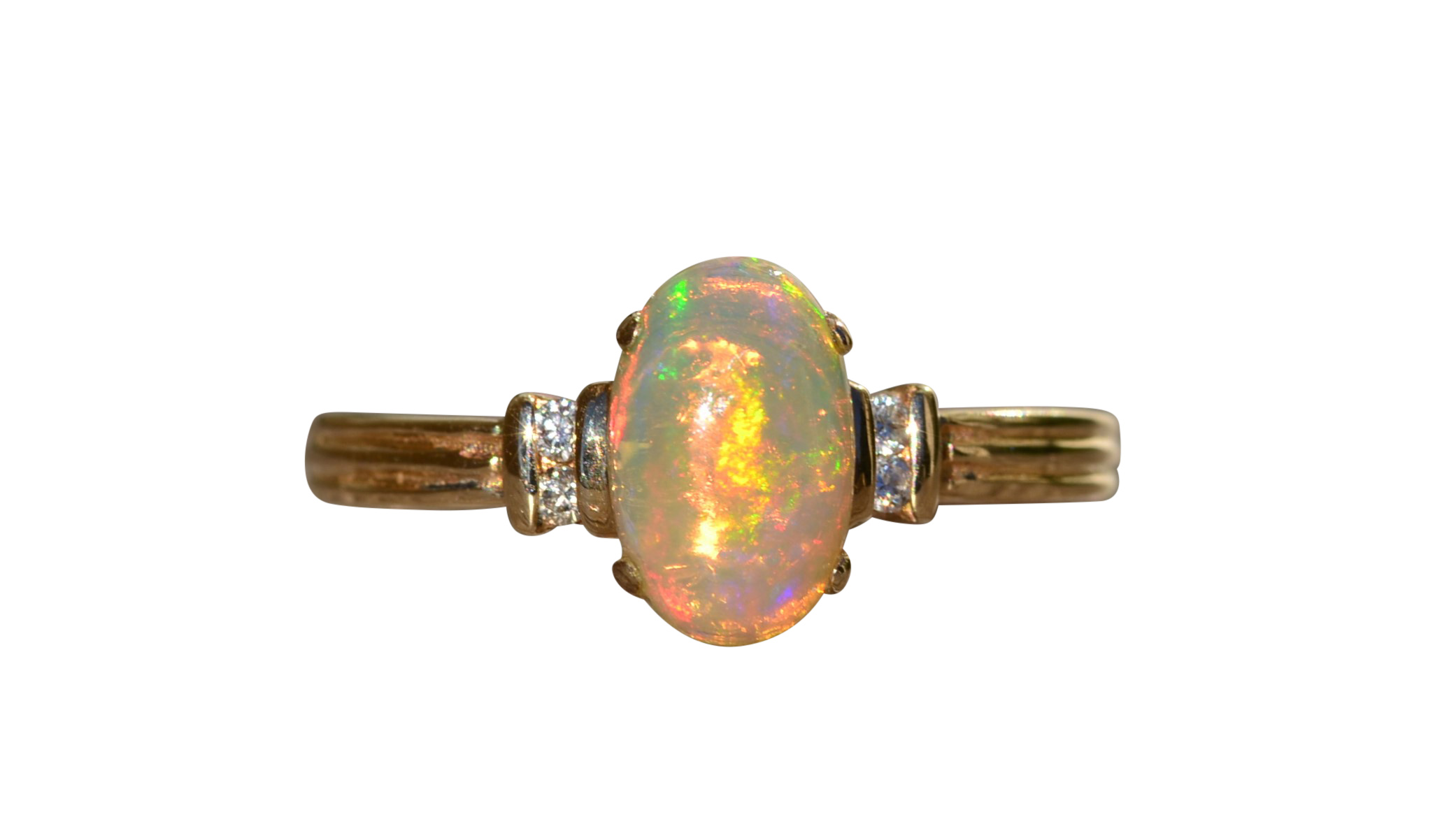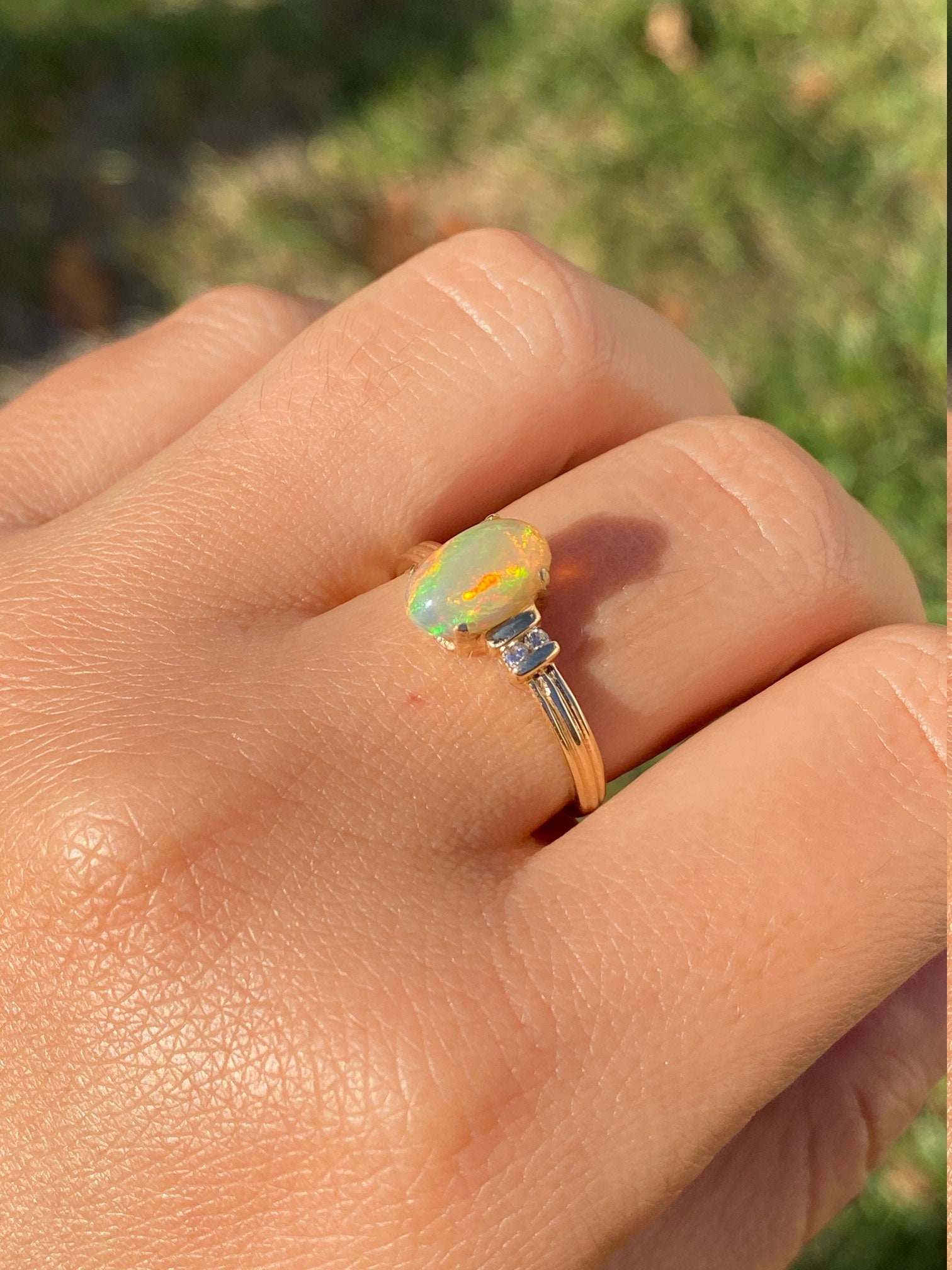Ladies Vintage 14K Gold Ring set with 1.25 CT Opal and Diamonds. Crafted in 14 karat yellow gold, this ladies cocktail ring centers on a four prong set oval cut opal. The opal has a total carat weight of 1.25 carats. Lovely accent diamonds accompany either side of the center. This ring is currently a finger size 9 and is able to be resized for an additional charge.