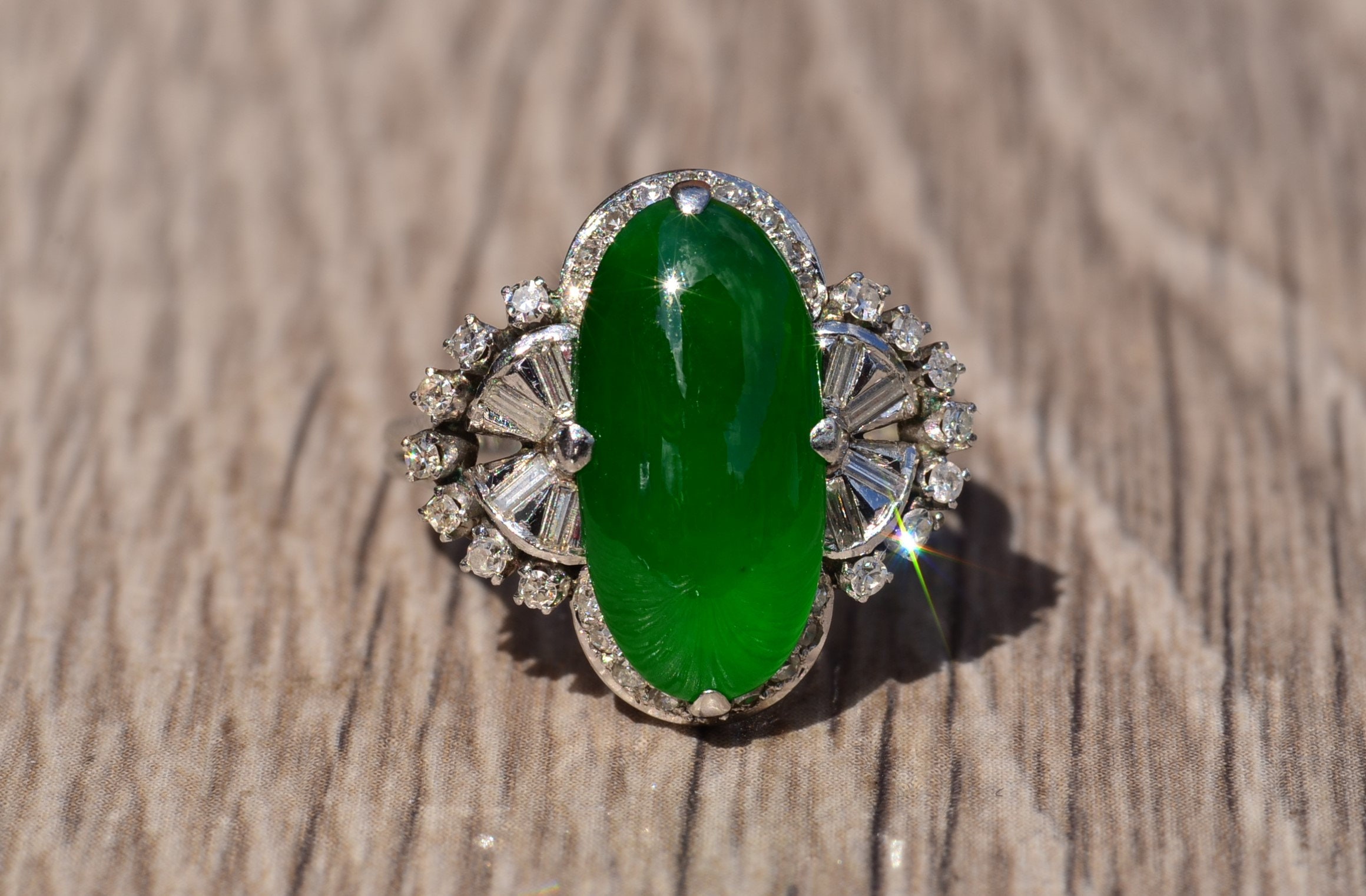 The Shanghai: Outstanding Signed Imperial A Fei Cui Jadeite Jade Ring in Platinum set with Diamonds - Jewelry Memo