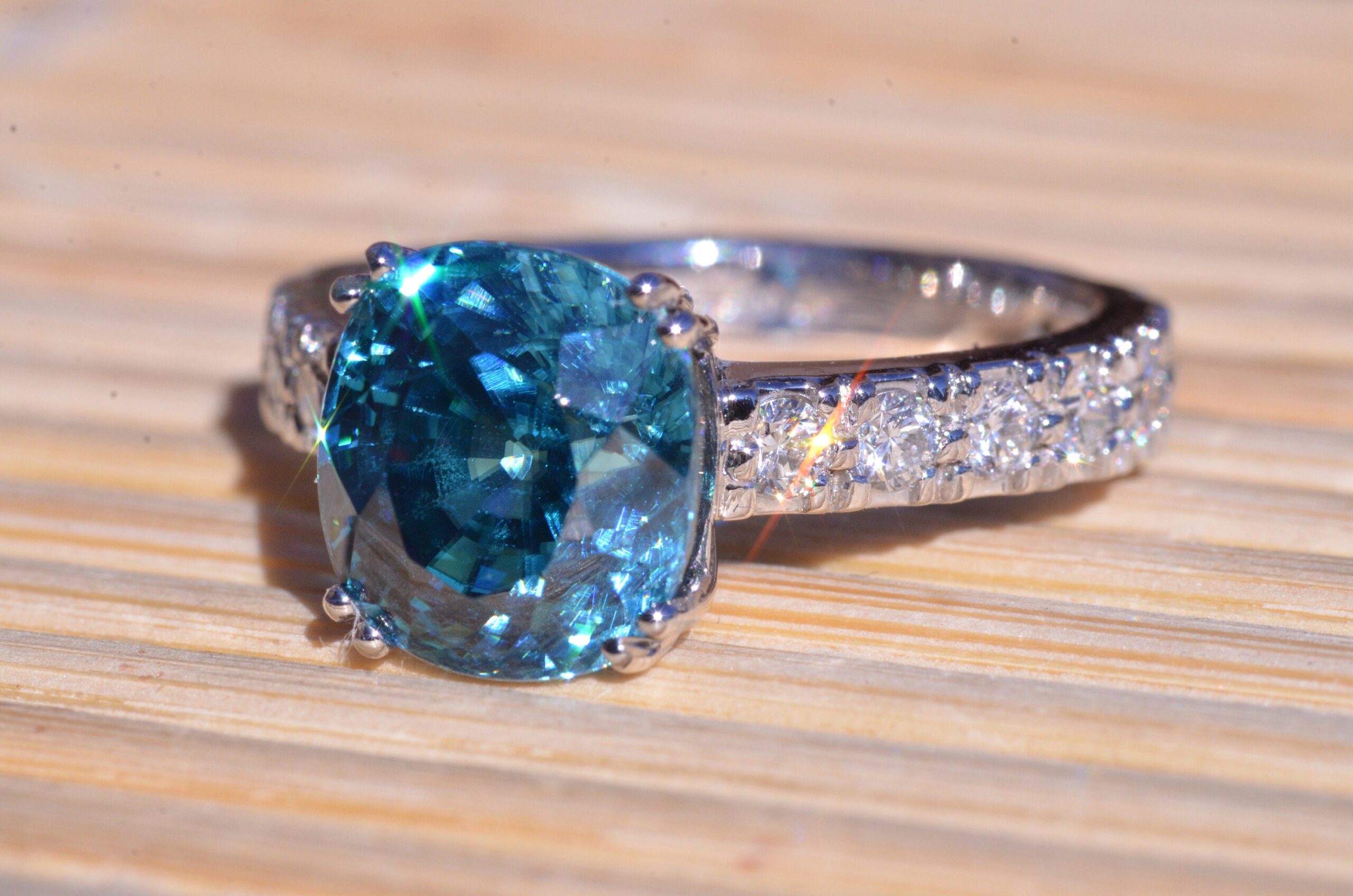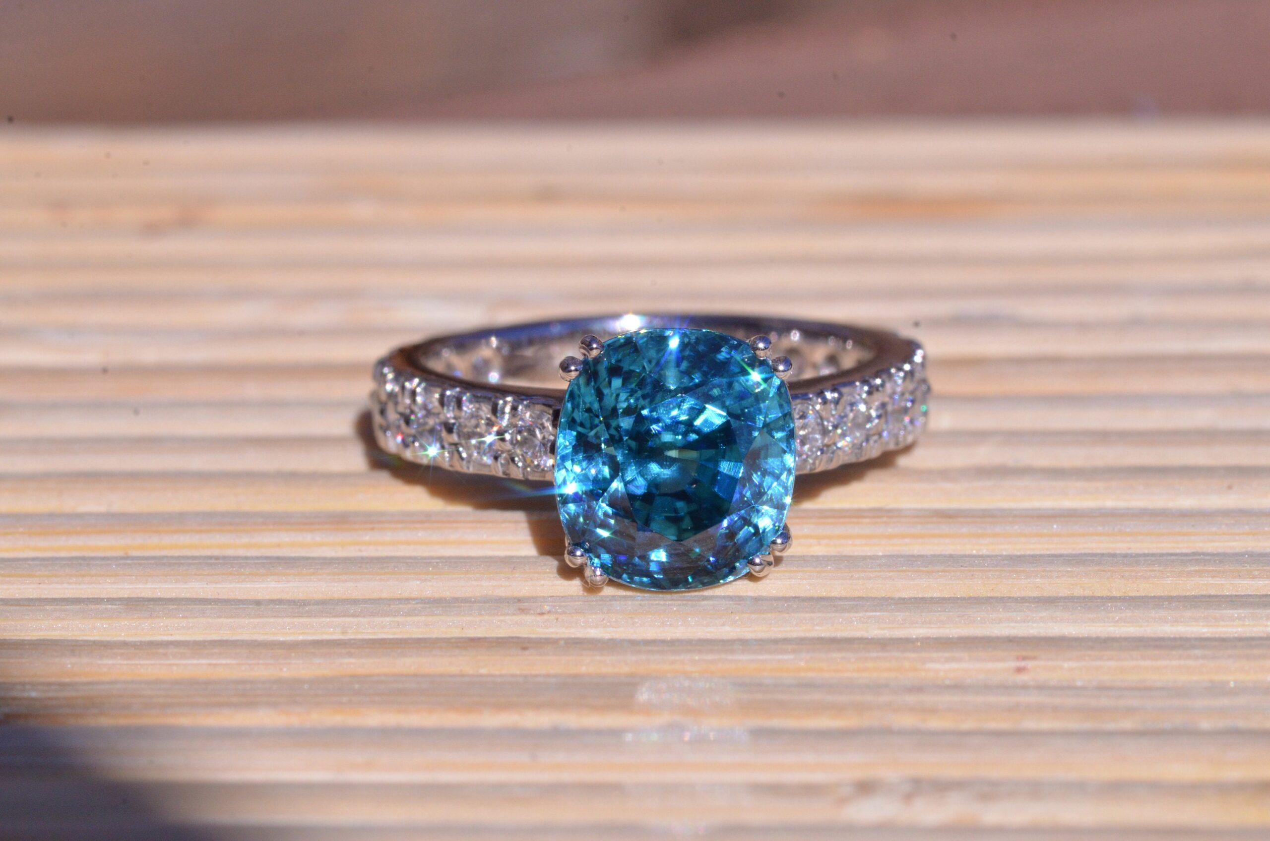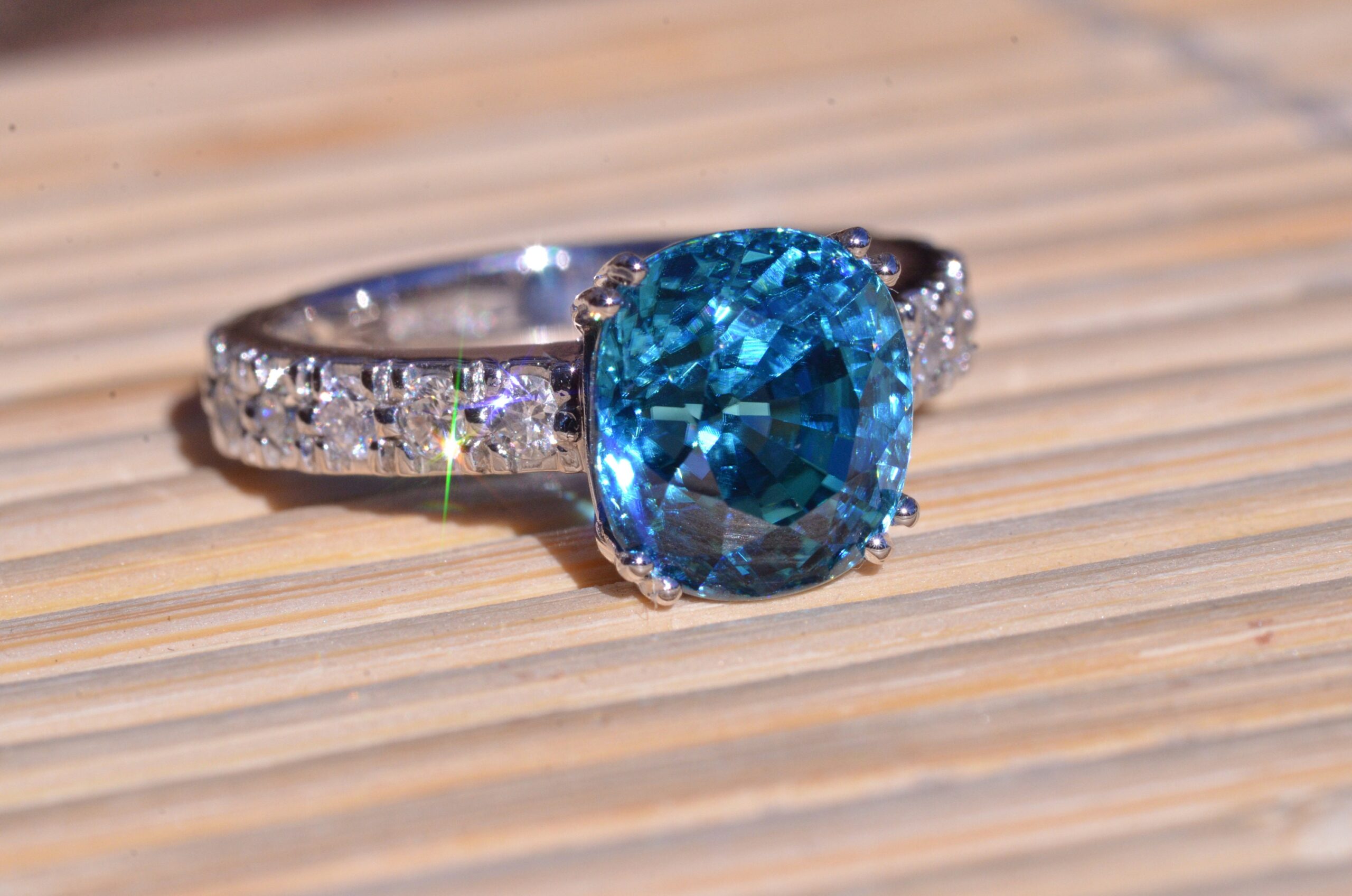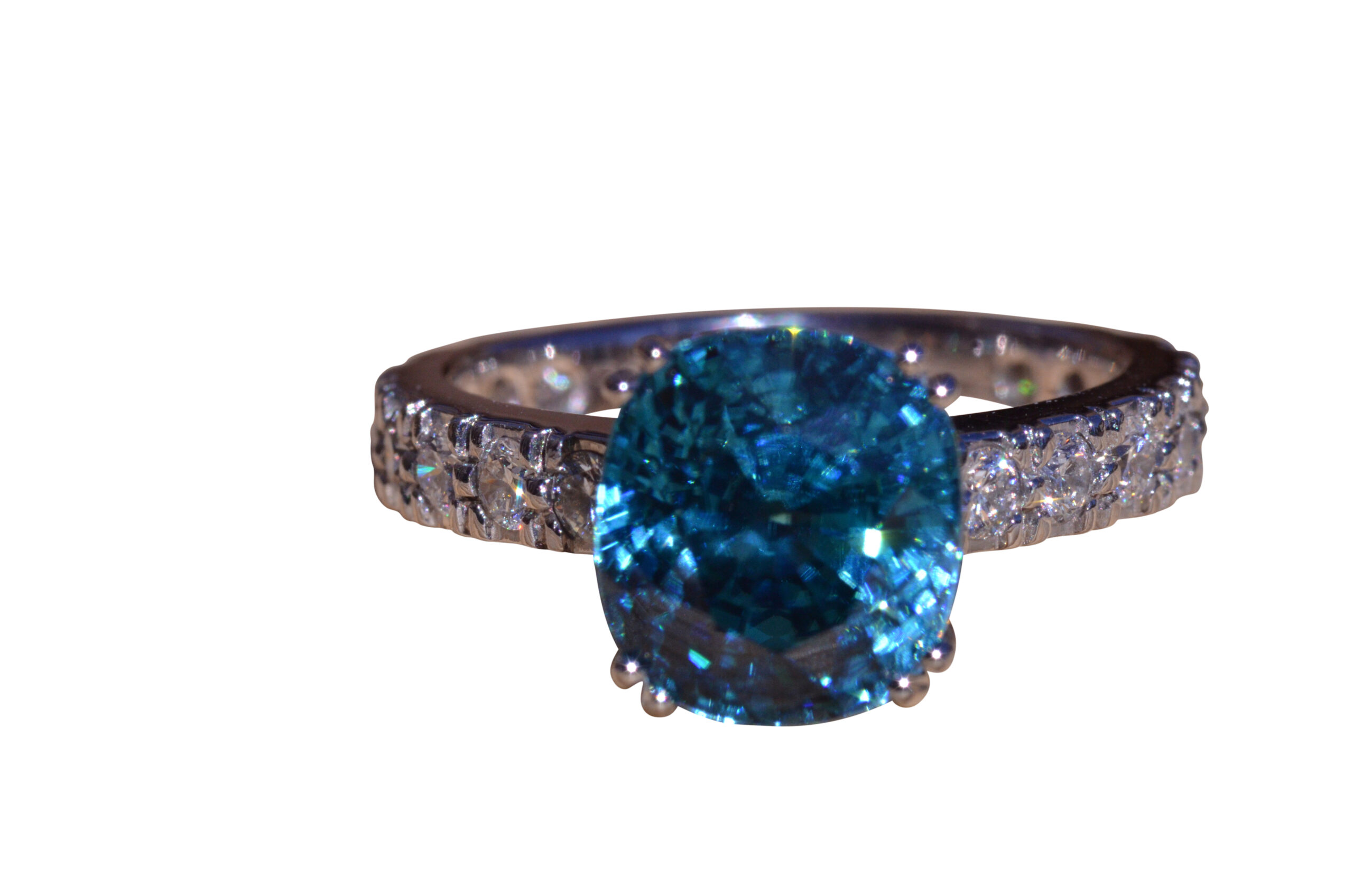 Natural Fancy Vivid Blue Zircon in Platinum set with cushion Cut Zircon with a weight of 7.29 carats. On either side of the center zircon are eight french set diamonds in platinum with a weight of 0.04 carats each or 0.64 carats in the mounting. The center stone is a natural blue zircon with exceptional color and not a man made stone. This stone was mined out of the ground this color! The ring is currently a finger size 6 3/4, but can be sized to fit any finger.