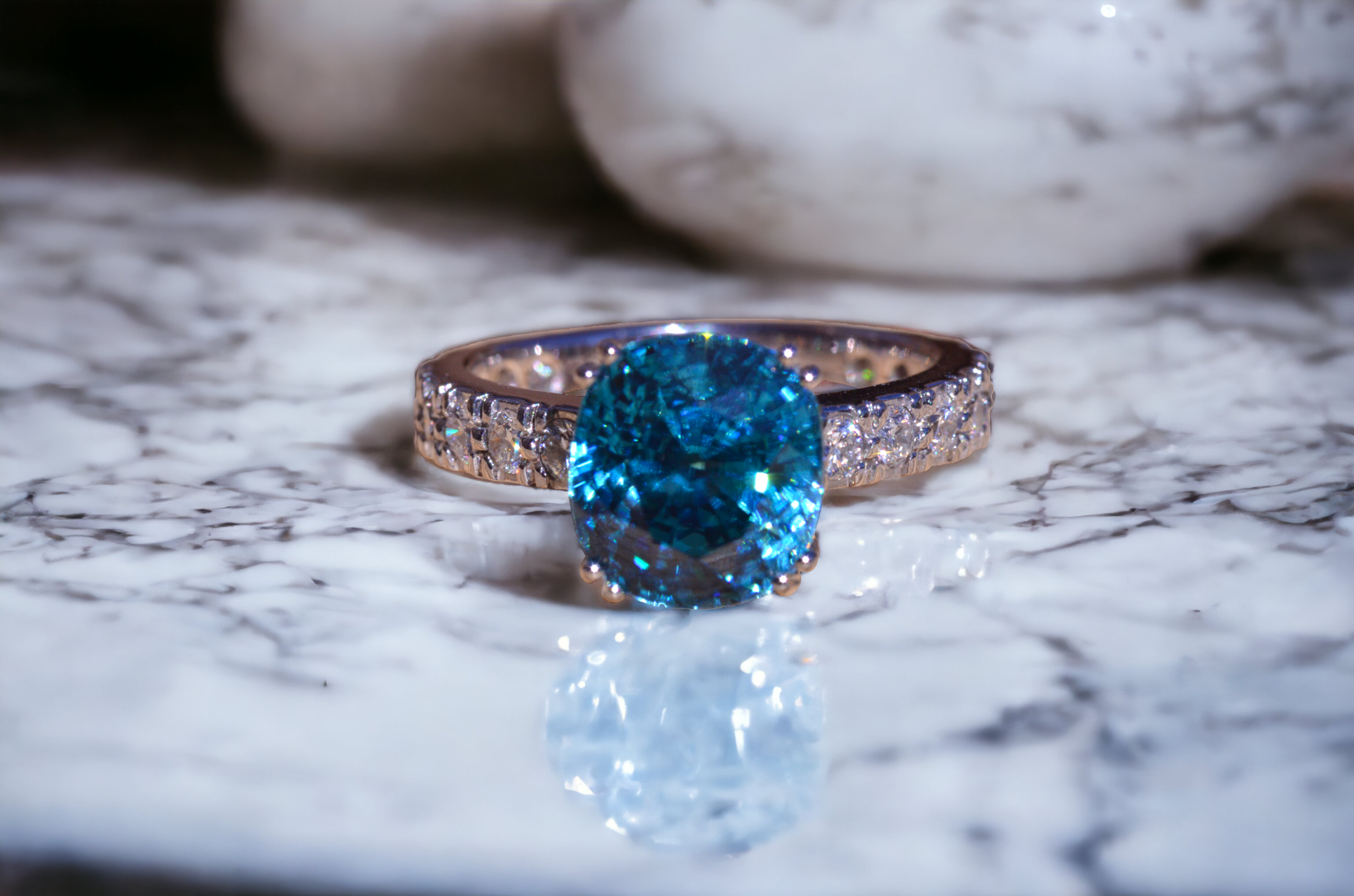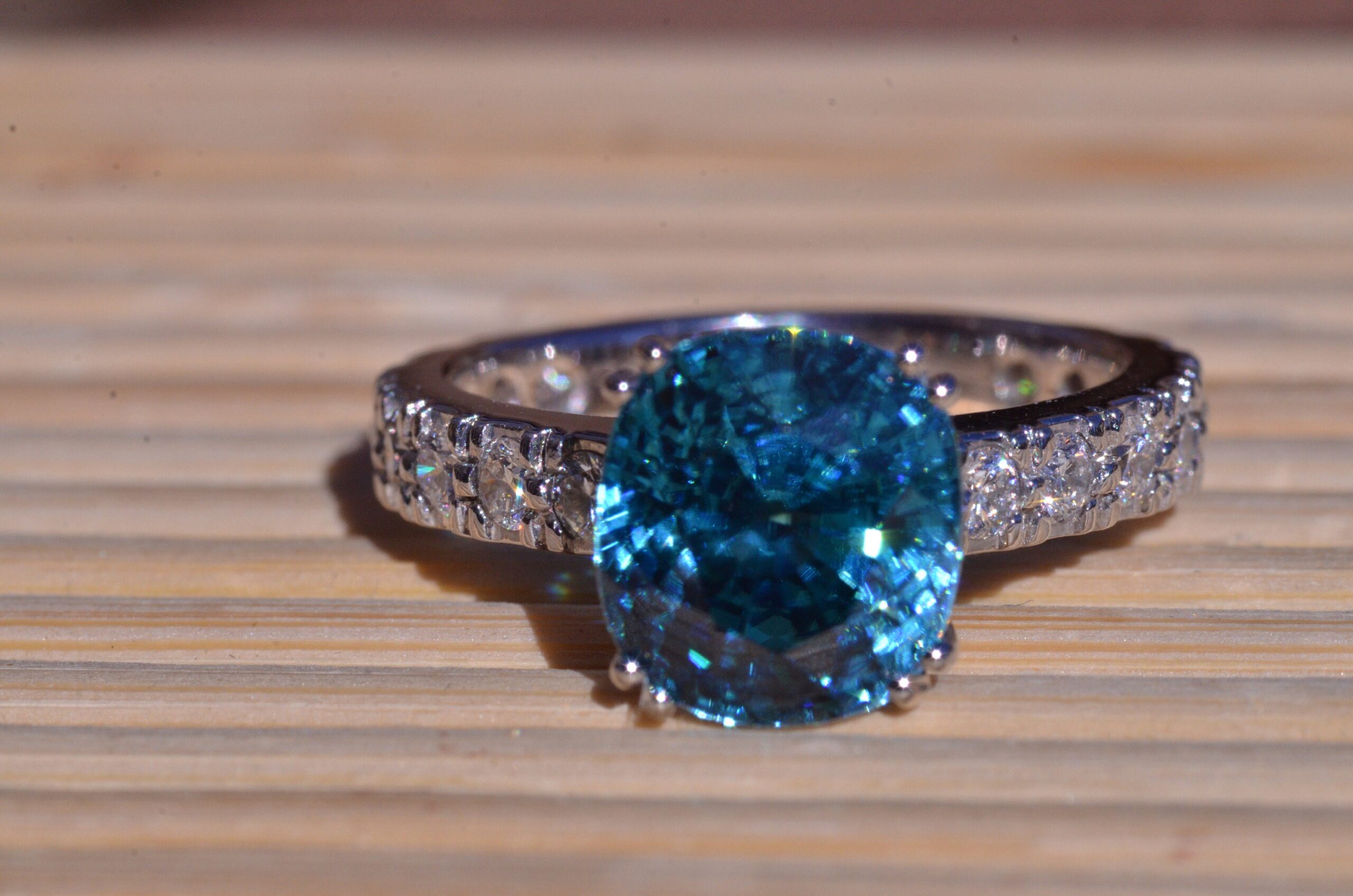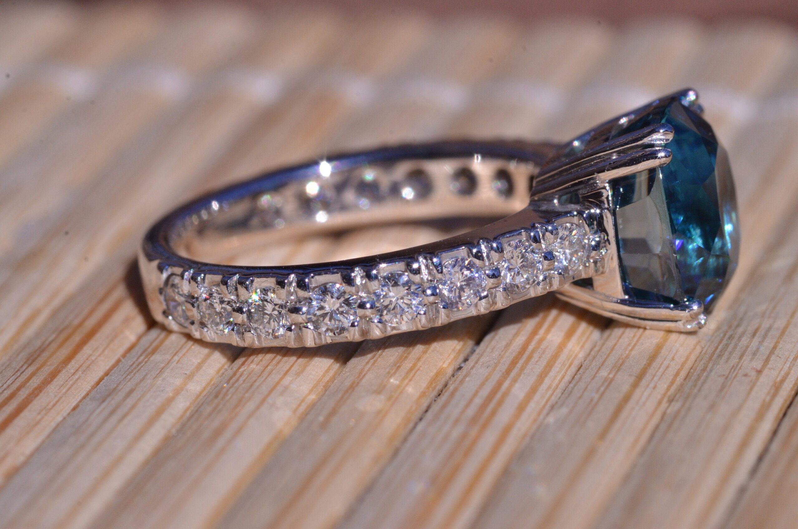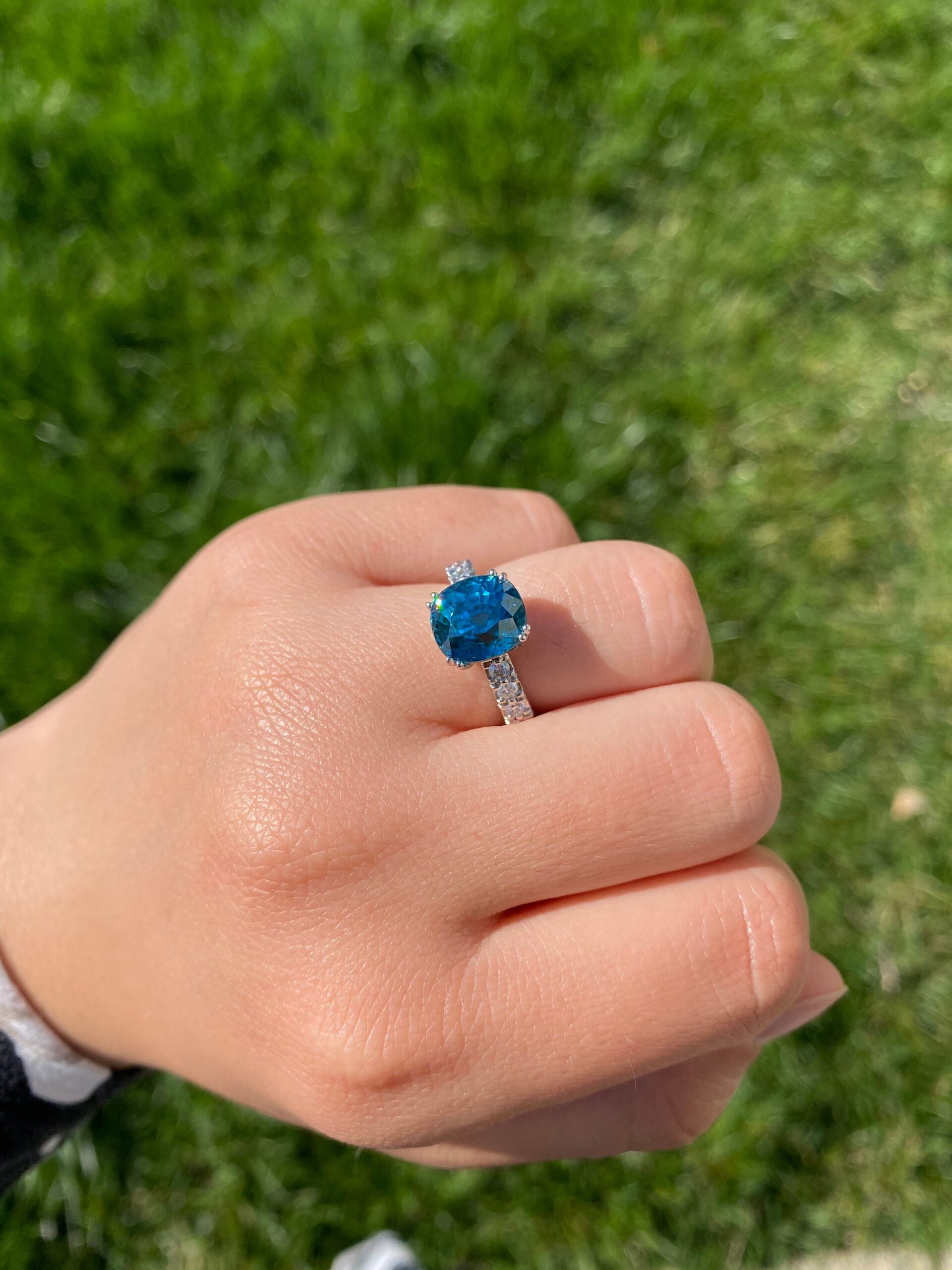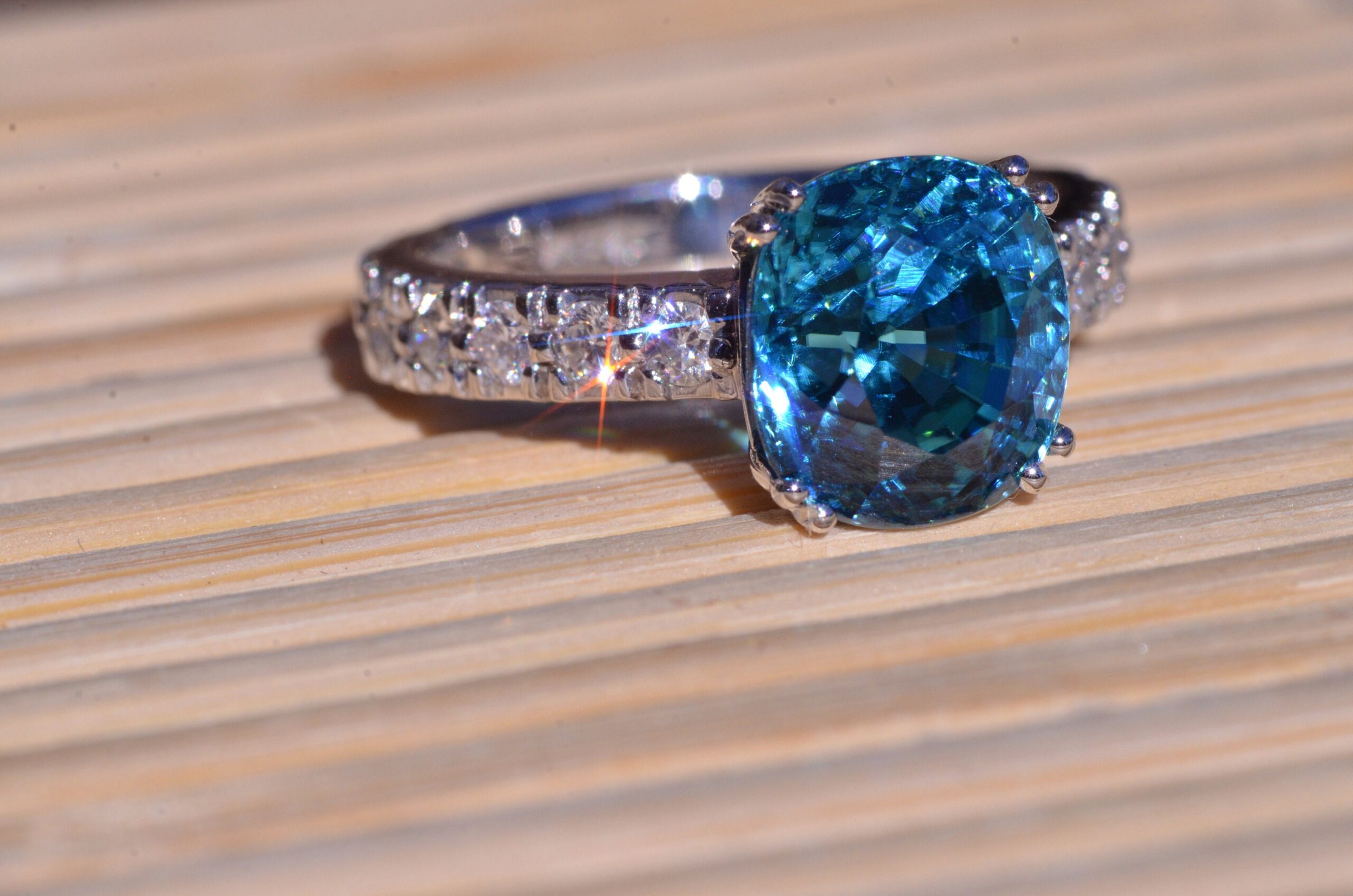 Natural Fancy Vivid Blue Zircon in Platinum set with cushion Cut Zircon with a weight of 7.29 carats. On either side of the center zircon are eight french set diamonds in platinum with a weight of 0.04 carats each or 0.64 carats in the mounting. The center stone is a natural blue zircon with exceptional color and not a man made stone. This stone was mined out of the ground this color! The ring is currently a finger size 6 3/4, but can be sized to fit any finger.