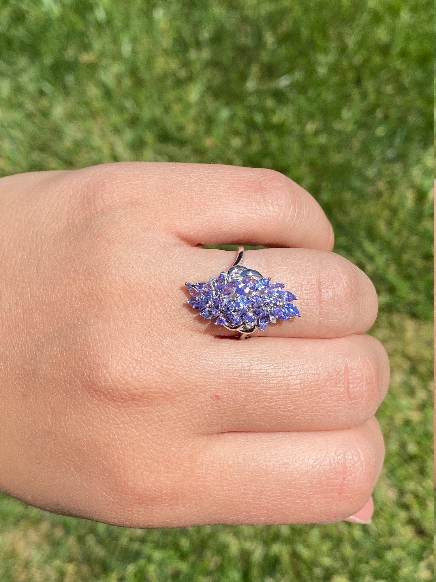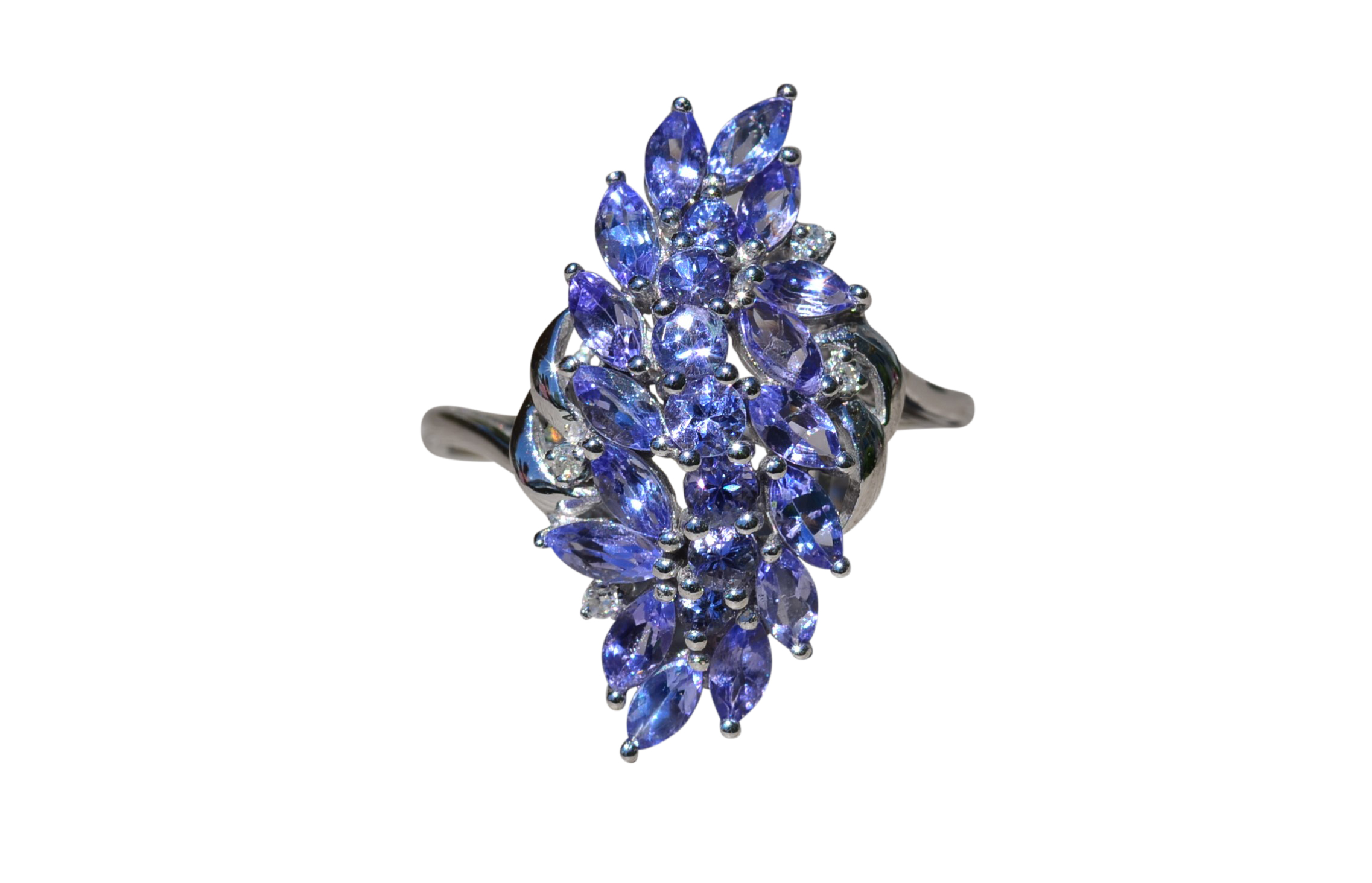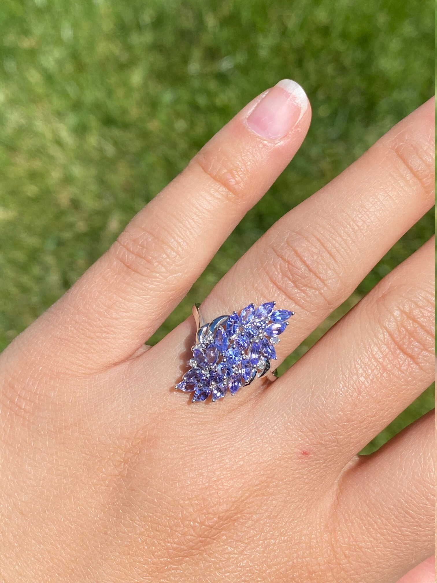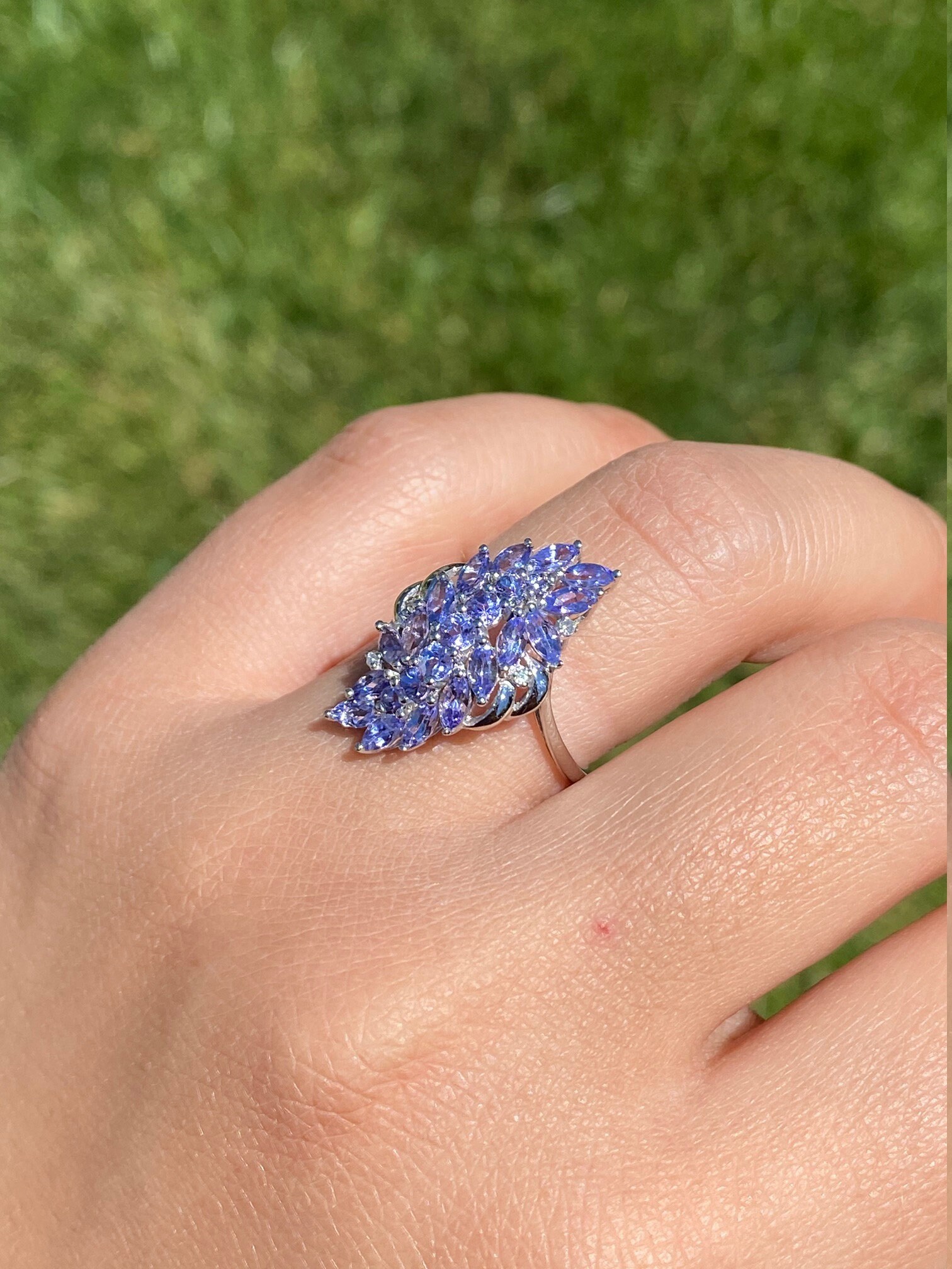 Ladies Contemporary Cocktail Ring set with Tanzanite and Diamonds. Crafted in white gold, this modern cluster ring features 1.50 carats of tanzanite set throughout. Several accent diamonds can be found throughout the ring. Currently a finger size 7.25, this ring can be resized for an additional charge.