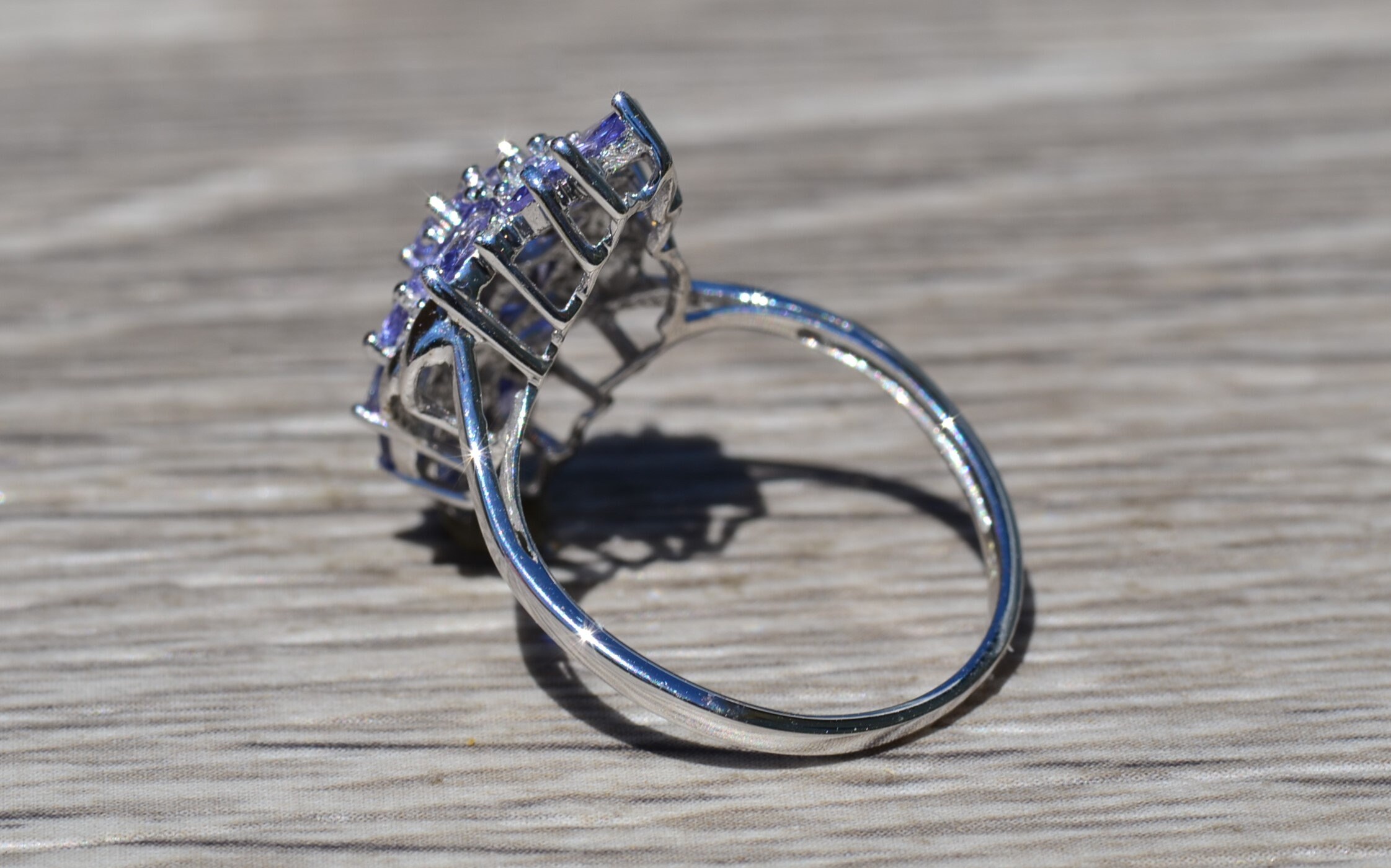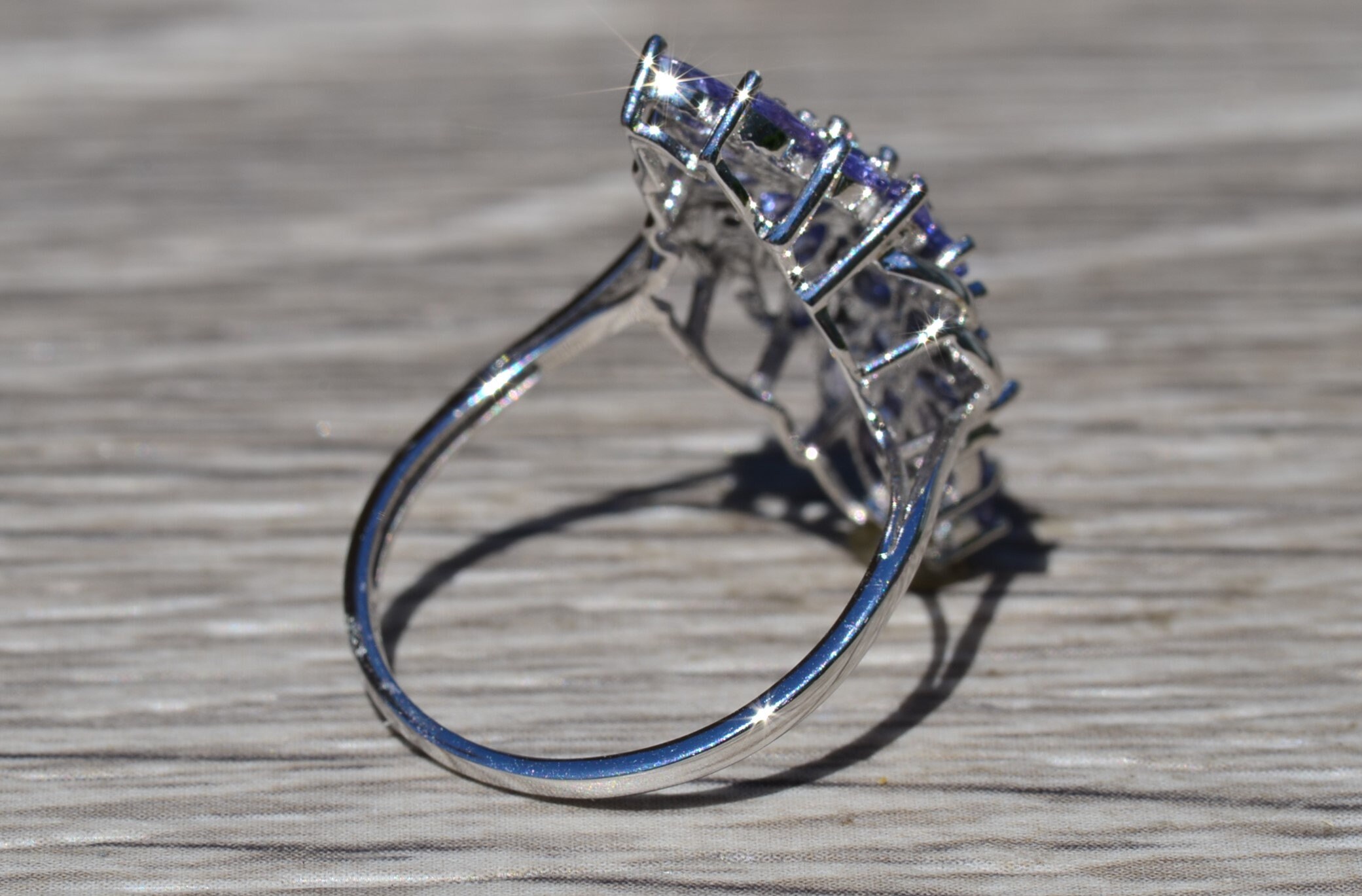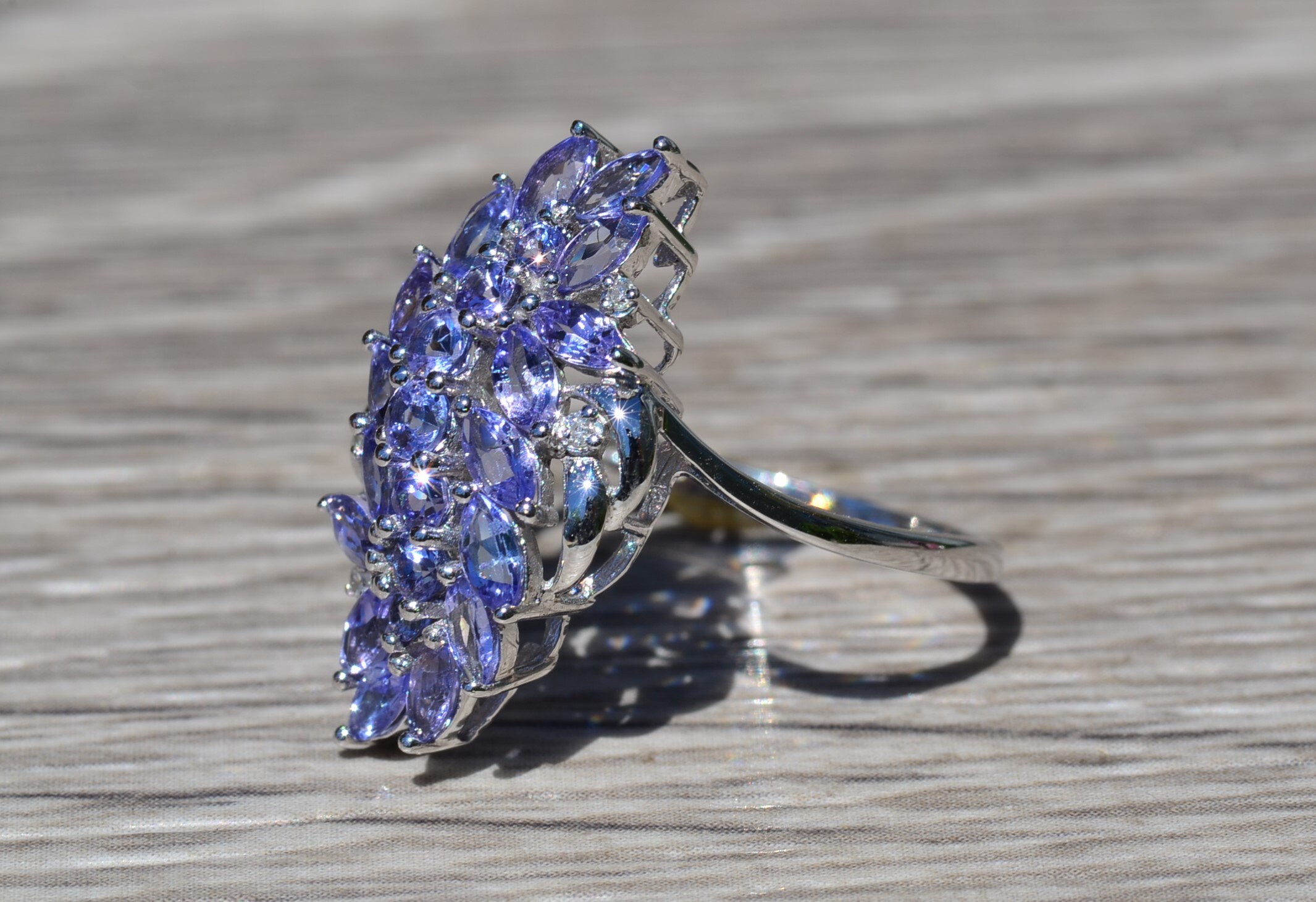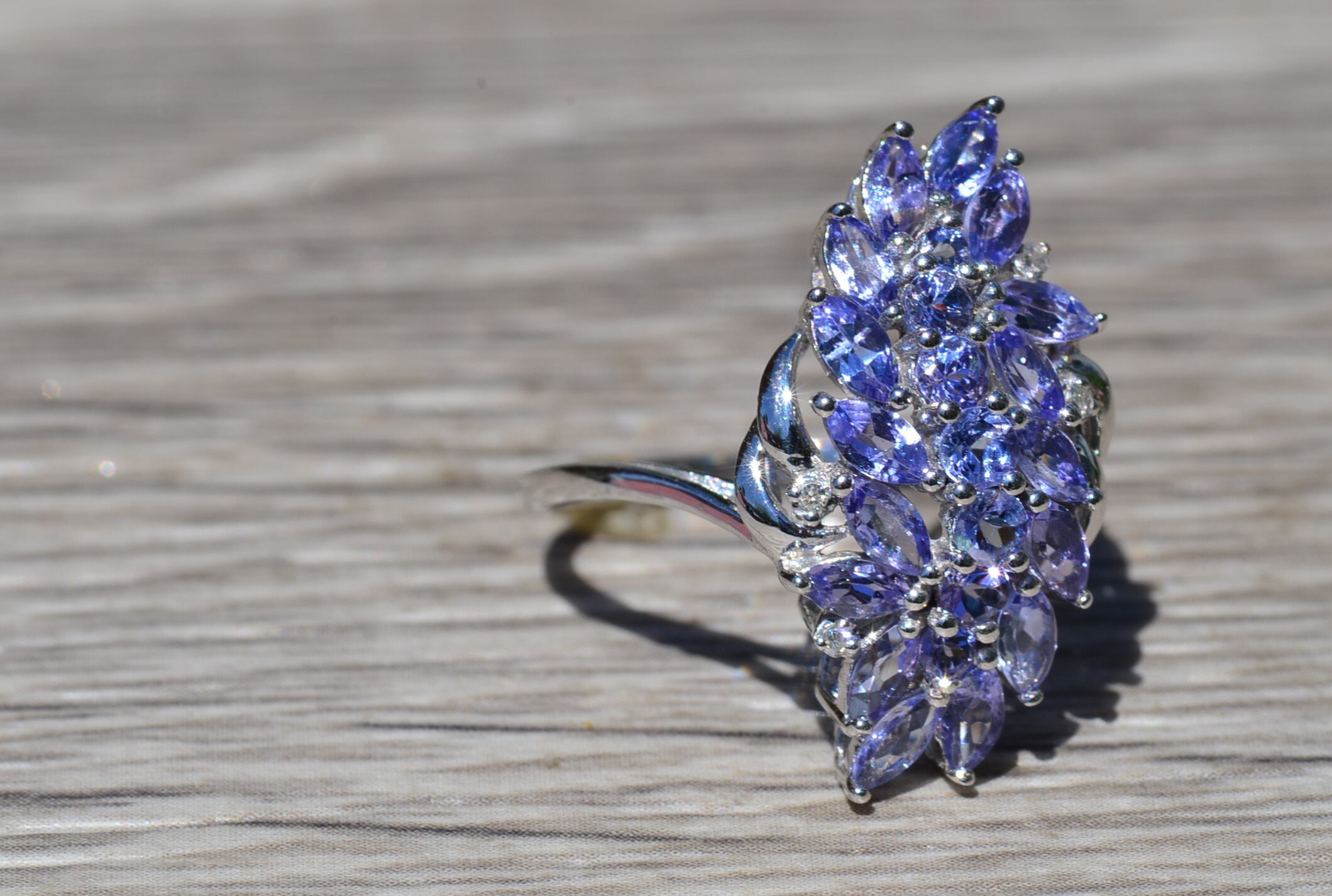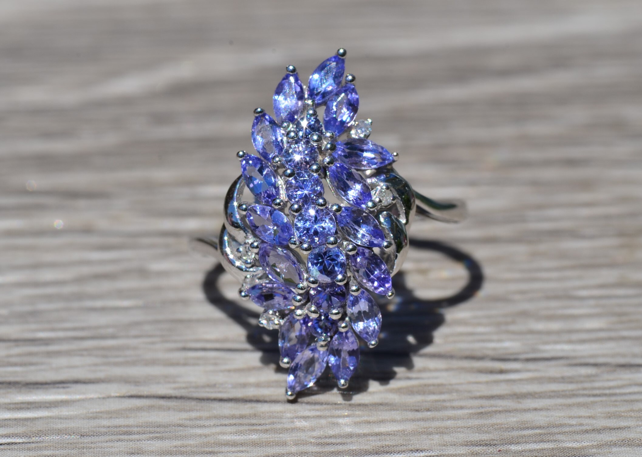 Ladies Contemporary Cocktail Ring set with Tanzanite and Diamonds. Crafted in white gold, this modern cluster ring features 1.50 carats of tanzanite set throughout. Several accent diamonds can be found throughout the ring. Currently a finger size 7.25, this ring can be resized for an additional charge.