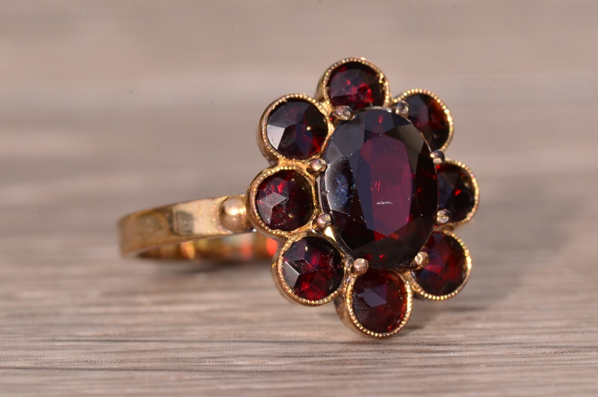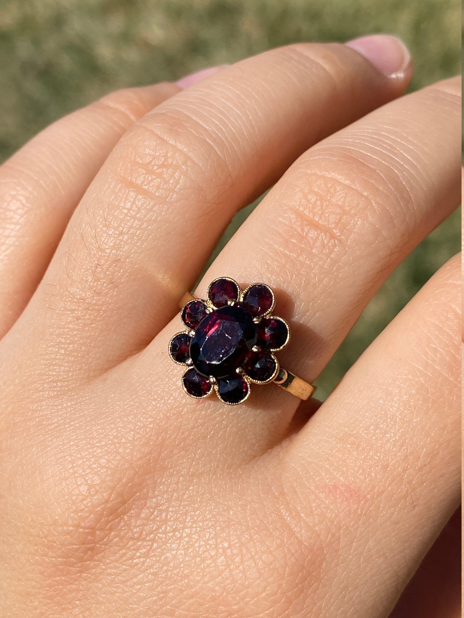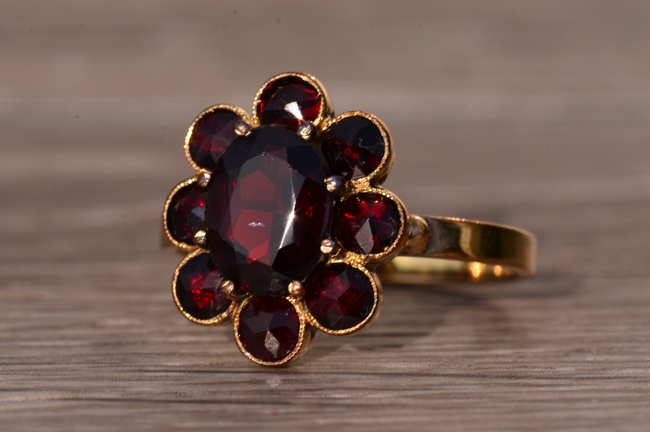 The St Augustine: Bohemian Rose Cut Garnet Ring in Yellow Gold. The ring centers on a oval brilliant cut natural garnet center stone with halo of rose cut garnets surrounding the center. The ring is low set and comfortable to wear. The ring is crafted in yellow gold and is currently a finger size 8 1/2 yet can be adjusted to any finger size for an additional charge.