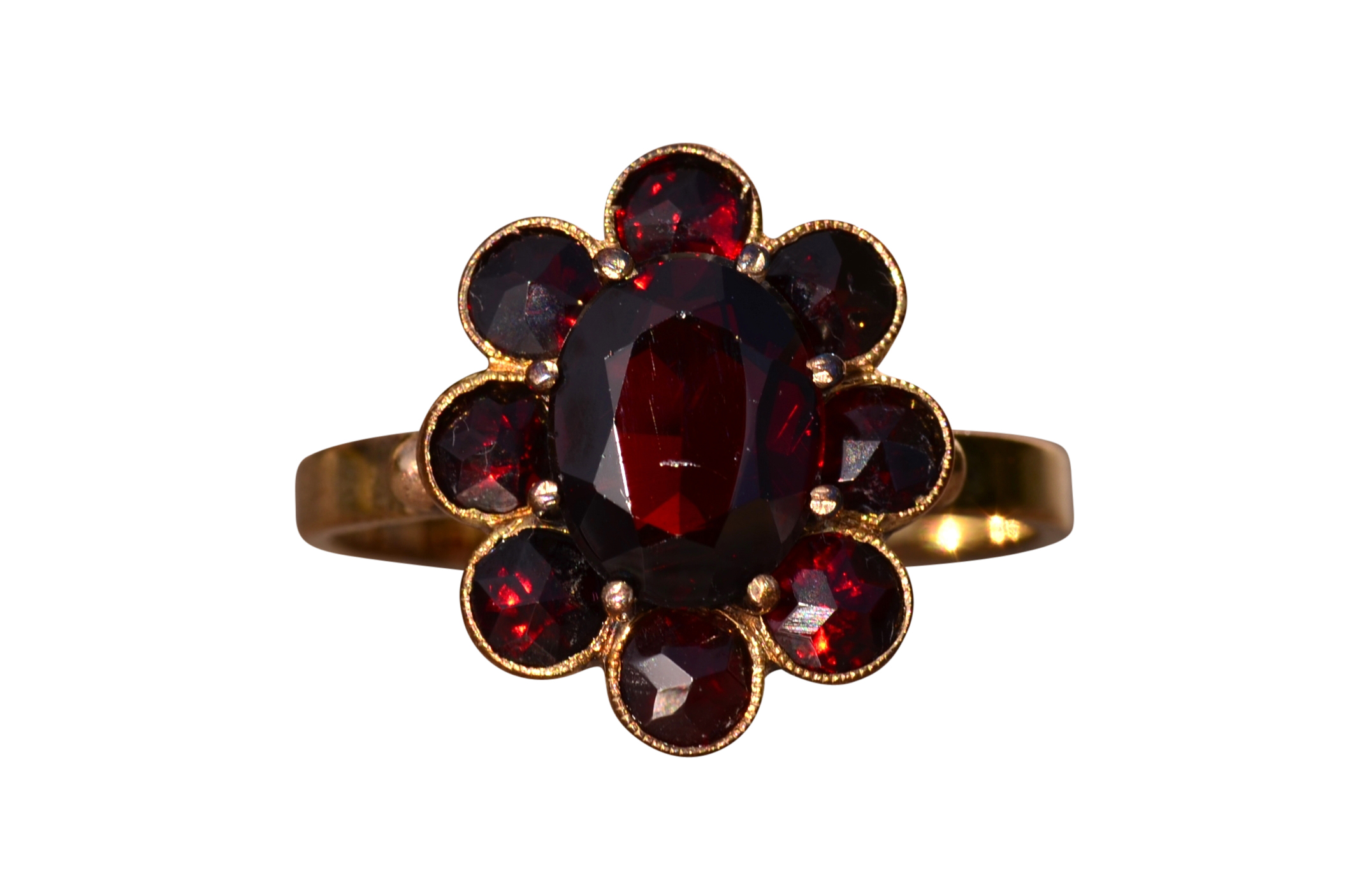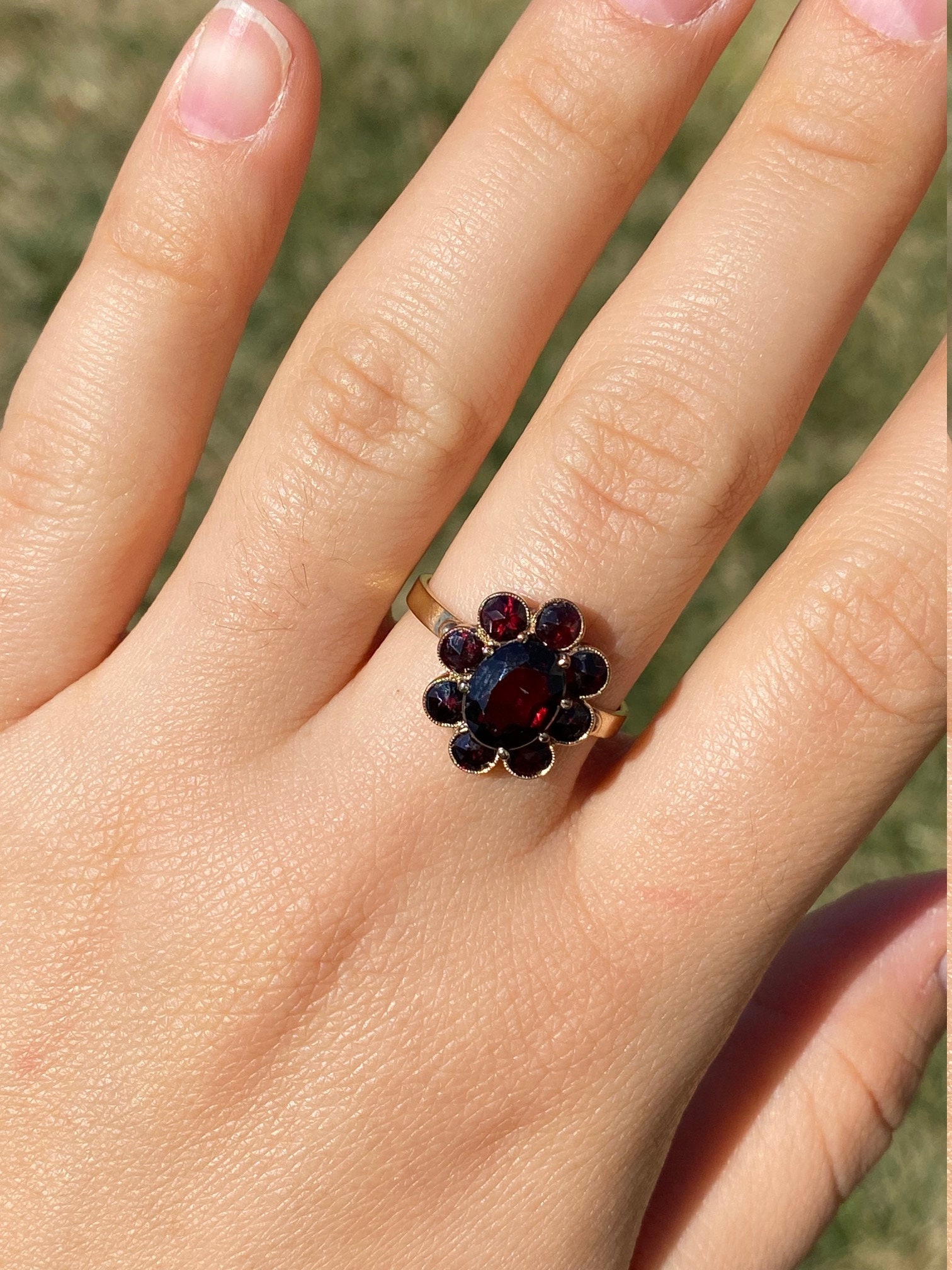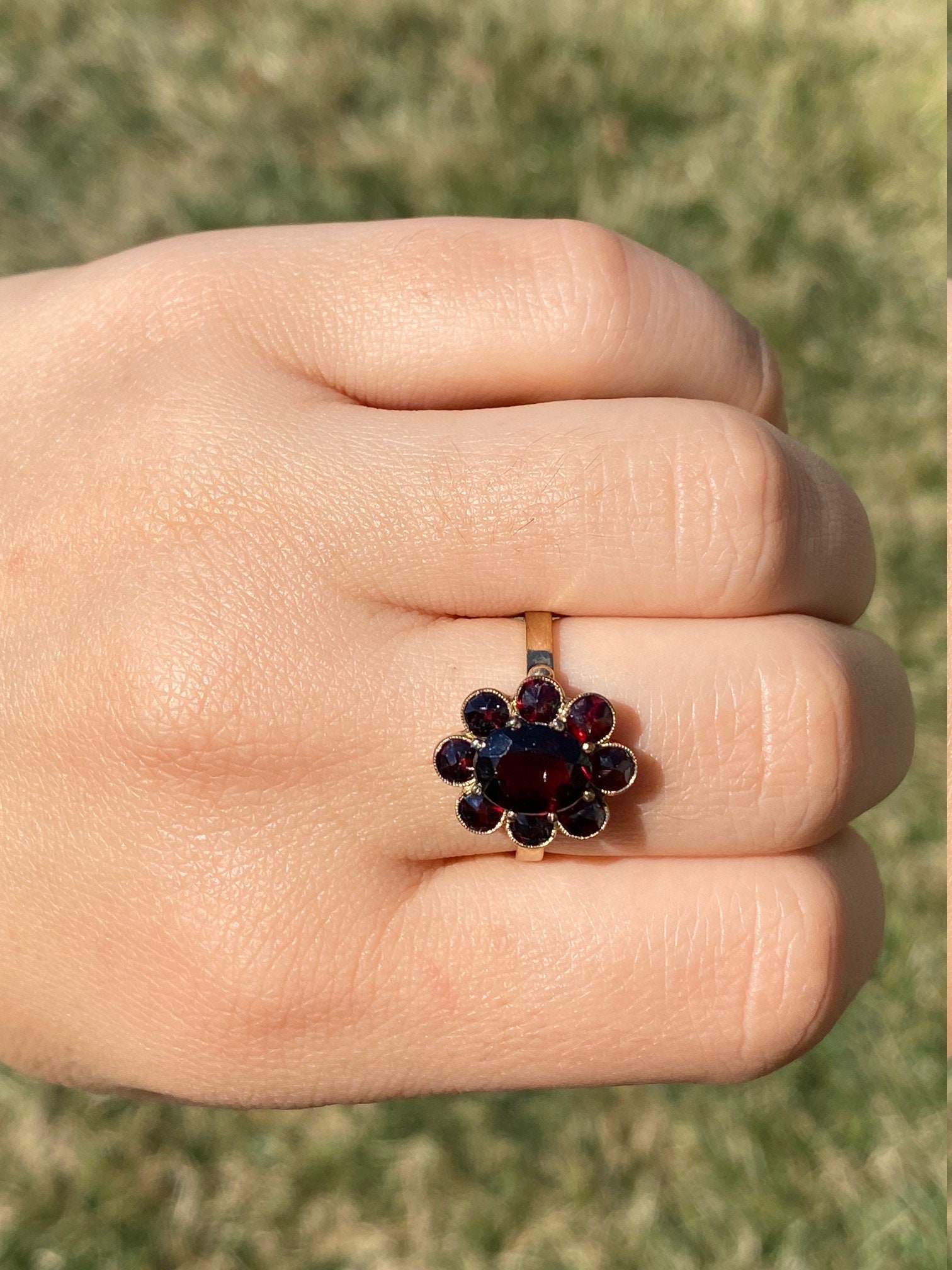 The St Augustine: Bohemian Rose Cut Garnet Ring in Yellow Gold. The ring centers on a oval brilliant cut natural garnet center stone with halo of rose cut garnets surrounding the center. The ring is low set and comfortable to wear. The ring is crafted in yellow gold and is currently a finger size 8 1/2 yet can be adjusted to any finger size for an additional charge.