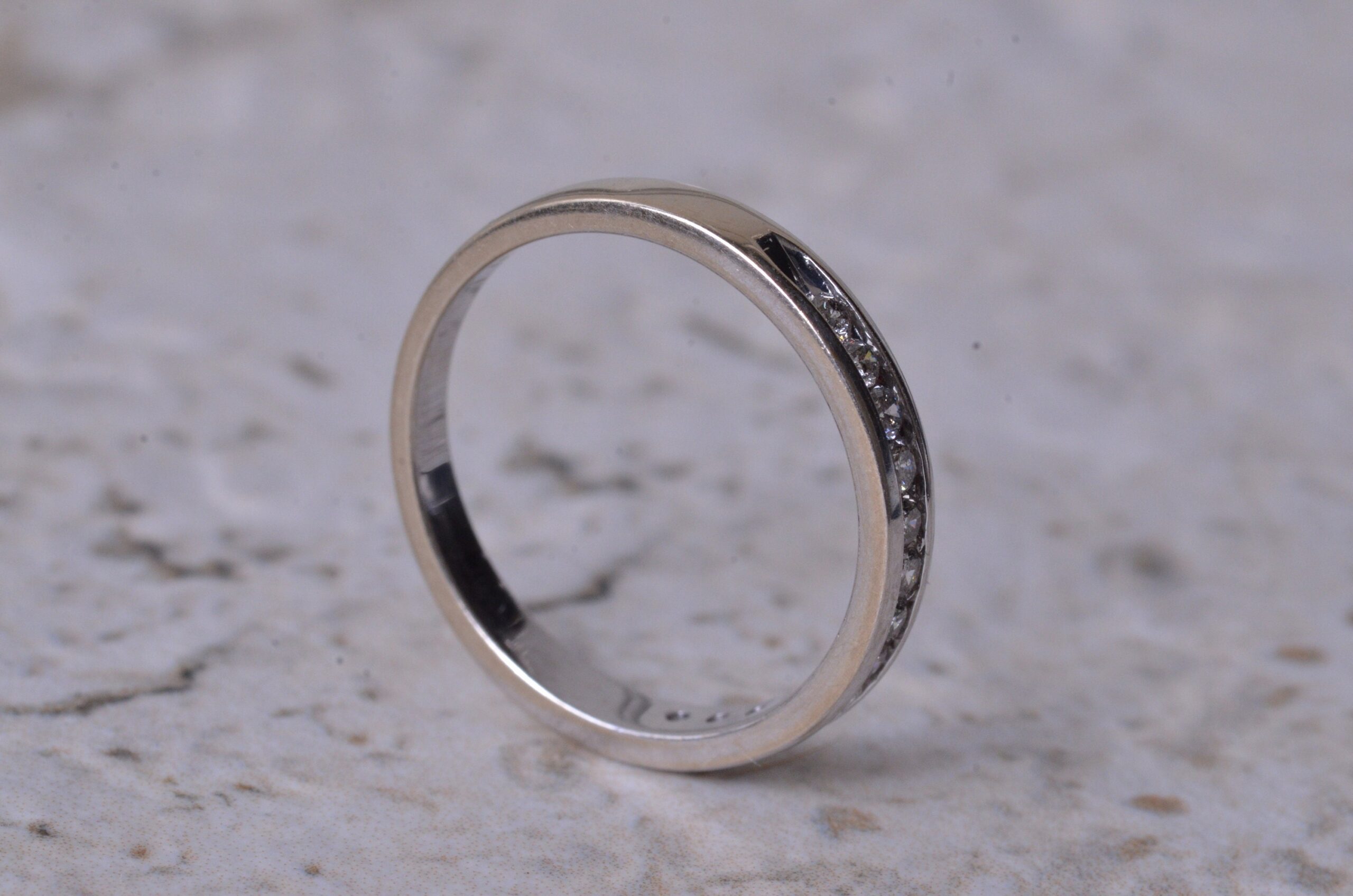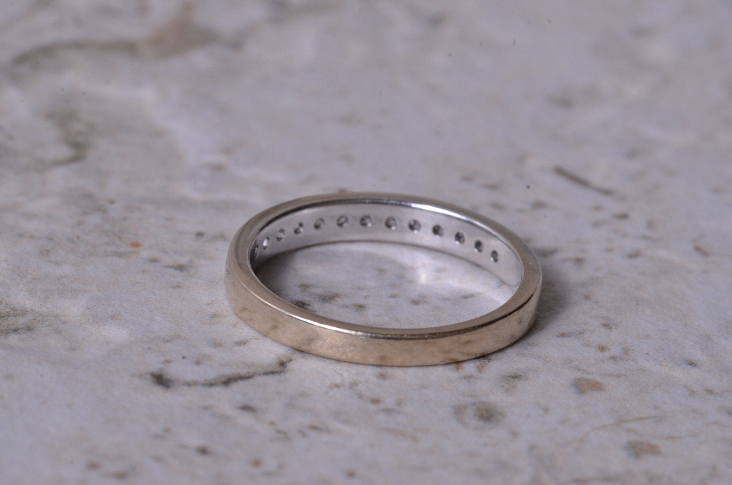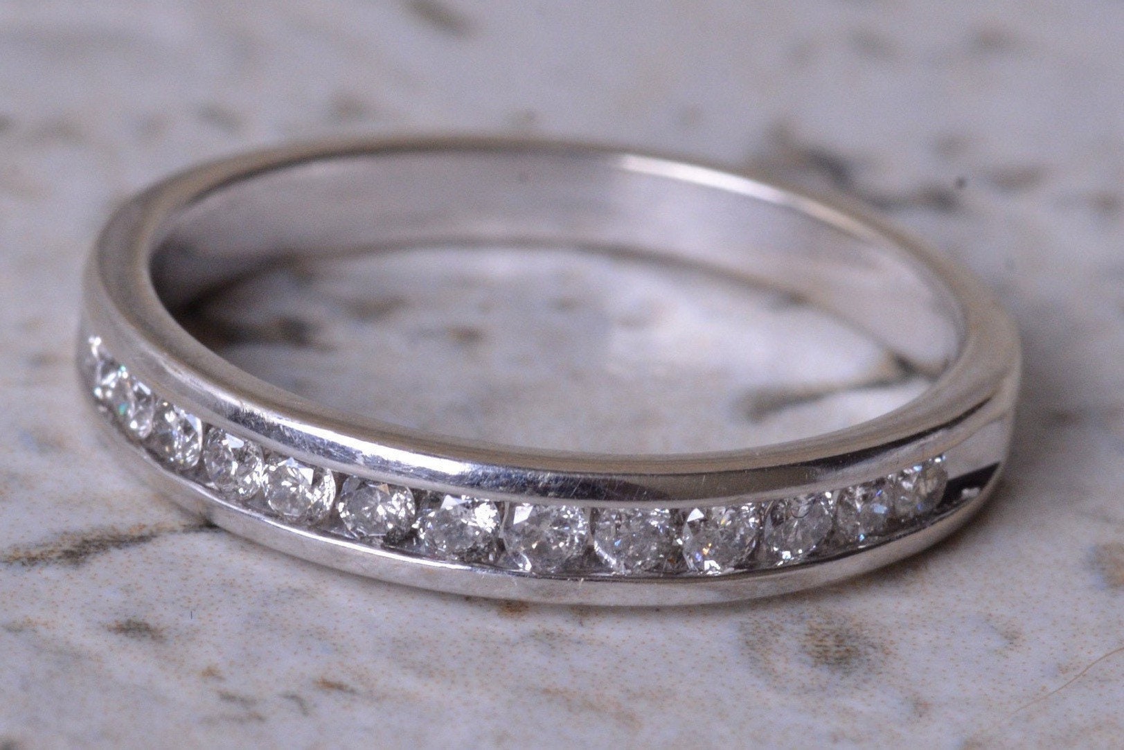Vintage 14 Karat white gold channel set diamond band. The perfect band to accompany your engagement ring or to wear on its own. Stack it with others! This band is set with 0.20 carats of diamonds in a low set channel for very comfortable wear. The ring is solid backed with just holes for the diamonds for comfort. It is a great stackable band and very wearable for everyday wear as it is built to last. Wear it to the gym or rock climbing as its not hollow like others. The ring is size 7 1/4 but can be adjusted to any finger size! Currently the ring is not rhodiumed however we would be happy to rhodium it before shipping at no additional charge per request!
