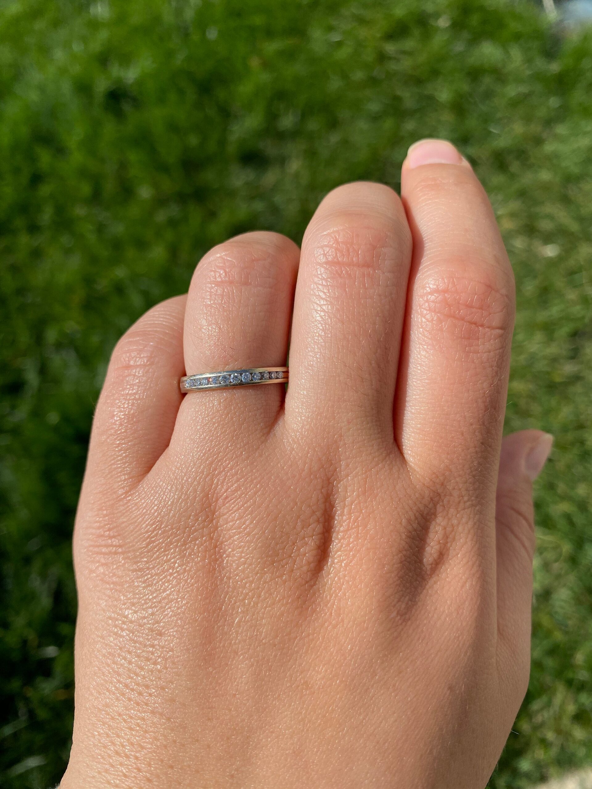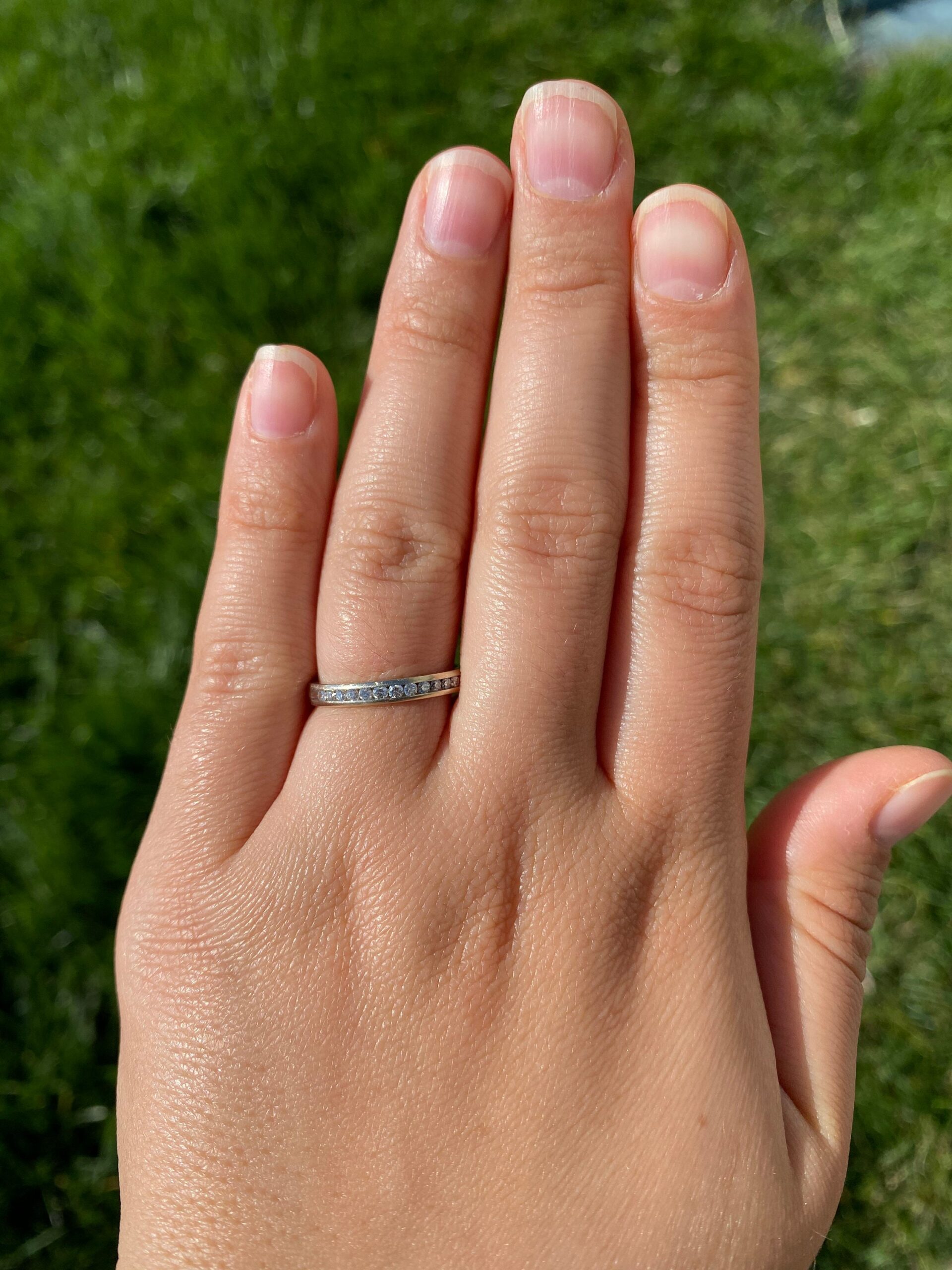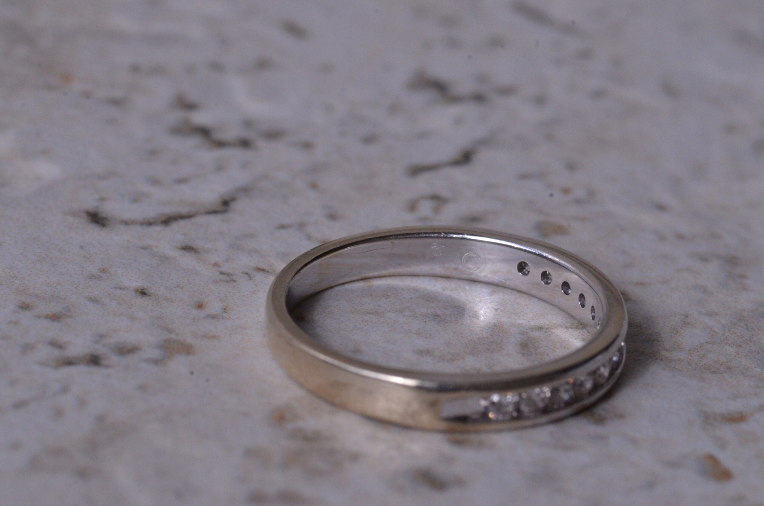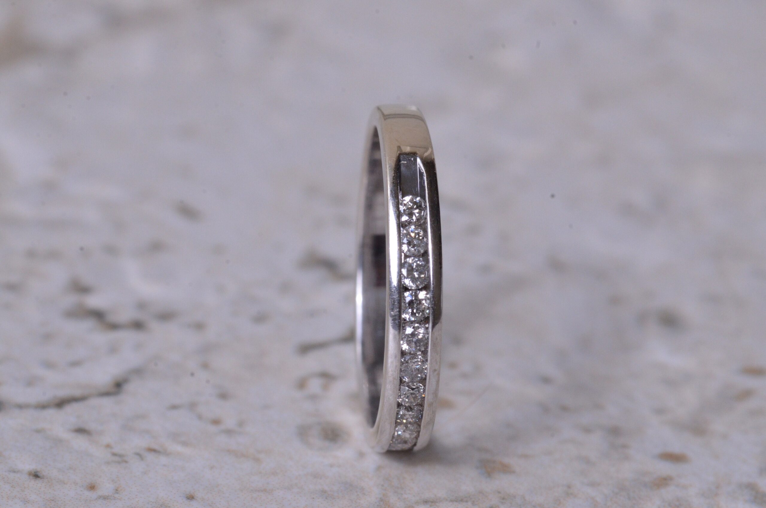 Vintage 14 Karat white gold channel set diamond band. The perfect band to accompany your engagement ring or to wear on its own. Stack it with others! This band is set with 0.20 carats of diamonds in a low set channel for very comfortable wear. The ring is solid backed with just holes for the diamonds for comfort. It is a great stackable band and very wearable for everyday wear as it is built to last. Wear it to the gym or rock climbing as its not hollow like others. The ring is size 7 1/4 but can be adjusted to any finger size! Currently the ring is not rhodiumed however we would be happy to rhodium it before shipping at no additional charge per request!