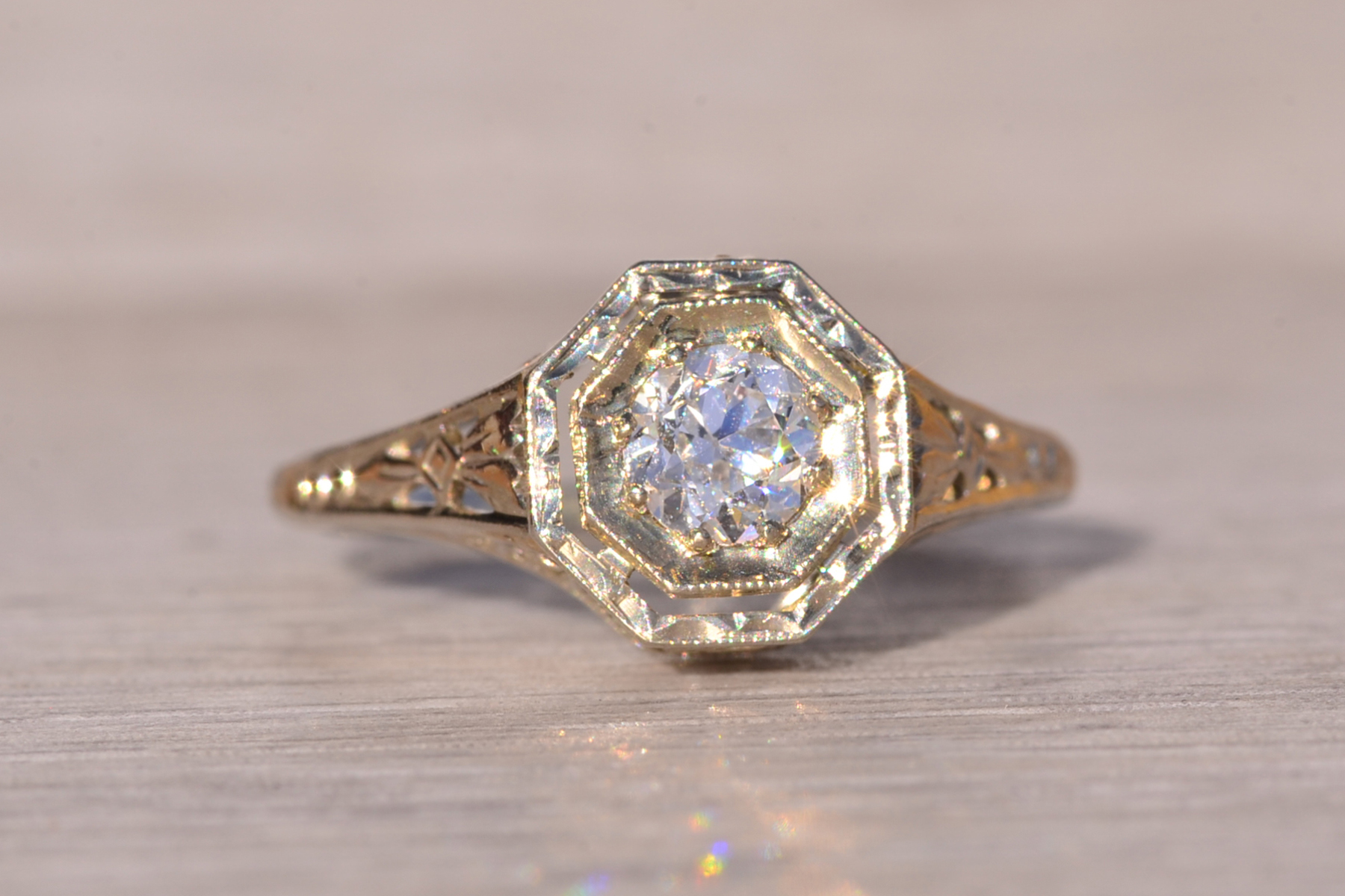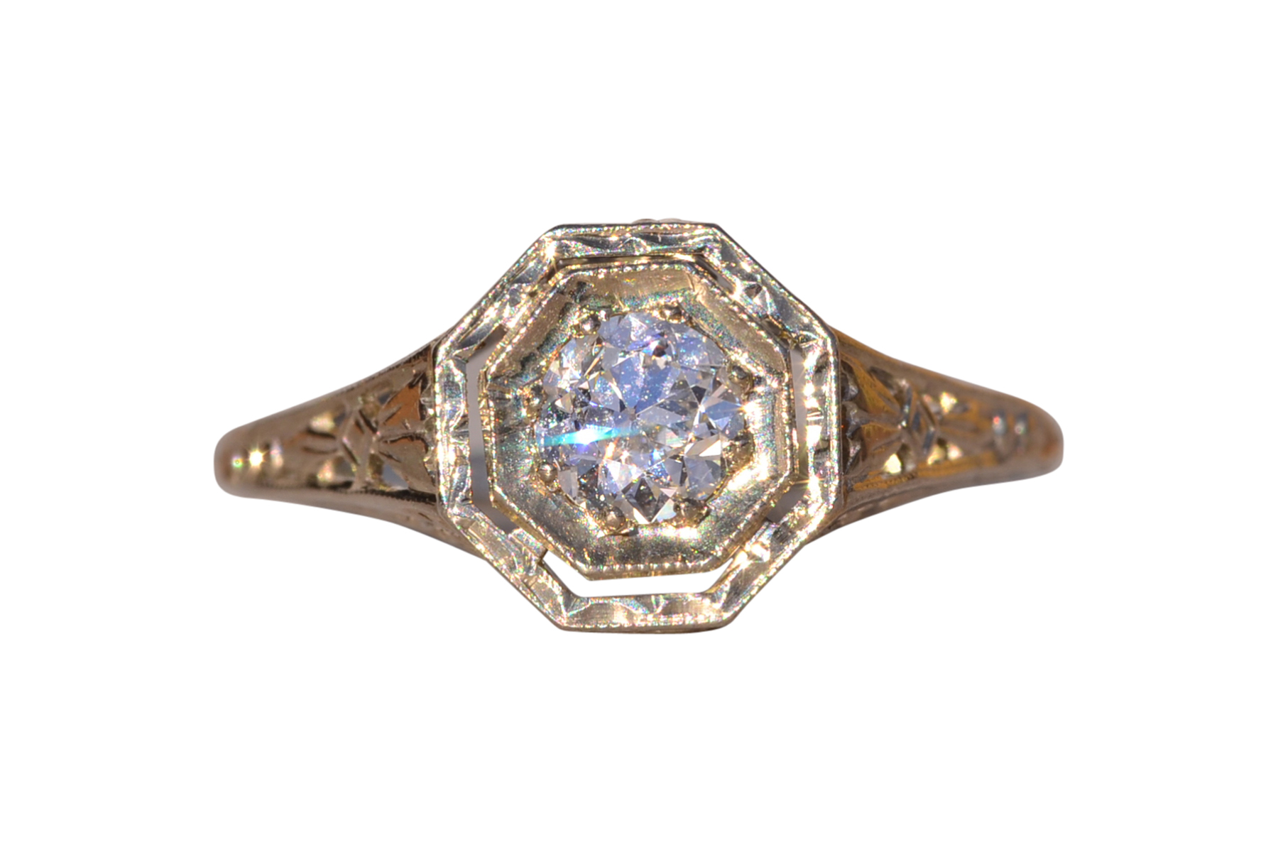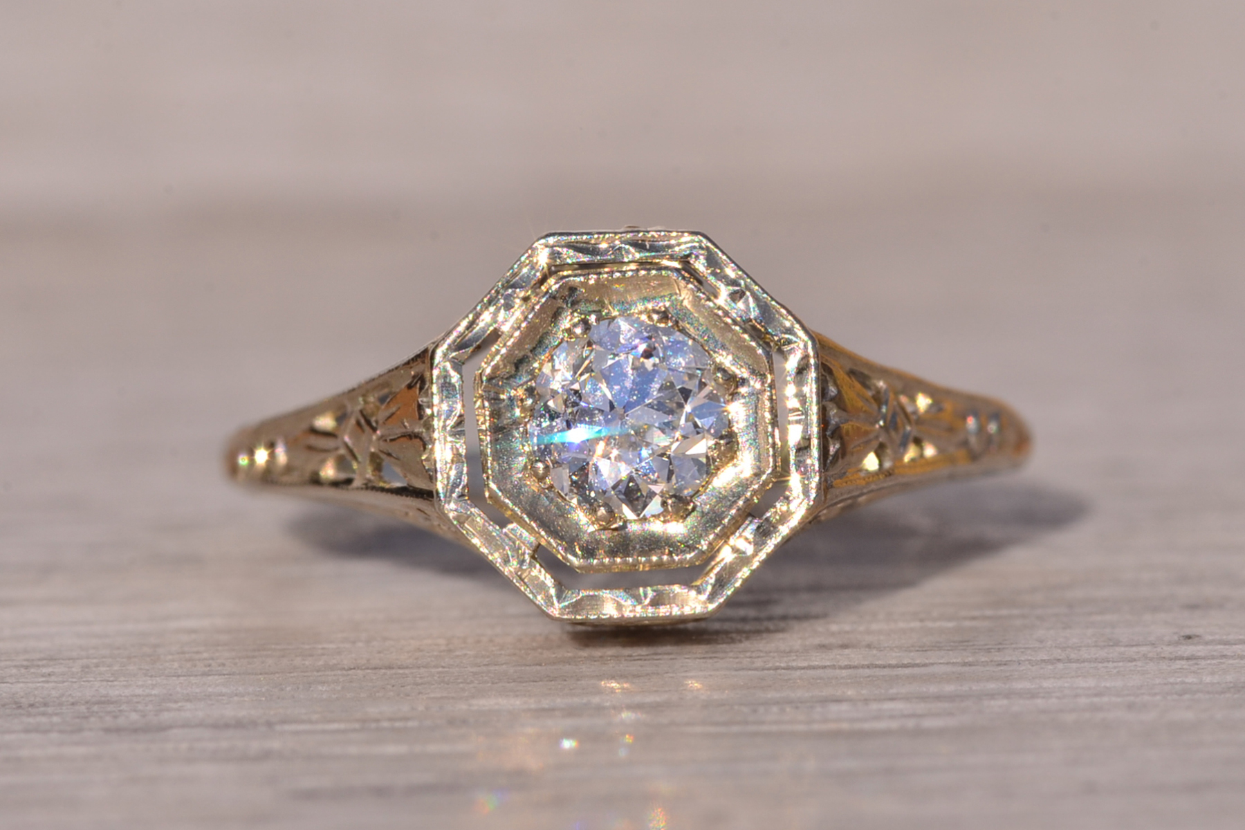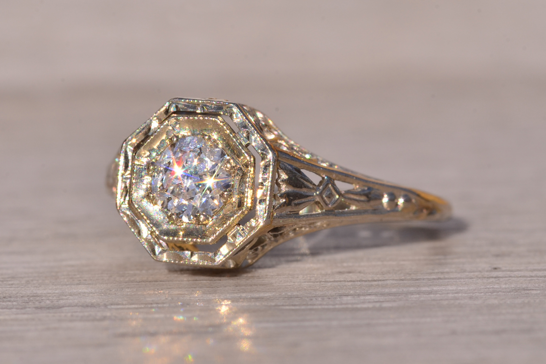 The Stocking: Antique Filigree Engagement Ring in White Gold. This original antique ring showcases a 0.40 carat old European cut natural diamond set within an octagonal box adorned with delicate milgrain detailing and intricate hand engraving. The diamond boasts an approximate Gemological Institute of America clarity grade of VS1 and a color grade of F. Elaborate filigree patterns grace the shank, extending into the through-finger view. Fashioned in 18 karat white gold, the ring is currently a finger size 5, adjustable upon request for an additional charge.