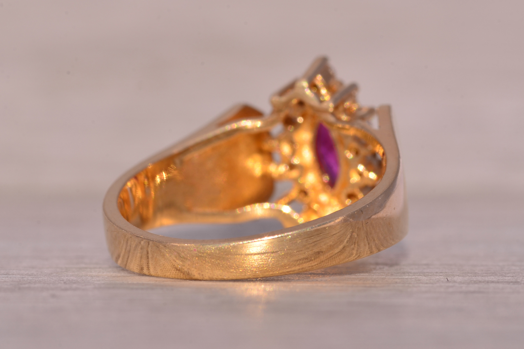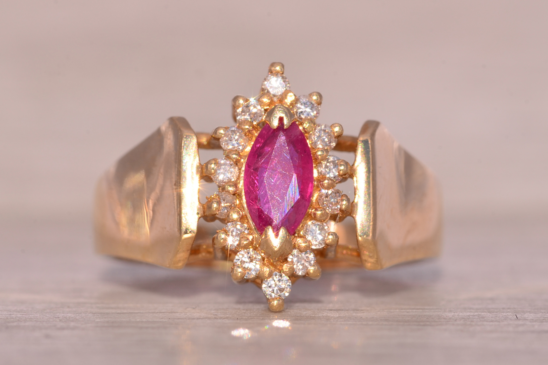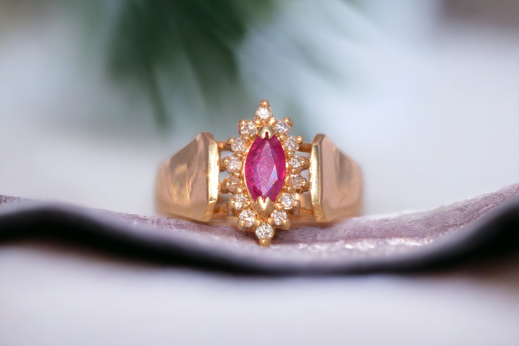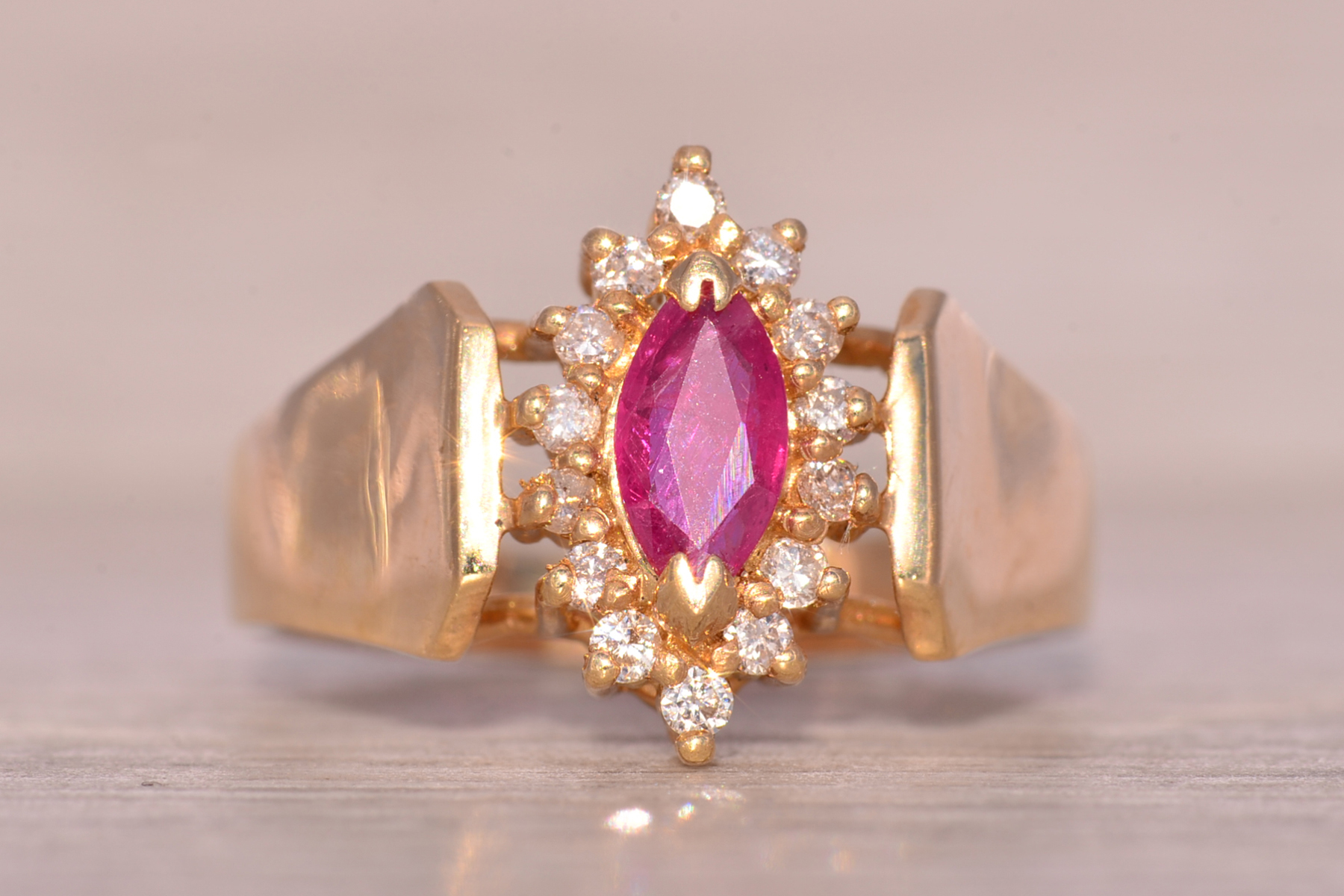 The Stockport: Vintage 1980’s Ruby Navette Ring with Natural Diamonds. This captivating ring features a stunning 0.31 carat marquise brilliant-cut natural ruby, boasting a medium purplish-red color that’s strong in saturation, creating a striking centerpiece. Surrounding the ruby is a navette-shaped halo set with round brilliant-cut natural diamonds, totaling 0.14 carats in weight, adding sparkle and brilliance to the design. The ring is completed with a widened yellow gold shank, adding to its elegance and charm. Meticulously crafted in 14 karat yellow gold, this ring exudes sophistication and timeless beauty. Currently sized at 6, it offers the option for adjustment to any finger size for an additional fee upon request.