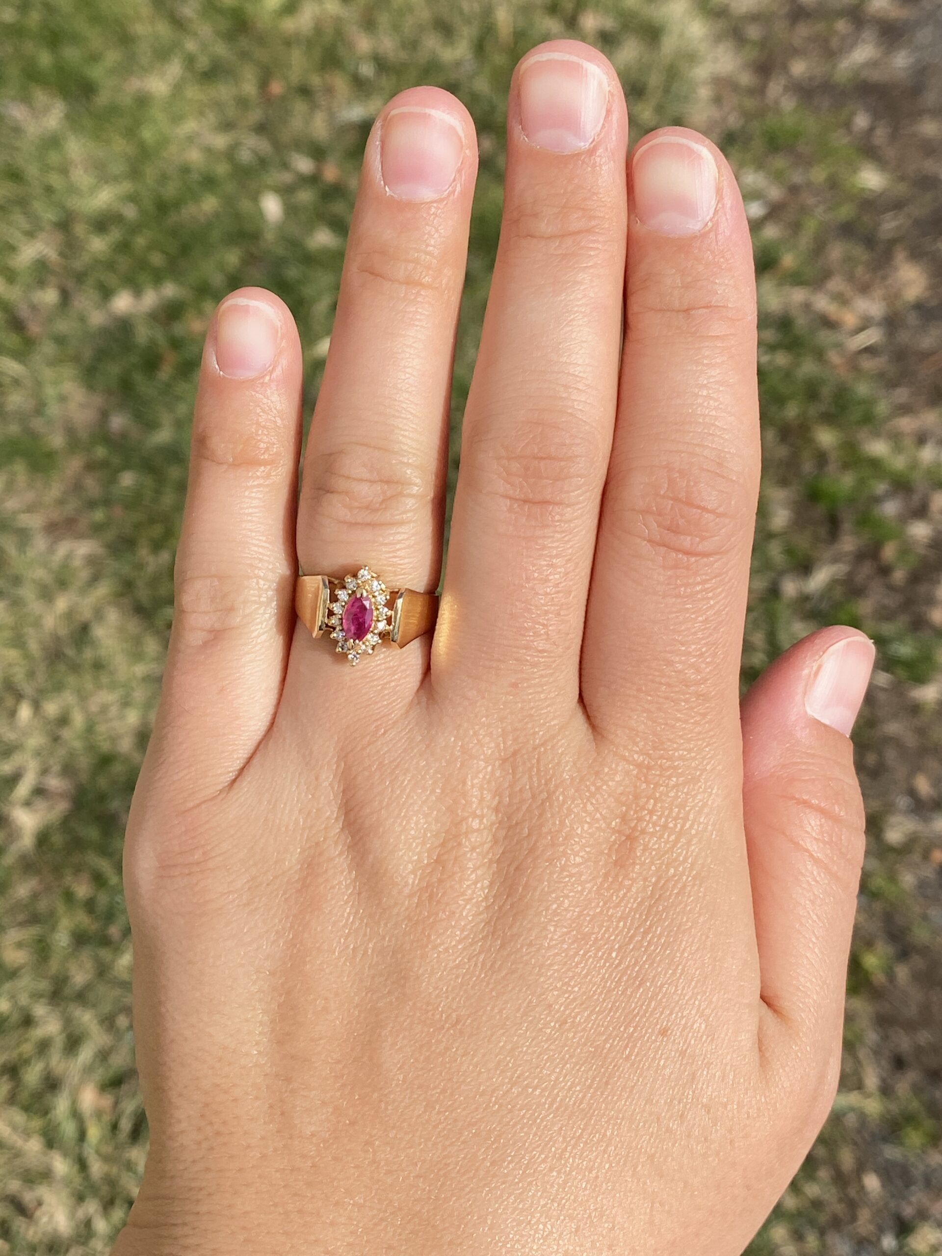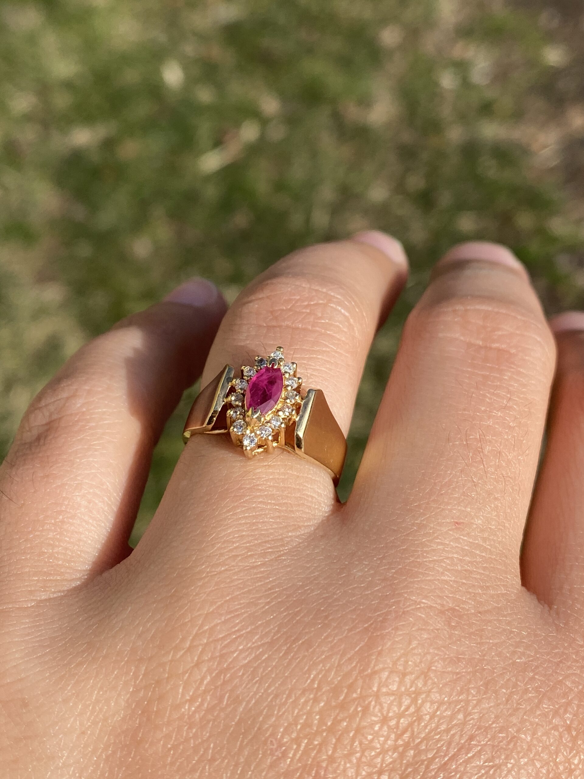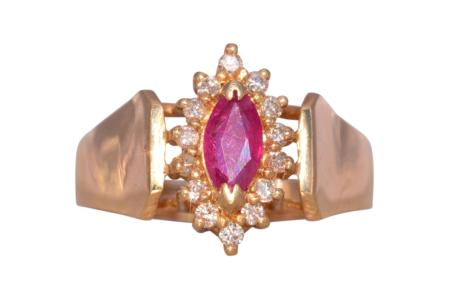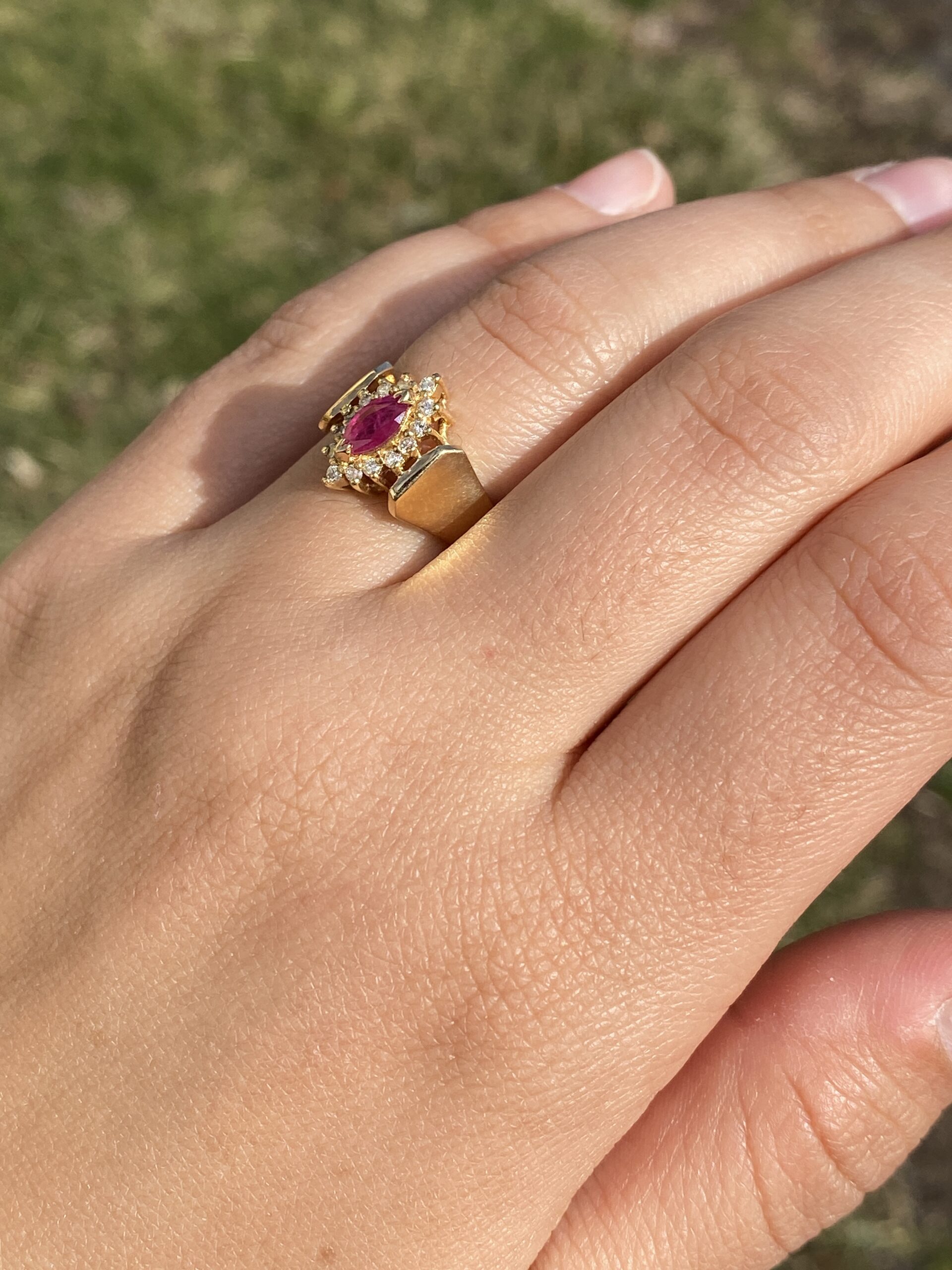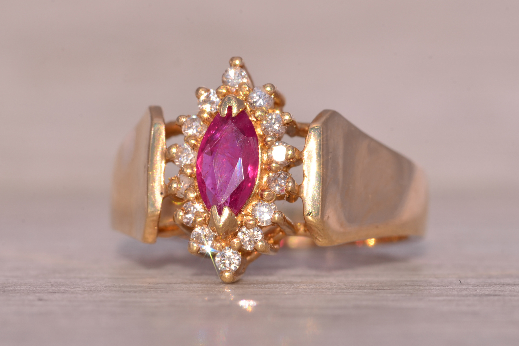 The Stockport: Vintage 1980’s Ruby Navette Ring with Natural Diamonds. This captivating ring features a stunning 0.31 carat marquise brilliant-cut natural ruby, boasting a medium purplish-red color that’s strong in saturation, creating a striking centerpiece. Surrounding the ruby is a navette-shaped halo set with round brilliant-cut natural diamonds, totaling 0.14 carats in weight, adding sparkle and brilliance to the design. The ring is completed with a widened yellow gold shank, adding to its elegance and charm. Meticulously crafted in 14 karat yellow gold, this ring exudes sophistication and timeless beauty. Currently sized at 6, it offers the option for adjustment to any finger size for an additional fee upon request.