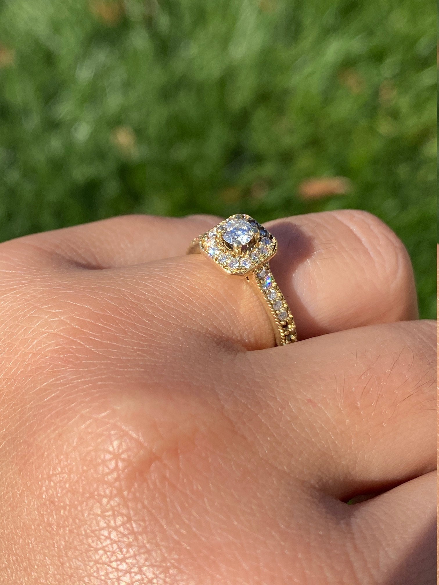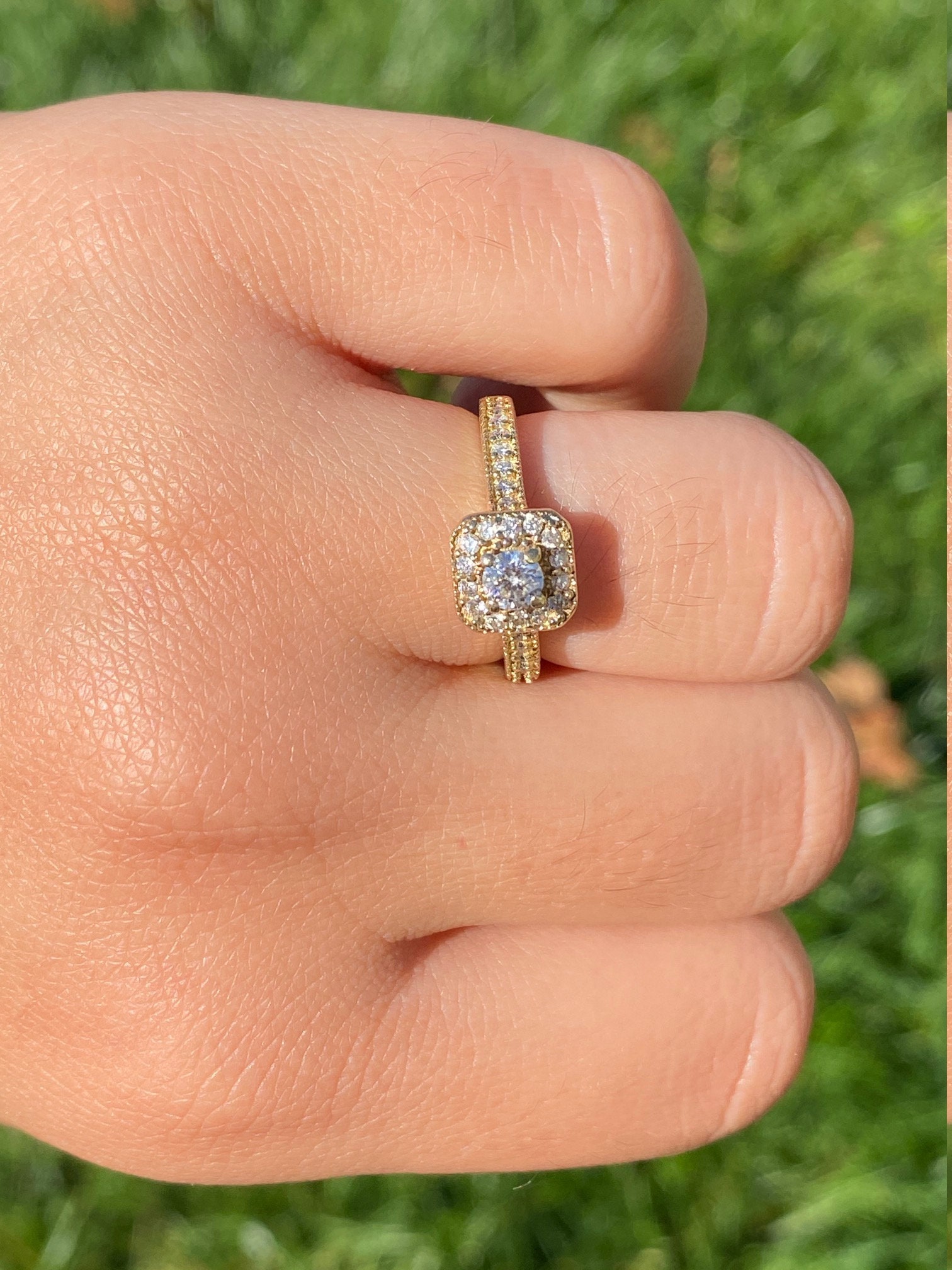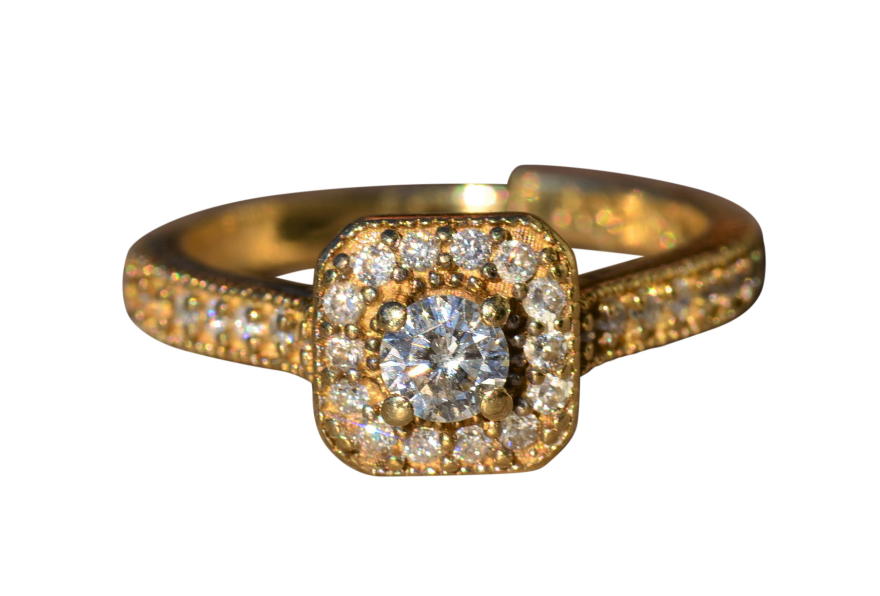 Ladies 10 K Gold Diamond Halo Engagement Ring. This classically designed engagement ring features a round brilliant cut center diamond framed by a diamond halo. Diamonds continue down either side of the shank adding to the overall carat weight of the ring. When purchased, any missing diamonds will be replaced and we will offer complimentary sizing.
