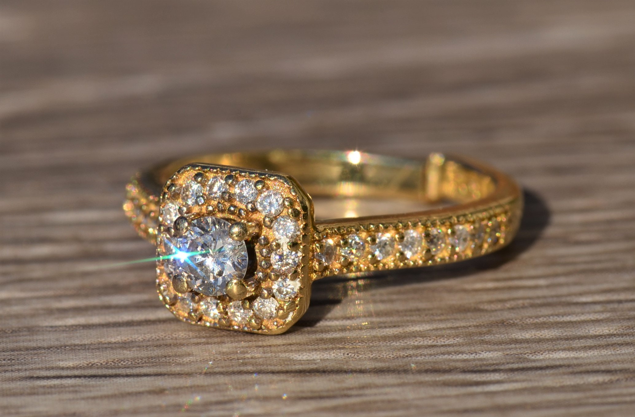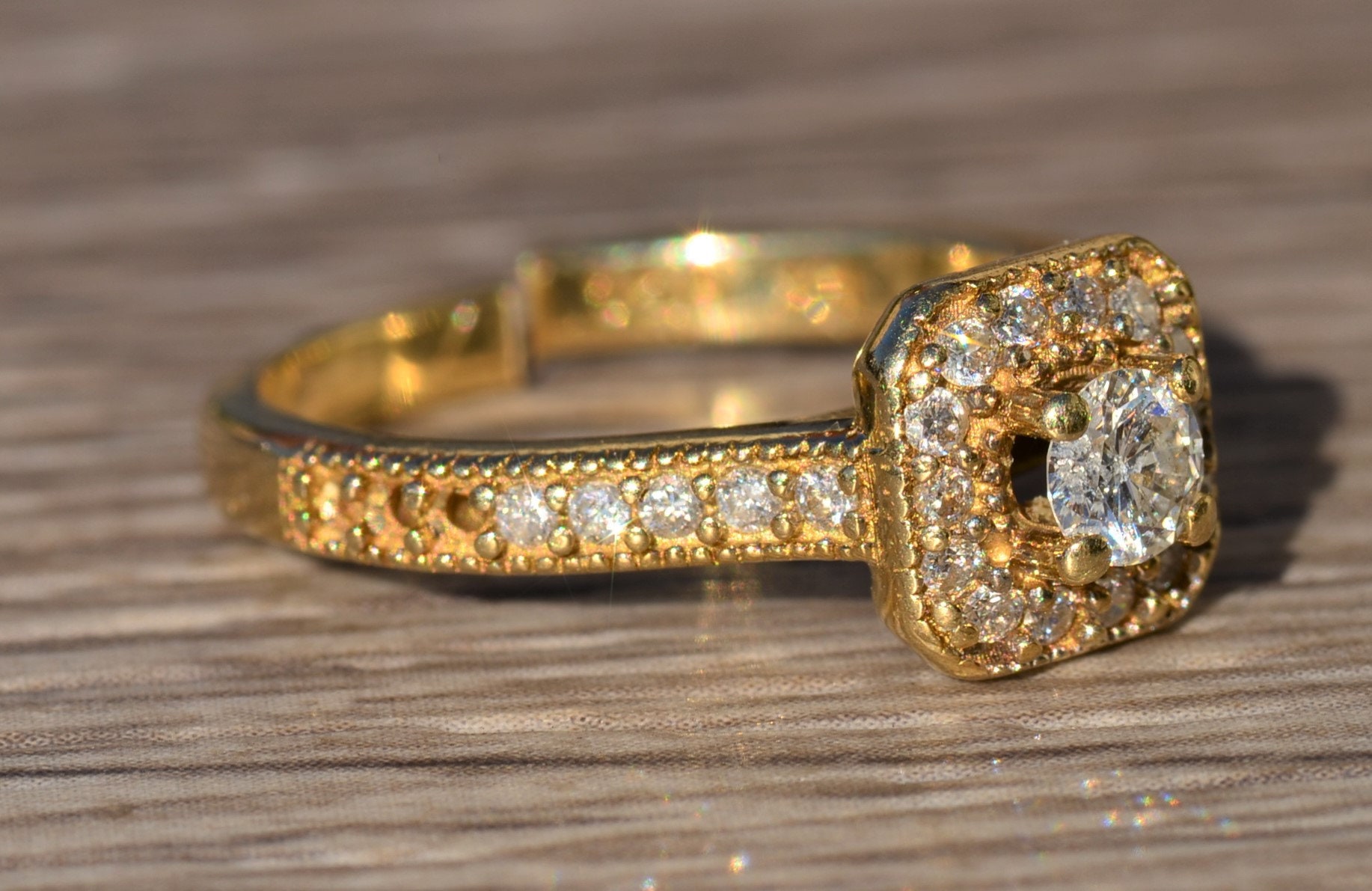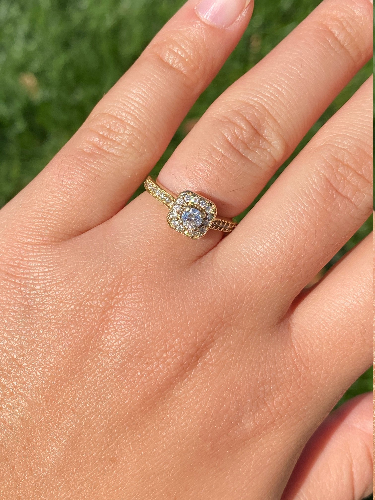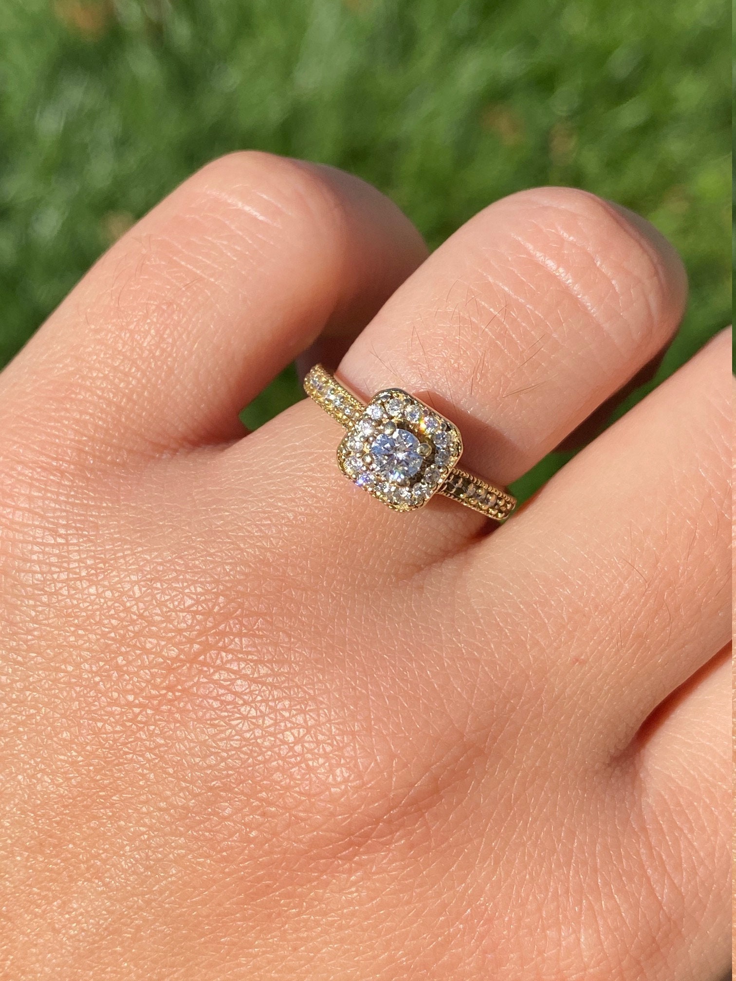 Ladies 10 K Gold Diamond Halo Engagement Ring. This classically designed engagement ring features a round brilliant cut center diamond framed by a diamond halo. Diamonds continue down either side of the shank adding to the overall carat weight of the ring. When purchased, any missing diamonds will be replaced and we will offer complimentary sizing.