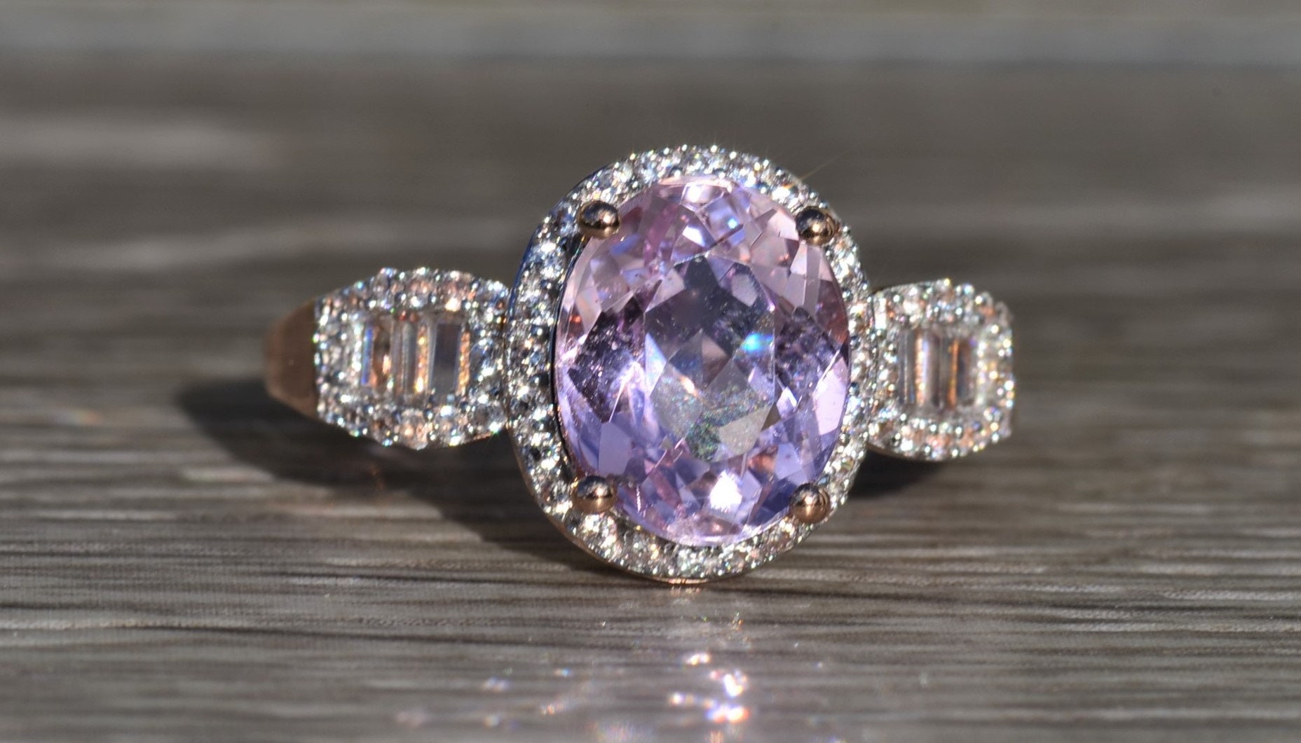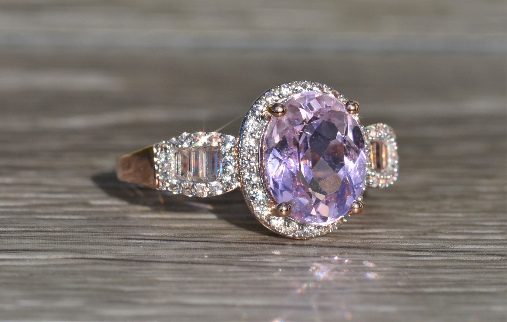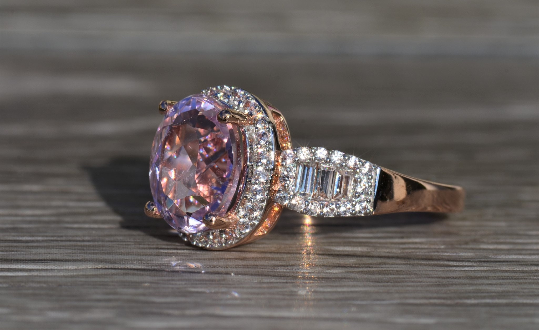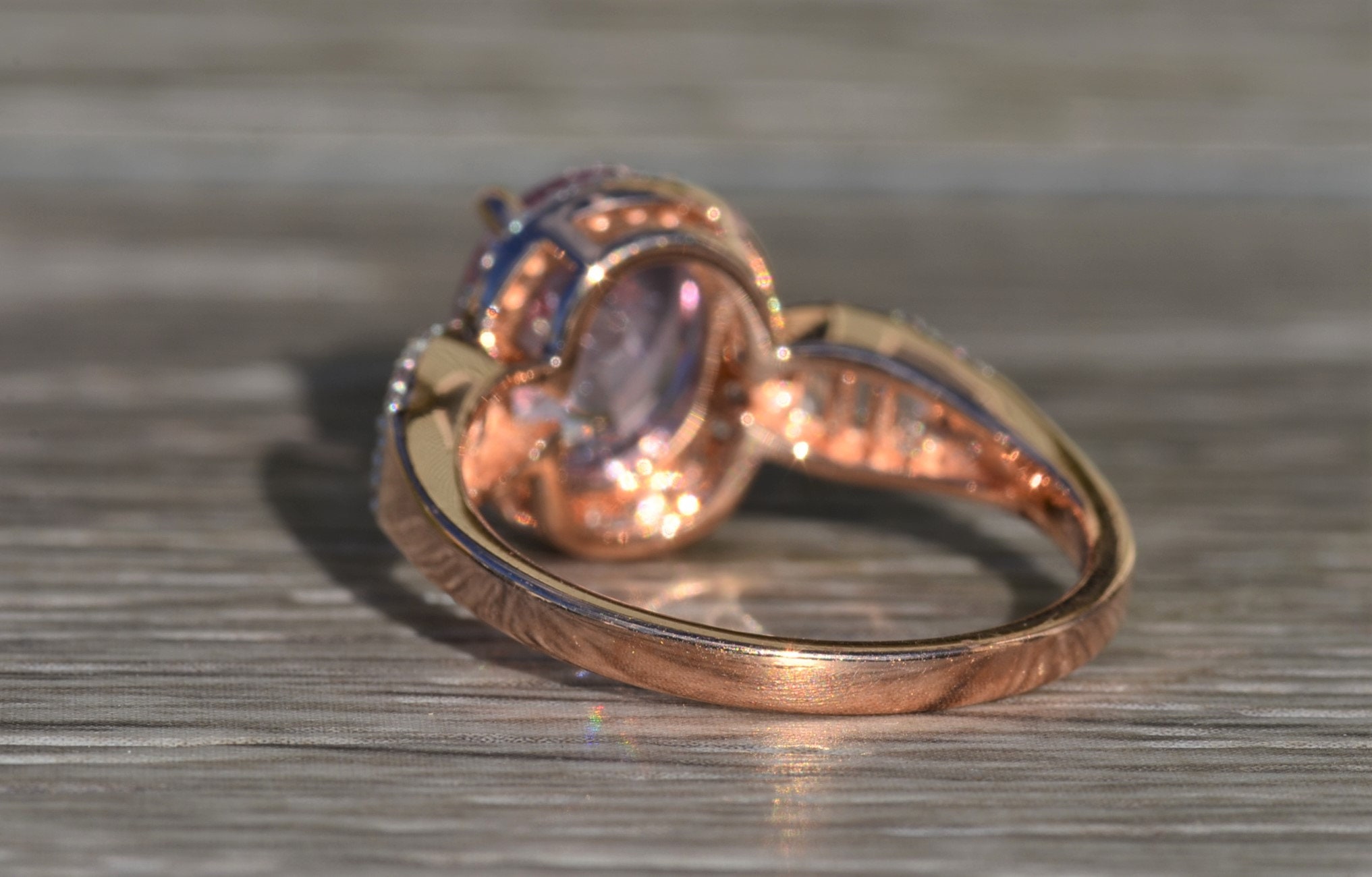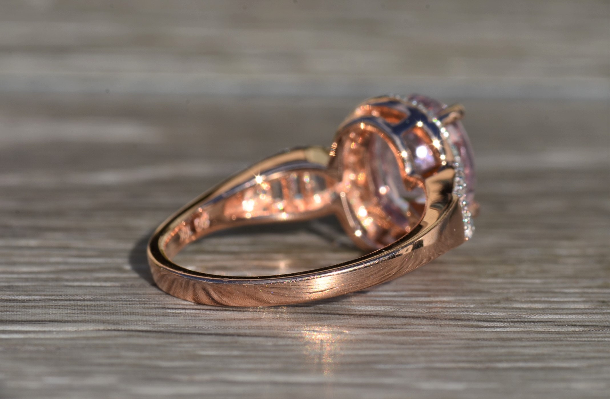 Ladies Rose Gold 2.50 CT Morganite and White Sapphire Ring. Crafted in trendy rose gold, this contemporary styled ladies ring features a 2.50 carat center oval morganite. A white sapphire halo surrounds the center stone and continues down either side of the shank. Currently a finger size 8, this ring can be resized for an additional charge.