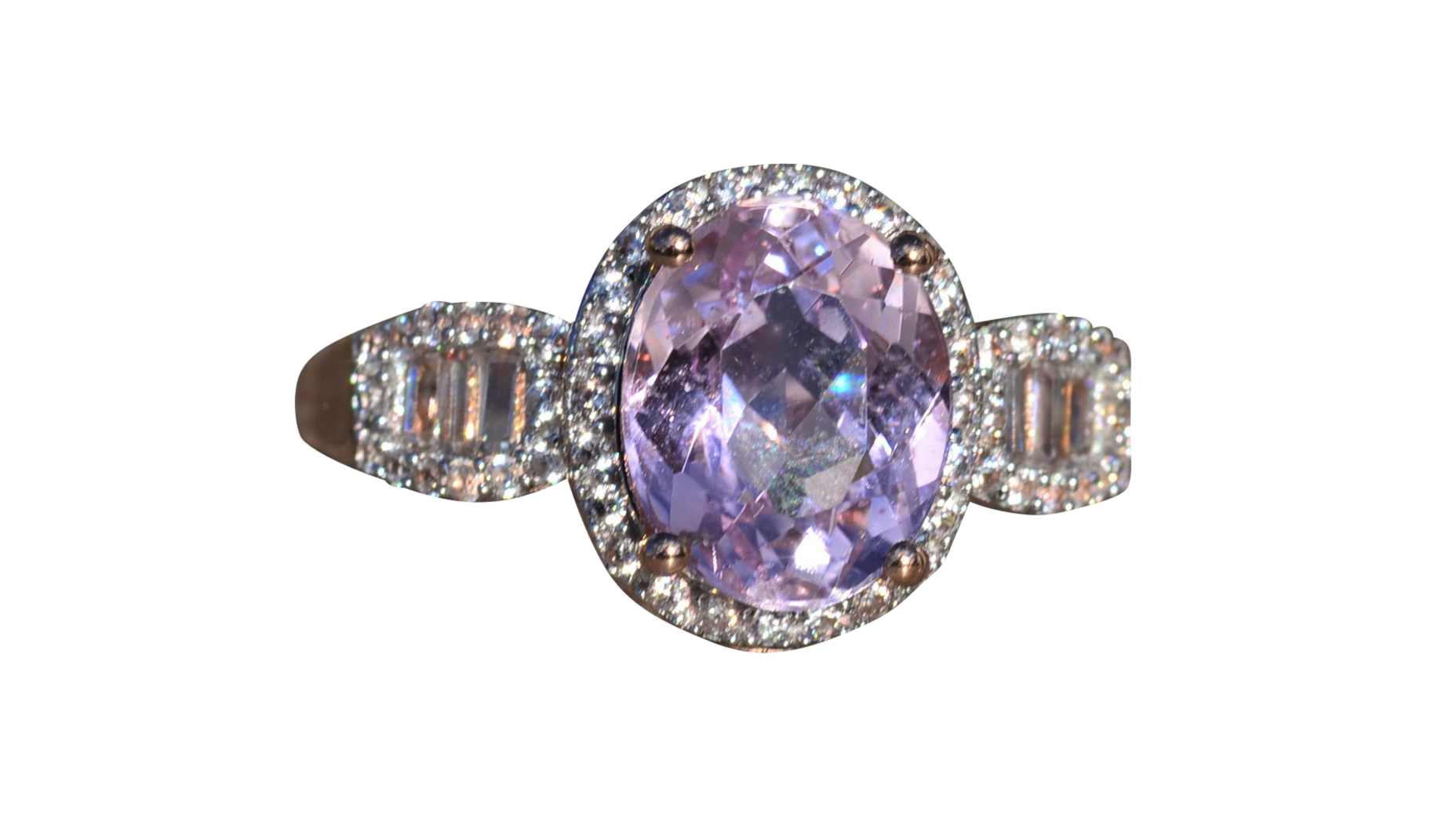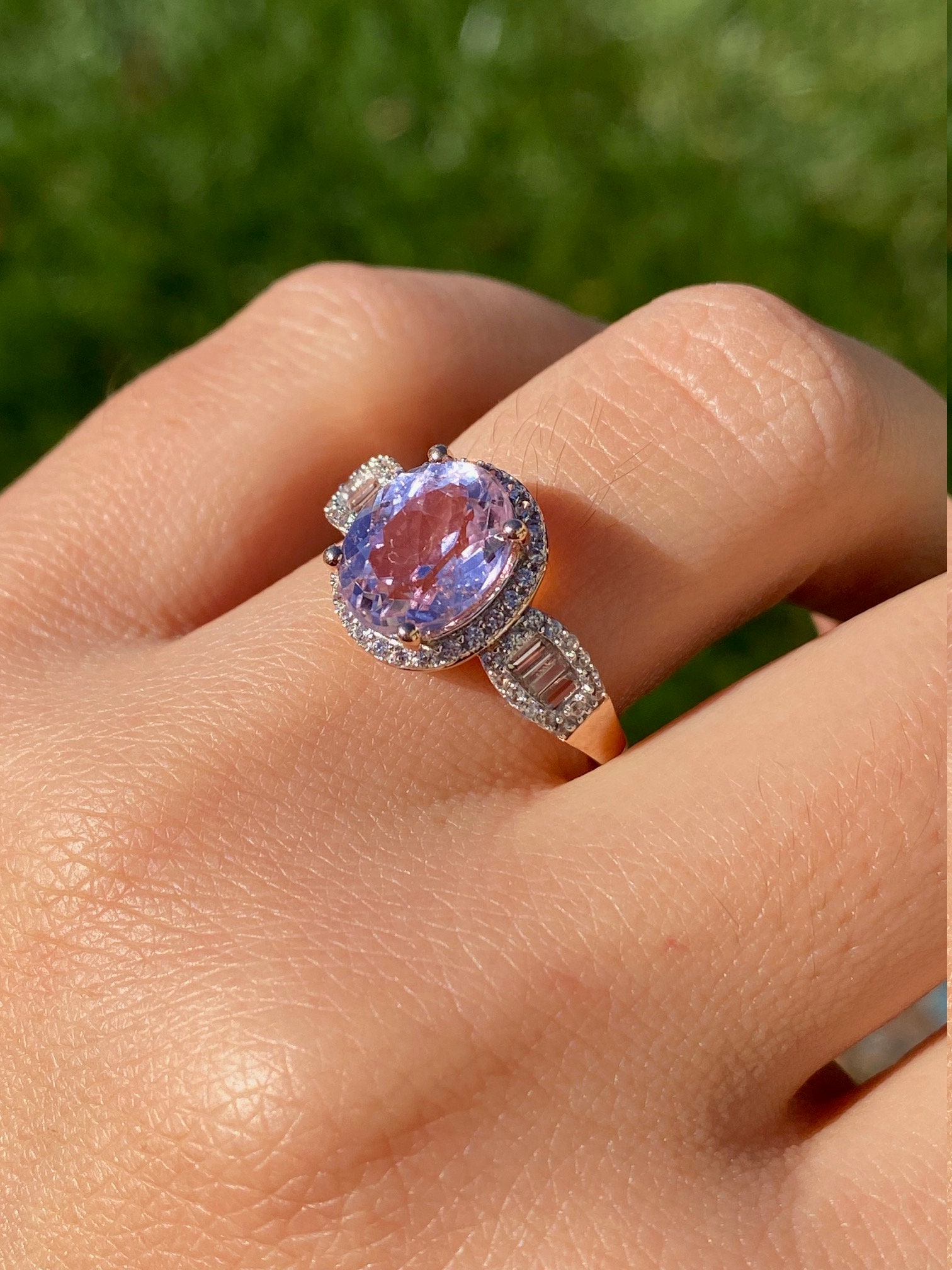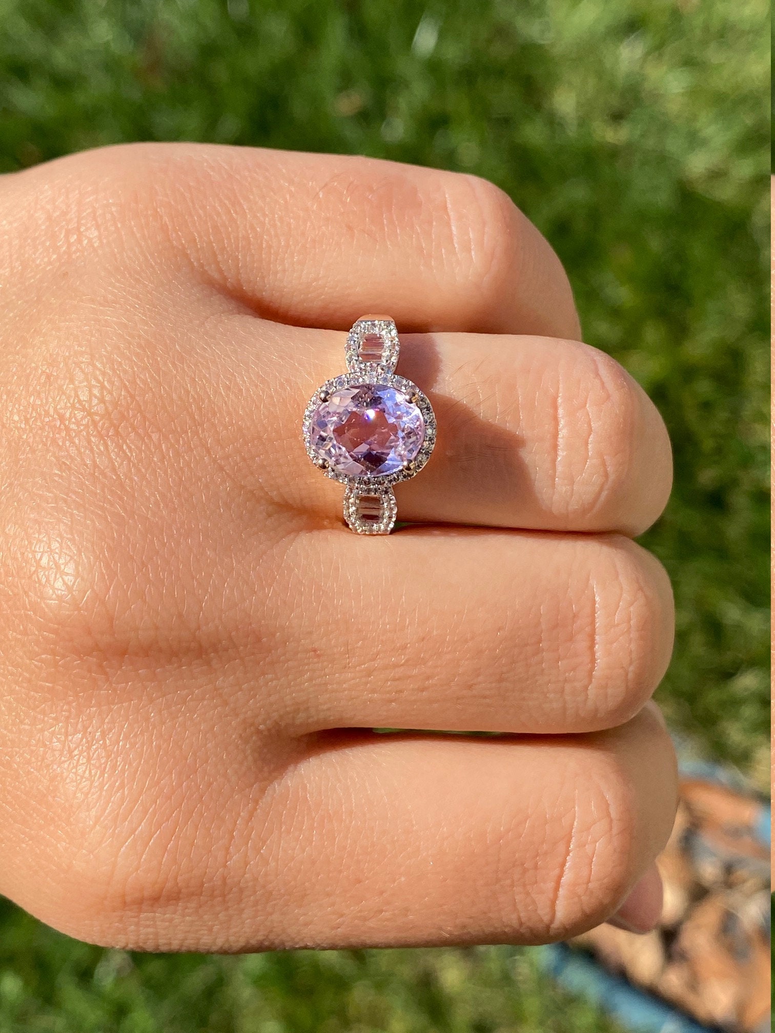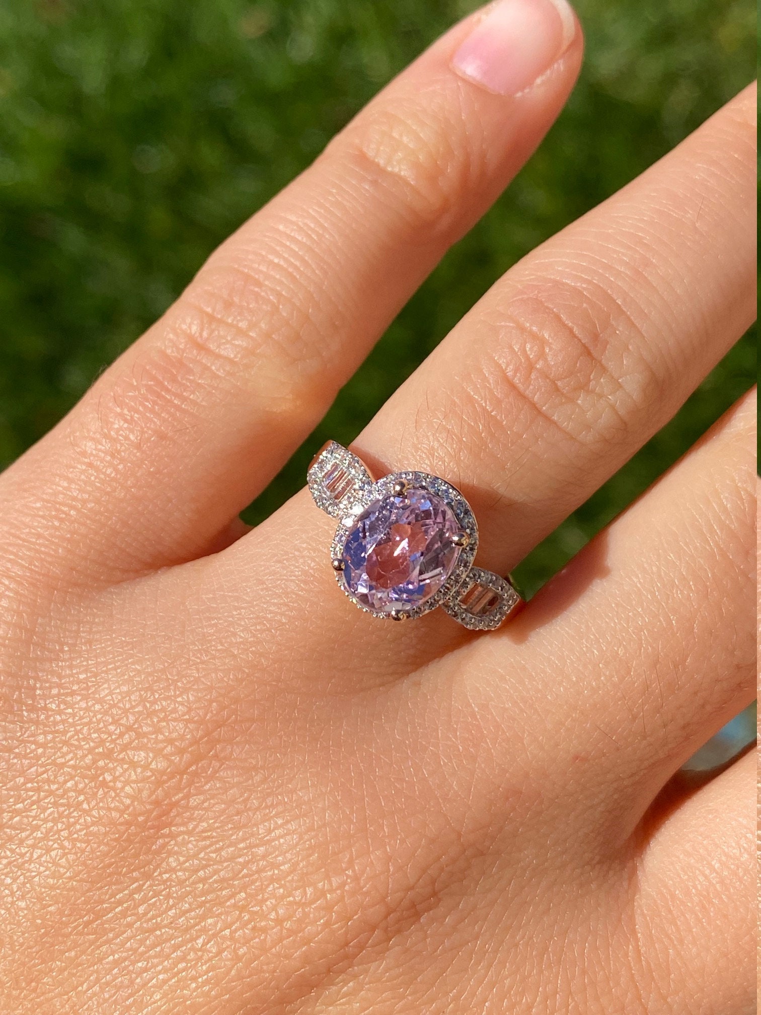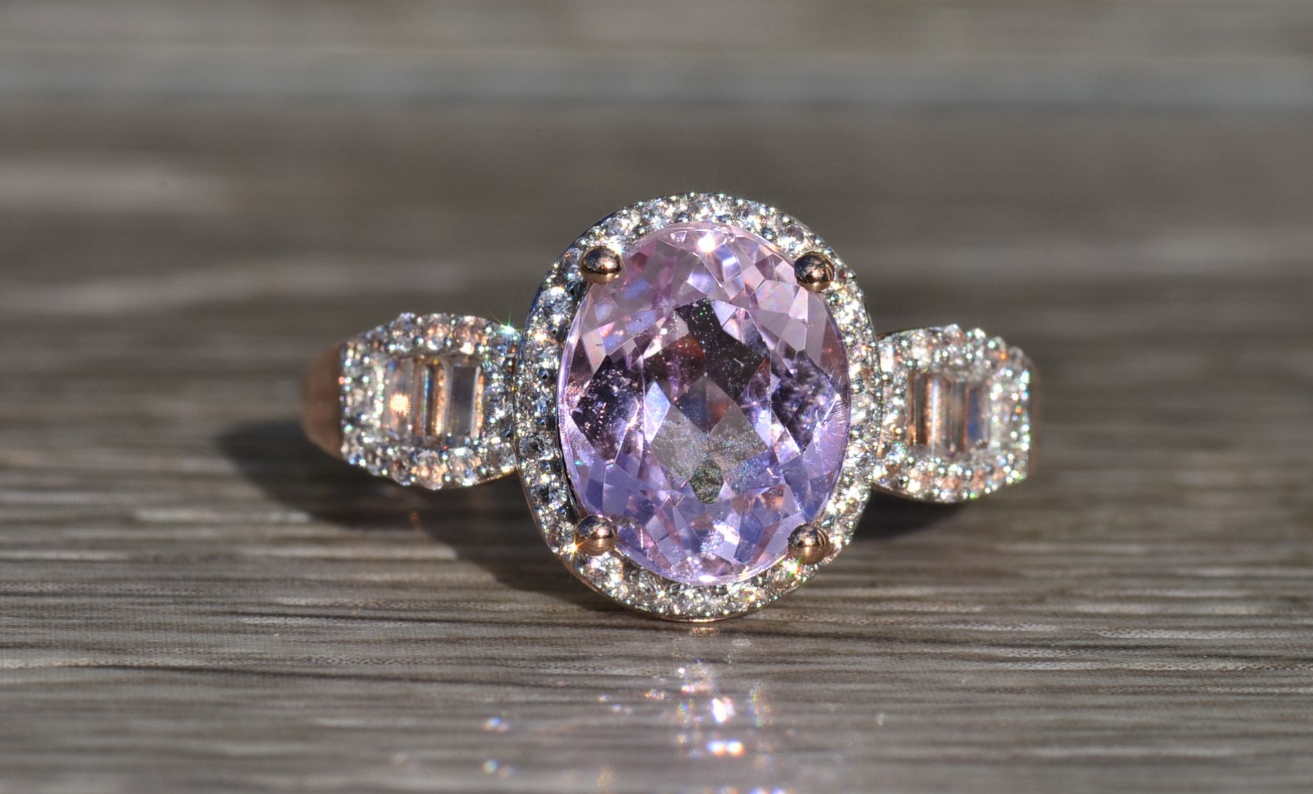 Ladies Rose Gold 2.50 CT Morganite and White Sapphire Ring. Crafted in trendy rose gold, this contemporary styled ladies ring features a 2.50 carat center oval morganite. A white sapphire halo surrounds the center stone and continues down either side of the shank. Currently a finger size 8, this ring can be resized for an additional charge.