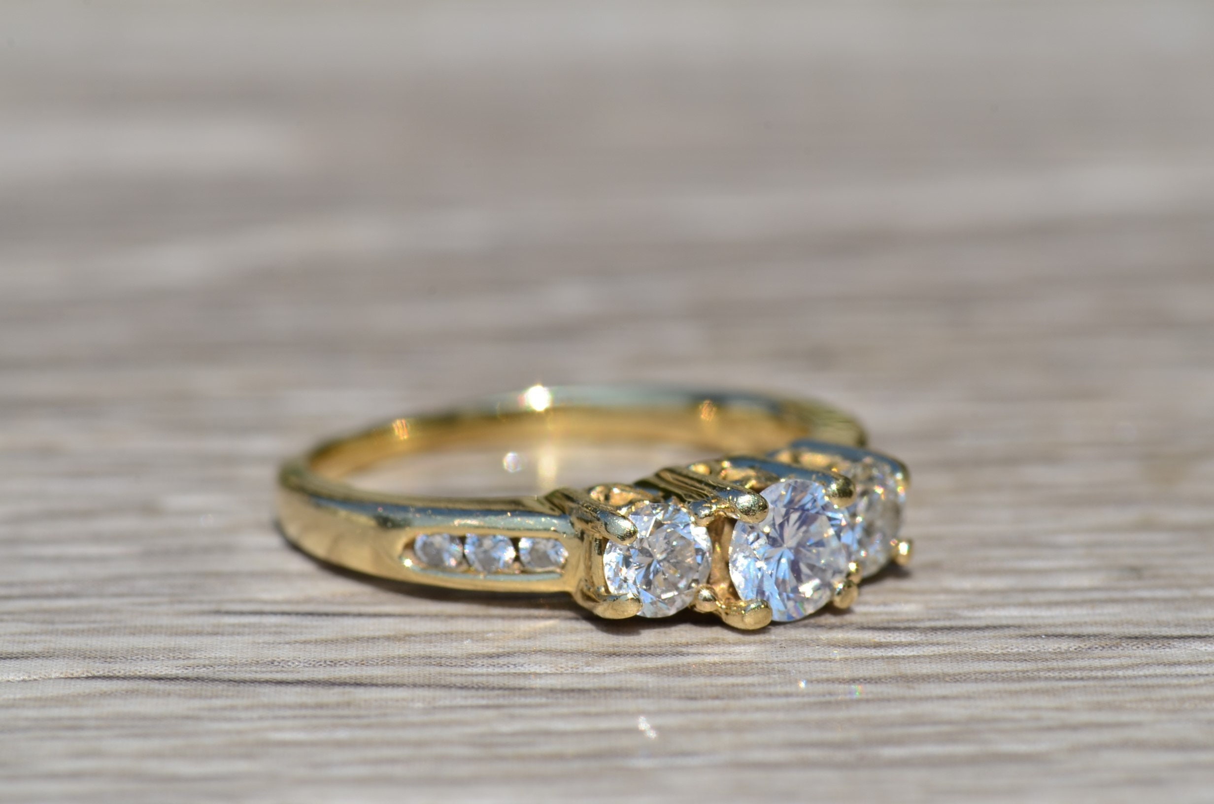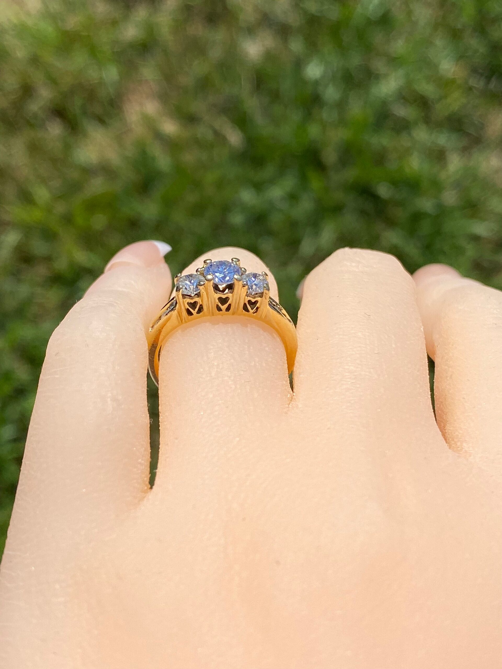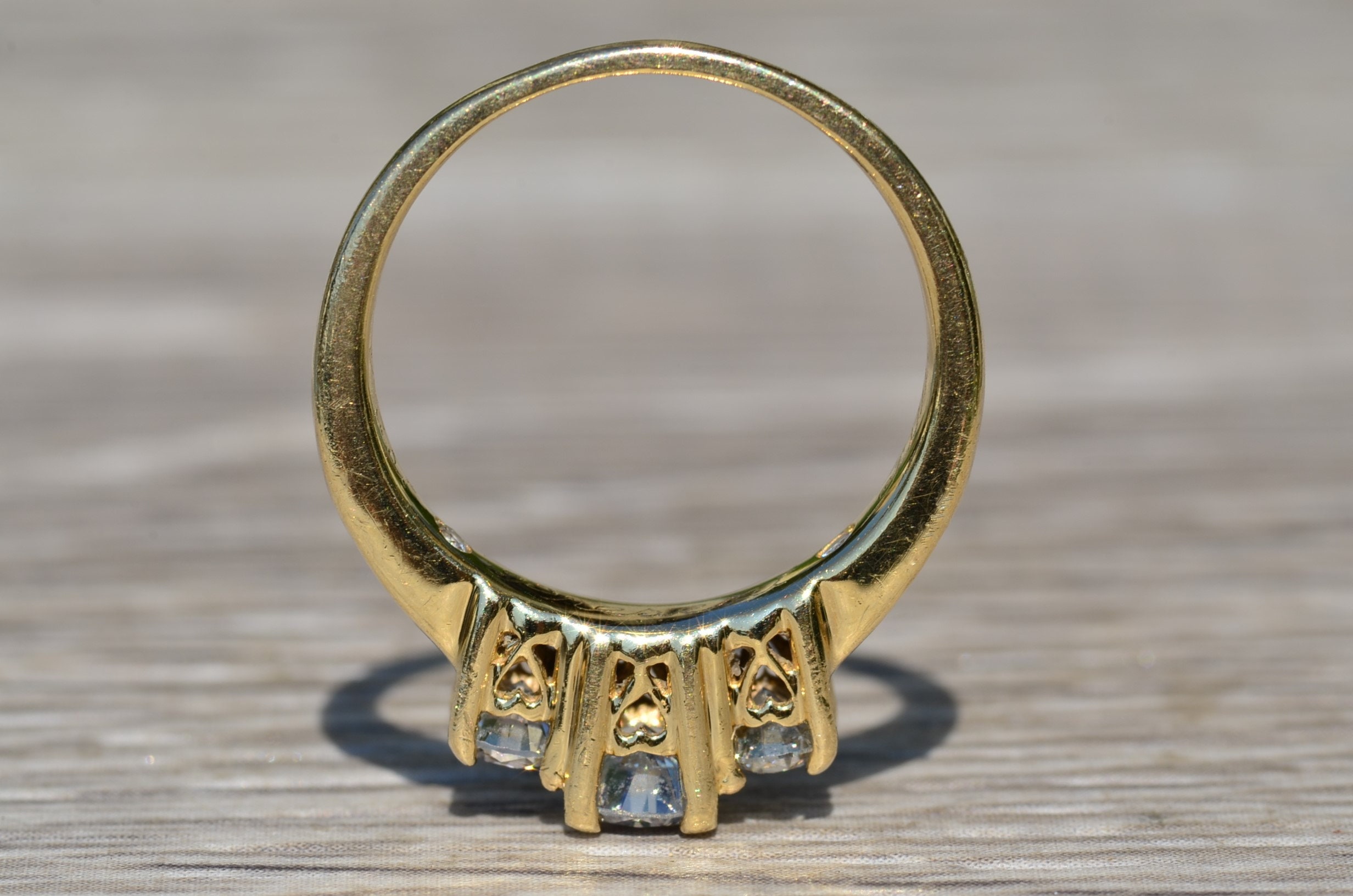 The Sunrise: Contemporary Three Stone Engagement Ring Set With Diamonds. Centering the Ring is a 0.36 carat round brilliant cut diamond flanked on either side by a 0.20 carat round brilliant cut diamond. Below the heads of these three central stones is a hidden filigree heart that is only able to be seen in the through-finger view. An additional three round brilliant cut diamonds finish the sides of the ring. Hidden below the center section is the engraving: Past Present, and Future with a single diamond separating each word. The ring is crafted in 14 karat yellow gold and the ring is currently a finger size 6 yet can easily be adjusted to fit any size finger for an additional fee.