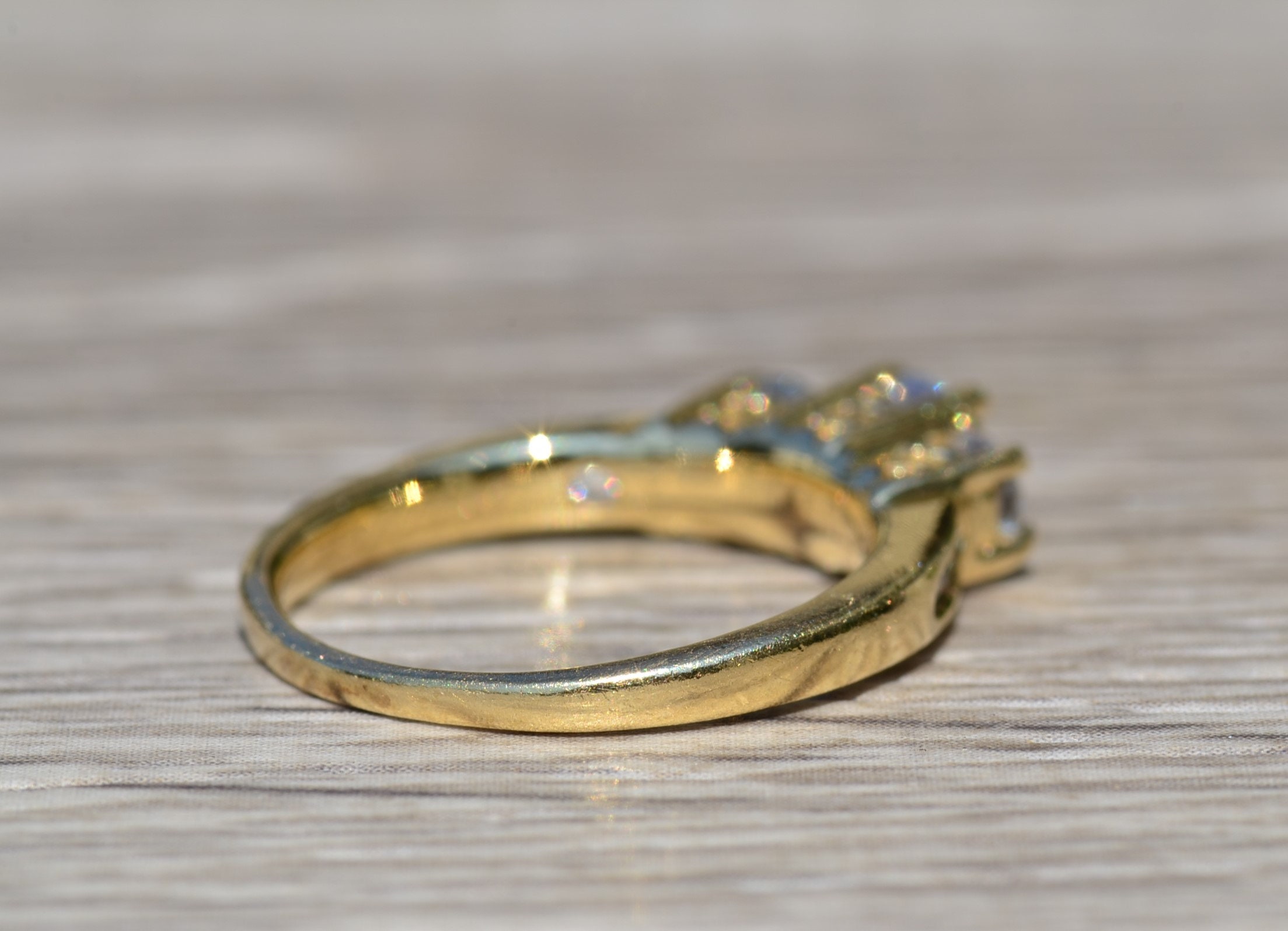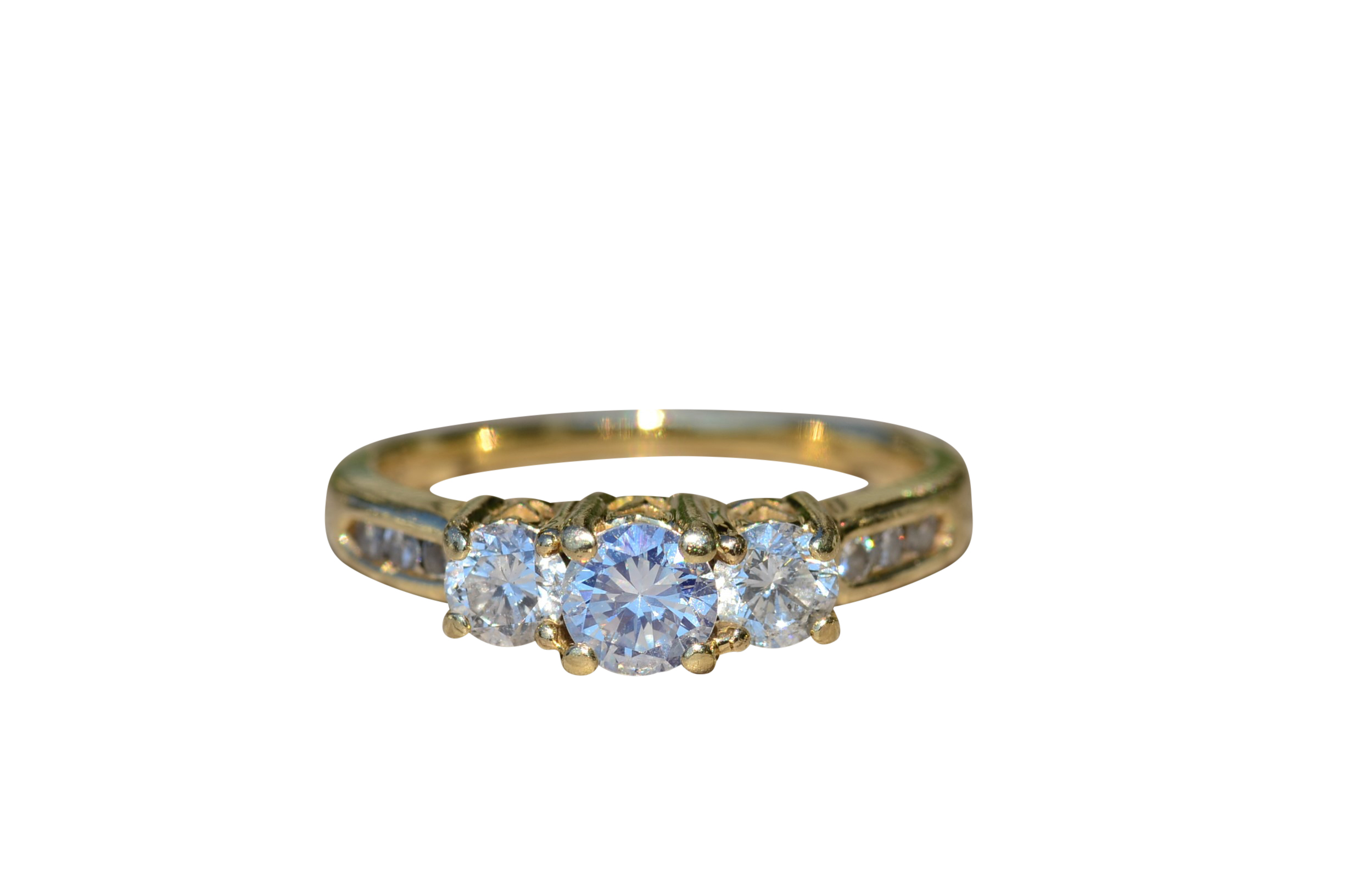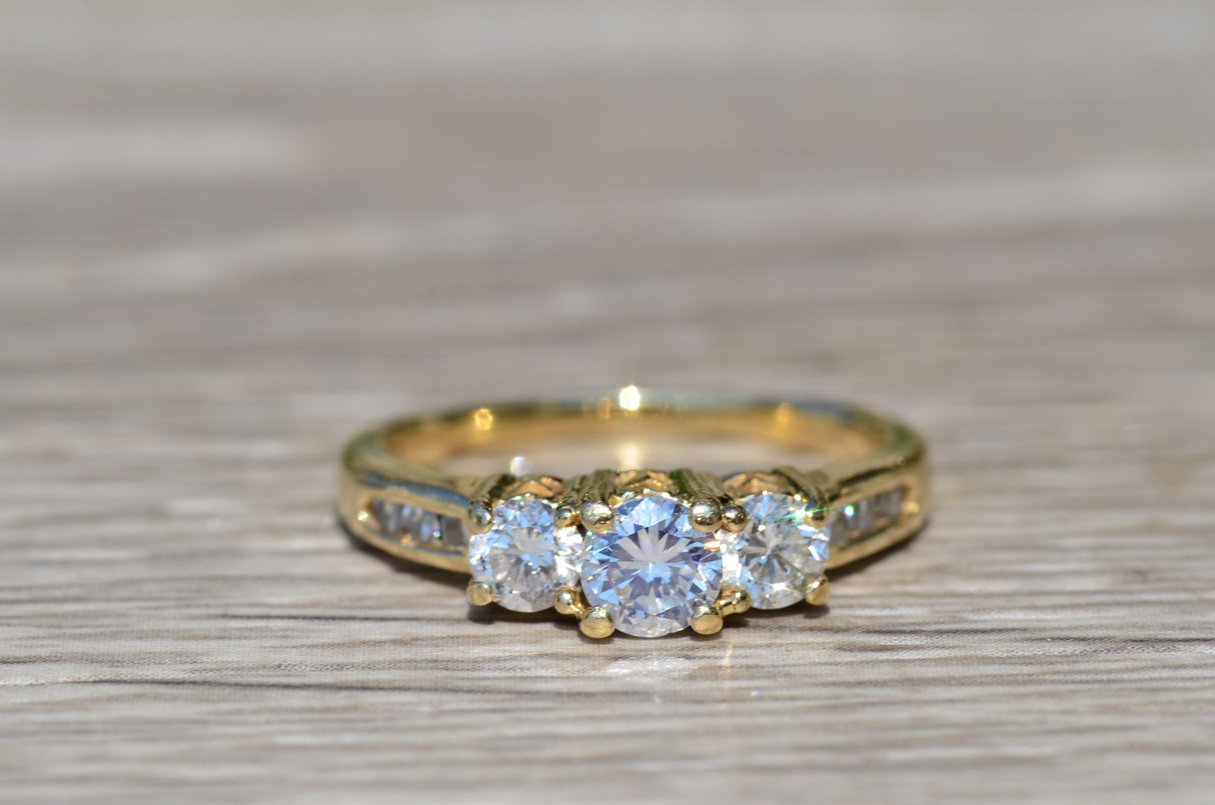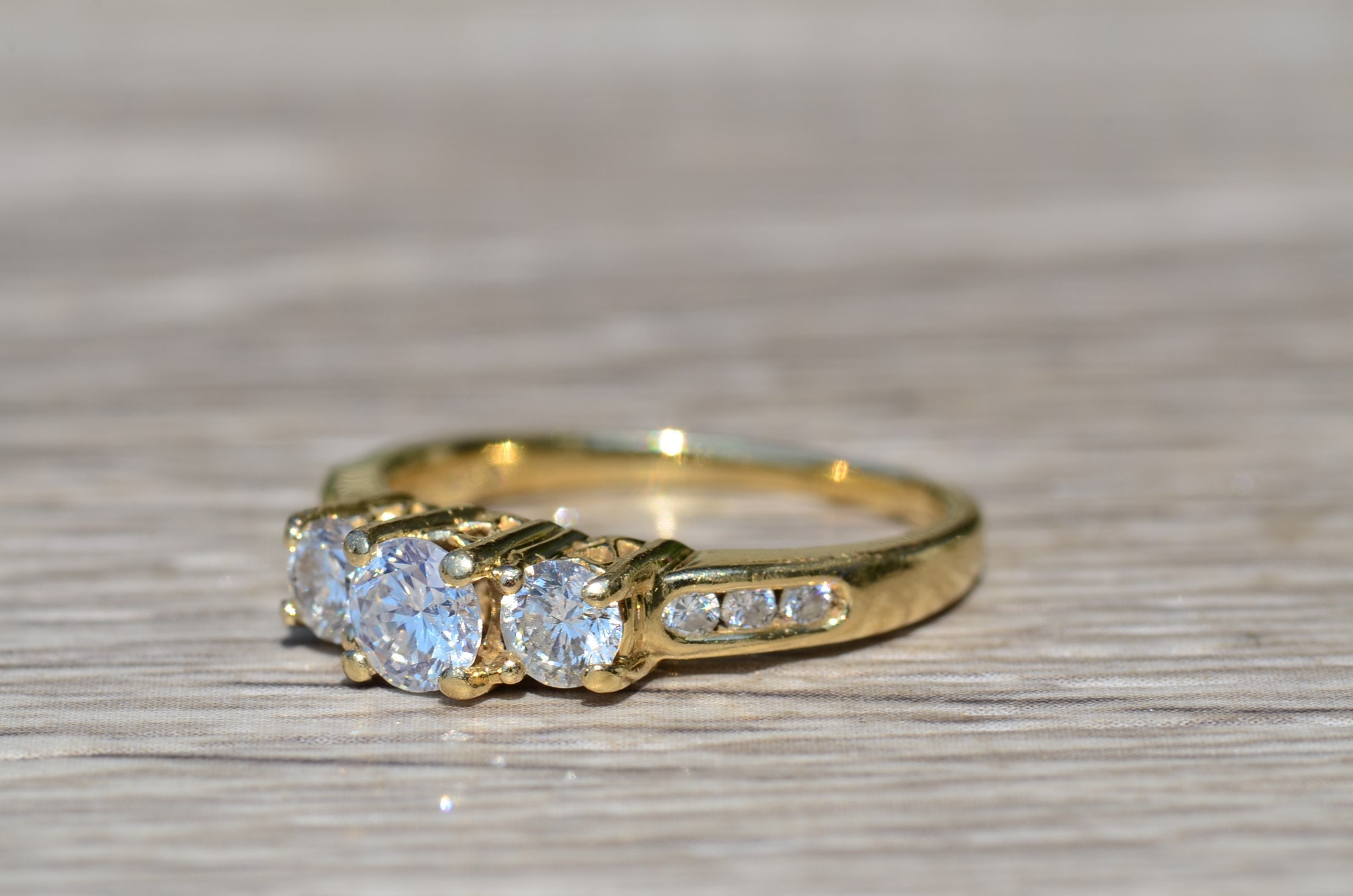 The Sunrise: Contemporary Three Stone Engagement Ring Set With Diamonds. Centering the Ring is a 0.36 carat round brilliant cut diamond flanked on either side by a 0.20 carat round brilliant cut diamond. Below the heads of these three central stones is a hidden filigree heart that is only able to be seen in the through-finger view. An additional three round brilliant cut diamonds finish the sides of the ring. Hidden below the center section is the engraving: Past Present, and Future with a single diamond separating each word. The ring is crafted in 14 karat yellow gold and the ring is currently a finger size 6 yet can easily be adjusted to fit any size finger for an additional fee.