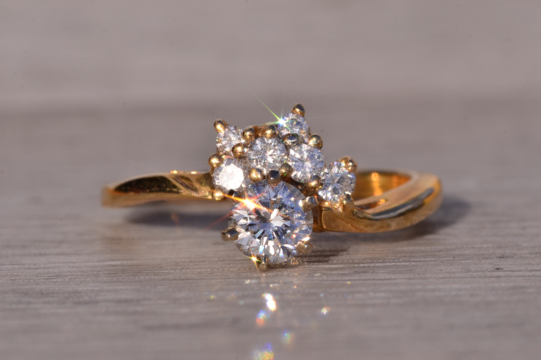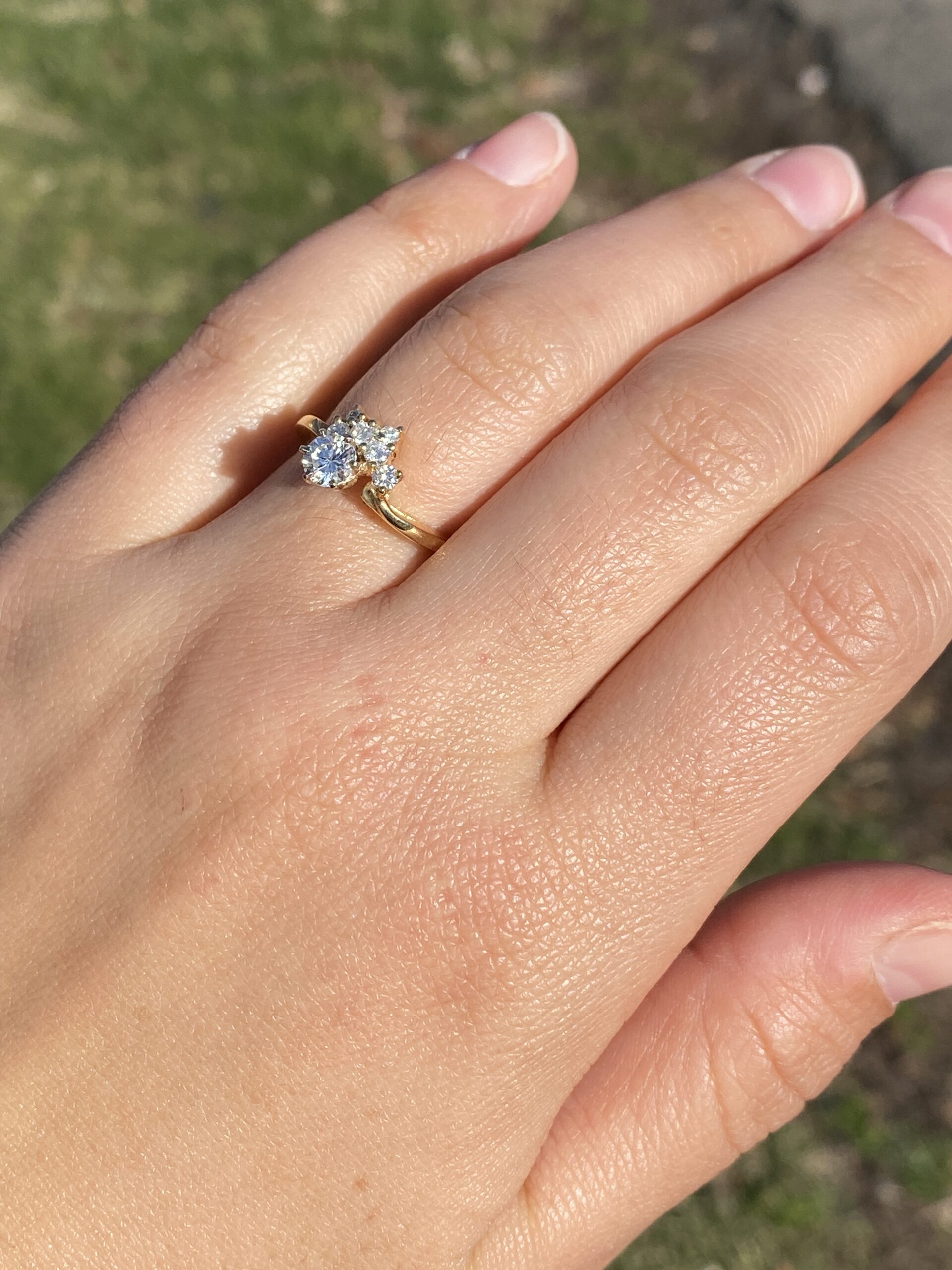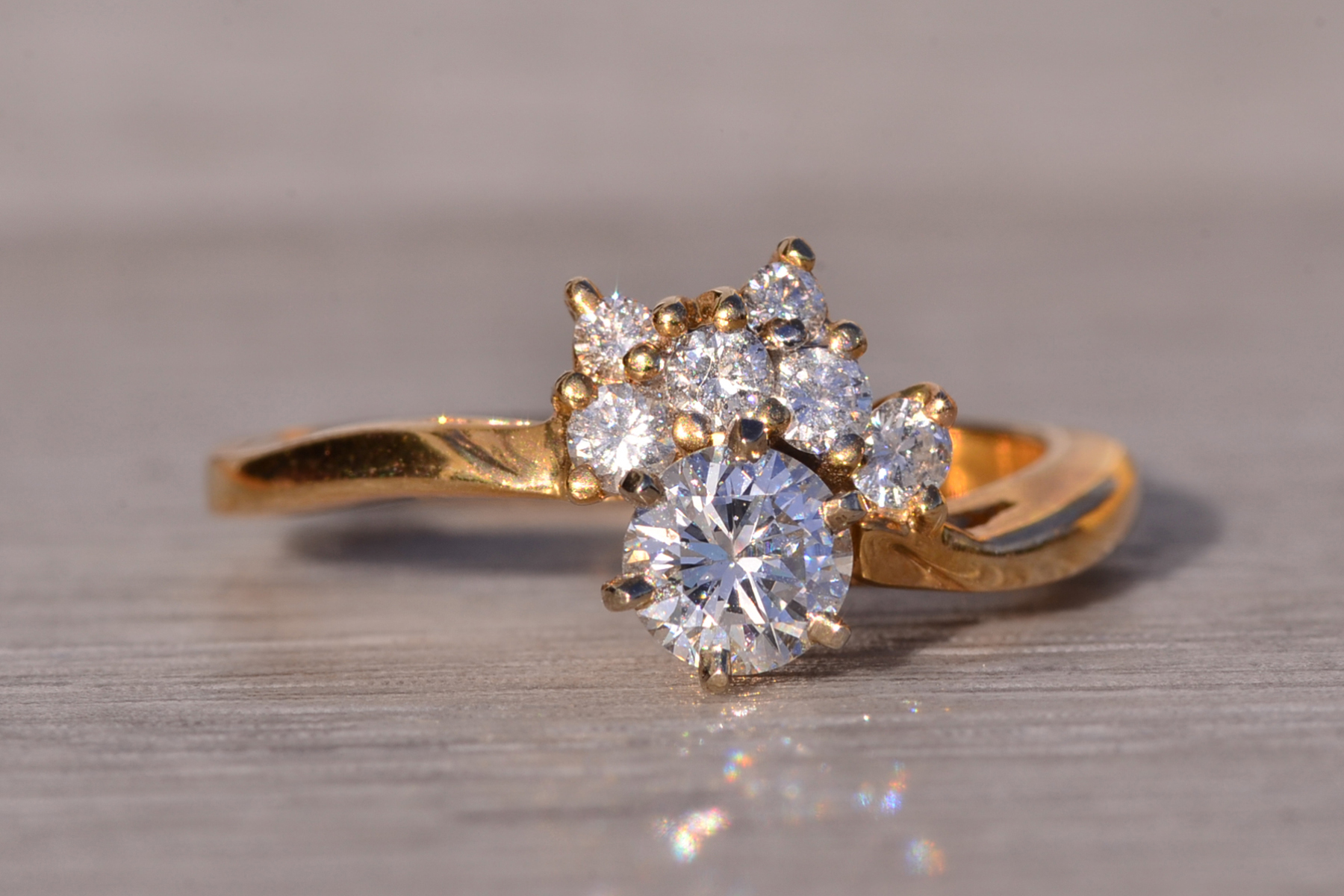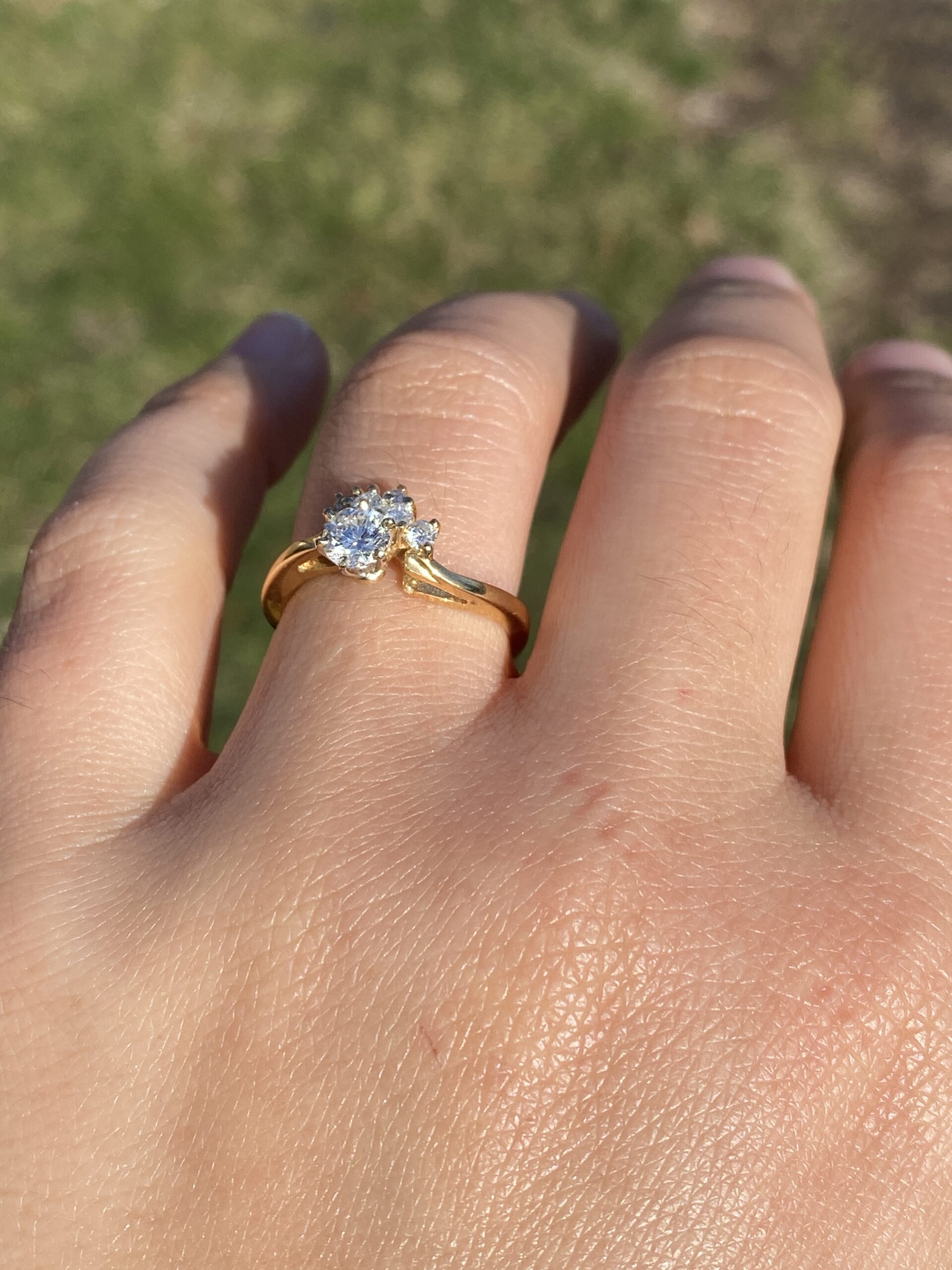 The Sunshine: Vintage Natural Diamond Engagement Ring in Yellow Gold. This exquisite ring showcases a captivating 0.40 carat round brilliant cut natural diamond, boasting an approximate Gemological Institute of America clarity grade of Si1 and a color grade of J. Adorning one side of the center are half-moon arrangements of round brilliant cut natural diamonds, radiating outward with a total approximate weight of 0.16 carats. The ring is elegantly finished with a waved shank, adding to its allure. Crafted in 14 karat yellow gold, this vintage-inspired engagement ring evokes the warmth of a golden sunset. Currently sized at 6.5, it can be adjusted to any finger size for an additional charge upon request.