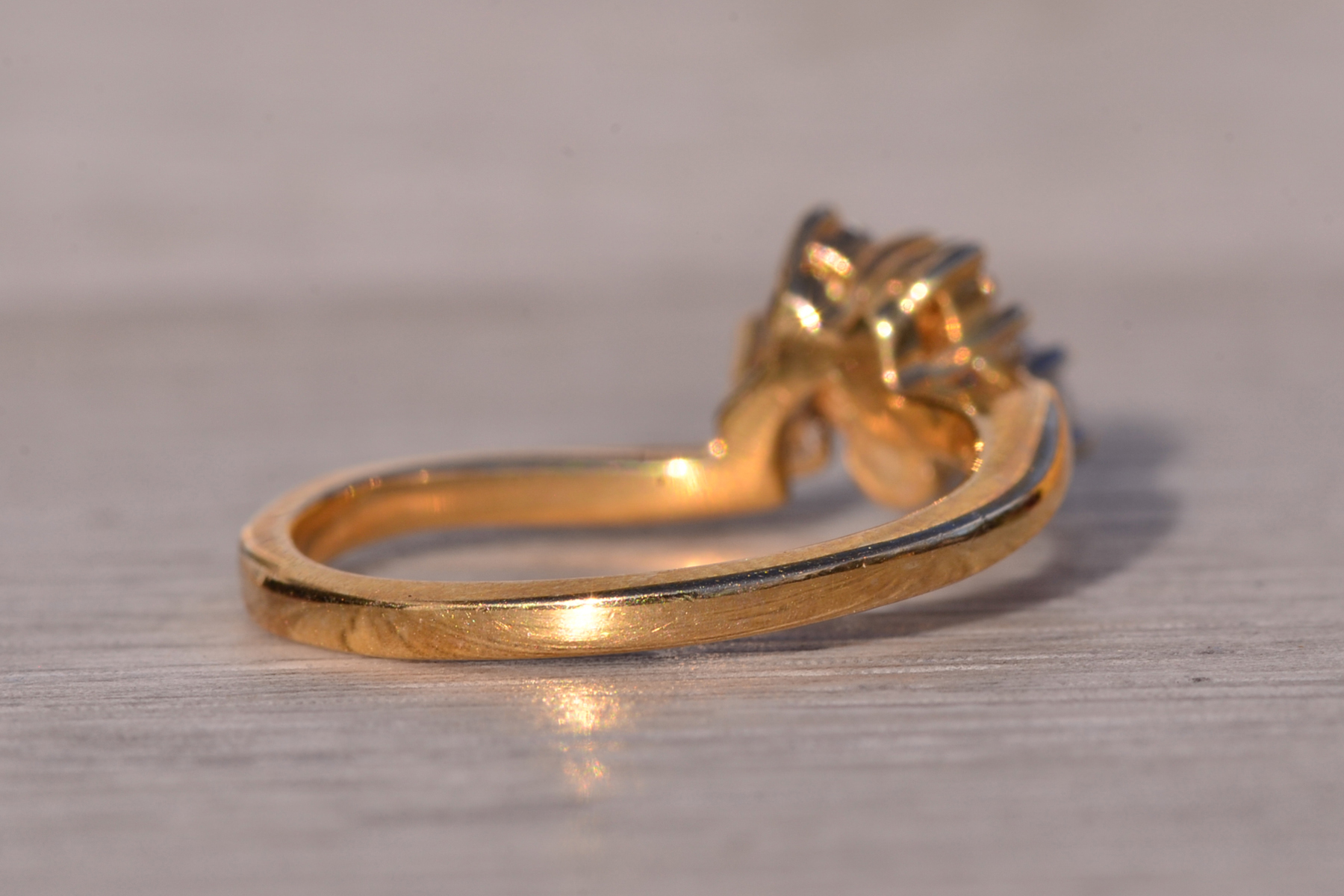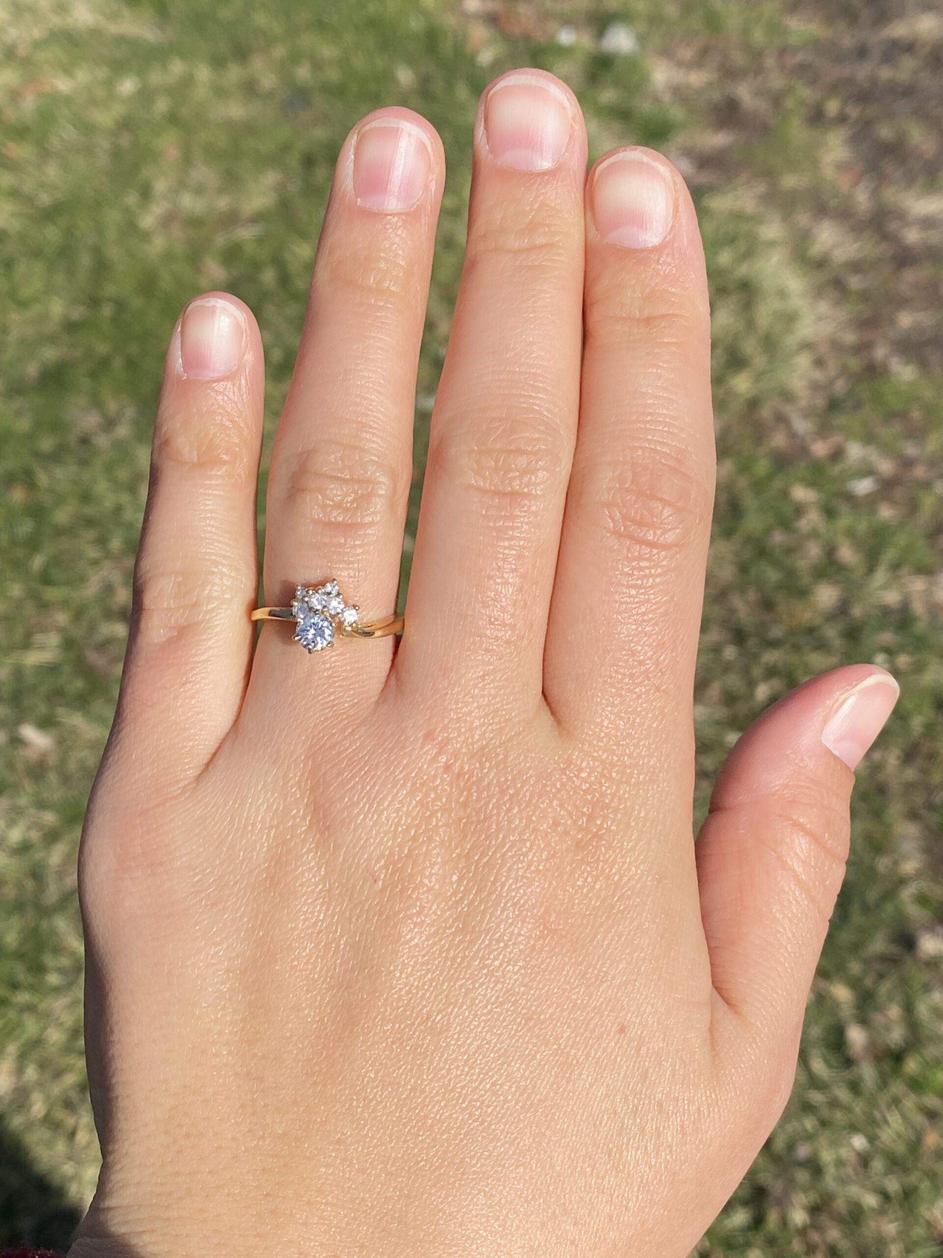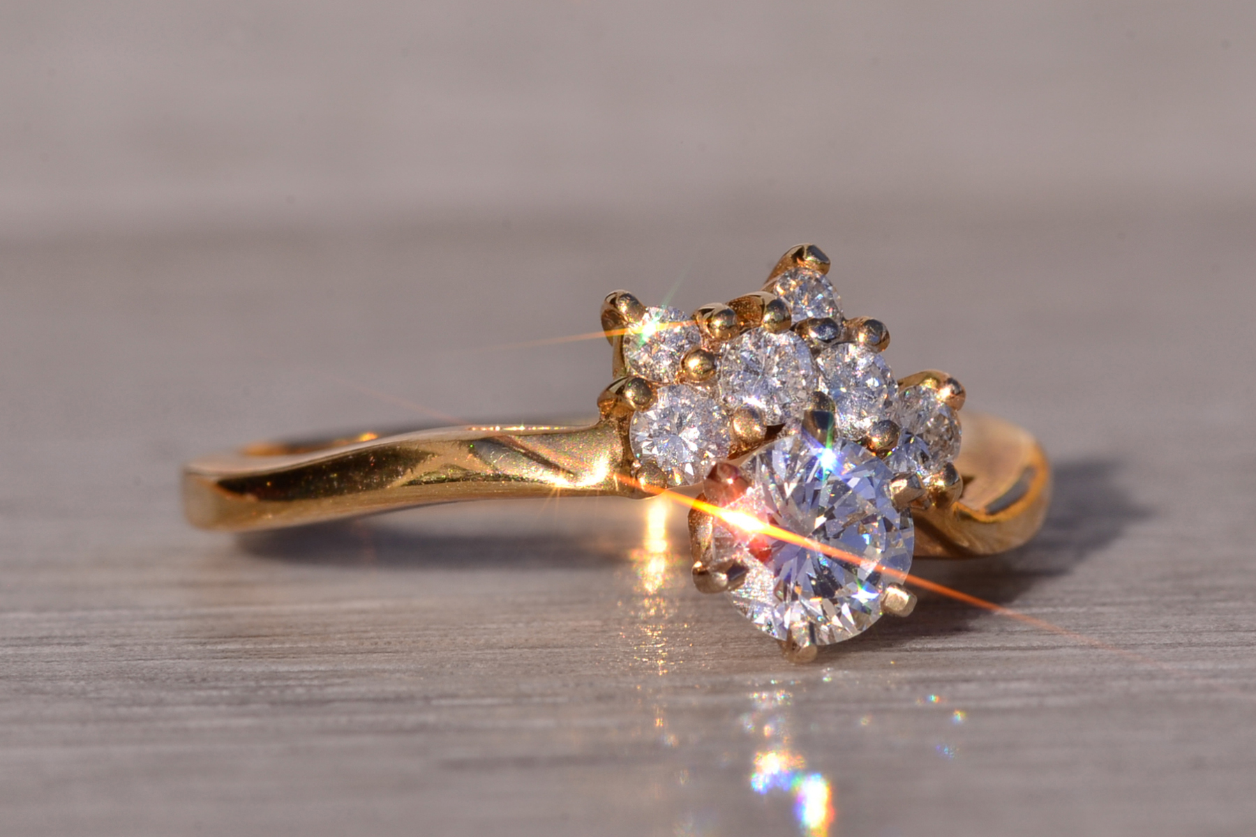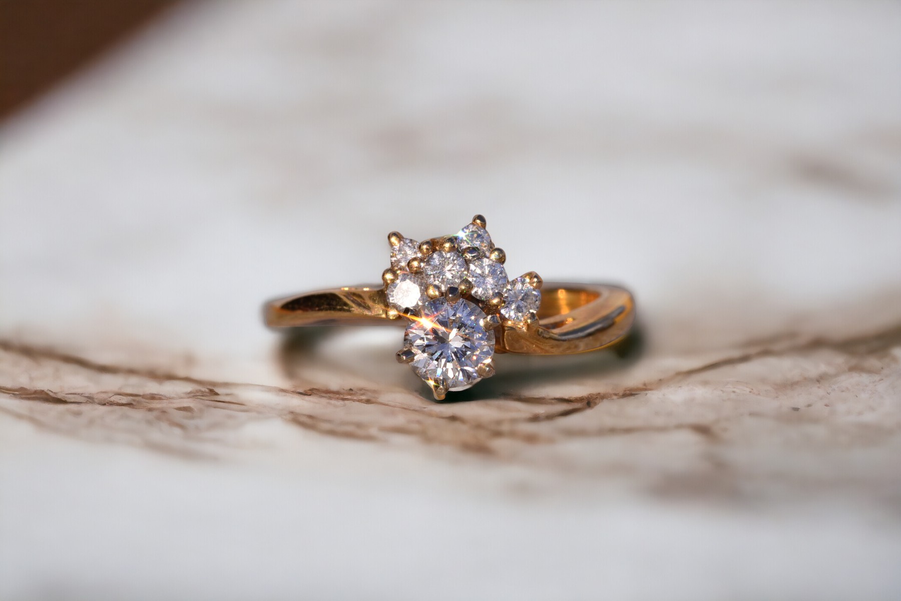 The Sunshine: Vintage Natural Diamond Engagement Ring in Yellow Gold. This exquisite ring showcases a captivating 0.40 carat round brilliant cut natural diamond, boasting an approximate Gemological Institute of America clarity grade of Si1 and a color grade of J. Adorning one side of the center are half-moon arrangements of round brilliant cut natural diamonds, radiating outward with a total approximate weight of 0.16 carats. The ring is elegantly finished with a waved shank, adding to its allure. Crafted in 14 karat yellow gold, this vintage-inspired engagement ring evokes the warmth of a golden sunset. Currently sized at 6.5, it can be adjusted to any finger size for an additional charge upon request.