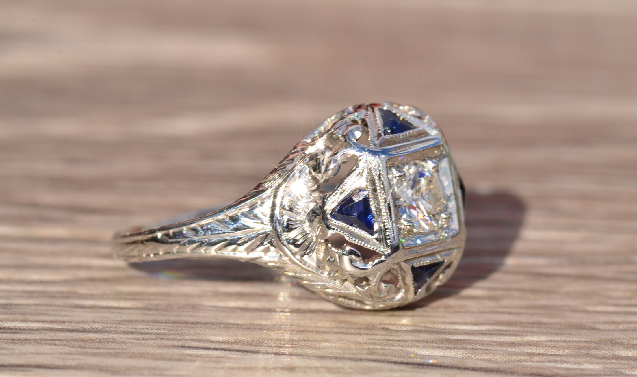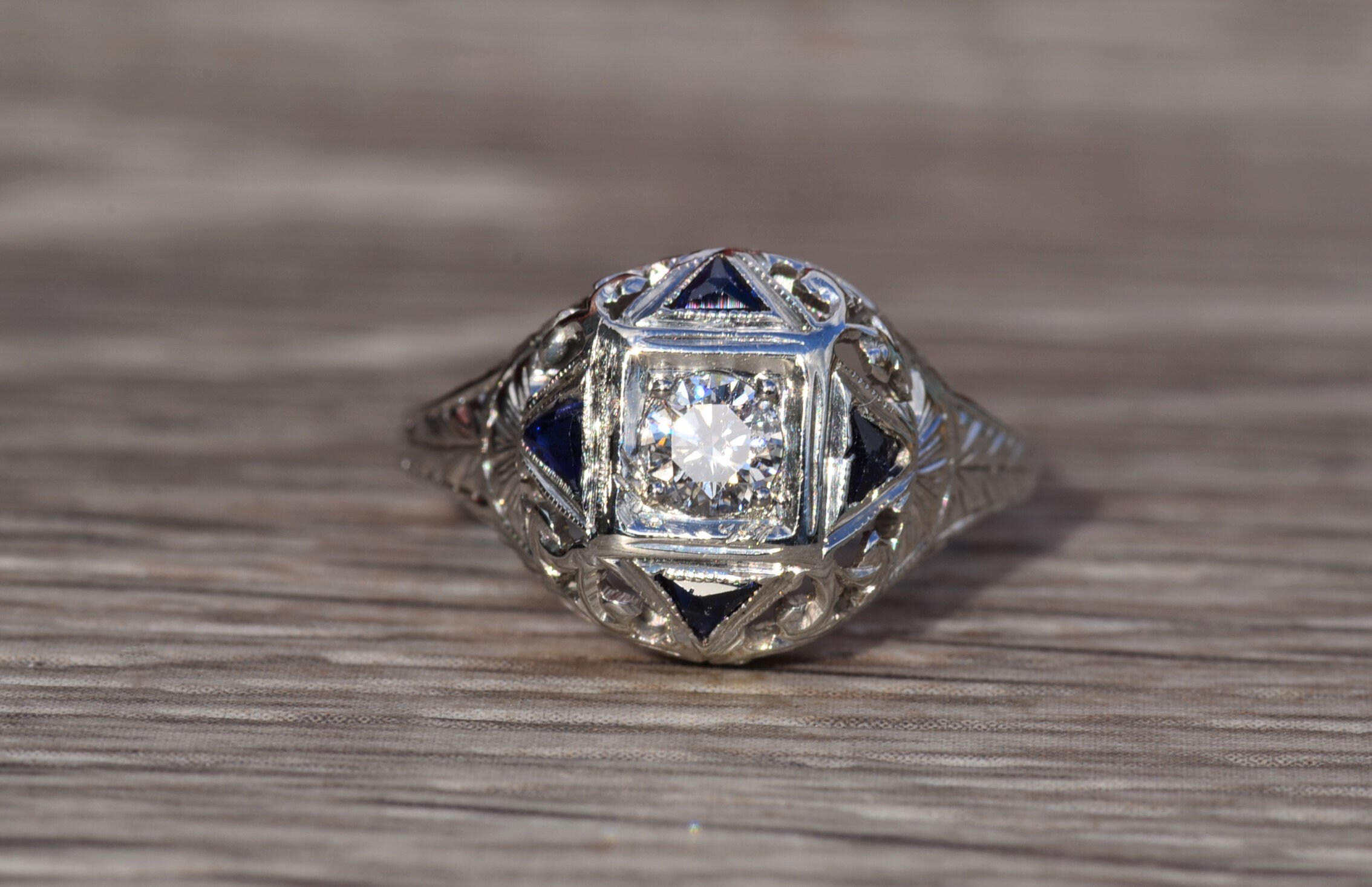 SKU: 367 Categories: All Antique & Vintage Engagement Rings, All Antiquities & Vintage, Antique & Vintage Cocktail Rings, Antique Engagement Rings, Cocktail Rings, Edwardian Jewelry, Engagement Rings, Vintage Engagement Rings Tags: 18 karat, 18 karat gold ring, 18 karat ladies ring, antique, antique ring, antique sapphire, blue, diamond, diamond engagement, diamond ring, engagement, filigree, filigree engagement, filigree ring, Ladies, ladies' ring, original, ring, sapphire, sapphire engagement, sapphire ring, statement ring, White Gold, white gold ring, women's ring
