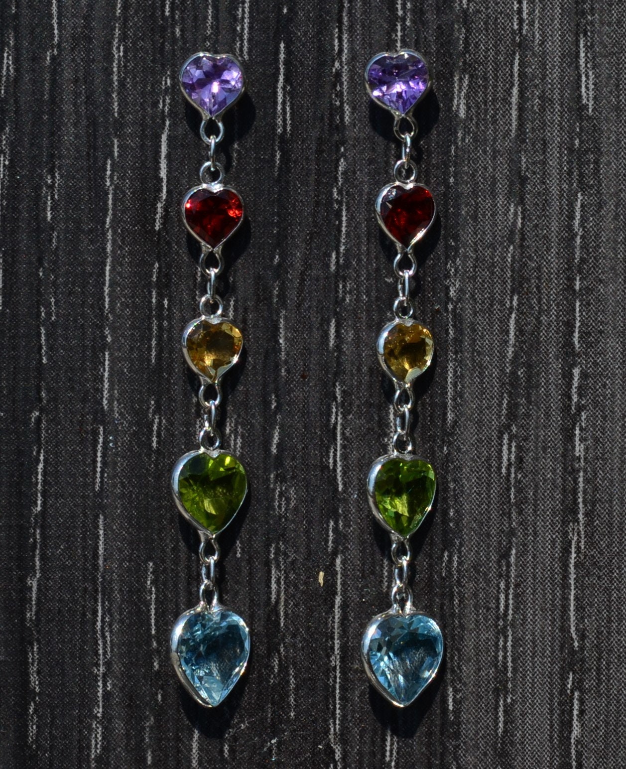 The Tamarac: Ladies Multistone Heart Dangler Earrings. The earrings feature amethyst, garnets, citrine, peridot, and topaz which taper in size as they dangle lower from the ear. The earrings are crafted in 14 karat white gold and dangle over 1.5 inches in length.