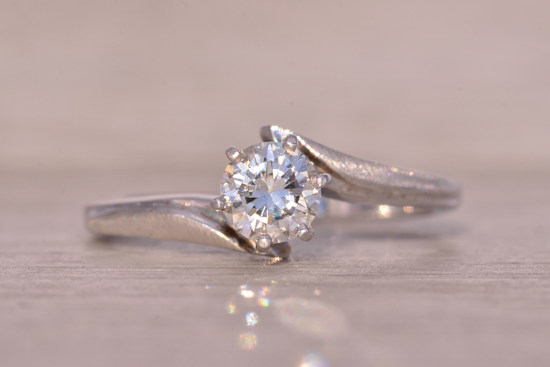 The Tameside: Bypass Style Engagement Ring with Natural Diamond in White Gold. This captivating ring showcases a central round brilliant-cut natural diamond, securely set with six prongs, weighing 0.38 carats. The diamond boasts an approximate Gemological Institute of America clarity grade of Vs1 and a color grade of G, radiating brilliance and beauty. Sweeping along the shank is a combination of ridged and textured elements in a bypass style, adding depth and character to the design. Crafted with precision in 14 karat white gold, this ring exudes elegance and sophistication. Currently sized at 5.25, it offers the option for adjustment to any finger size for an additional fee upon request.