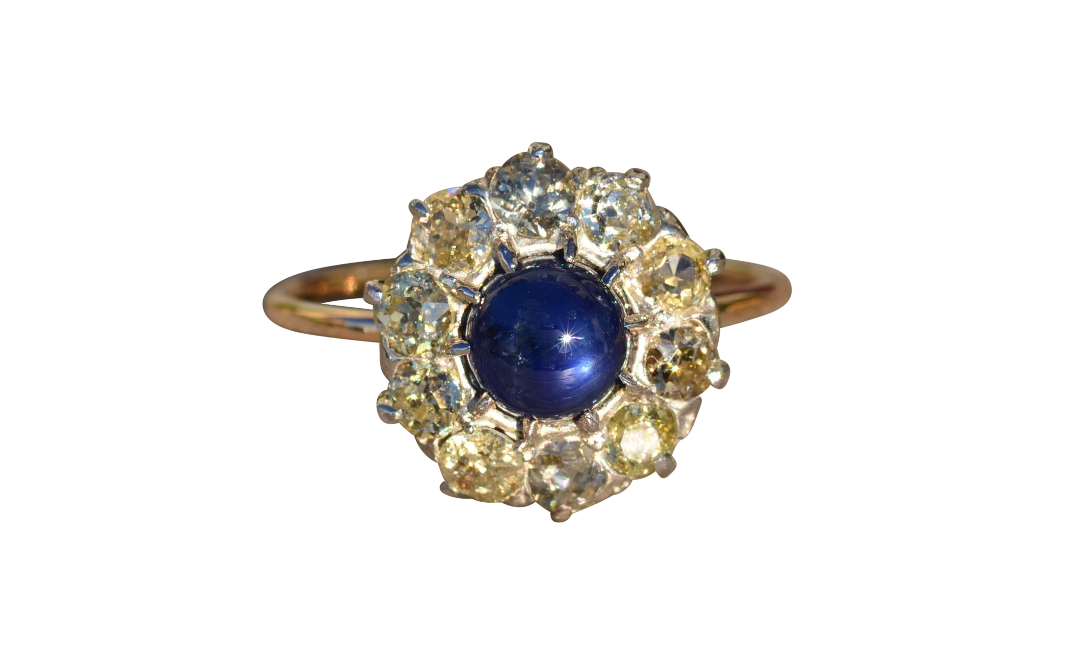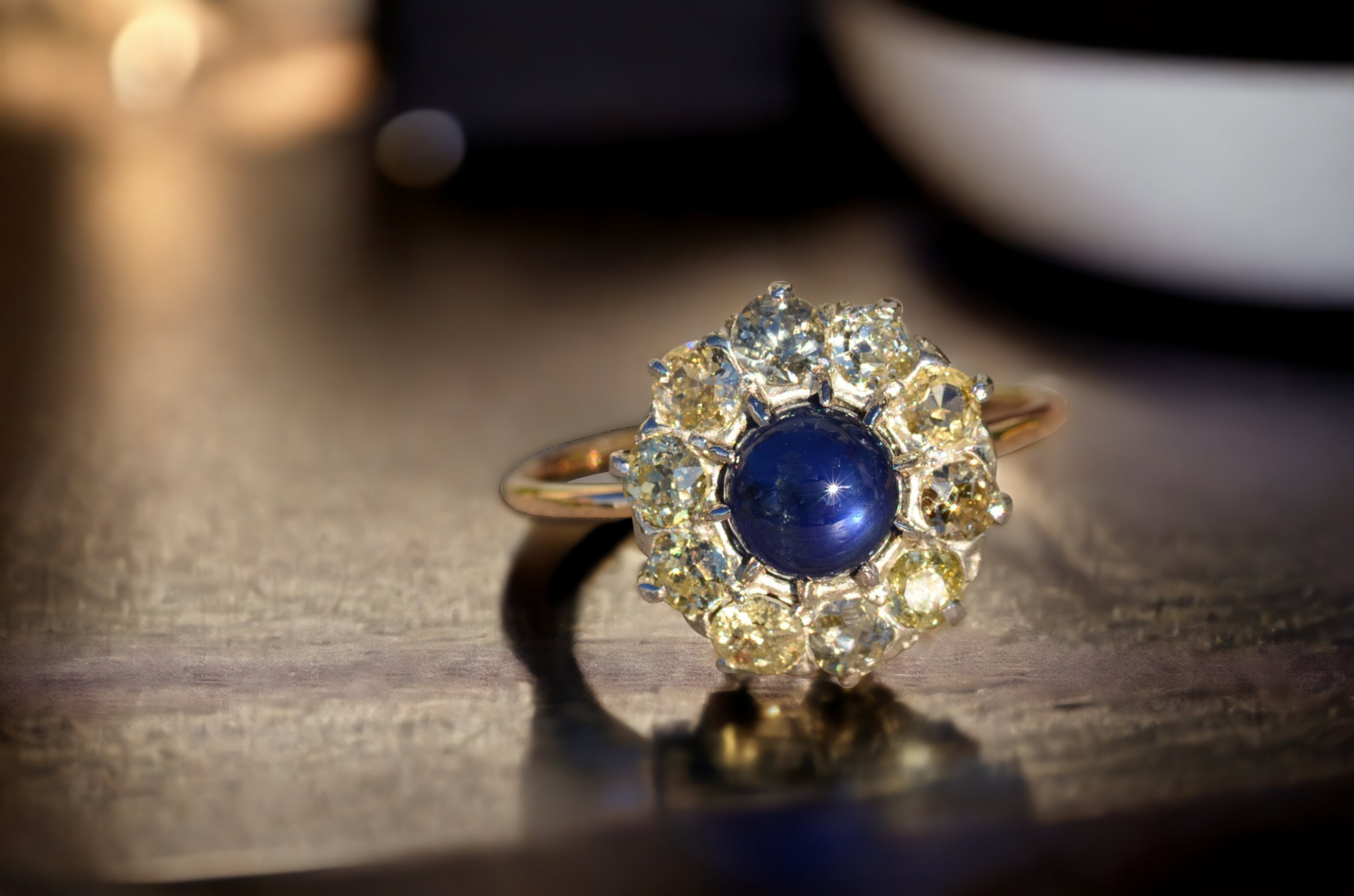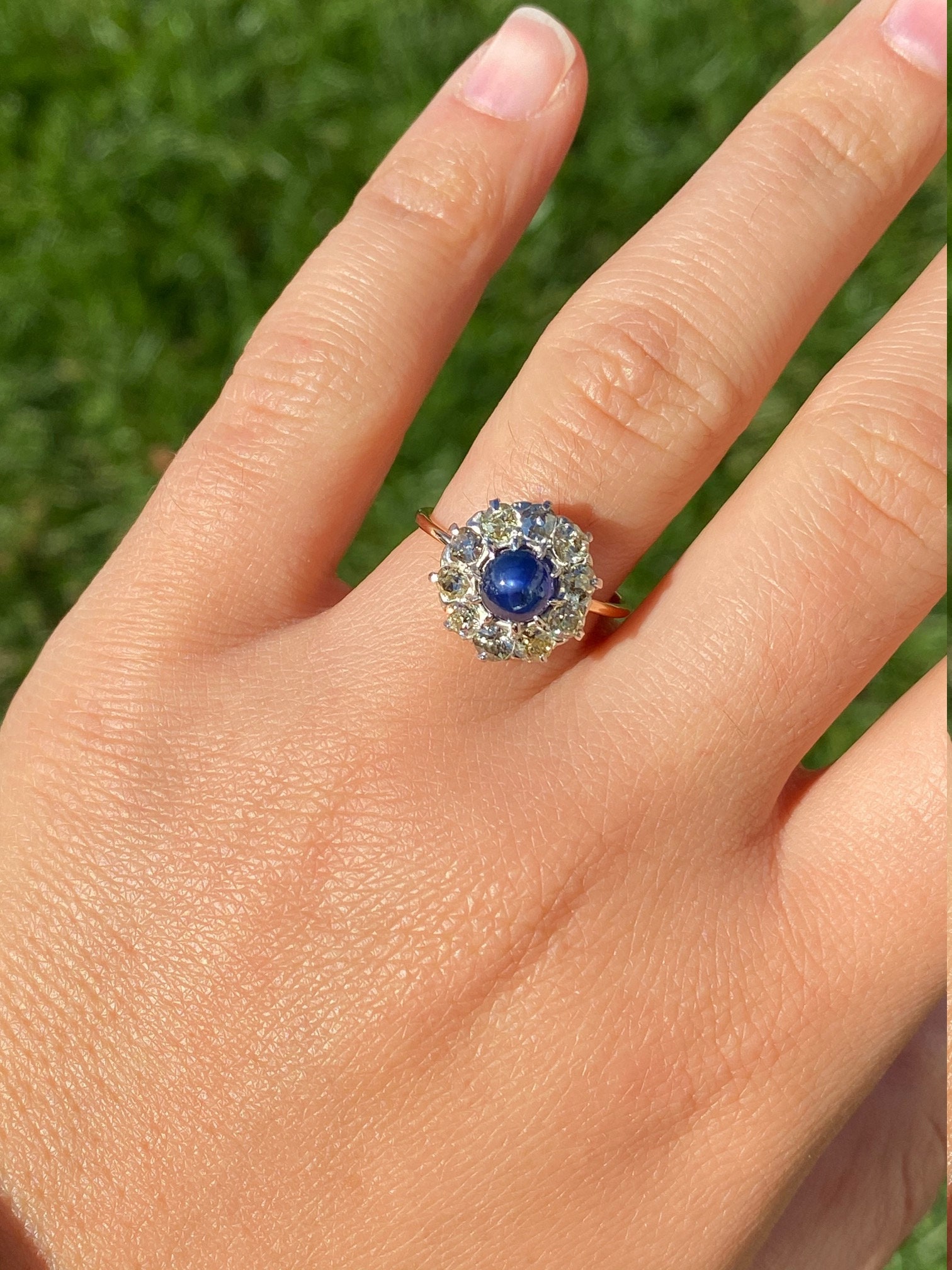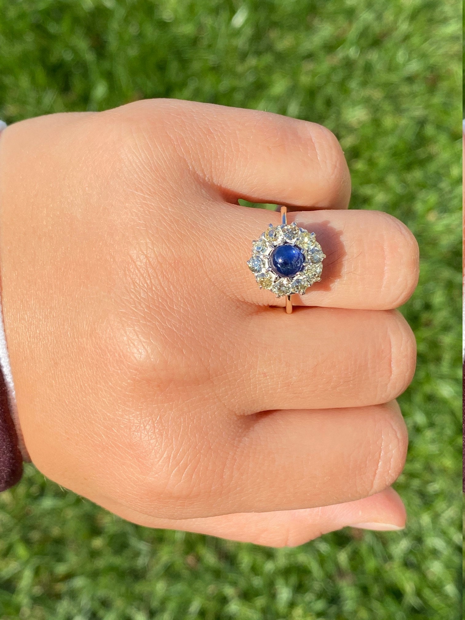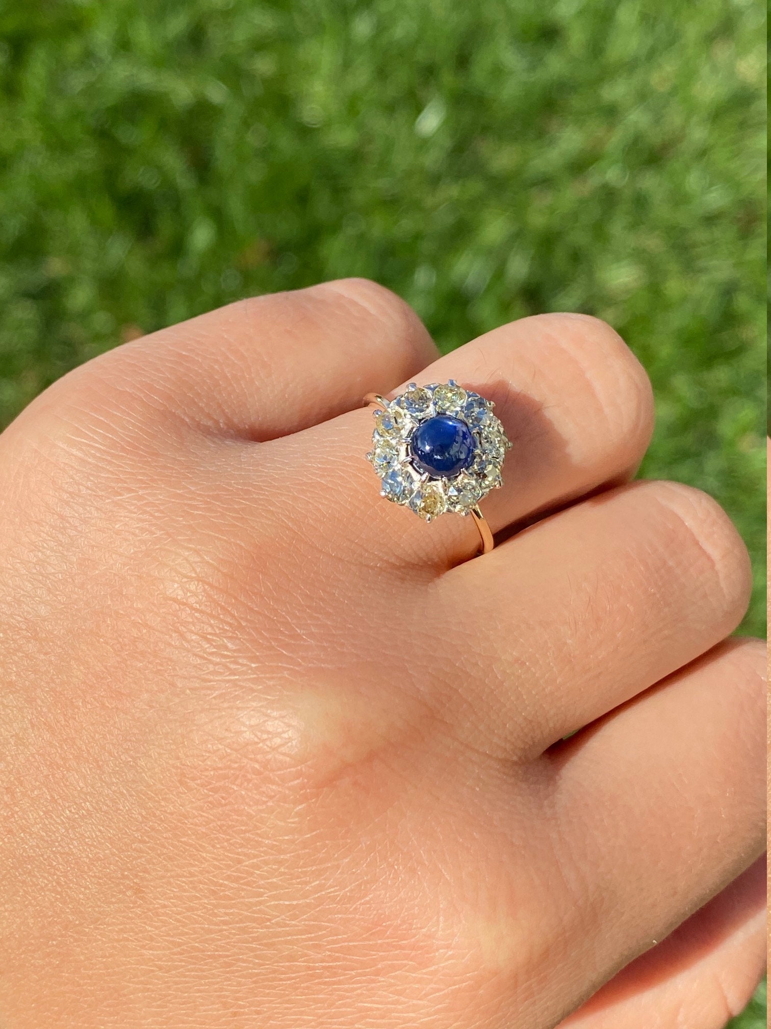 The Tana: Antique Mixed Metal Sapphire Cabochon and Old Mine Cut Diamond Halo Ring