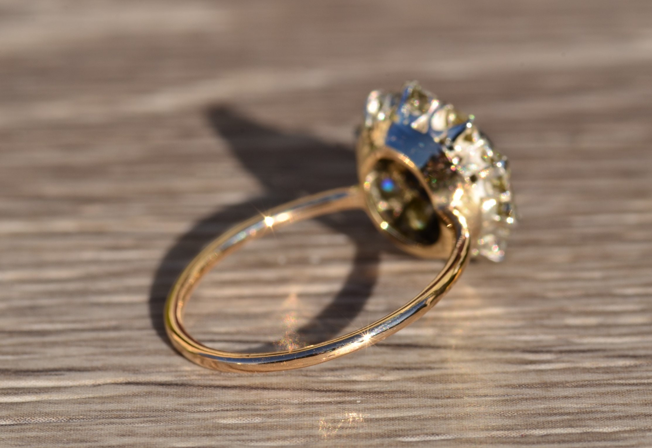 Antique Mixed Metal Sapphire Cabochon and Old Mine Cut Diamond Halo Ring. Crafted in 14 karat yellow gold and silver, this ring centers on a 1.50 carat royal blue cabochon sapphire. Surrounding the center cabochon sapphire is 1 carat total weight of chunky old mine cut diamonds in a round halo. This ring is a ladies finger size 7.5 and is able to be resized to any finger size.