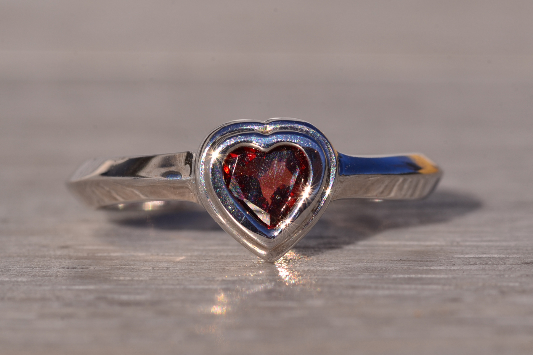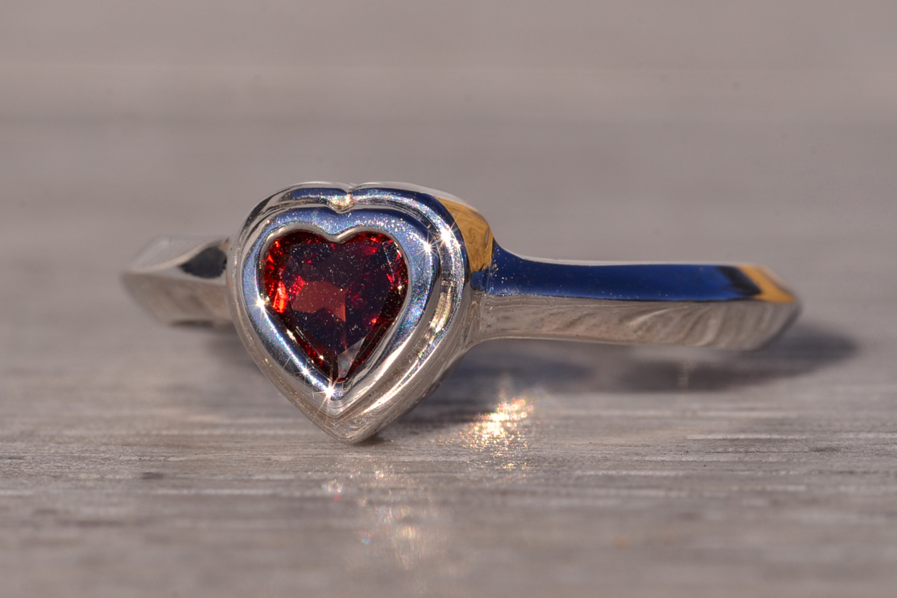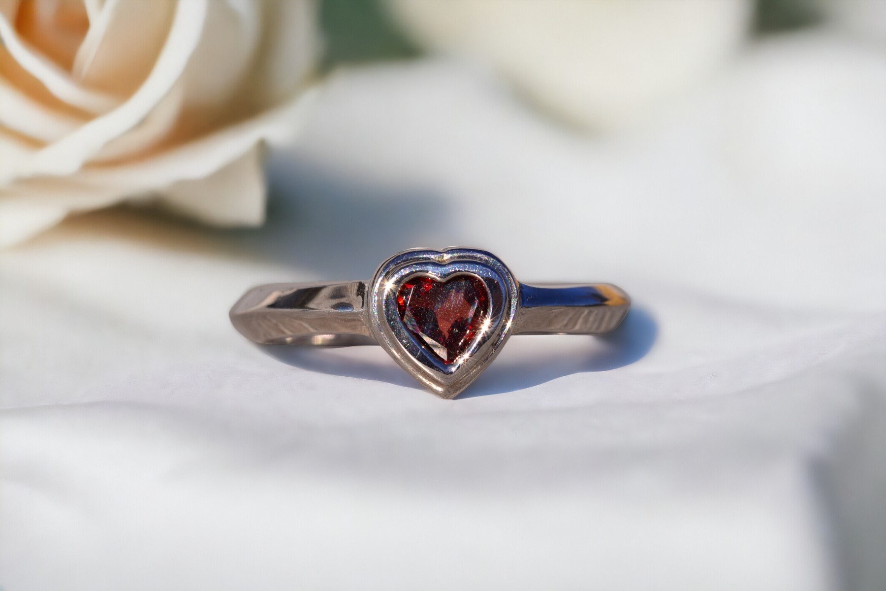 The Tene: Bezel Set Natural Garnet in White Gold. The ring showcases a central bezel-set heart brilliant-cut natural garnet, radiating deep, rich color. It is elegantly finished with a knife-edge style shank, adding a contemporary touch to the design. Crafted in 14 karat white gold, this exquisite piece is currently a finger size 5.75, with the option to adjust to any finger size for an additional charge upon request, ensuring a perfect fit for your unique style.